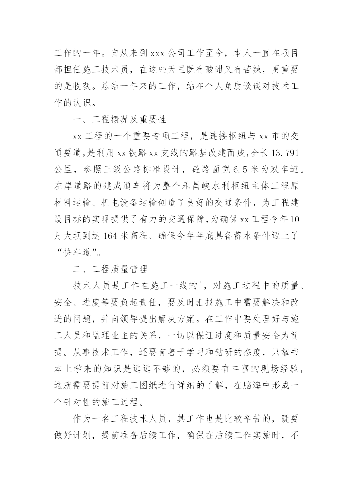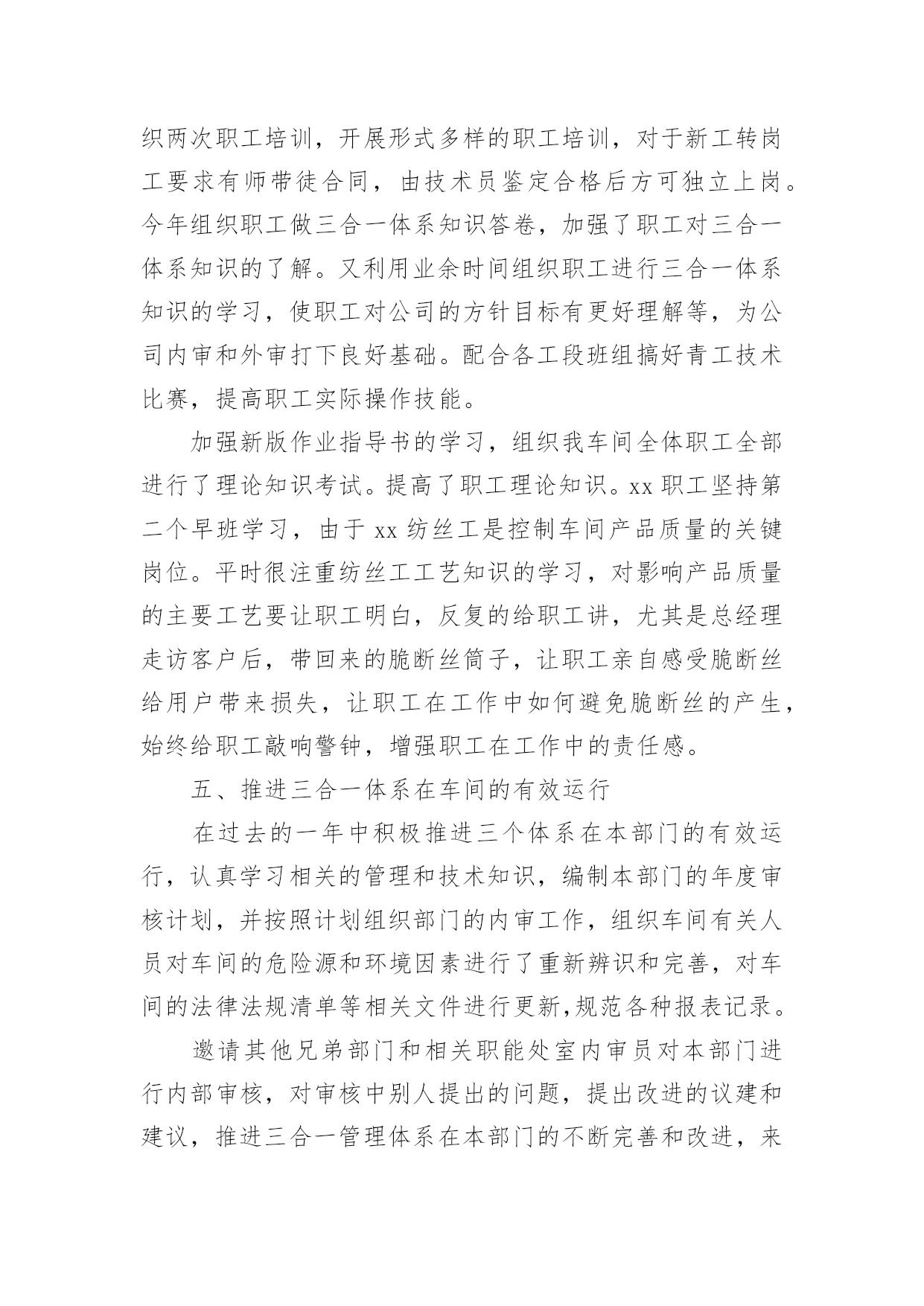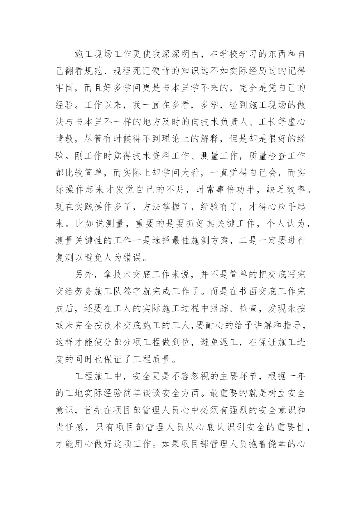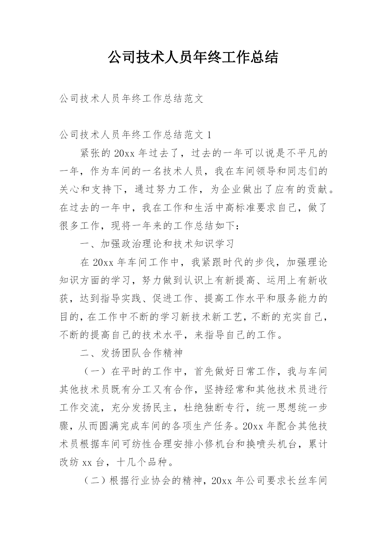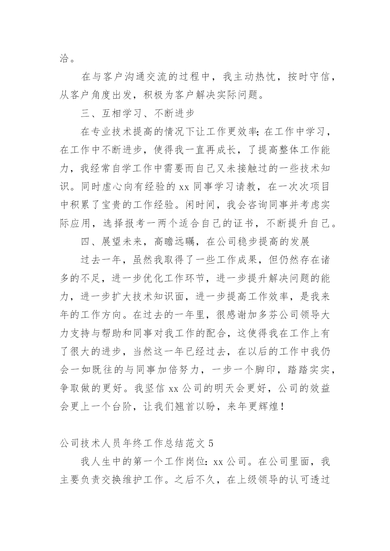 公司技术人员年终工作总结公司技术人员年终工作总结范文公司技术人员年终工作总结范文1紧张的20xx年过去了,过去的一年可以说是不平凡的一年,作为车间的一名技术人员,我在车间领导和同志们的关心和支持下,通过努力工作,为企业做出了应有的贡献。在过去的一年中,我在工作和生活中高标准要求自己,做了很多工作,现将一年来的工作总结如下:一、加强政治理论和技术知识学习在20xx年车间工作中,我紧跟时代的步伐,加强理论知识方面的学习,努力做到认识上有新提高、运用上有新收获,达到指导实践、促进工作、提高工作水平和服务能力的目的,在工作中不断的学习新技术新工艺,不断的充实自己,不断的提高自己的技术水平,来指导自己的工作。二、发扬团队合作精神(一)在平时的工作中,首先做好日常工作,我与车间其他技术员既有分工又有合作,坚持经常和其他技术员进行工作交流,充分发扬民主,杜绝独断专行,统一思想统一步骤,从而圆满完成车间的各项生产任务。20xx年配合其他技术员根据车间可纺性合理安排小修机台和换喷头机台,累计改纺xx台,十几个品种。(二)根据行业协会的精神,20xx年公司要求长丝车间北区停车,我配合其他技术员做好停车期间的工艺处理和平时的串碱工作,并把在工作中遇到的问题及时向车间领导汇报,安排相关人员解决。北区开车,做好开车前期的准备工作,做好工艺处理,提前将各项工艺参数调整到位,确保开车成功,保证产品质量。(三)由于长丝车间长期纺木桨,导丝轮废丝多,可纺性差,我经常和原液车间的技术员沟通,反映车间的可纺性情况,并与职能处室的技术员多联系沟通,希望能够改变桨粕的配比来提高可纺性,今年公司采取了使用多种桨粕混用的办法,大大提高了可纺性。满筒率由原来的不足80%上升到了现的85%左右。(四)四每月将车间的生产情况进行一次总结,及时将总结上交到技术处;将车间的主材消耗进行总结,及时上交计划处。做好统计技术分析工作,将车间生产中出现的异常情况,进行分析采取纠正措施,写出纠正措施报告。三、完成车间作业指导书的编写和印刷工作20xx年根据企管处的安排,要求各个车间完成作业指导书的换版工作,新的作业要求按照三合一体系的要求编写,我和其他技术员明确分工,使新的'作业指导书包含环境和职业健康方面的内容,更适用于实际操作。将作业指导书及时发放到了职工手中,圆满完成了作业指导书的换版工作。四、提高职工的理论水平和操作水平搞好职工培训工作是我们车间一项长抓不懈的工作,为此我们车间特别制定了培训制度,要求每个班组每月至少组织两次职工培训,开展形式多样的职工培训,对于新工转岗工要求有师带徒合同,由技术员鉴定合格后方可独立上岗。今年组织职工做三合一体系知识答卷,加强了职工对三合一体系知识的了解。又利用业余时间组织职工进行三合一体系知识的学习,使职工对公司的方针目标有更好理解等,为公司内审和外审打下良好基础。配合各工段班组搞好青工技术比赛,提高职工实际操作技能。加强新版作业指导书的学习,组织我车间全体职工全部进行了理论知识考试。提高了职工理论知识。xx职工坚持第二个早班学习,由于xx纺丝工是控制车间产品质量的关键岗位。平时很注重纺丝工工艺知识的学习,对影响产品质量的主要工艺要让职工明白,反复的给职工讲,尤其是总经理走访客户后,带回来的脆断丝筒子,让职工亲自感受脆断丝给用户带来损失,让职工在工作中如何避免脆断丝的产生,始终给职工敲响警钟,增强职工在工作中的责任感。五、推进三合一体系在车间的有效运行在过去的一年中积极推进三个体系在本部门的有效运行,认真学习相关的管理和技术知识,编制本部门的年度审核计划,并按照计划组织部门的内审工作,组织车间有关人员对车间的危险源和环境因素进行了重新辨识和完善,对车间的法律法规清单等相关文件进行更新,规范各种报表记录。邀请其他兄弟部门和相关职能处室内审员对本部门进行内部审核,对审核中别人提出的问题,提出改进的议建和建议,推进三合一管理体系在本部门的不断完善和改进,来迎接公司一年一度的内审和外审工作。与认证办的同志多联系、多沟通、发挥桥梁和纽带作用,对我车间的职工和来我们车间参观的相关人员。并对公司的目标、指标进行分解,制定本部门的目标、指标和管理方案,并及时向职工传达。新的一年对自己要有新的目标和要求在今后的工作中,我会更加努力,不辜负领导对我的信任。公司技术人员年终工作总结范文2参加工作已多年了,根据自身工作的实际情况,我对自己的工作做出分析评定,总结经验教训,提出改进方法,以便自己在今后的工作中扬长避短,为今后不断改进工作方法,提高工作效率提供依据,下面就本人的工作总结如下:作为一名技术人员,我将工作定位为协助好技术负责人的工作和不断的自我学习充实,在参与建设的工程中,在完成工程的施工测量放线的同时,还协助技术负责人编制施工方案、技术交底,并负责工程技术资料