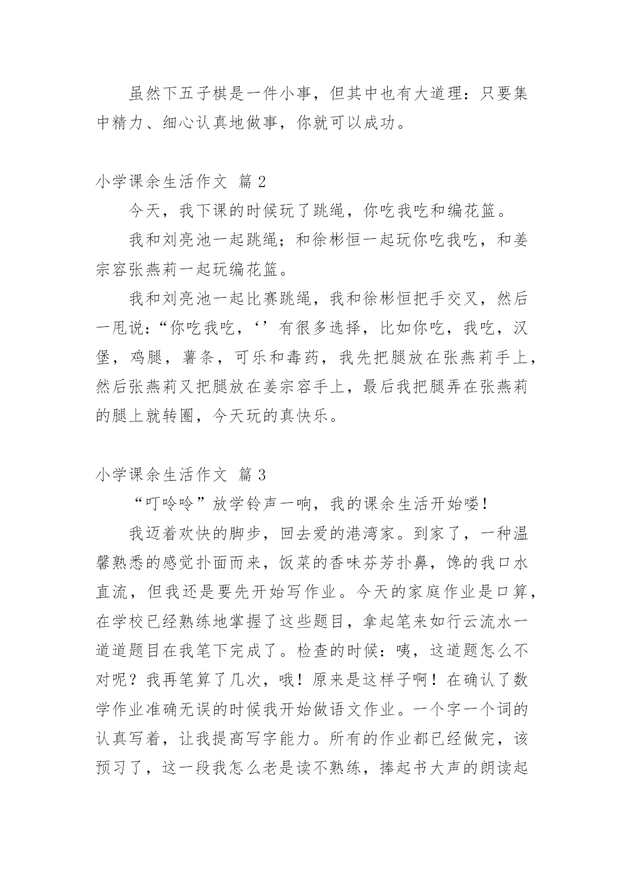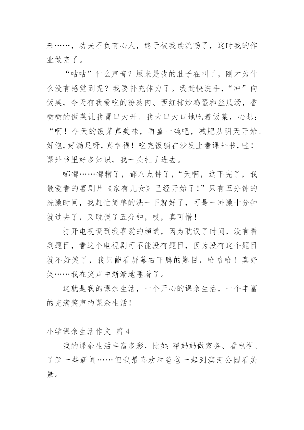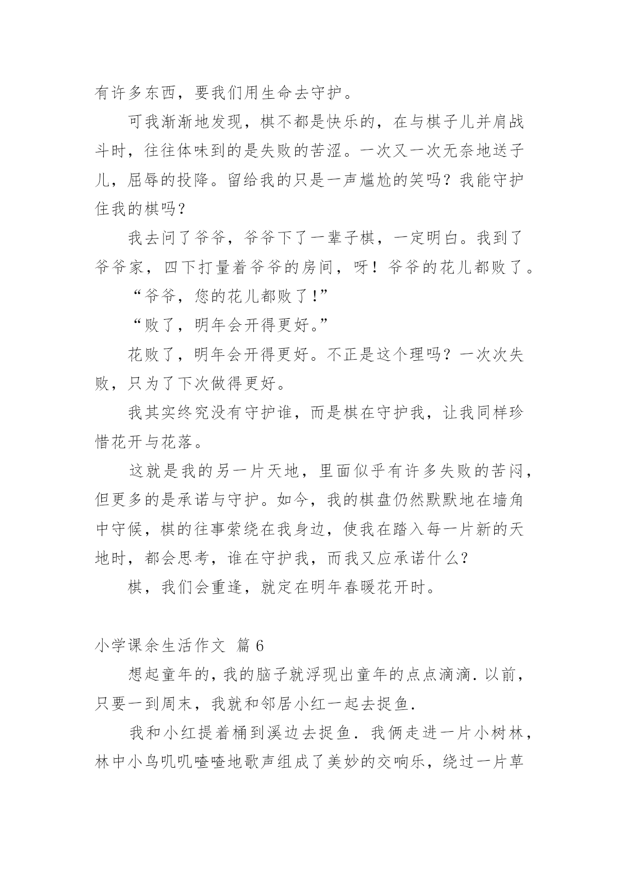 小学课余生活作文小学课余生活作文汇总10篇在平平淡淡的日常中,许多人都有过写作文的经历,对作文都不陌生吧,作文是一种言语活动,具有高度的综合性和创造性。相信很多朋友都对写作文感到非常苦恼吧,以下是小编收集整理的小学课余生活作文10篇,欢迎大家借鉴与参考,希望对大家有所帮助。小学课余生活作文篇1我的课余生活多姿多彩,有下棋、画画、踢球、骑自行车等等,其中我最喜欢的是下五子棋。一开始我不会下五子棋。有一天,我看见爸爸和妈妈下五子棋觉得很好玩、很好奇,决心要和爸爸学下五子棋。于是我问爸爸:五子棋怎么下啊?爸爸说:谁先把五个颜色相同的棋子排成一排谁就赢了。我心想:这么简单啊,我还以为多难呢!爸爸好像看穿了我的心思,说:儿子,要不我们下一盘吧!我爽快的同意了。可是没几分钟就被爸爸杀得一败涂地,真是万事开头难啊!于是我问爸爸怎么才能下好五子棋,爸爸说:下棋要集中精力,不要像小猫一样东张西望、动动这、动动那,只有集中精力才能下好棋。听到这儿,我恍然大悟。于是说:爸爸,要不我们在下一盘。这一次我目不转睛地盯着棋盘,一边防堵一边进攻,结果这次我竟然赢了,我心里十分高兴!虽然下五子棋是一件小事,但其中也有大道理:只要集中精力、细心认真地做事,你就可以成功。小学课余生活作文篇2今天,我下课的时候玩了跳绳,你吃我吃和编花篮。我和刘亮池一起跳绳;和徐彬恒一起玩你吃我吃,和姜宗容张燕莉一起玩编花篮。我和刘亮池一起比赛跳绳,我和徐彬恒把手交叉,然后一甩说:“你吃我吃,‘’有很多选择,比如你吃,我吃,汉堡,鸡腿,薯条,可乐和毒药,我先把腿放在张燕莉手上,然后张燕莉又把腿放在姜宗容手上,最后我把腿弄在张燕莉的腿上就转圈,今天玩的真快乐。小学课余生活作文篇3“叮呤呤”放学铃声一响,我的课余生活开始喽!我迈着欢快的脚步,回去爱的港湾家。到家了,一种温馨熟悉的感觉扑面而来,饭菜的香味芬芳扑鼻,馋的我口水直流,但我还是要先开始写作业。今天的家庭作业是口算,在学校已经熟练地掌握了这些题目,拿起笔来如行云流水一道道题目在我笔下完成了。检查的时候:咦,这道题怎么不对呢?我再笔算了几次,哦!原来是这样子啊!在确认了数学作业准确无误的时候我开始做语文作业。一个字一个词的认真写着,让我提高写字能力。所有的作业都已经做完,该预习了,这一段我怎么老是读不熟练,捧起书大声的朗读起来……,功夫不负有心人,终于被我读流畅了,这时我的作业做完了。“咕咕”什么声音?原来是我的肚子在叫了,刚才为什么没有感觉到呢?我要补充体力了。我赶快洗手,“冲”向饭桌,今天有我爱吃的粉蒸肉、西红柿炒鸡蛋和丝瓜汤,香喷喷的饭菜让我胃口大开。我大口大口地吃着饭菜,心想:“啊!今天的饭菜真美味,再盛一碗吧,减肥从明天开始。好饱,好满足呀,真幸福!吃完饭躺在沙发上看课外书,哇!课外书里好多知识,我一头扎了进去。嘟嘟……嘟糟了,都八点钟了,“天啊,这下完了,我最爱看的喜剧片《家有儿女》已经开始了!”只有五分钟的洗澡时间,我赶忙简单的洗一下就好了,可是一冲澡十分钟就过去了,又耽误了五分钟,哎,真可惜!打开电视调到我喜爱的频道,因为耽误了时间,没有看到题目,看这个电视剧可不能没有题目,因为没有这个题目就不好笑了,我只能看屏幕右下脚的题目,哈哈哈!真好笑……我在笑声中渐渐地睡着了。这就是我的课余生活,一个开心的课余生活,一个丰富的充满笑声的课余生活!小学课余生活作文篇4我的课余生活丰富多彩,比如:帮妈妈做家务、看电视、了解一些新闻……但我最喜欢和爸爸一起到滨河公园看美景。滨河公园是多么的美啊!青青的山,清清的水,山上还有个小凉亭。在小凉亭里往下看,美丽的景色我看都看不完。一阵阵风向我吹来,抚摸着我的小脸,我感到自己像是在梦里一样。在这里,我要告诉大家,观美景不但可以放松心情,还会有不小的收获哟,我已经有了几个松果了,还准备收集一些美丽的花草呢!看,这就是我的课余生活。小学课余生活作文篇5我的另一片天地,便是中国象棋方正的棋盘。曾有人问我,你为什么不学围棋呢?围棋多深奥呀!因为象棋的子儿多,热闹。热闹?!他哑然失笑,在他看来,这的确不能算是一个理由。家长的望子成龙,使我们每天都在“鸽子笼”中学习,很少有朋友陪伴。而象棋中那各有不同的棋子儿,就像是我的朋友一般,在我看来,他们各自都有不同的性格。在我难过的时候,他能安静地听我倾诉,分担我的忧愁。于是,我极力想下好手中的棋。我在少年宫中报了名,学棋。棋盘上,车在冲杀,马在迂回,炮在顿挫。有人以为自己是哲人,对着棋子儿说,棋子儿呀棋子儿,你为什么这样厮杀,你不懂生命的珍贵吗?我想,他还是不明白,世界上有许多东西,要我们用生命去守护。可我渐渐地发现,棋不都是快乐的,在与棋子儿并肩战斗时,往往体味到的是失败的苦涩。一次又一次无奈地送子儿,屈辱的投降。留给我的只是一声尴尬的笑吗?我能守护