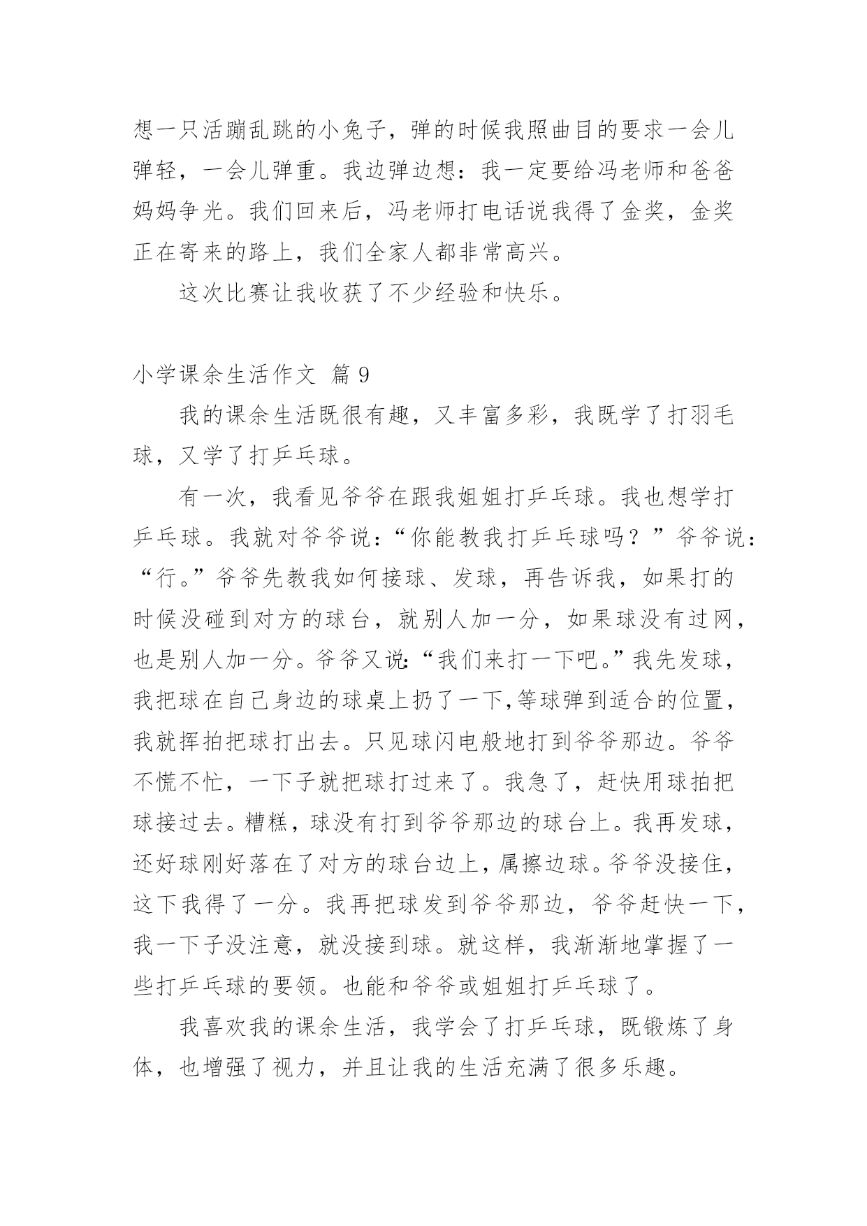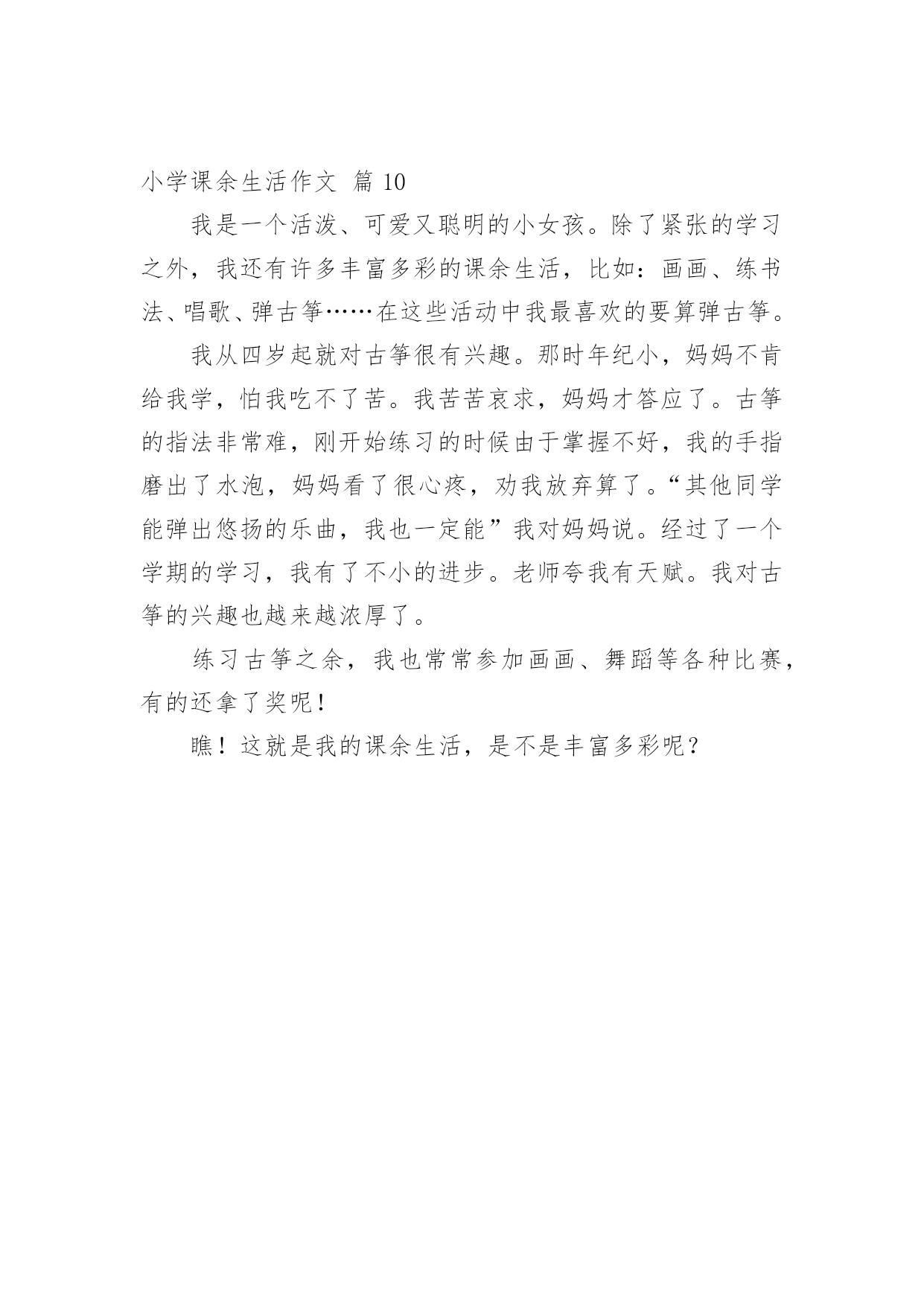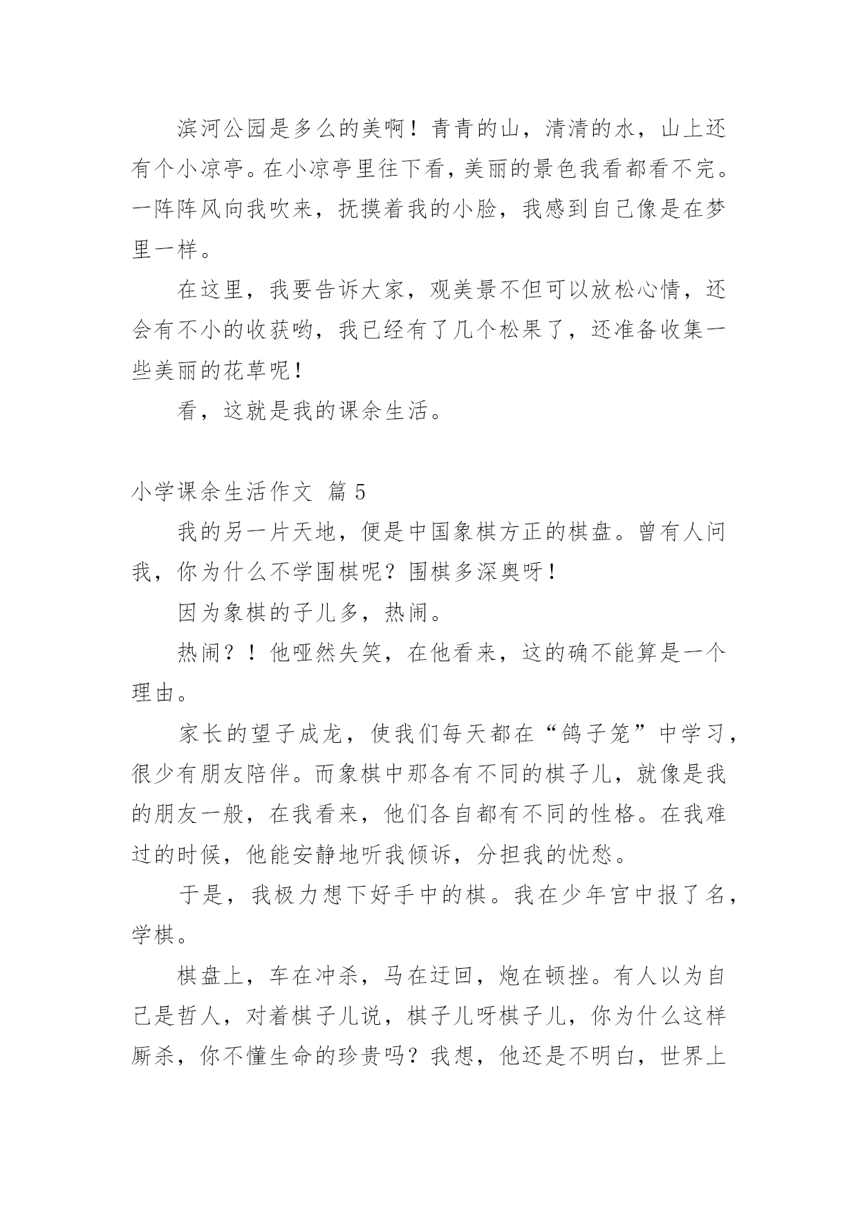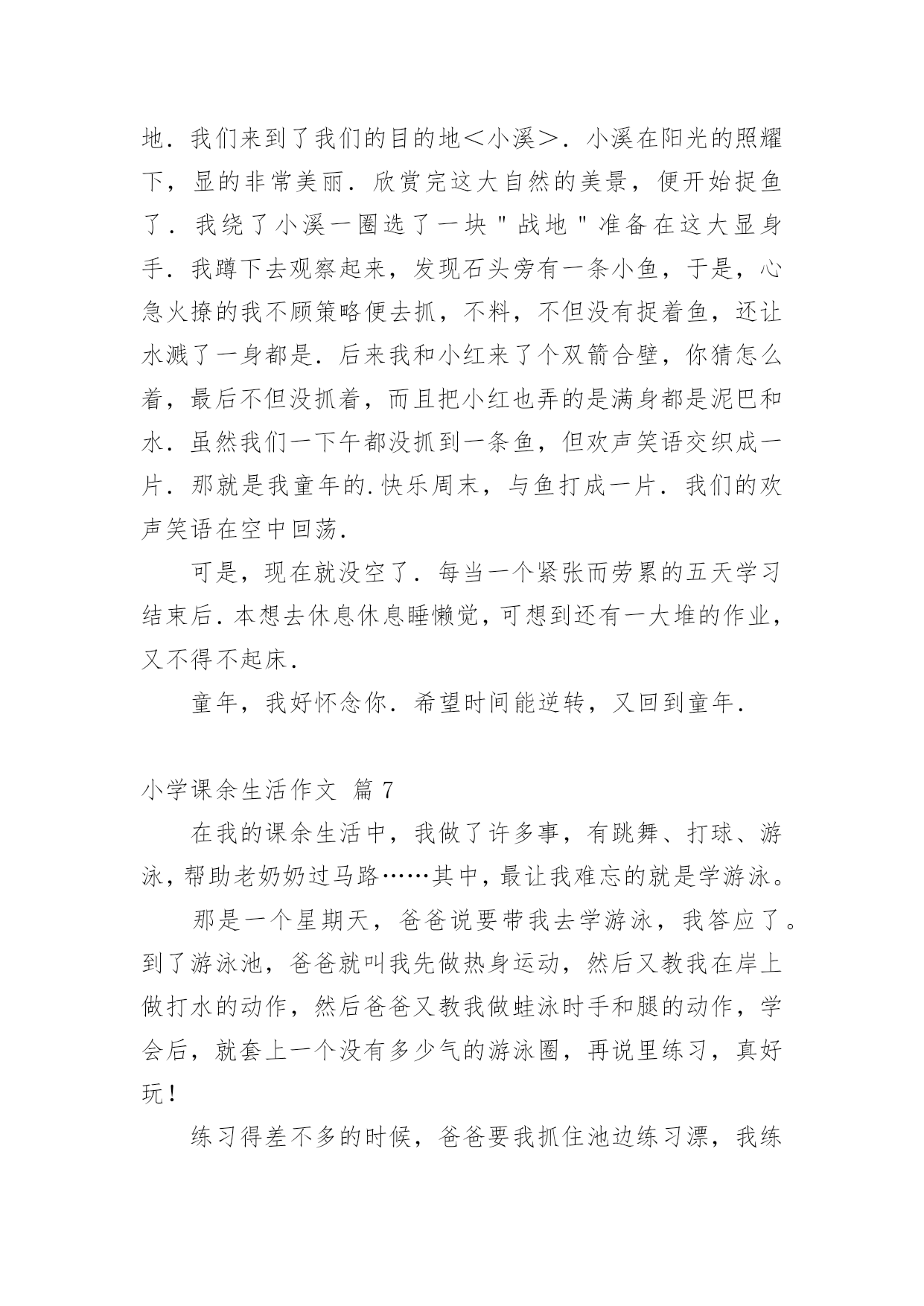 小学课余生活作文小学课余生活作文汇总10篇在平平淡淡的日常中,许多人都有过写作文的经历,对作文都不陌生吧,作文是一种言语活动,具有高度的综合性和创造性。相信很多朋友都对写作文感到非常苦恼吧,以下是小编收集整理的小学课余生活作文10篇,欢迎大家借鉴与参考,希望对大家有所帮助。小学课余生活作文篇1我的课余生活多姿多彩,有下棋、画画、踢球、骑自行车等等,其中我最喜欢的是下五子棋。一开始我不会下五子棋。有一天,我看见爸爸和妈妈下五子棋觉得很好玩、很好奇,决心要和爸爸学下五子棋。于是我问爸爸:五子棋怎么下啊?爸爸说:谁先把五个颜色相同的棋子排成一排谁就赢了。我心想:这么简单啊,我还以为多难呢!爸爸好像看穿了我的心思,说:儿子,要不我们下一盘吧!我爽快的同意了。可是没几分钟就被爸爸杀得一败涂地,真是万事开头难啊!于是我问爸爸怎么才能下好五子棋,爸爸说:下棋要集中精力,不要像小猫一样东张西望、动动这、动动那,只有集中精力才能下好棋。听到这儿,我恍然大悟。于是说:爸爸,要不我们在下一盘。这一次我目不转睛地盯着棋盘,一边防堵一边进攻,结果这次我竟然赢了,我心里十分高兴!虽然下五子棋是一件小事,但其中也有大道理:只要集中精力、细心认真地做事,你就可以成功。小学课余生活作文篇2今天,我下课的时候玩了跳绳,你吃我吃和编花篮。我和刘亮池一起跳绳;和徐彬恒一起玩你吃我吃,和姜宗容张燕莉一起玩编花篮。我和刘亮池一起比赛跳绳,我和徐彬恒把手交叉,然后一甩说:“你吃我吃,‘’有很多选择,比如你吃,我吃,汉堡,鸡腿,薯条,可乐和毒药,我先把腿放在张燕莉手上,然后张燕莉又把腿放在姜宗容手上,最后我把腿弄在张燕莉的腿上就转圈,今天玩的真快乐。小学课余生活作文篇3“叮呤呤”放学铃声一响,我的课余生活开始喽!我迈着欢快的脚步,回去爱的港湾家。到家了,一种温馨熟悉的感觉扑面而来,饭菜的香味芬芳扑鼻,馋的我口水直流,但我还是要先开始写作业。今天的家庭作业是口算,在学校已经熟练地掌握了这些题目,拿起笔来如行云流水一道道题目在我笔下完成了。检查的时候:咦,这道题怎么不对呢?我再笔算了几次,哦!原来是这样子啊!在确认了数学作业准确无误的时候我开始做语文作业。一个字一个词的认真写着,让我提高写字能力。所有的作业都已经做完,该预习了,这一段我怎么老是读不熟练,捧起书大声的朗读起来……,功夫不负有心人,终于被我读流畅了,这时我的作业做完了。“咕咕”什么声音?原来是我的肚子在叫了,刚才为什么没有感觉到呢?我要补充体力了。我赶快洗手,“冲”向饭桌,今天有我爱吃的粉蒸肉、西红柿炒鸡蛋和丝瓜汤,香喷喷的饭菜让我胃口大开。我大口大口地吃着饭菜,心想:“啊!今天的饭菜真美味,再盛一碗吧,减肥从明天开始。好饱,好满足呀,真幸福!吃完饭躺在沙发上看课外书,哇!课外书里好多知识,我一头扎了进去。嘟嘟……嘟糟了,都八点钟了,“天啊,这下完了,我最爱看的喜剧片《家有儿女》已经开始了!”只有五分钟的洗澡时间,我赶忙简单的洗一下就好了,可是一冲澡十分钟就过去了,又耽误了五分钟,哎,真可惜!打开电视调到我喜爱的频道,因为耽误了时间,没有看到题目,看这个电视剧可不能没有题目,因为没有这个题目就不好笑了,我只能看屏幕右下脚的题目,哈哈哈!真好笑……我在笑声中渐渐地睡着了。这就是我的课余生活,一个开心的课余生活,一个丰富的充满笑声的课余生活!小学课余生活作文篇4我的课余生活丰富多彩,比如:帮妈妈做家务、看电视、了解一些新闻……但我最喜欢和爸爸一起到滨河公园看美景。滨河公园是多么的美啊!青青的山,清清的水,山上还有个小凉亭。在小凉亭里往下看,美丽的景色我看都看不完。一阵阵风向我吹来,抚摸着我的小脸,我感到自己像是在梦里一样。在这里,我要告诉大家,观美景不但可以放松心情,还会有不小的收获哟,我已经有了几个松果了,还准备收集一些美丽的花草呢!看,这就是我的课余生活。小学课余生活作文篇5我的另一片天地,便是中国象棋方正的棋盘。曾有人问我,你为什么不学围棋呢?围棋多深奥呀!因为象棋的子儿多,热闹。热闹?!他哑然失笑,在他看来,这的确不能算是一个理由。家长的望子成龙,使我们每天都在“鸽子笼”中学习,很少有朋友陪伴。而象棋中那各有不同的棋子儿,就像是我的朋友一般,在我看来,他们各自都有不同的性格。在我难过的时候,他能安静地听我倾诉,分担我的忧愁。于是,我极力想下好手中的棋。我在少年宫中报了名,学棋。棋盘上,车在冲杀,马在迂回,炮在顿挫。有人以为自己是哲人,对着棋子儿说,棋子儿呀棋子儿,你为什么这样厮杀,你不懂生命的珍贵吗?我想,他还是不明白,世界上有许多东西,要我们用生命去守护。可我渐渐地发现,棋不都是快乐的,在与棋子儿并肩战斗时,往往体味到的是失败的苦涩。一次又一次无奈地送子儿,屈辱的投降。留给我的只是一声尴尬的笑吗?我能守护