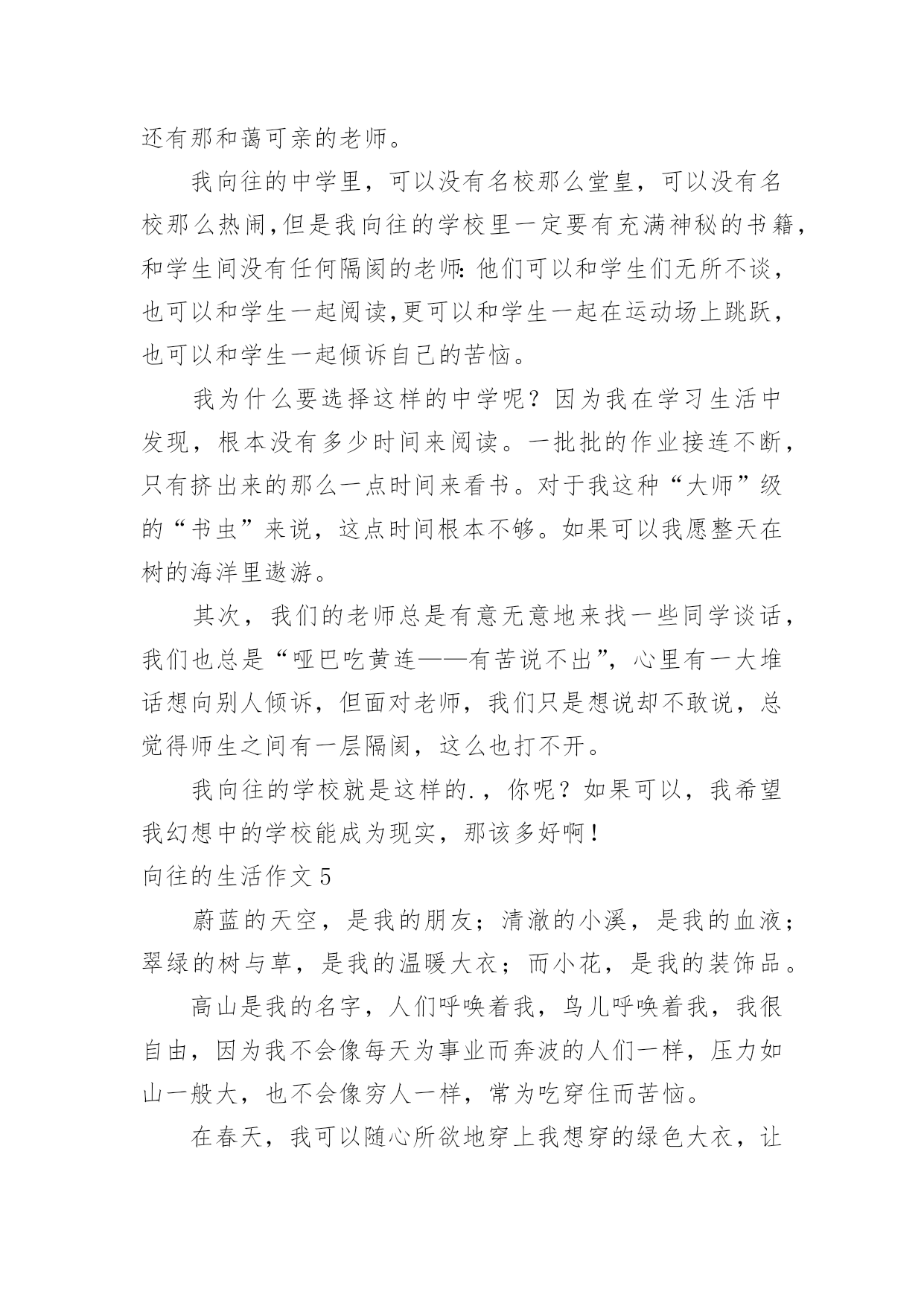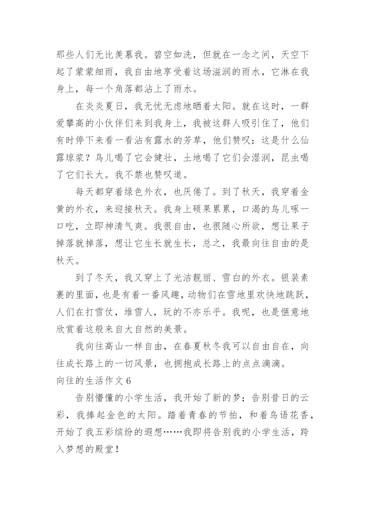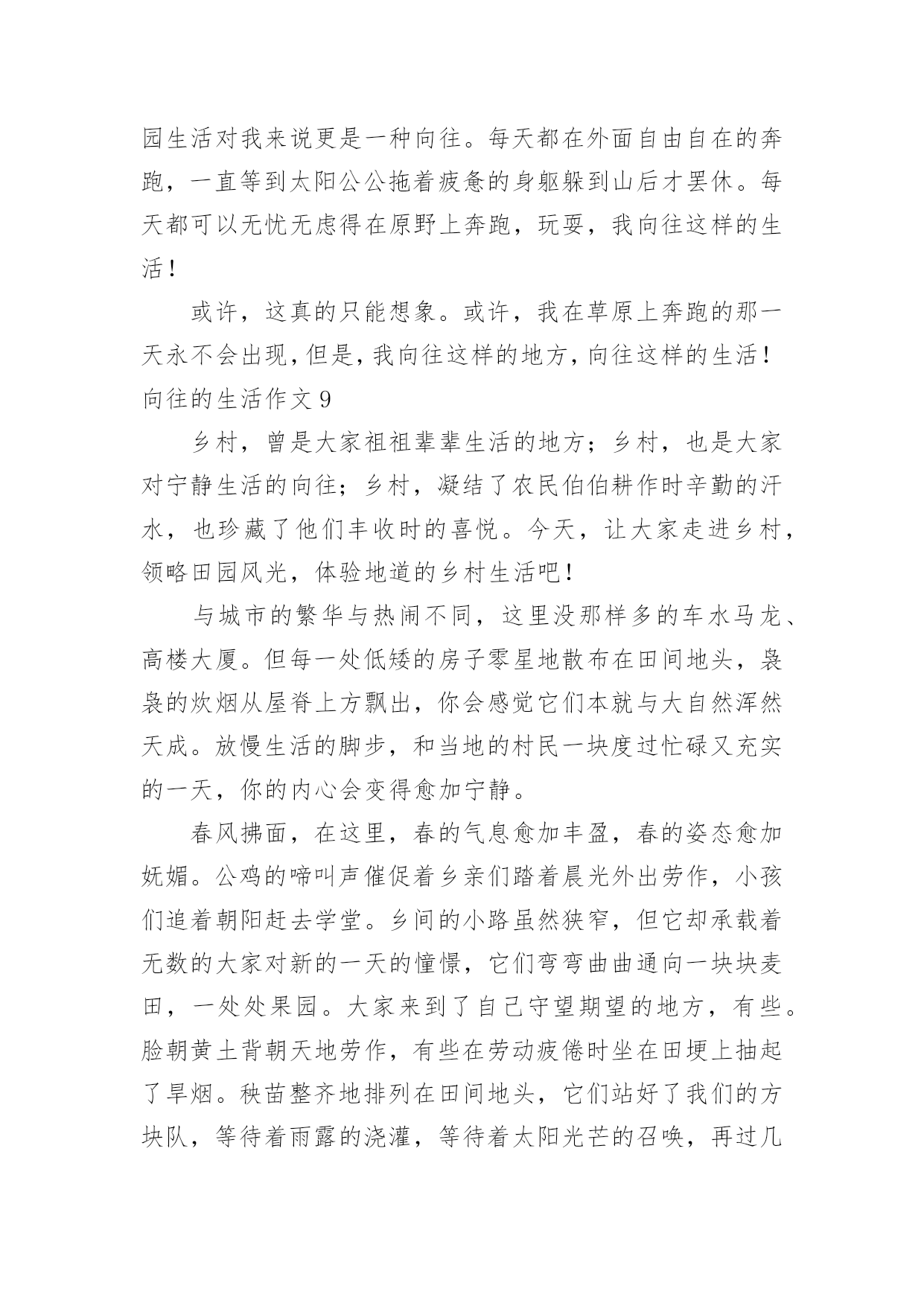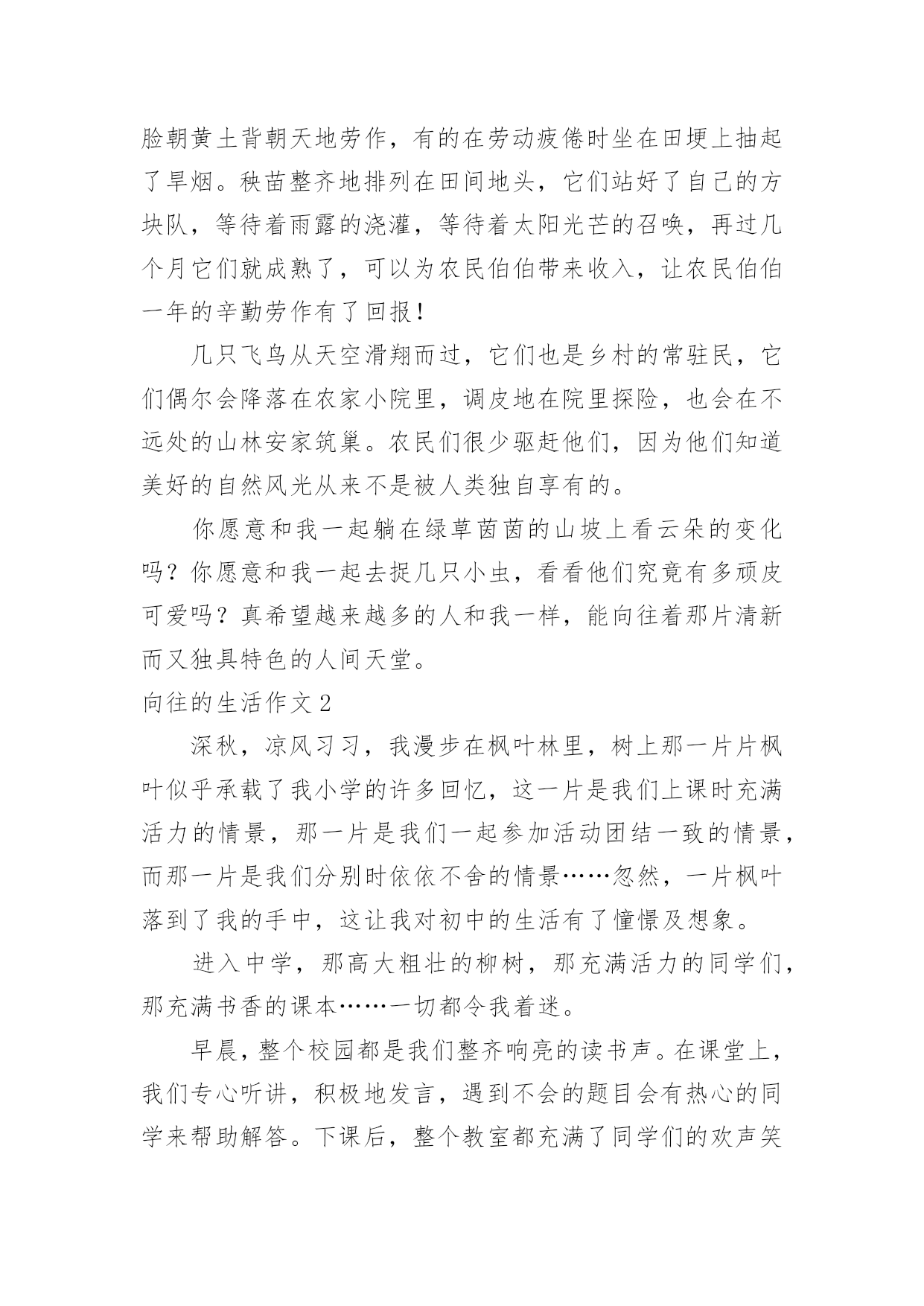 向往的生活作文向往的生活作文【热门】在生活、工作和学习中,大家总免不了要接触或使用作文吧,写作文可以锻炼我们的独处习惯,让自己的心静下来,思考自己未来的方向。怎么写作文才能避免踩雷呢?以下是小编整理的向往的生活作文,仅供参考,欢迎大家阅读。向往的生活作文1乡村,曾是我们祖祖辈辈生活的地方;乡村,也是人们对宁静生活的向往;乡村,凝结了农民伯伯耕作时辛勤的汗水,也收藏了他们丰收时的喜悦。今天,让我们走进乡村,领略田园风光,体验地道的乡村生活吧!与城市的繁华与热闹不同,这里没有那么多的车水马龙、高楼大厦。但是每一处低矮的房屋零星地散布在田间地头,袅袅的炊烟从屋脊上方飘出,你会觉得它们本就与大自然浑然天成。放慢生活的脚步,和当地的村民一起度过忙碌又充实的一天,你的内心会变得更加宁静。春风拂面,在这里,春的气息更加丰盈,春的姿态更加妩媚。公鸡的啼叫声催促着乡亲们踏着晨光出门劳作,孩子们追着朝阳赶去学堂。乡间的小路虽然狭窄,但是它却承载着无数的人们对新的一天的憧憬,它们弯弯曲曲通向一块块麦田,一处处果园。人们来到了自己守望希望的地方,有的脸朝黄土背朝天地劳作,有的在劳动疲倦时坐在田埂上抽起了旱烟。秧苗整齐地排列在田间地头,它们站好了自己的方块队,等待着雨露的浇灌,等待着太阳光芒的召唤,再过几个月它们就成熟了,可以为农民伯伯带来收入,让农民伯伯一年的辛勤劳作有了回报!几只飞鸟从天空滑翔而过,它们也是乡村的常驻民,它们偶尔会降落在农家小院里,调皮地在院里探险,也会在不远处的山林安家筑巢。农民们很少驱赶他们,因为他们知道美好的自然风光从来不是被人类独自享有的。你愿意和我一起躺在绿草茵茵的山坡上看云朵的变化吗?你愿意和我一起去捉几只小虫,看看他们究竟有多顽皮可爱吗?真希望越来越多的人和我一样,能向往着那片清新而又独具特色的人间天堂。向往的生活作文2深秋,凉风习习,我漫步在枫叶林里,树上那一片片枫叶似乎承载了我小学的许多回忆,这一片是我们上课时充满活力的情景,那一片是我们一起参加活动团结一致的情景,而那一片是我们分别时依依不舍的情景……忽然,一片枫叶落到了我的手中,这让我对初中的生活有了憧憬及想象。进入中学,那高大粗壮的柳树,那充满活力的同学们,那充满书香的课本……一切都令我着迷。早晨,整个校园都是我们整齐响亮的读书声。在课堂上,我们专心听讲,积极地发言,遇到不会的题目会有热心的同学来帮助解答。下课后,整个教室都充满了同学们的欢声笑语。做早操时,我们秩序井然地进入操场,跟着音乐节奏跳了起来。顿时整个校园只有我们整齐的步伐声。中午,人人都有了睡意,可那些热爱足球的男孩就闲不住了,抱起足球直冲进球场。他们虽是第一次见面,可踢起球来却像几年的队友十分有默契。他们挥汗如雨,可脸上还是露出对自己的自信,对队友的信任,对胜利的期盼。下午,我和朋友们走在羊肠小道上,一起手牵手,一起谈论着开心或不开心的事,这是多么惬意的时光啊!一阵阵凉风吹过,我也走出了想象。低头一看,手中的枫叶还在,我紧紧握住它,心里想:我一定要好好学习,使我的想象成为现实。向往的生活作文3时代像奔腾不息的河流,日夜不停地向前流淌......人们的生活节奏也随着时代的发展变得越开越快。在前进的道路上。你可曾注意过路旁的风景?我想:很多人在回答这个问题的时候会摇头。因为我们已经接受了每天“快节奏的生活”,忽略了身边的美景。我向往陶渊明“采菊东篱下,悠然见南山。”的生活。想象一下:在深山野林里找一片平坦的土地,在这片土地上搭一间小木屋。在屋前屋后种上几棵桃树。等到“落英缤纷”的时候,那该是一番怎样的美景?或到桃子成熟之时,就可以一饱口福。在山下划出一片土地,自己在土地上种蔬菜,养牲畜,过“日出而作,日落而息”的生活。我们每天即可以吃到新鲜的食物,又可以锻炼身体,何乐而不为呢?每当夜幕降临,搬一只小凳子到木屋外,观星星,赏月亮。也许在现代生活中,很少人会做这种很惬意的事。一是城市的天空都灰蒙蒙的一片,没有什么好看的;二是人们的生活节奏太快是他们忘记抬头望望天空。闲暇之余可以一捧清茗,手执卷书。与书交谈,让自己的生活更加欢乐,而不像现在一样,在大街上,在公车上,随目一瞥都能见着低头玩手机的人。与书交谈,还自己一片宁静淡雅的时光。陶渊明诗中世外桃源般的生活深深地吸引着我,那舒适惬意的生活是我所向往的。现代快节奏的生活让我们忘记欣赏身边的一切,忘记了舒适与惬意。时代不停地向前发展着,我多么希望发展的同时也依然能够保持一份宁静与惬意。我向往宁静惬意的生活。向往的生活作文4充满墨香的书声,快乐童真的歌声,尽情嬉闹的笑声,诲人不倦的心声,似乎都在离我远去,因为我即将结束我的小学生活,跨入中学生活的大门,而小学时代的纯真将不复存在。如果让我选择一所中学,我会选择一所这样的中学:校园内春意黯然,美丽的花儿含苞待放