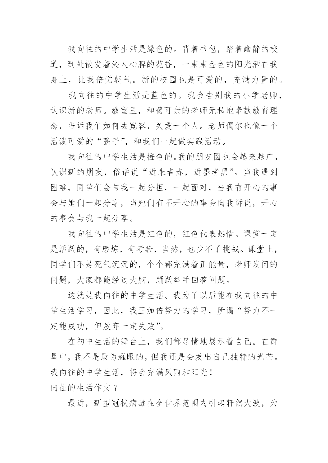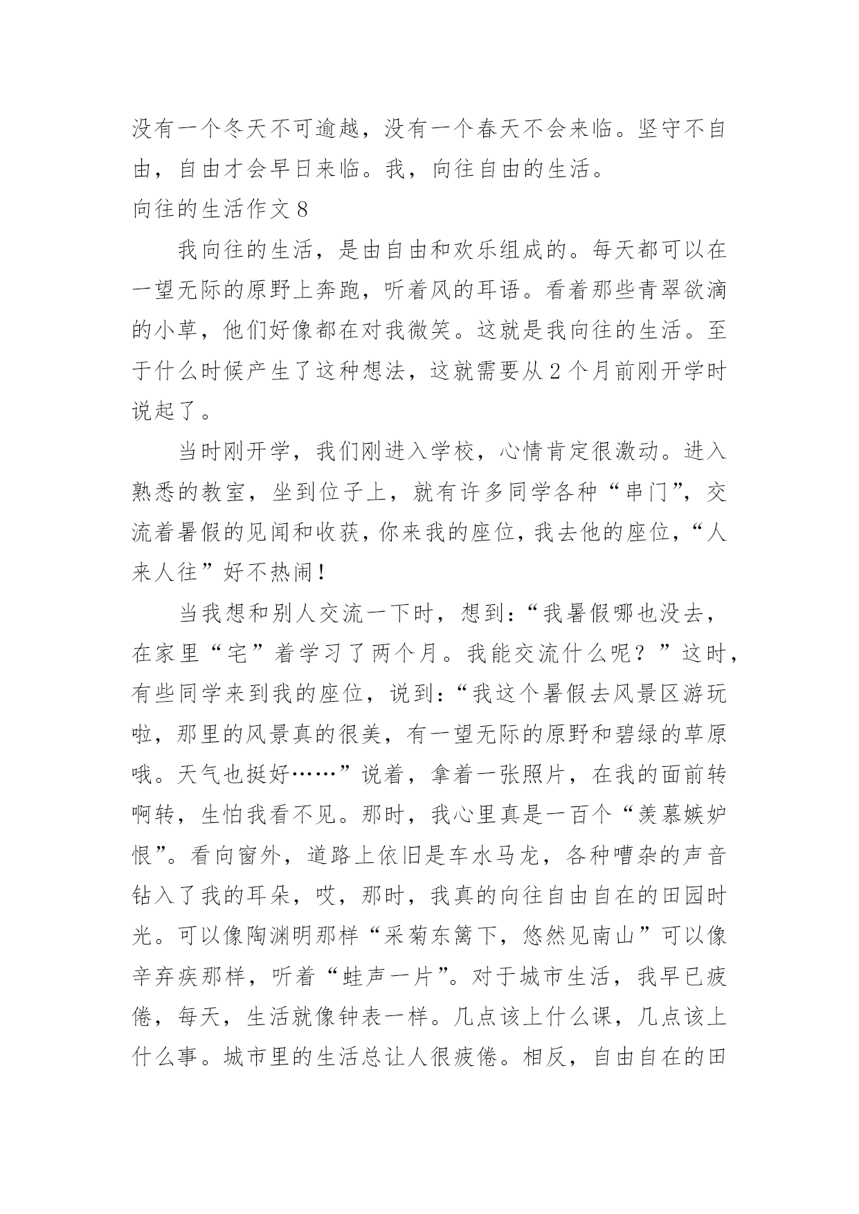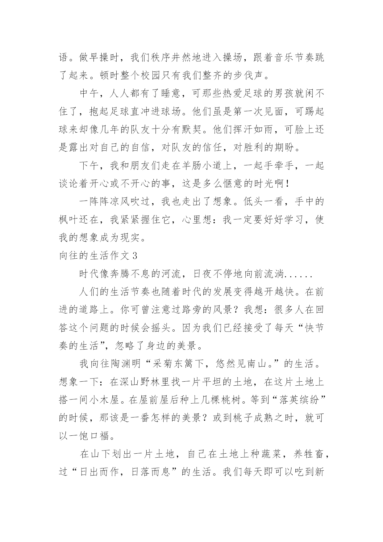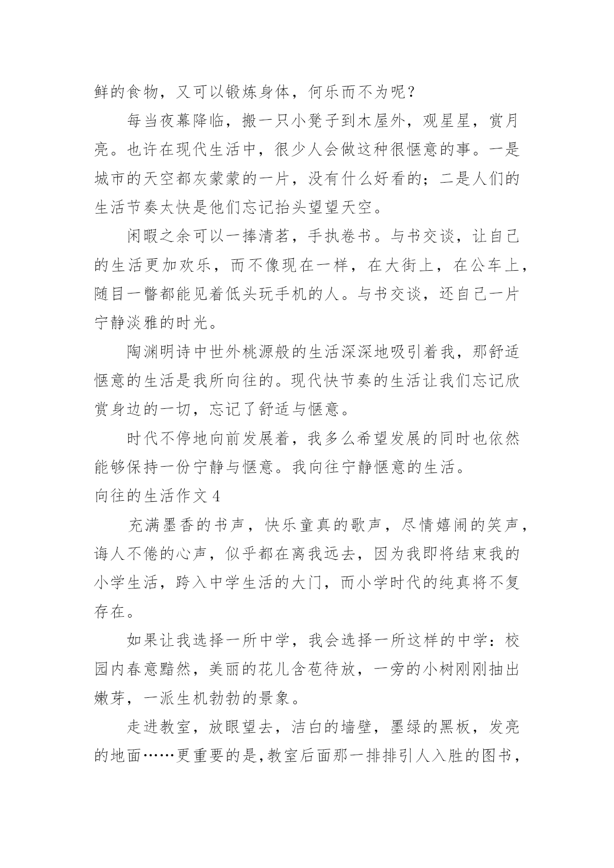 向往的生活作文向往的生活作文【热门】在生活、工作和学习中,大家总免不了要接触或使用作文吧,写作文可以锻炼我们的独处习惯,让自己的心静下来,思考自己未来的方向。怎么写作文才能避免踩雷呢?以下是小编整理的向往的生活作文,仅供参考,欢迎大家阅读。向往的生活作文1乡村,曾是我们祖祖辈辈生活的地方;乡村,也是人们对宁静生活的向往;乡村,凝结了农民伯伯耕作时辛勤的汗水,也收藏了他们丰收时的喜悦。今天,让我们走进乡村,领略田园风光,体验地道的乡村生活吧!与城市的繁华与热闹不同,这里没有那么多的车水马龙、高楼大厦。但是每一处低矮的房屋零星地散布在田间地头,袅袅的炊烟从屋脊上方飘出,你会觉得它们本就与大自然浑然天成。放慢生活的脚步,和当地的村民一起度过忙碌又充实的一天,你的内心会变得更加宁静。春风拂面,在这里,春的气息更加丰盈,春的姿态更加妩媚。公鸡的啼叫声催促着乡亲们踏着晨光出门劳作,孩子们追着朝阳赶去学堂。乡间的小路虽然狭窄,但是它却承载着无数的人们对新的一天的憧憬,它们弯弯曲曲通向一块块麦田,一处处果园。人们来到了自己守望希望的地方,有的脸朝黄土背朝天地劳作,有的在劳动疲倦时坐在田埂上抽起了旱烟。秧苗整齐地排列在田间地头,它们站好了自己的方块队,等待着雨露的浇灌,等待着太阳光芒的召唤,再过几个月它们就成熟了,可以为农民伯伯带来收入,让农民伯伯一年的辛勤劳作有了回报!几只飞鸟从天空滑翔而过,它们也是乡村的常驻民,它们偶尔会降落在农家小院里,调皮地在院里探险,也会在不远处的山林安家筑巢。农民们很少驱赶他们,因为他们知道美好的自然风光从来不是被人类独自享有的。你愿意和我一起躺在绿草茵茵的山坡上看云朵的变化吗?你愿意和我一起去捉几只小虫,看看他们究竟有多顽皮可爱吗?真希望越来越多的人和我一样,能向往着那片清新而又独具特色的人间天堂。向往的生活作文2深秋,凉风习习,我漫步在枫叶林里,树上那一片片枫叶似乎承载了我小学的许多回忆,这一片是我们上课时充满活力的情景,那一片是我们一起参加活动团结一致的情景,而那一片是我们分别时依依不舍的情景……忽然,一片枫叶落到了我的手中,这让我对初中的生活有了憧憬及想象。进入中学,那高大粗壮的柳树,那充满活力的同学们,那充满书香的课本……一切都令我着迷。早晨,整个校园都是我们整齐响亮的读书声。在课堂上,我们专心听讲,积极地发言,遇到不会的题目会有热心的同学来帮助解答。下课后,整个教室都充满了同学们的欢声笑语。做早操时,我们秩序井然地进入操场,跟着音乐节奏跳了起来。顿时整个校园只有我们整齐的步伐声。中午,人人都有了睡意,可那些热爱足球的男孩就闲不住了,抱起足球直冲进球场。他们虽是第一次见面,可踢起球来却像几年的队友十分有默契。他们挥汗如雨,可脸上还是露出对自己的自信,对队友的信任,对胜利的期盼。下午,我和朋友们走在羊肠小道上,一起手牵手,一起谈论着开心或不开心的事,这是多么惬意的时光啊!一阵阵凉风吹过,我也走出了想象。低头一看,手中的枫叶还在,我紧紧握住它,心里想:我一定要好好学习,使我的想象成为现实。向往的生活作文3时代像奔腾不息的河流,日夜不停地向前流淌......人们的生活节奏也随着时代的发展变得越开越快。在前进的道路上。你可曾注意过路旁的风景?我想:很多人在回答这个问题的时候会摇头。因为我们已经接受了每天“快节奏的生活”,忽略了身边的美景。我向往陶渊明“采菊东篱下,悠然见南山。”的生活。想象一下:在深山野林里找一片平坦的土地,在这片土地上搭一间小木屋。在屋前屋后种上几棵桃树。等到“落英缤纷”的时候,那该是一番怎样的美景?或到桃子成熟之时,就可以一饱口福。在山下划出一片土地,自己在土地上种蔬菜,养牲畜,过“日出而作,日落而息”的生活。我们每天即可以吃到新鲜的食物,又可以锻炼身体,何乐而不为呢?每当夜幕降临,搬一只小凳子到木屋外,观星星,赏月亮。也许在现代生活中,很少人会做这种很惬意的事。一是城市的天空都灰蒙蒙的一片,没有什么好看的;二是人们的生活节奏太快是他们忘记抬头望望天空。闲暇之余可以一捧清茗,手执卷书。与书交谈,让自己的生活更加欢乐,而不像现在一样,在大街上,在公车上,随目一瞥都能见着低头玩手机的人。与书交谈,还自己一片宁静淡雅的时光。陶渊明诗中世外桃源般的生活深深地吸引着我,那舒适惬意的生活是我所向往的。现代快节奏的生活让我们忘记欣赏身边的一切,忘记了舒适与惬意。时代不停地向前发展着,我多么希望发展的同时也依然能够保持一份宁静与惬意。我向往宁静惬意的生活。向往的生活作文4充满墨香的书声,快乐童真的歌声,尽情嬉闹的笑声,诲人不倦的心声,似乎都在离我远去,因为我即将结束我的小学生活,跨入中学生活的大门,而小学时代的纯真将不复存在。如果让我选择一所中学,我会选择一所这样的中学:校园内春意黯然,美丽的花儿含苞待放