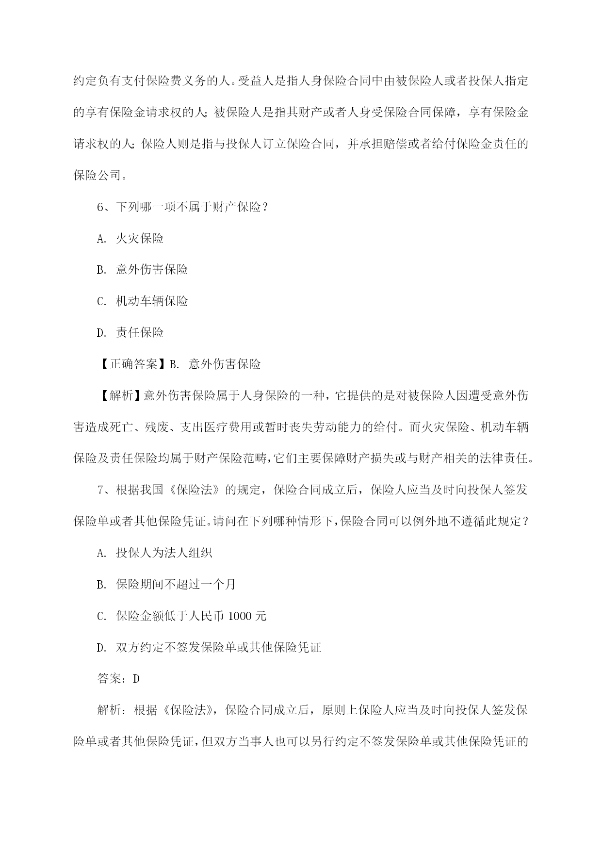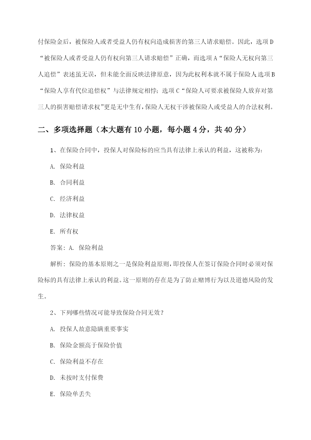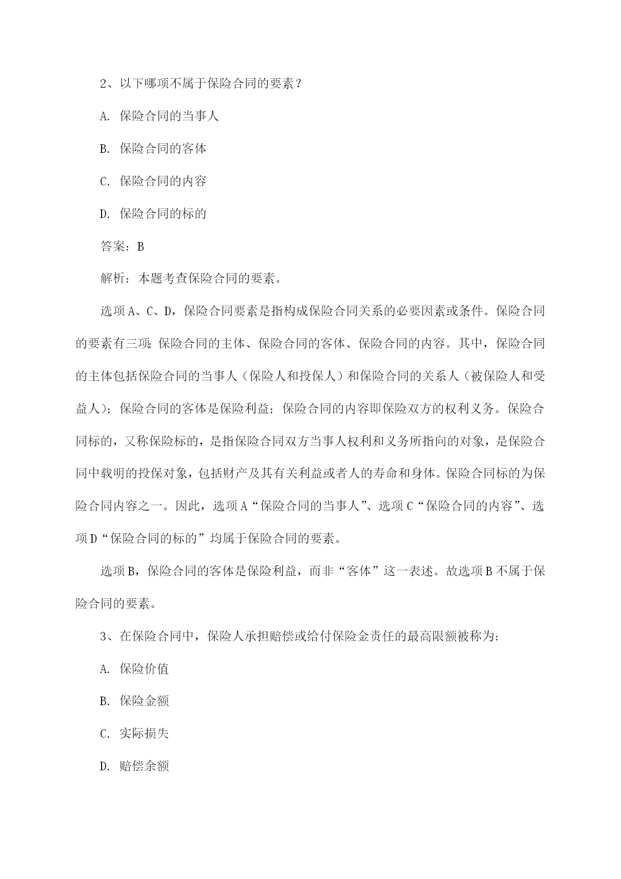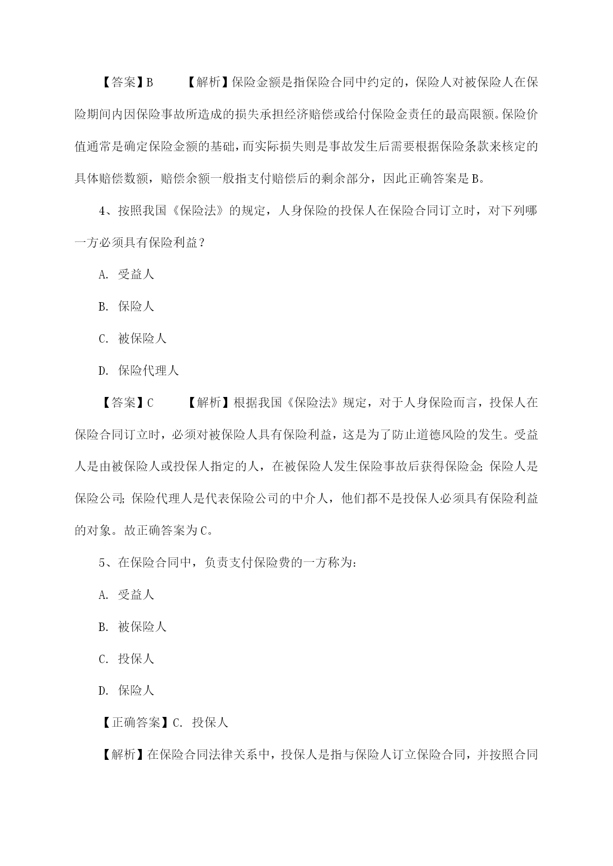 招聘保险岗位笔试题与参考答案一、单项选择题(本大题有10小题,每小题2分,共20分)1、在保险合同中,保险标的的保险价值,可以由投保人和保险人约定并在合同中载明,也可以按照()确定。A.保险事故发生时保险标的的实际价值B.保险事故发生时保险标的的市场价值C.订立保险合同时保险标的的实际价值D.订立保险合同时保险标的的市场价值答案:A解析:本题考查的是保险价值确定的相关规定。选项A、B,根据《保险法》第五十五条:“投保人和保险人约定保险标的的保险价值并在合同中载明的,保险标的发生损失时,以约定的保险价值为赔偿计算标准。投保人和保险人未约定保险标的的保险价值的,保险标的发生损失时,以保险事故发生时保险标的的实际价值为赔偿计算标准”。本题中,在保险合同中没有约定保险价值时,按照保险事故发生时保险标的的实际价值确定保险价值。故选项A“保险事故发生时保险标的的实际价值”正确,选项B“保险事故发生时保险标的的市场价值”错误。选项C、D,根据《保险法解释(四)》第四条:“人民法院认定保险标的是否构成保险法第五十五条规定的‘实际价值’,应当综合考虑原装配置、使用年限、使用情况、折旧等因素”。订立保险合同时,保险标的的实际价值或者市场价值均非确定保险价值的依据。所以,选项C“订立保险合同时保险标的的实际价值”、选项D“订立保险合同时保险标的的市场价值”均错误。2、以下哪项不属于保险合同的要素?A.保险合同的当事人B.保险合同的客体C.保险合同的内容D.保险合同的标的答案:B解析:本题考查保险合同的要素。选项A、C、D,保险合同要素是指构成保险合同关系的必要因素或条件。保险合同的要素有三项:保险合同的主体、保险合同的客体、保险合同的内容。其中,保险合同的主体包括保险合同的当事人(保险人和投保人)和保险合同的关系人(被保险人和受益人);保险合同的客体是保险利益;保险合同的内容即保险双方的权利义务。保险合同标的,又称保险标的,是指保险合同双方当事人权利和义务所指向的对象,是保险合同中载明的投保对象,包括财产及其有关利益或者人的寿命和身体。保险合同标的为保险合同内容之一。因此,选项A“保险合同的当事人”、选项C“保险合同的内容”、选项D“保险合同的标的”均属于保险合同的要素。选项B,保险合同的客体是保险利益,而非“客体”这一表述。故选项B不属于保险合同的要素。3、在保险合同中,保险人承担赔偿或给付保险金责任的最高限额被称为:A.保险价值B.保险金额C.实际损失D.赔偿余额【答案】B【解析】保险金额是指保险合同中约定的,保险人对被保险人在保险期间内因保险事故所造成的损失承担经济赔偿或给付保险金责任的最高限额。保险价值通常是确定保险金额的基础,而实际损失则是事故发生后需要根据保险条款来核定的具体赔偿数额,赔偿余额一般指支付赔偿后的剩余部分,因此正确答案是B。4、按照我国《保险法》的规定,人身保险的投保人在保险合同订立时,对下列哪一方必须具有保险利益?A.受益人B.保险人C.被保险人D.保险代理人【答案】C【解析】根据我国《保险法》规定,对于人身保险而言,投保人在保险合同订立时,必须对被保险人具有保险利益,这是为了防止道德风险的发生。受益人是由被保险人或投保人指定的人,在被保险人发生保险事故后获得保险金;保险人是保险公司;保险代理人是代表保险公司的中介人,他们都不是投保人必须具有保险利益的对象。故正确答案为C。5、在保险合同中,负责支付保险费的一方称为:A.受益人B.被保险人C.投保人D.保险人【正确答案】C.投保人【解析】在保险合同法律关系中,投保人是指与保险人订立保险合同,并按照合同约定负有支付保险费义务的人。受益人是指人身保险合同中由被保险人或者投保人指定的享有保险金请求权的人;被保险人是指其财产或者人身受保险合同保障,享有保险金请求权的人;保险人则是指与投保人订立保险合同,并承担赔偿或者给付保险金责任的保险公司。6、下列哪一项不属于财产保险?A.火灾保险B.意外伤害保险C.机动车辆保险D.责任保险【正确答案】B.意外伤害保险【解析】意外伤害保险属于人身保险的一种,它提供的是对被保险人因遭受意外伤害造成死亡、残废、支出医疗费用或暂时丧失劳动能力的给付。而火灾保险、机动车辆保险及责任保险均属于财产保险范畴,它们主要保障财产损失或与财产相关的法律责任。7、根据我国《保险法》的规定,保险合同成立后,保险人应当及时向投保人签发保险单或者其他保险凭证。请问在下列哪种情形下,保险合同可以例外地不遵循此规定?A.投保人为法人组织B.保险期间不超过一个月C.保险金额低于人民币1000元D.双方约定不签发保险单或其他保险凭证答案:D解析:根据《保险法》,保险合同成立后