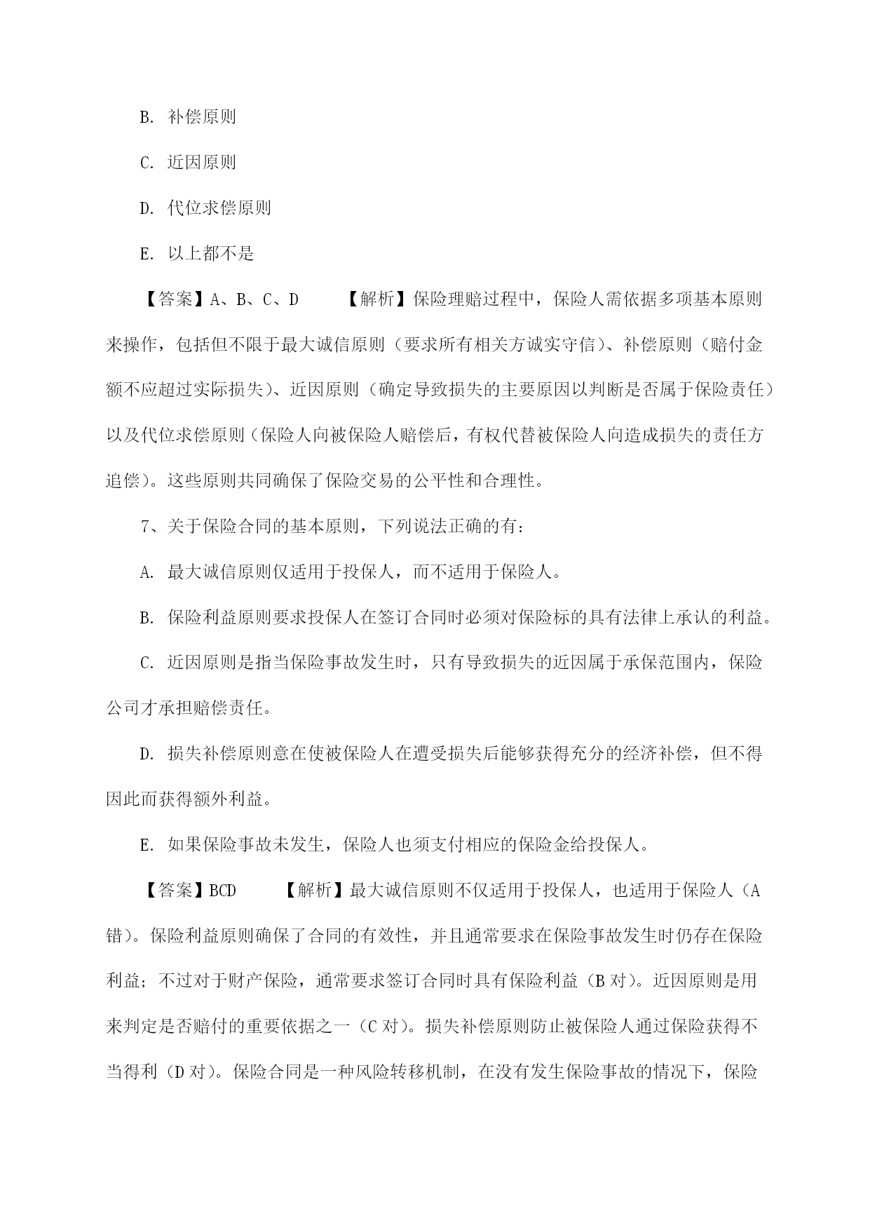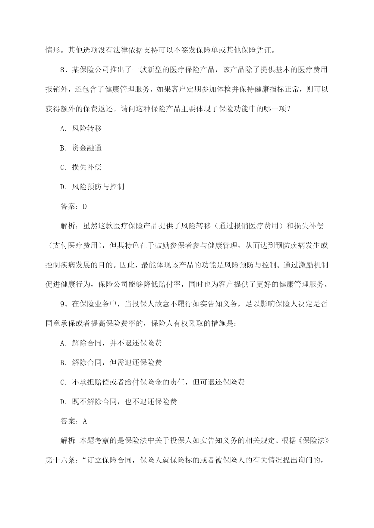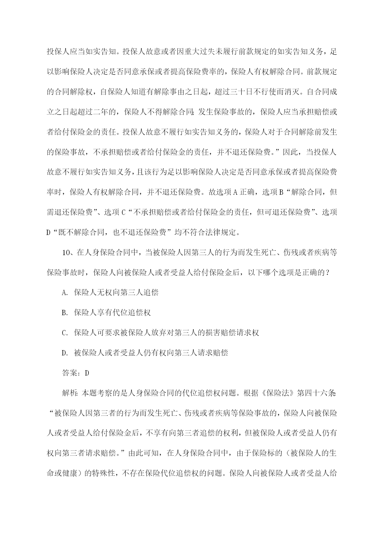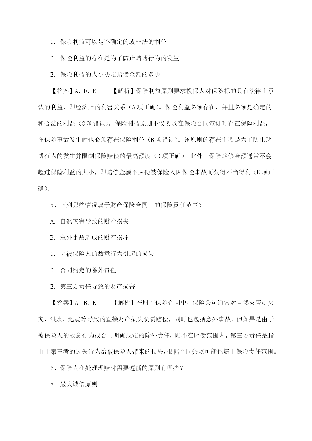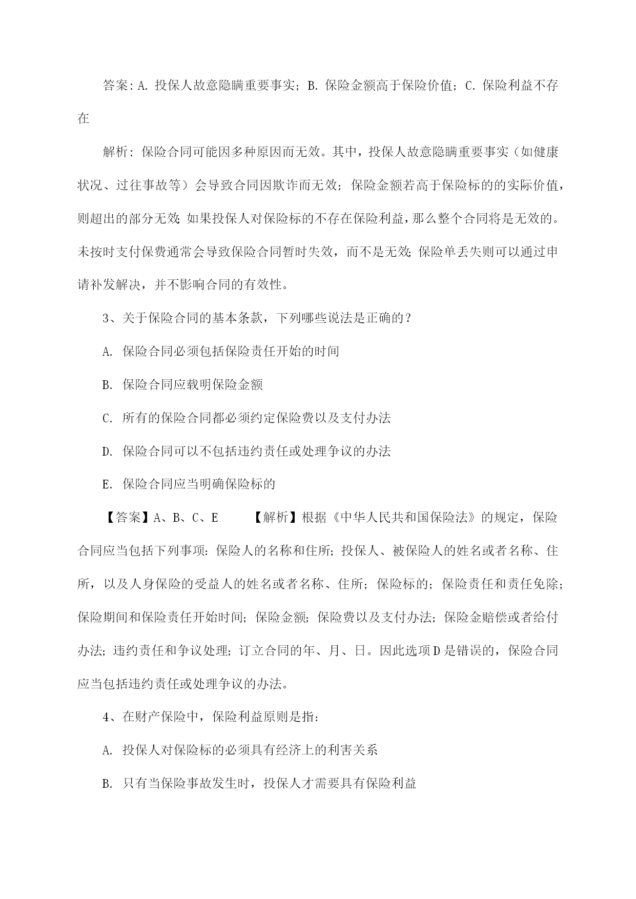 招聘保险岗位笔试题与参考答案一、单项选择题(本大题有10小题,每小题2分,共20分)1、在保险合同中,保险标的的保险价值,可以由投保人和保险人约定并在合同中载明,也可以按照()确定。A.保险事故发生时保险标的的实际价值B.保险事故发生时保险标的的市场价值C.订立保险合同时保险标的的实际价值D.订立保险合同时保险标的的市场价值答案:A解析:本题考查的是保险价值确定的相关规定。选项A、B,根据《保险法》第五十五条:“投保人和保险人约定保险标的的保险价值并在合同中载明的,保险标的发生损失时,以约定的保险价值为赔偿计算标准。投保人和保险人未约定保险标的的保险价值的,保险标的发生损失时,以保险事故发生时保险标的的实际价值为赔偿计算标准”。本题中,在保险合同中没有约定保险价值时,按照保险事故发生时保险标的的实际价值确定保险价值。故选项A“保险事故发生时保险标的的实际价值”正确,选项B“保险事故发生时保险标的的市场价值”错误。选项C、D,根据《保险法解释(四)》第四条:“人民法院认定保险标的是否构成保险法第五十五条规定的‘实际价值’,应当综合考虑原装配置、使用年限、使用情况、折旧等因素”。订立保险合同时,保险标的的实际价值或者市场价值均非确定保险价值的依据。所以,选项C“订立保险合同时保险标的的实际价值”、选项D“订立保险合同时保险标的的市场价值”均错误。2、以下哪项不属于保险合同的要素?A.保险合同的当事人B.保险合同的客体C.保险合同的内容D.保险合同的标的答案:B解析:本题考查保险合同的要素。选项A、C、D,保险合同要素是指构成保险合同关系的必要因素或条件。保险合同的要素有三项:保险合同的主体、保险合同的客体、保险合同的内容。其中,保险合同的主体包括保险合同的当事人(保险人和投保人)和保险合同的关系人(被保险人和受益人);保险合同的客体是保险利益;保险合同的内容即保险双方的权利义务。保险合同标的,又称保险标的,是指保险合同双方当事人权利和义务所指向的对象,是保险合同中载明的投保对象,包括财产及其有关利益或者人的寿命和身体。保险合同标的为保险合同内容之一。因此,选项A“保险合同的当事人”、选项C“保险合同的内容”、选项D“保险合同的标的”均属于保险合同的要素。选项B,保险合同的客体是保险利益,而非“客体”这一表述。故选项B不属于保险合同的要素。3、在保险合同中,保险人承担赔偿或给付保险金责任的最高限额被称为:A.保险价值B.保险金额C.实际损失D.赔偿余额【答案】B【解析】保险金额是指保险合同中约定的,保险人对被保险人在保险期间内因保险事故所造成的损失承担经济赔偿或给付保险金责任的最高限额。保险价值通常是确定保险金额的基础,而实际损失则是事故发生后需要根据保险条款来核定的具体赔偿数额,赔偿余额一般指支付赔偿后的剩余部分,因此正确答案是B。4、按照我国《保险法》的规定,人身保险的投保人在保险合同订立时,对下列哪一方必须具有保险利益?A.受益人B.保险人C.被保险人D.保险代理人【答案】C【解析】根据我国《保险法》规定,对于人身保险而言,投保人在保险合同订立时,必须对被保险人具有保险利益,这是为了防止道德风险的发生。受益人是由被保险人或投保人指定的人,在被保险人发生保险事故后获得保险金;保险人是保险公司;保险代理人是代表保险公司的中介人,他们都不是投保人必须具有保险利益的对象。故正确答案为C。5、在保险合同中,负责支付保险费的一方称为:A.受益人B.被保险人C.投保人D.保险人【正确答案】C.投保人【解析】在保险合同法律关系中,投保人是指与保险人订立保险合同,并按照合同约定负有支付保险费义务的人。受益人是指人身保险合同中由被保险人或者投保人指定的享有保险金请求权的人;被保险人是指其财产或者人身受保险合同保障,享有保险金请求权的人;保险人则是指与投保人订立保险合同,并承担赔偿或者给付保险金责任的保险公司。6、下列哪一项不属于财产保险?A.火灾保险B.意外伤害保险C.机动车辆保险D.责任保险【正确答案】B.意外伤害保险【解析】意外伤害保险属于人身保险的一种,它提供的是对被保险人因遭受意外伤害造成死亡、残废、支出医疗费用或暂时丧失劳动能力的给付。而火灾保险、机动车辆保险及责任保险均属于财产保险范畴,它们主要保障财产损失或与财产相关的法律责任。7、根据我国《保险法》的规定,保险合同成立后,保险人应当及时向投保人签发保险单或者其他保险凭证。请问在下列哪种情形下,保险合同可以例外地不遵循此规定?A.投保人为法人组织B.保险期间不超过一个月C.保险金额低于人民币1000元D.双方约定不签发保险单或其他保险凭证答案:D解析:根据《保险法》,保险合同成立后
