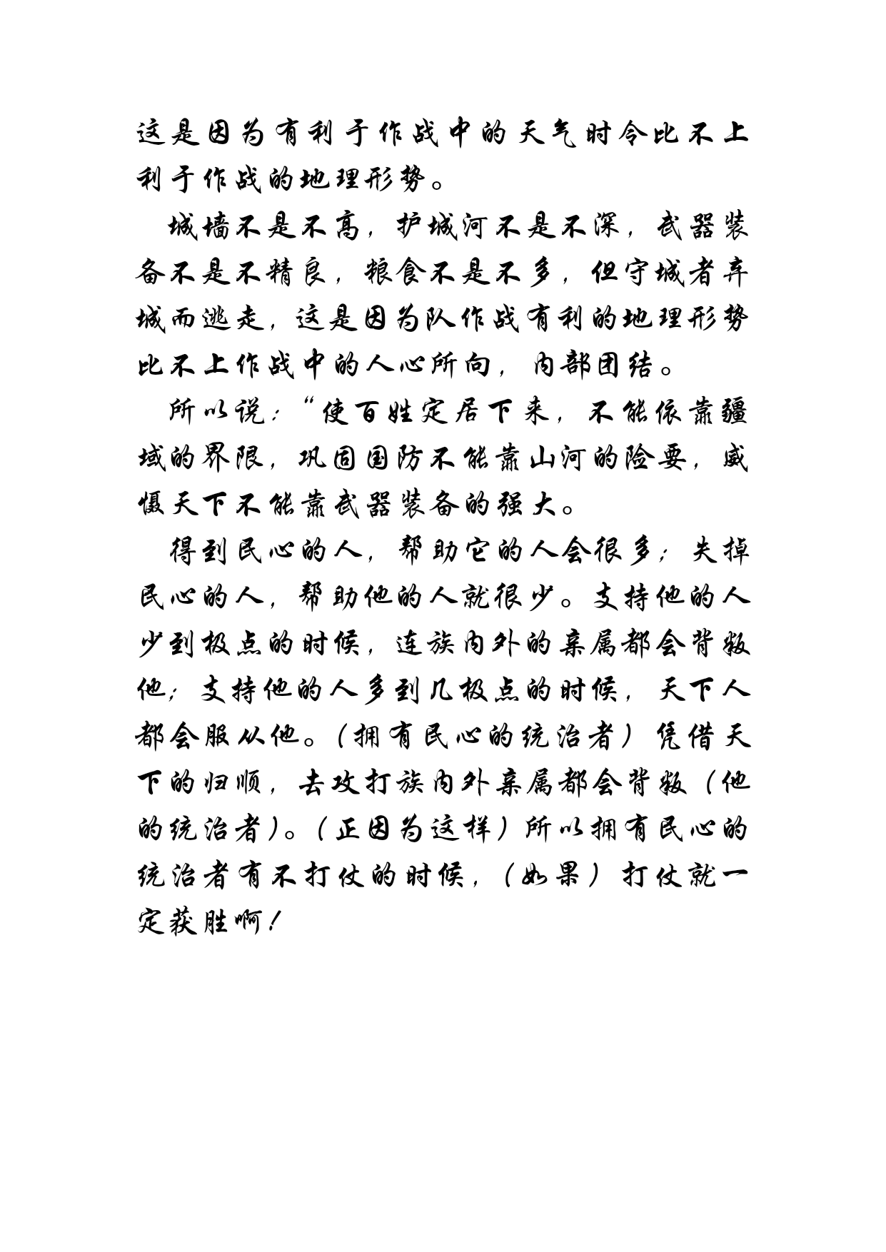 天时不如地利孟子曰:“天时不如地利,地利不如人和。”三里之城,七里之郭,环而攻之而不胜。夫环而攻之,必有得天时者矣,然而不胜者是天时不如地利也。城非不高也,池非不深也,兵革非不坚利也,米粟非不多也,委而去之,是地利不如人和也。故曰:“域民不以封疆之界,固国不以山溪之险,威天下不以兵革之利。得道者多助,失道者寡助。寡助之至,亲戚畔之。多助之至,天下顺之。以天下之所顺攻亲戚之所畔,故君子有不战,战必胜矣。”译文:孟子说:“拥有利于作战的时令,气候,比不上拥有利于作战的地理形势:拥有利于作战的地理形势,比不上作战中的上下团结的人心。”周围三里的小城,七里的外城,包围着攻打他却不能取胜。包围着攻打他,必定是得到天气时令的有利条件了,这样却不能取胜,这是因为有利于作战中的天气时令比不上利于作战的地理形势。城墙不是不高,护城河不是不深,武器装备不是不精良,粮食不是不多,但守城者弃城而逃走,这是因为队作战有利的地理形势比不上作战中的人心所向,内部团结。所以说:“使百姓定居下来,不能依靠疆域的界限,巩固国防不能靠山河的险要,威慑天下不能靠武器装备的强大。得到民心的人,帮助它的人会很多;失掉民心的人,帮助他的人就很少。支持他的人少到极点的时候,连族内外的亲属都会背叛他;支持他的人多到几极点的时候,天下人都会服从他。(拥有民心的统治者)凭借天下的归顺,去攻打族内外亲属都会背叛(他的统治者)。(正因为这样)所以拥有民心的统治者有不打仗的时候,(如果)打仗就一定获胜啊!