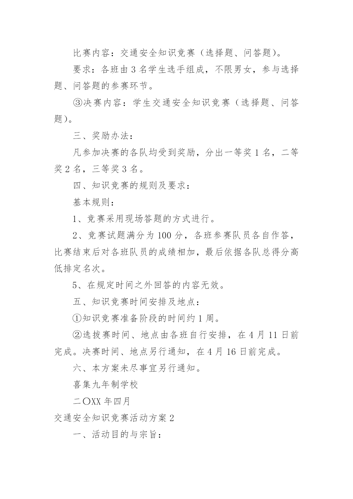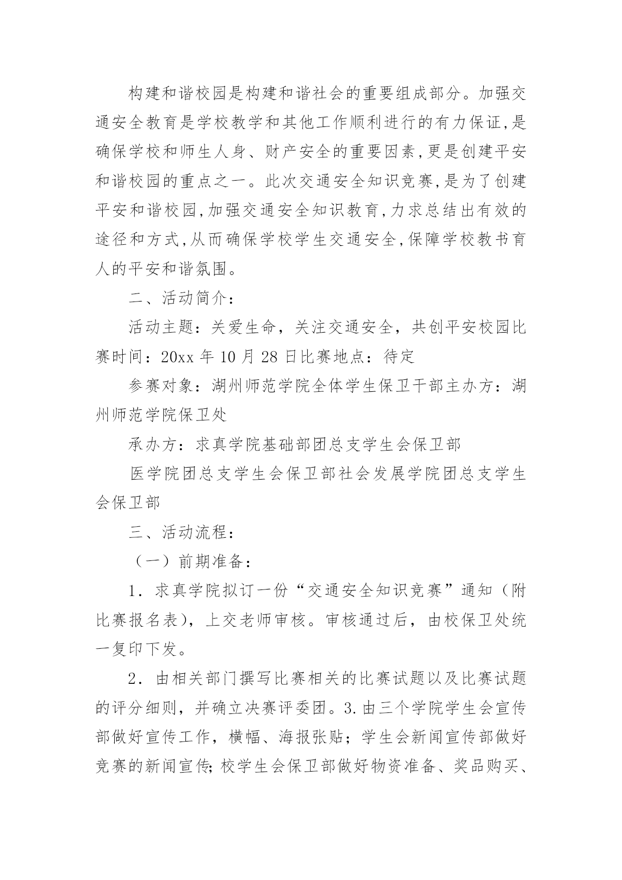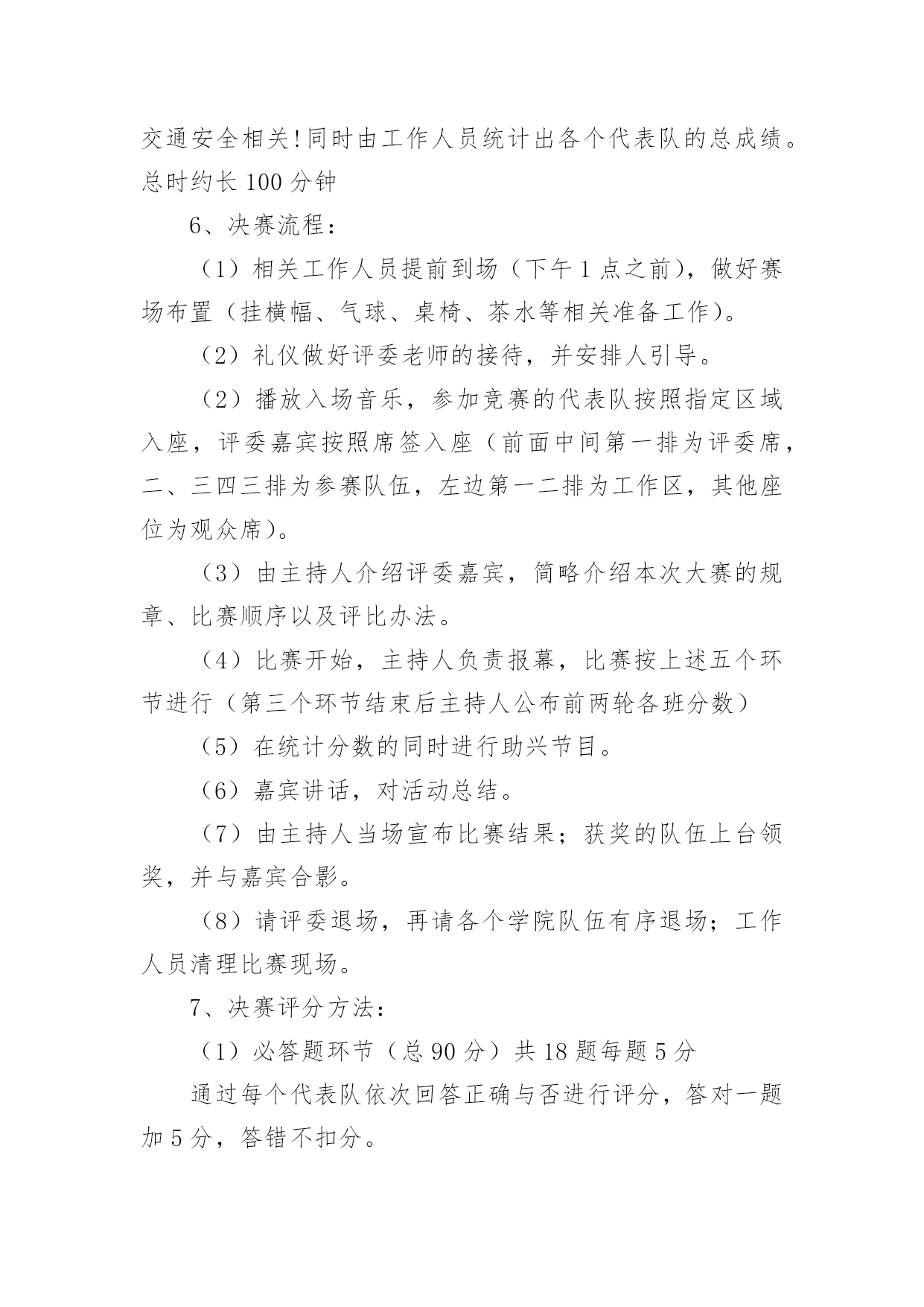 交通安全知识竞赛活动方案交通安全知识竞赛活动方案为了确定工作或事情顺利开展,通常需要提前准备好一份方案,方案是解决一个问题或者一项工程,一个课题的详细过程。那么方案应该怎么制定才合适呢?下面是小编整理的交通安全知识竞赛活动方案,仅供参考,希望能够帮助到大家。交通安全知识竞赛活动方案1为进一步做好中小学生交通安全教育工作,提高学生文明交通素质,增强安全意识,开展“绿色出行、文明交通、从我做起”交通安全知识竞赛活动,活动方案如下:一、目的和宗旨:以宣传“倡导文明交通行为,自觉遵守交通安全”为目标,努力提高学生的`交通安全知识水平,增强交通安全意识和自我防范能力,做遵守交通法律的宣传者和实践者。二、参赛形式及办法:1、参赛形式:以班级为单位进行组队参赛。2、参赛办法:①选拔赛:在学校三至八年级进行选拔赛,由各班班主任自行组织安排选拔。每班最终推选出三人以班级为单位进行决赛。②决赛:比赛内容:交通安全知识竞赛(选择题、问答题)。要求:各班由3名学生选手组成,不限男女,参与选择题、问答题的参赛环节。③决赛内容:学生交通安全知识竞赛(选择题、问答题)。三、奖励办法:凡参加决赛的各队均受到奖励,分出一等奖1名,二等奖2名,三等奖3名。四、知识竞赛的规则及要求:基本规则:1、竞赛采用现场答题的方式进行。2、竞赛试题满分为100分,各班参赛队员各自作答,比赛结束后对各班队员的成绩相加,最后依据各队总得分高低排定名次。5、在规定时间之外回答的内容无效。五、知识竞赛时间安排及地点:①知识竞赛准备阶段的时间约1周。②选拔赛时间、地点由各班自行安排,在4月11日前完成。决赛时间、地点另行通知,在4月16日前完成。六、本方案未尽事宜另行通知。喜集九年制学校二〇XX年四月交通安全知识竞赛活动方案2一、活动目的与宗旨:构建和谐校园是构建和谐社会的重要组成部分。加强交通安全教育是学校教学和其他工作顺利进行的有力保证,是确保学校和师生人身、财产安全的重要因素,更是创建平安和谐校园的重点之一。此次交通安全知识竞赛,是为了创建平安和谐校园,加强交通安全知识教育,力求总结出有效的途径和方式,从而确保学校学生交通安全,保障学校教书育人的平安和谐氛围。二、活动简介:活动主题:关爱生命,关注交通安全,共创平安校园比赛时间:20xx年10月28日比赛地点:待定参赛对象:湖州师范学院全体学生保卫干部主办方:湖州师范学院保卫处承办方:求真学院基础部团总支学生会保卫部医学院团总支学生会保卫部社会发展学院团总支学生会保卫部三、活动流程:(一)前期准备:1.求真学院拟订一份“交通安全知识竞赛”通知(附比赛报名表),上交老师审核。审核通过后,由校保卫处统一复印下发。2.由相关部门撰写比赛相关的比赛试题以及比赛试题的评分细则,并确立决赛评委团。3.由三个学院学生会宣传部做好宣传工作,横幅、海报张贴;学生会新闻宣传部做好竞赛的新闻宣传;校学生会保卫部做好物资准备、奖品购买、邀请函发放。(二)活动具体开展:竞赛安排:(竞赛分五个环节)(1)必答题:参赛队伍对银幕上PPT的题目依次轮流回答,共18题选择题,每题为5分,答对一题加5分,答错不扣分,可以讨论,每题作答限时20秒。答案由主持人当场公布,主持人对选手作答每题答案正确与否进行一定分析评分析,记分人员记录各队分数。(限时25分钟)(2)抢答题:第一环节:眼疾手快。参赛班级对银幕上PPT的题目进行抢答,共12题选择题,每题为5分,答对一题加5分,答错扣5分,可以讨论,每题作答限时5秒。第二环节:风险时速。共分5分题,10分题,15分题,有抢答优先者进行选择分值,答案由主持人当场公布,在第一轮环节中主持人对选手作答每题答案正确与否进行一定分析,记分人员记录各队分数。(限时20分钟)(3)现场互动:由主持人对银幕上的题目对下面参赛观众进行现场互动,对回答的每题答案进行一定分析,并对答对的选手发放奖品。(限时10分钟)(4)自由论述题:在抢答题结束时公布自由论述题题目,由各个学院代表队派人上台抽取各自自由论述题题目,在互动环节结束后,根据各自抽签决定的'顺序依次上台回答,时间限定每队3分钟左右,由评委老师根据评分表进行打分!(限时30分钟)(5)助兴节目:由承办学院推选出一个节目,最好与交通安全相关!同时由工作人员统计出各个代表队的总成绩。总时约长100分钟6、决赛流程:(1)相关工作人员提前到场(下午1点之前),做好赛场布置(挂横幅、气球、桌椅、茶水等相关准备工作)。(2)礼仪做好评委老师的接待,并安排人引导。(2)播放入场音乐,参加竞赛的代表队按照指定区域入座,评委嘉宾按照席签入座(前面中间第一排为评委席,二、三四三排为参赛队伍,左边第一二排为工作区,其他座位为观众席)。(3)由主持人介绍评委嘉宾,简略介绍本次大赛的规章、比赛顺序以及评比办