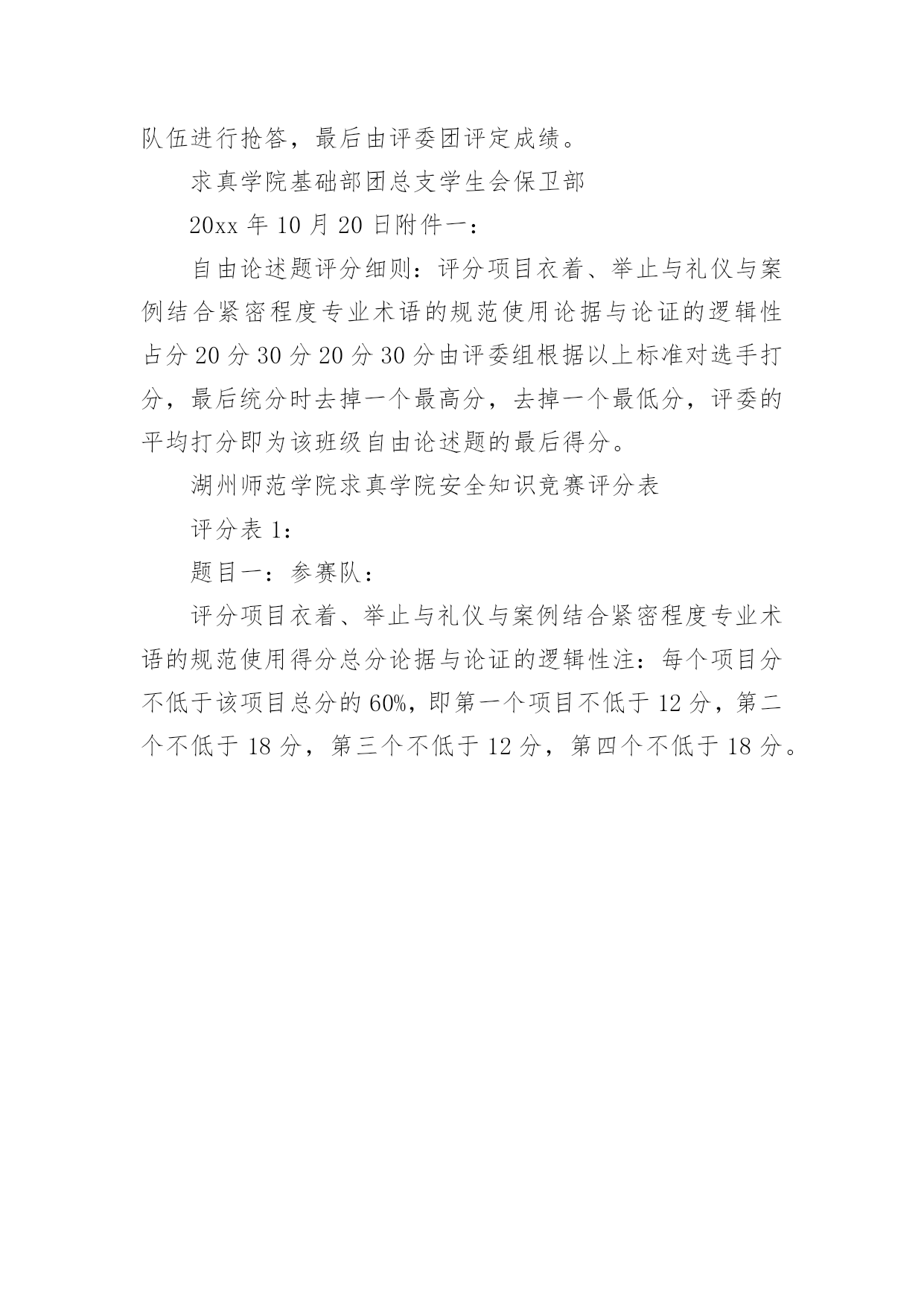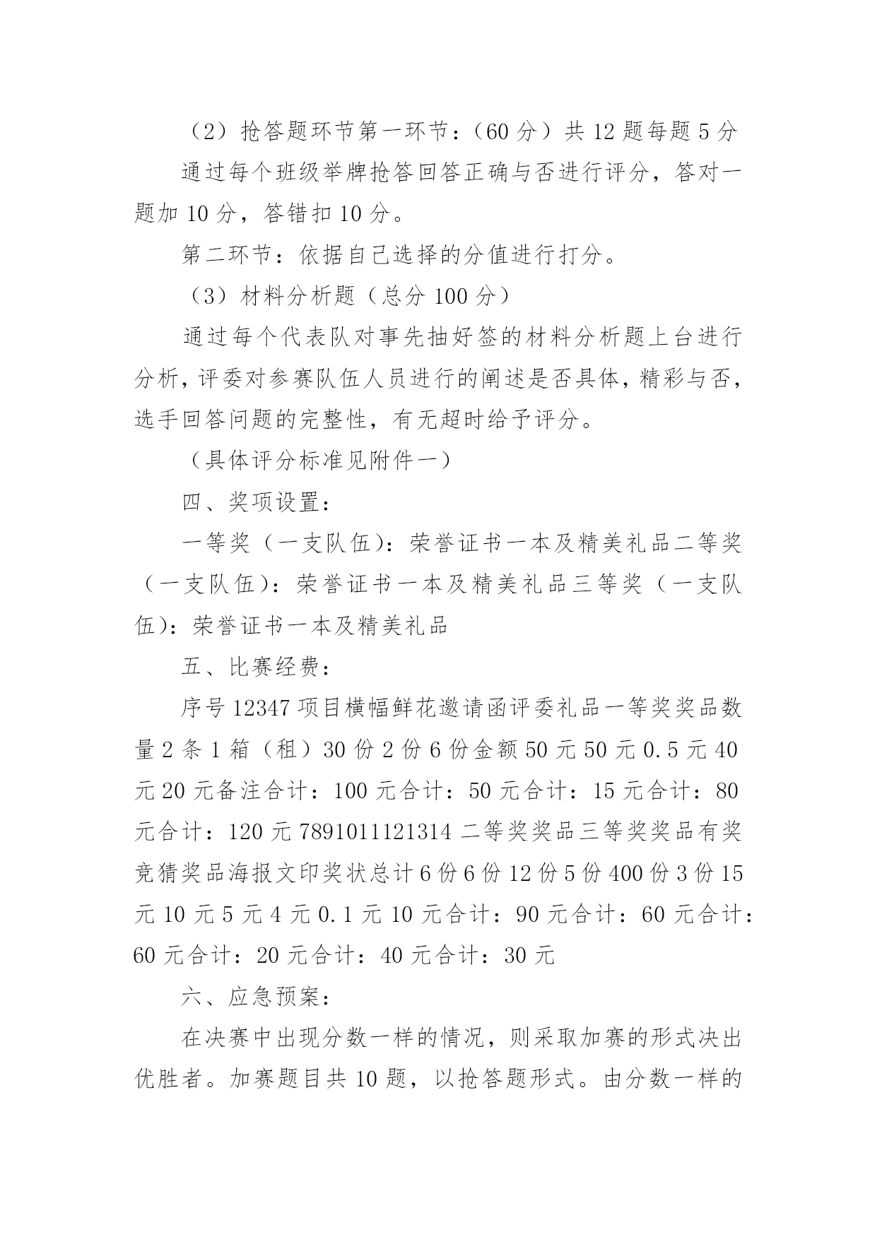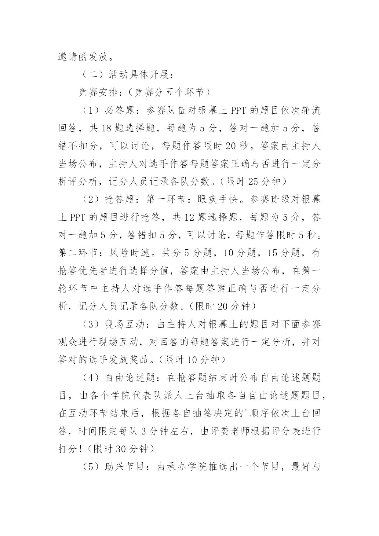 交通安全知识竞赛活动方案交通安全知识竞赛活动方案为了确定工作或事情顺利开展,通常需要提前准备好一份方案,方案是解决一个问题或者一项工程,一个课题的详细过程。那么方案应该怎么制定才合适呢?下面是小编整理的交通安全知识竞赛活动方案,仅供参考,希望能够帮助到大家。交通安全知识竞赛活动方案1为进一步做好中小学生交通安全教育工作,提高学生文明交通素质,增强安全意识,开展“绿色出行、文明交通、从我做起”交通安全知识竞赛活动,活动方案如下:一、目的和宗旨:以宣传“倡导文明交通行为,自觉遵守交通安全”为目标,努力提高学生的`交通安全知识水平,增强交通安全意识和自我防范能力,做遵守交通法律的宣传者和实践者。二、参赛形式及办法:1、参赛形式:以班级为单位进行组队参赛。2、参赛办法:①选拔赛:在学校三至八年级进行选拔赛,由各班班主任自行组织安排选拔。每班最终推选出三人以班级为单位进行决赛。②决赛:比赛内容:交通安全知识竞赛(选择题、问答题)。要求:各班由3名学生选手组成,不限男女,参与选择题、问答题的参赛环节。③决赛内容:学生交通安全知识竞赛(选择题、问答题)。三、奖励办法:凡参加决赛的各队均受到奖励,分出一等奖1名,二等奖2名,三等奖3名。四、知识竞赛的规则及要求:基本规则:1、竞赛采用现场答题的方式进行。2、竞赛试题满分为100分,各班参赛队员各自作答,比赛结束后对各班队员的成绩相加,最后依据各队总得分高低排定名次。5、在规定时间之外回答的内容无效。五、知识竞赛时间安排及地点:①知识竞赛准备阶段的时间约1周。②选拔赛时间、地点由各班自行安排,在4月11日前完成。决赛时间、地点另行通知,在4月16日前完成。六、本方案未尽事宜另行通知。喜集九年制学校二〇XX年四月交通安全知识竞赛活动方案2一、活动目的与宗旨:构建和谐校园是构建和谐社会的重要组成部分。加强交通安全教育是学校教学和其他工作顺利进行的有力保证,是确保学校和师生人身、财产安全的重要因素,更是创建平安和谐校园的重点之一。此次交通安全知识竞赛,是为了创建平安和谐校园,加强交通安全知识教育,力求总结出有效的途径和方式,从而确保学校学生交通安全,保障学校教书育人的平安和谐氛围。二、活动简介:活动主题:关爱生命,关注交通安全,共创平安校园比赛时间:20xx年10月28日比赛地点:待定参赛对象:湖州师范学院全体学生保卫干部主办方:湖州师范学院保卫处承办方:求真学院基础部团总支学生会保卫部医学院团总支学生会保卫部社会发展学院团总支学生会保卫部三、活动流程:(一)前期准备:1.求真学院拟订一份“交通安全知识竞赛”通知(附比赛报名表),上交老师审核。审核通过后,由校保卫处统一复印下发。2.由相关部门撰写比赛相关的比赛试题以及比赛试题的评分细则,并确立决赛评委团。3.由三个学院学生会宣传部做好宣传工作,横幅、海报张贴;学生会新闻宣传部做好竞赛的新闻宣传;校学生会保卫部做好物资准备、奖品购买、邀请函发放。(二)活动具体开展:竞赛安排:(竞赛分五个环节)(1)必答题:参赛队伍对银幕上PPT的题目依次轮流回答,共18题选择题,每题为5分,答对一题加5分,答错不扣分,可以讨论,每题作答限时20秒。答案由主持人当场公布,主持人对选手作答每题答案正确与否进行一定分析评分析,记分人员记录各队分数。(限时25分钟)(2)抢答题:第一环节:眼疾手快。参赛班级对银幕上PPT的题目进行抢答,共12题选择题,每题为5分,答对一题加5分,答错扣5分,可以讨论,每题作答限时5秒。第二环节:风险时速。共分5分题,10分题,15分题,有抢答优先者进行选择分值,答案由主持人当场公布,在第一轮环节中主持人对选手作答每题答案正确与否进行一定分析,记分人员记录各队分数。(限时20分钟)(3)现场互动:由主持人对银幕上的题目对下面参赛观众进行现场互动,对回答的每题答案进行一定分析,并对答对的选手发放奖品。(限时10分钟)(4)自由论述题:在抢答题结束时公布自由论述题题目,由各个学院代表队派人上台抽取各自自由论述题题目,在互动环节结束后,根据各自抽签决定的'顺序依次上台回答,时间限定每队3分钟左右,由评委老师根据评分表进行打分!(限时30分钟)(5)助兴节目:由承办学院推选出一个节目,最好与交通安全相关!同时由工作人员统计出各个代表队的总成绩。总时约长100分钟6、决赛流程:(1)相关工作人员提前到场(下午1点之前),做好赛场布置(挂横幅、气球、桌椅、茶水等相关准备工作)。(2)礼仪做好评委老师的接待,并安排人引导。(2)播放入场音乐,参加竞赛的代表队按照指定区域入座,评委嘉宾按照席签入座(前面中间第一排为评委席,二、三四三排为参赛队伍,左边第一二排为工作区,其他座位为观众席)。(3)由主持人介绍评委嘉宾,简略介绍本次大赛的规章、比赛顺序以及评比办