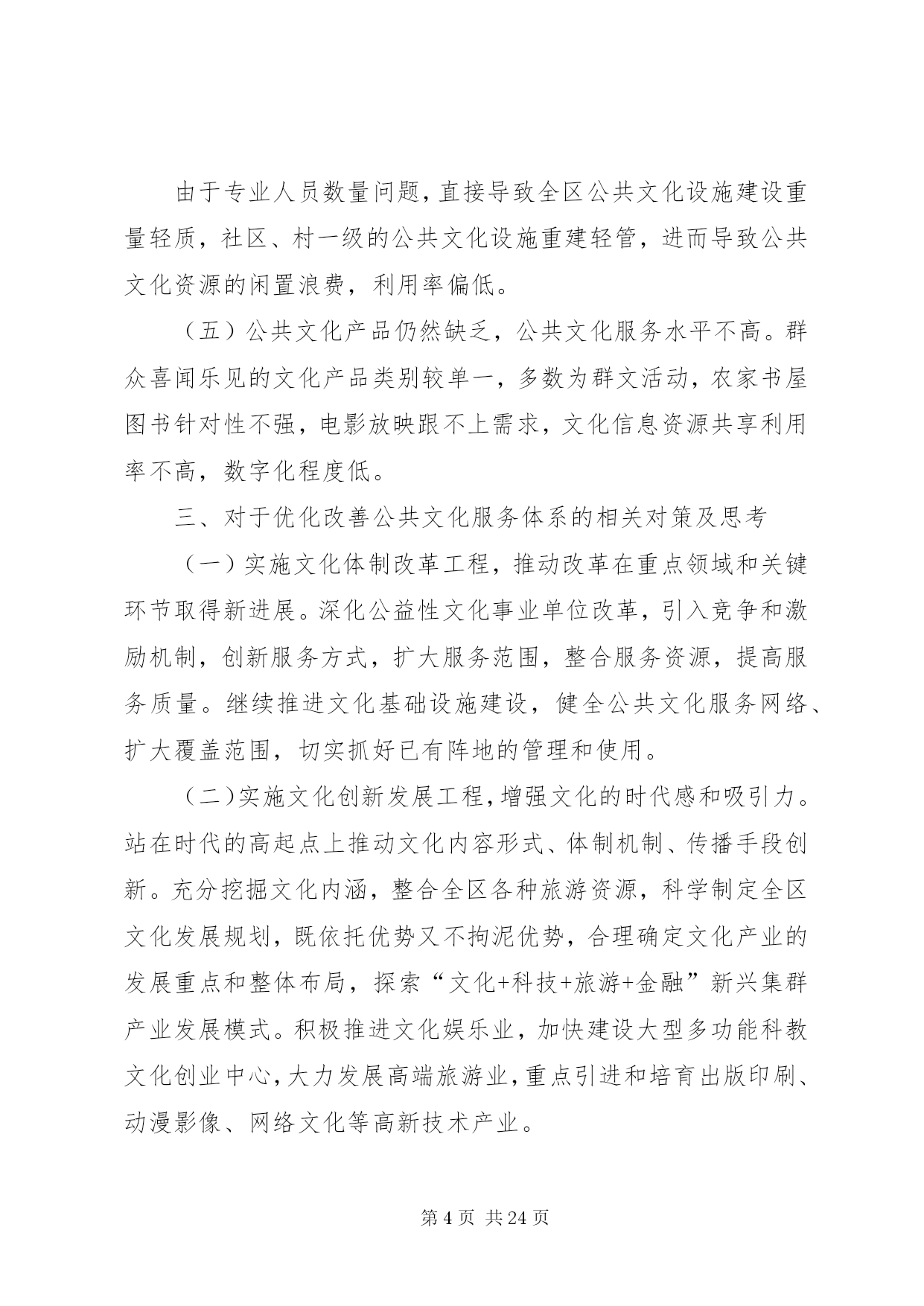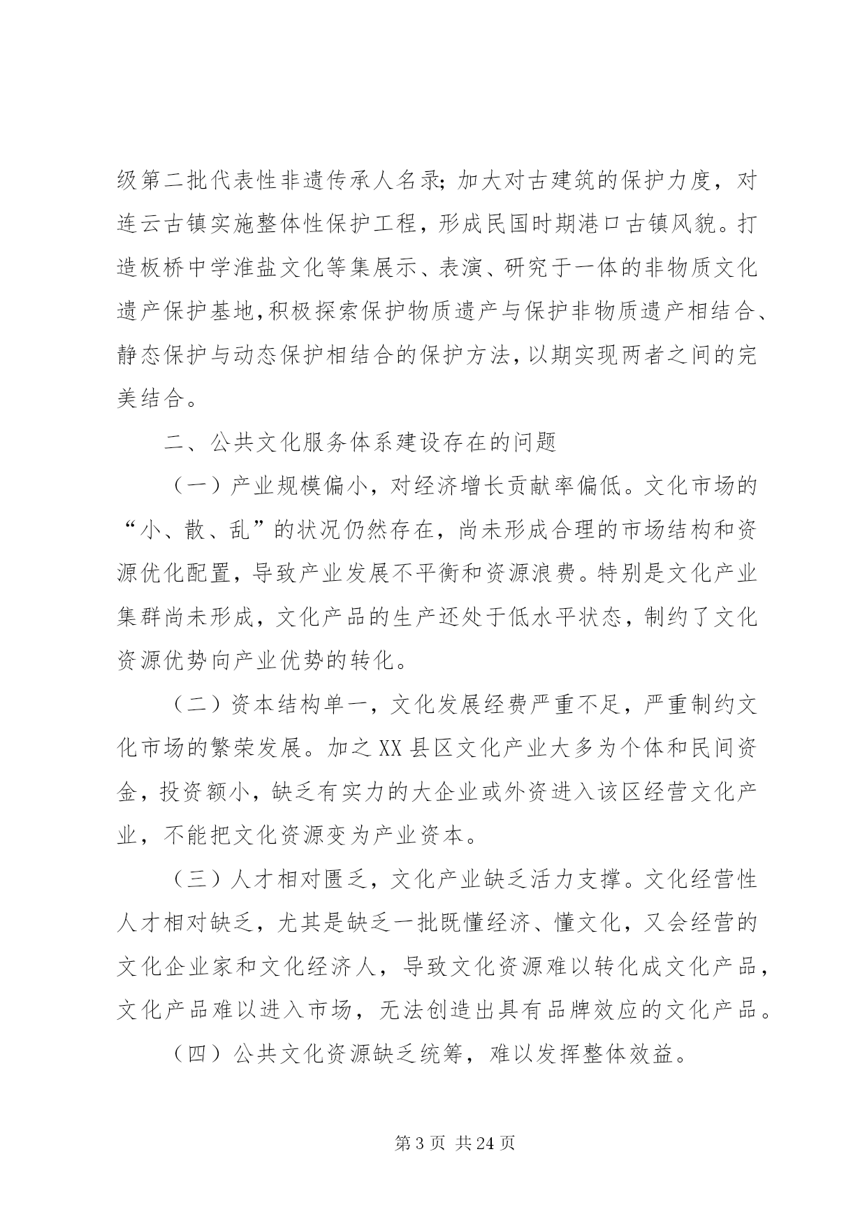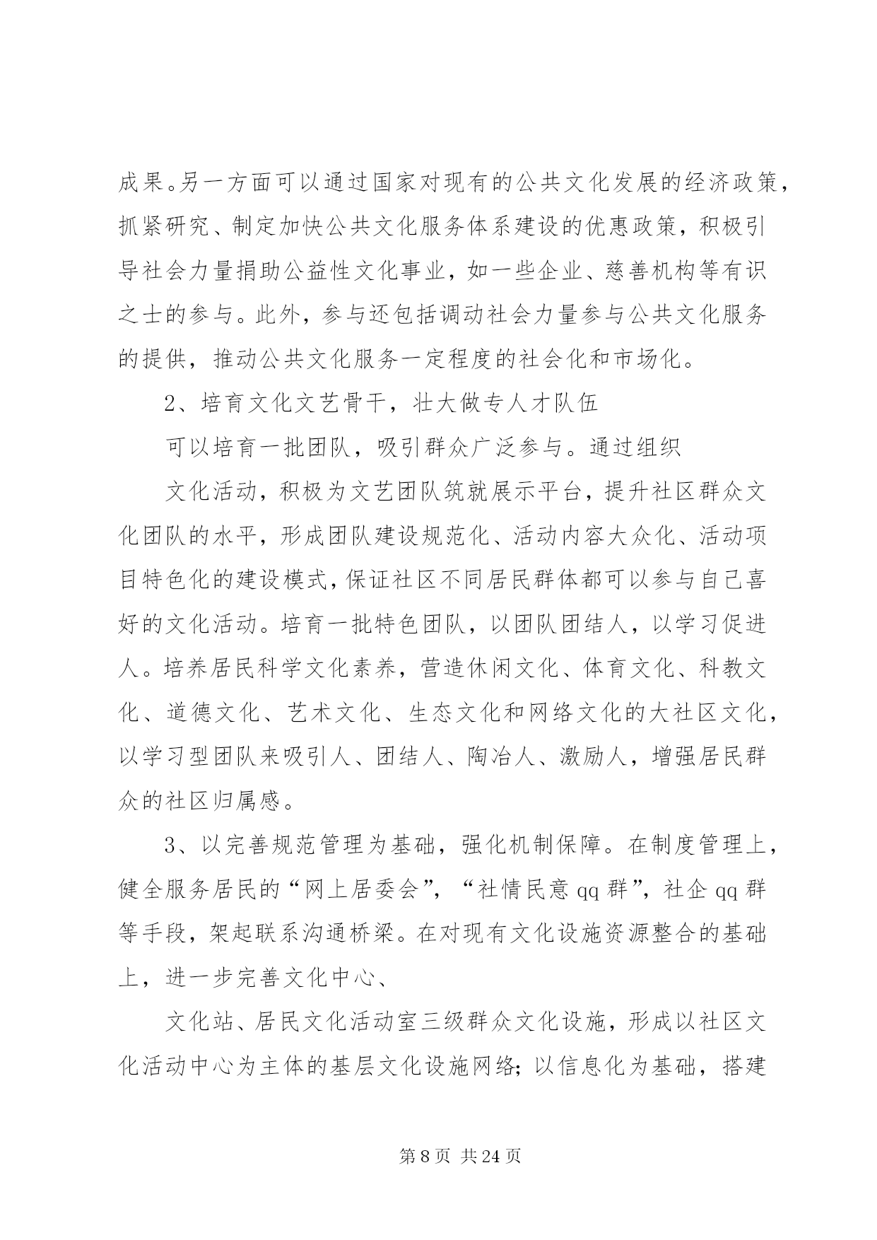 第PAGE\*Arabic\*MERGEFORMAT24页共NUMPAGES\*MERGEFORMAT24页公共文化服务体系的现状及思考关键词:XX县区;公共文化服务体系;现状及思考一、XX县区公共文化服务体系的现状(一)文化基础设施建设逐步改善,公共文化设施网络日益健全近几年来,全区新建、改扩建乡镇文化站、街道文化中心7个,社区文化活动中心24个,村级文化室19个,解决了乡镇、街道文化工作无房和面积不达标问题,形成了“区有两馆、乡有一站、村有一室”的三级文化设施体系,基本实现了阵地、网络和内容的三大覆盖。2010年以来,该区在多点分别建立8个全国文化共享工程基层服务点,在全市率先实现全覆盖。(二)公共文化服务的方式更加丰富,群众文化生活日趋多彩近年来,XX县区坚持以“五大文化”建设、“九大系列活动”的开展带动城乡统筹发展。利用城乡共建文化先进村、“三下乡”等活动载体,实施文化惠民工程。开展送书送戏送电影下乡活动,组织文艺工作者为群众演出,使政府对文体事业的投入直接转化为百姓受益。为积极推进“五大”文化建设,不断丰富城乡群众的精神文化生活,XX县区定期举办夏季海滨广场文化活动、社区艺术节、中老年艺术节、企业文化节、幼儿文化艺术节、全民读书节、全民健身等“九大”文化系列活动。2006年迄今,已组织文化活动400多场。在弱势群体和特殊人群的基本文化服务权益方面,全区各类公共文化设施免费向农民工、老人、儿童和残疾人开放,设置方便残障人士以及老年人、少年儿童的活动区域和服务项目。区各级公共文化设施电子阅览室为社会公众提供免费上网服务时间每周不少于42小时,区图书馆每周开放时间不少于56小时,文化馆(站)每周开放时间不少于42小时。(三)精神文化产品创作成果丰硕,公共文化服务水平不断提高文化馆、图书馆、各乡街文化站等公共文化单位能发挥自身功能,积极转变机制,增强活力,改善服务,不断完善免费或优惠开放制度、服务公示制度,为广大群众提供内容丰富、形式多样的文化服务,大力实施文艺精品工程,以《魅力连云港》、《青春云港》为代表的一批反映连云港新面貌、新气象的作品相继问世。涌现出一大批以笛子独奏《渔家春来早》、油画《在路上》、表演唱《走进新家园》、儿童快板《美丽家乡换新颜》等为代表的在省、市名列前茅的精品力作。(四)政府主导与社会参与相结合,民间文化得到开发与保护目前,该区有1人入选省级第三批代表性非遗传承人名录,实现了省级“非遗”项目宿城云雾茶的产业化发展;4人入选市级第二批代表性非遗传承人名录;加大对古建筑的保护力度,对连云古镇实施整体性保护工程,形成民国时期港口古镇风貌。打造板桥中学淮盐文化等集展示、表演、研究于一体的非物质文化遗产保护基地,积极探索保护物质遗产与保护非物质遗产相结合、静态保护与动态保护相结合的保护方法,以期实现两者之间的完美结合。二、公共文化服务体系建设存在的问题(一)产业规模偏小,对经济增长贡献率偏低。文化市场的“小、散、乱”的状况仍然存在,尚未形成合理的市场结构和资源优化配置,导致产业发展不平衡和资源浪费。特别是文化产业集群尚未形成,文化产品的生产还处于低水平状态,制约了文化资源优势向产业优势的转化。(二)资本结构单一,文化发展经费严重不足,严重制约文化市场的繁荣发展。加之XX县区文化产业大多为个体和民间资金,投资额小,缺乏有实力的大企业或外资进入该区经营文化产业,不能把文化资源变为产业资本。(三)人才相对匮乏,文化产业缺乏活力支撑。文化经营性人才相对缺乏,尤其是缺乏一批既懂经济、懂文化,又会经营的文化企业家和文化经济人,导致文化资源难以转化成文化产品,文化产品难以进入市场,无法创造出具有品牌效应的文化产品。(四)公共文化资源缺乏统筹,难以发挥整体效益。由于专业人员数量问题,直接导致全区公共文化设施建设重量轻质,社区、村一级的公共文化设施重建轻管,进而导致公共文化资源的闲置浪费,利用率偏低。(五)公共文化产品仍然缺乏,公共文化服务水平不高。群众喜闻乐见的文化产品类别较单一,多数为群文活动,农家书屋图书针对性不强,电影放映跟不上需求,文化信息资源共享利用率不高,数字化程度低。三、对于优化改善公共文化服务体系的相关对策及思考(一)实施文化体制改革工程,推动改革在重点领域和关键环节取得新进展。深化公益性文化事业单位改革,引入竞争和激励机制,创新服务方式,扩大服务范围,整合服务资源,提高服务质量。继续推进文化基础设施建设,健全公共文化服务网络、扩大覆盖范围,切实抓好已有阵地的管理和使用。(二)实施文化创新发展工程,增强文化的时代感和吸引力。站在时代的高起点上推动文化内容形式、体制机制、传播手段创新。充分挖掘文化内涵,整合全区各种旅游资源,科学制定全区文化发展规划,既依托优势又不拘泥优势,合理确定文化产
