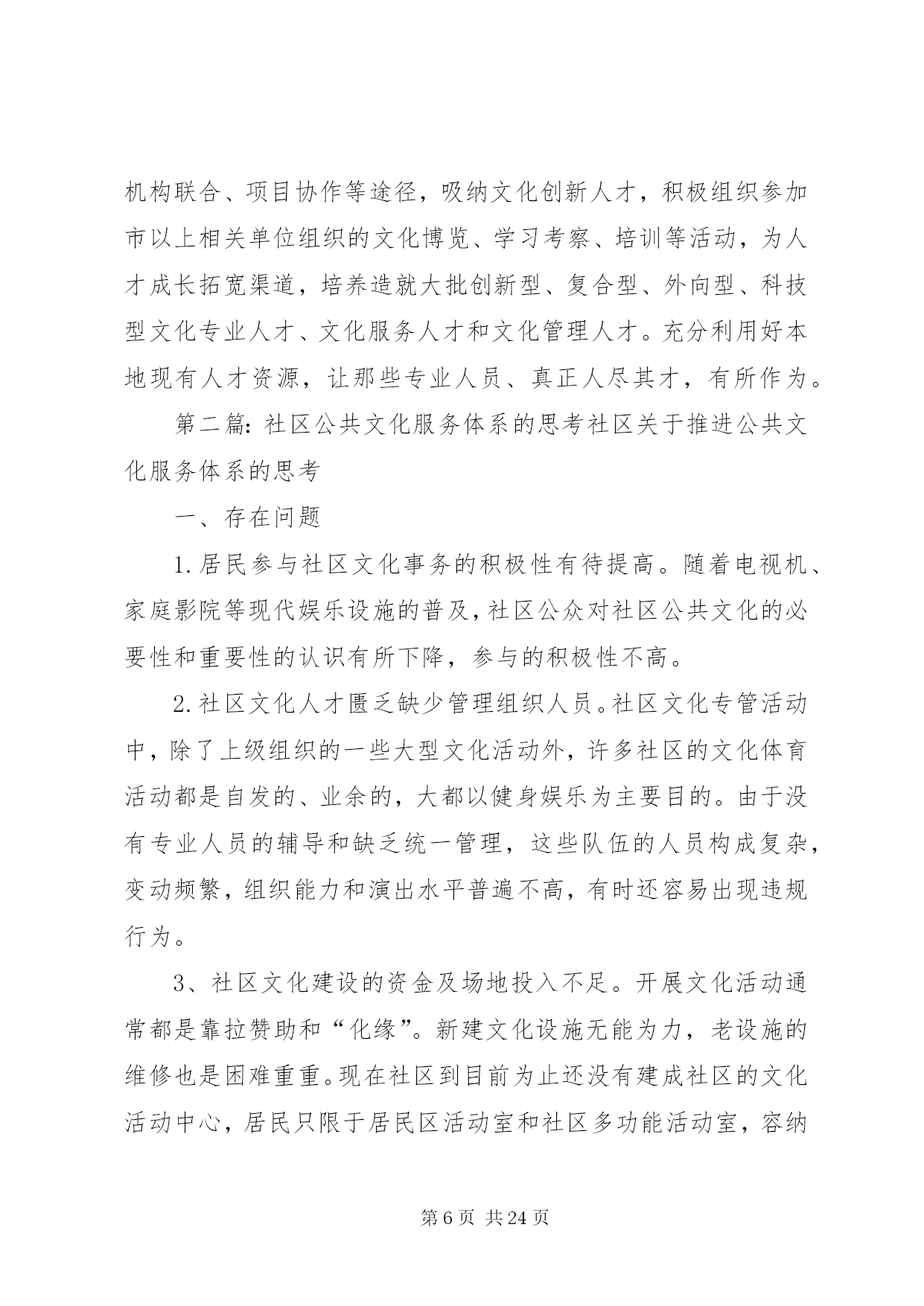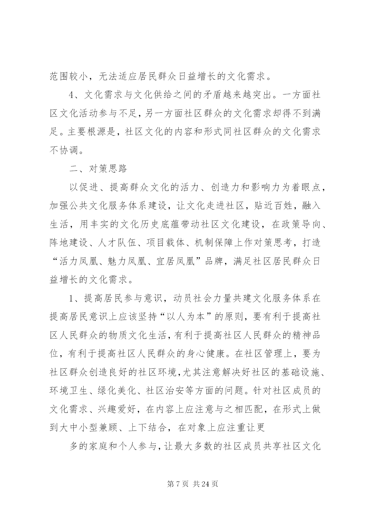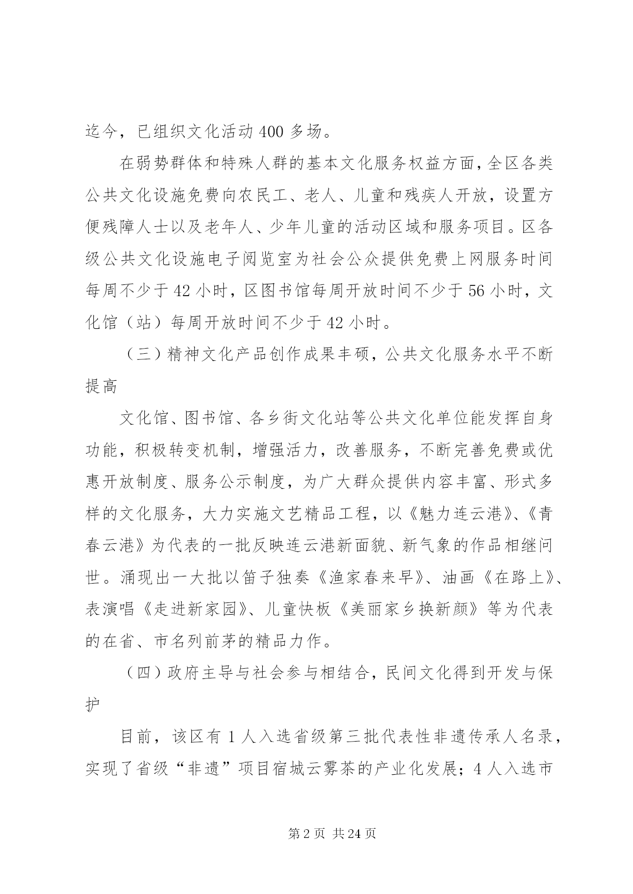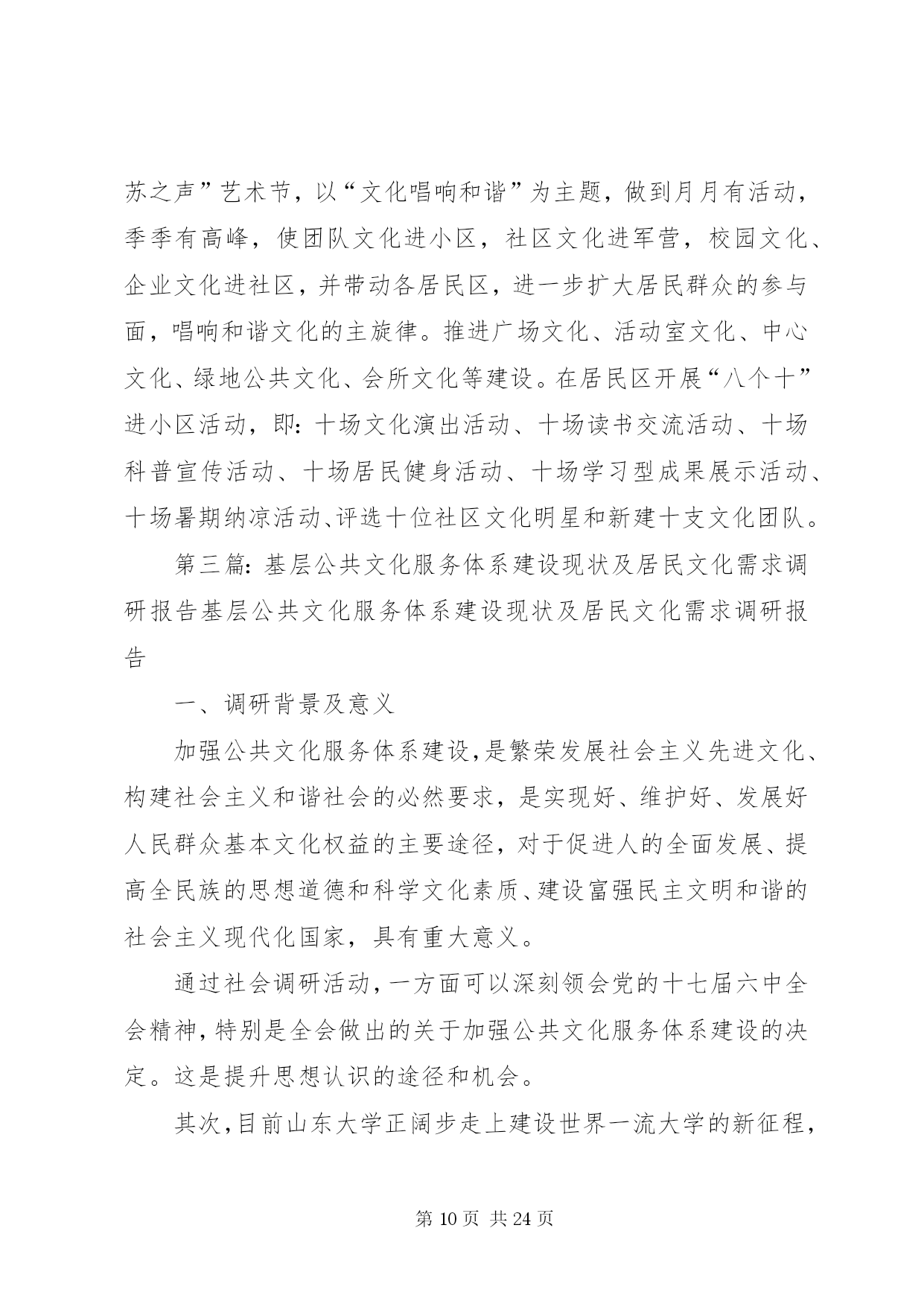 第PAGE\*Arabic\*MERGEFORMAT24页共NUMPAGES\*MERGEFORMAT24页公共文化服务体系的现状及思考关键词:XX县区;公共文化服务体系;现状及思考一、XX县区公共文化服务体系的现状(一)文化基础设施建设逐步改善,公共文化设施网络日益健全近几年来,全区新建、改扩建乡镇文化站、街道文化中心7个,社区文化活动中心24个,村级文化室19个,解决了乡镇、街道文化工作无房和面积不达标问题,形成了“区有两馆、乡有一站、村有一室”的三级文化设施体系,基本实现了阵地、网络和内容的三大覆盖。2010年以来,该区在多点分别建立8个全国文化共享工程基层服务点,在全市率先实现全覆盖。(二)公共文化服务的方式更加丰富,群众文化生活日趋多彩近年来,XX县区坚持以“五大文化”建设、“九大系列活动”的开展带动城乡统筹发展。利用城乡共建文化先进村、“三下乡”等活动载体,实施文化惠民工程。开展送书送戏送电影下乡活动,组织文艺工作者为群众演出,使政府对文体事业的投入直接转化为百姓受益。为积极推进“五大”文化建设,不断丰富城乡群众的精神文化生活,XX县区定期举办夏季海滨广场文化活动、社区艺术节、中老年艺术节、企业文化节、幼儿文化艺术节、全民读书节、全民健身等“九大”文化系列活动。2006年迄今,已组织文化活动400多场。在弱势群体和特殊人群的基本文化服务权益方面,全区各类公共文化设施免费向农民工、老人、儿童和残疾人开放,设置方便残障人士以及老年人、少年儿童的活动区域和服务项目。区各级公共文化设施电子阅览室为社会公众提供免费上网服务时间每周不少于42小时,区图书馆每周开放时间不少于56小时,文化馆(站)每周开放时间不少于42小时。(三)精神文化产品创作成果丰硕,公共文化服务水平不断提高文化馆、图书馆、各乡街文化站等公共文化单位能发挥自身功能,积极转变机制,增强活力,改善服务,不断完善免费或优惠开放制度、服务公示制度,为广大群众提供内容丰富、形式多样的文化服务,大力实施文艺精品工程,以《魅力连云港》、《青春云港》为代表的一批反映连云港新面貌、新气象的作品相继问世。涌现出一大批以笛子独奏《渔家春来早》、油画《在路上》、表演唱《走进新家园》、儿童快板《美丽家乡换新颜》等为代表的在省、市名列前茅的精品力作。(四)政府主导与社会参与相结合,民间文化得到开发与保护目前,该区有1人入选省级第三批代表性非遗传承人名录,实现了省级“非遗”项目宿城云雾茶的产业化发展;4人入选市级第二批代表性非遗传承人名录;加大对古建筑的保护力度,对连云古镇实施整体性保护工程,形成民国时期港口古镇风貌。打造板桥中学淮盐文化等集展示、表演、研究于一体的非物质文化遗产保护基地,积极探索保护物质遗产与保护非物质遗产相结合、静态保护与动态保护相结合的保护方法,以期实现两者之间的完美结合。二、公共文化服务体系建设存在的问题(一)产业规模偏小,对经济增长贡献率偏低。文化市场的“小、散、乱”的状况仍然存在,尚未形成合理的市场结构和资源优化配置,导致产业发展不平衡和资源浪费。特别是文化产业集群尚未形成,文化产品的生产还处于低水平状态,制约了文化资源优势向产业优势的转化。(二)资本结构单一,文化发展经费严重不足,严重制约文化市场的繁荣发展。加之XX县区文化产业大多为个体和民间资金,投资额小,缺乏有实力的大企业或外资进入该区经营文化产业,不能把文化资源变为产业资本。(三)人才相对匮乏,文化产业缺乏活力支撑。文化经营性人才相对缺乏,尤其是缺乏一批既懂经济、懂文化,又会经营的文化企业家和文化经济人,导致文化资源难以转化成文化产品,文化产品难以进入市场,无法创造出具有品牌效应的文化产品。(四)公共文化资源缺乏统筹,难以发挥整体效益。由于专业人员数量问题,直接导致全区公共文化设施建设重量轻质,社区、村一级的公共文化设施重建轻管,进而导致公共文化资源的闲置浪费,利用率偏低。(五)公共文化产品仍然缺乏,公共文化服务水平不高。群众喜闻乐见的文化产品类别较单一,多数为群文活动,农家书屋图书针对性不强,电影放映跟不上需求,文化信息资源共享利用率不高,数字化程度低。三、对于优化改善公共文化服务体系的相关对策及思考(一)实施文化体制改革工程,推动改革在重点领域和关键环节取得新进展。深化公益性文化事业单位改革,引入竞争和激励机制,创新服务方式,扩大服务范围,整合服务资源,提高服务质量。继续推进文化基础设施建设,健全公共文化服务网络、扩大覆盖范围,切实抓好已有阵地的管理和使用。(二)实施文化创新发展工程,增强文化的时代感和吸引力。站在时代的高起点上推动文化内容形式、体制机制、传播手段创新。充分挖掘文化内涵,整合全区各种旅游资源,科学制定全区文化发展规划,既依托优势又不拘泥优势,合理确定文化产