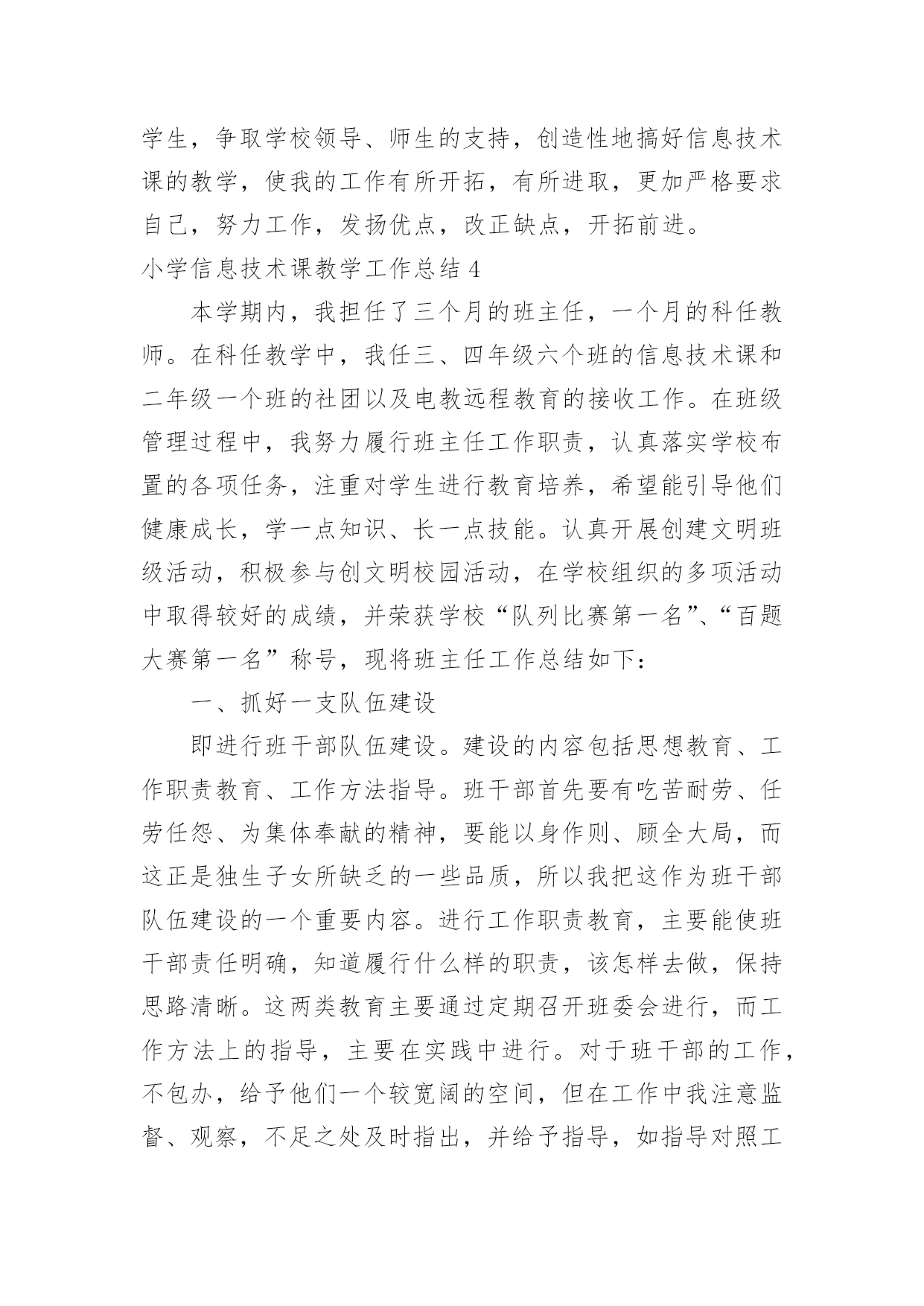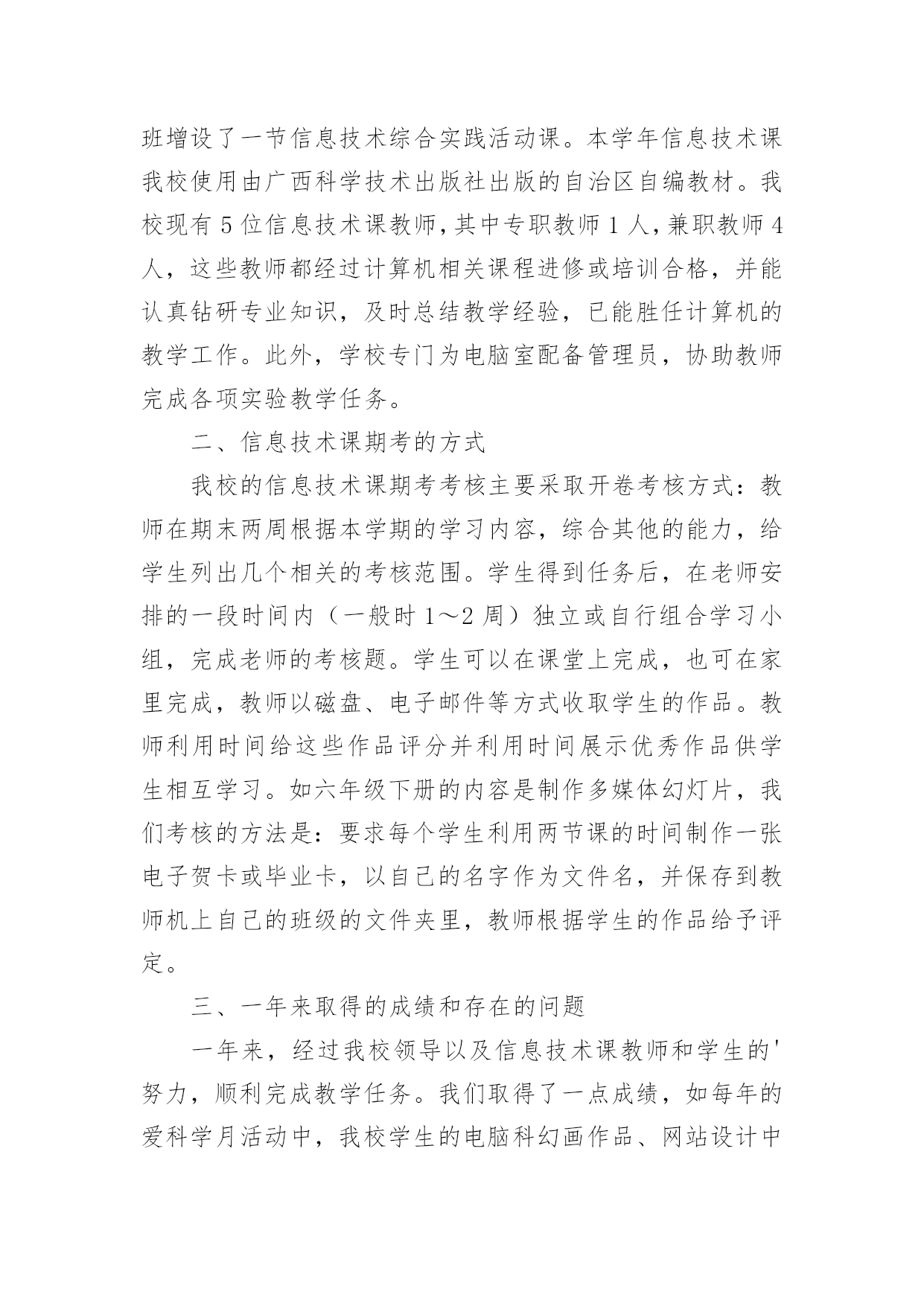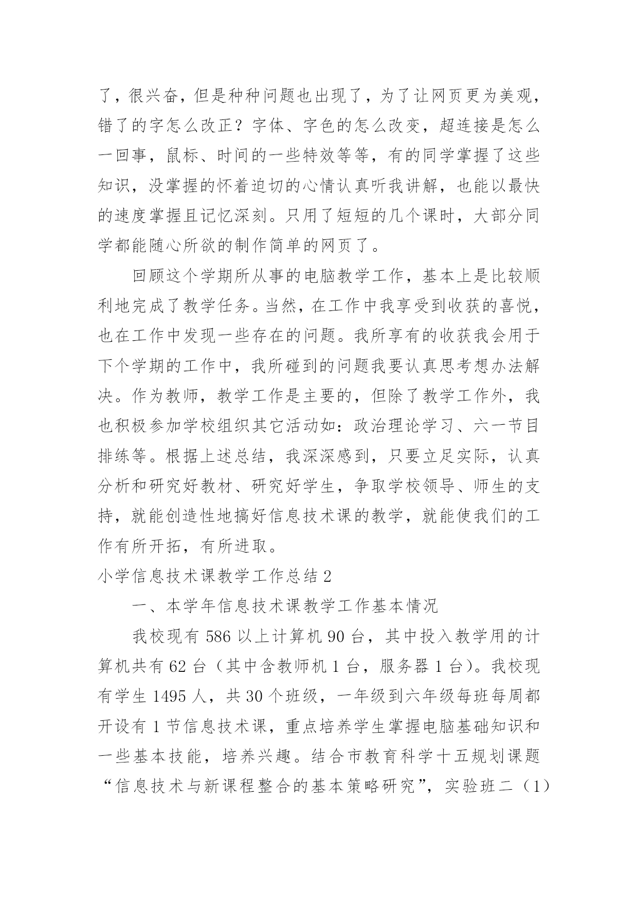 小学信息技术课教学工作总结小学信息技术课教学工作总结总结是对某一特定时间段内的学习和工作生活等表现情况加以回顾和分析的一种书面材料,它有助于我们寻找工作和事物发展的规律,从而掌握并运用这些规律,让我们一起认真地写一份总结吧。总结一般是怎么写的呢?下面是小编精心整理的小学信息技术课教学工作总结,欢迎大家分享。小学信息技术课教学工作总结1一、引入趣味课题,激发学习兴趣俗话说:兴趣是最好的老师。一个人只有对某个问题产生兴趣,才会启动思维,才会主动去寻找解决它的办法,才会主动获取相关的知识,将“要我学”变为“我要学”。并且,一个人只有在做事情时感到其乐无穷,精神才会高度集中,才能充分发挥自身的聪明才智,才能有所创造,有所发明,兴趣是激发学生学习积极性的动力,也是激发创造力的必要条件。因此,在计算机教学过程中,教师的重要任务之一就是激发学生的学习兴趣。这就要求教师从问题的引入和学习活动的设计上下功夫,引人入胜的开题,生动活泼的学习活动,是引发学生学习兴趣的关键因素。课题能否成功的引入,直接决定了一节课效果,每节课我都力求采用同学们最感兴趣事物来引导他们,如在教学四年级拼音输入法时,我问学生,你们想不想让电脑来帮助你们做题?学生兴奋的说当然想了!用电脑来输入一些基本的汉字可能大家都掌握,但你们知不知道电脑还可用来给汉字组词,当我给学生演示后兴奋得直拍手,都激动的说原来电脑还有这么多秘密,看着学生那一张张可爱的脸蛋,一双双求知的眼神,我心里也好激动。还有在教授六年级的网页制作时,我先把自己做的精美网页给学生展示,并出示了一个自己写的留言本,同学们在课堂上用留言本可以方便的匿名留言、交流,学生的页制作的兴趣一下子就激发起来了,都表示要开发自己的网站,做自己的留言本,用来跟同学们交流,有几个同学还想到了做一个聊天室。二、通过学习结果激发学习兴趣学生通过学习活动,在不断获得新知识的过程中,能够不断地看到自己的成果时,就会爆发出强烈的继续学习的愿望,学习兴趣也就越来越浓厚。如在教学五年级学生如何上网查找资料时,我先到语文老师那里了解了一下课文中需要的学习资料,如《圆明园的毁灭》这篇课文,我教学生在“百度”网里搜索关于“圆明园”的图片、课文的生字,词语和词语解释等,有些学生搜到了大量的图片及文字材料,加深了对圆明园的理解。这样学生既学习了语文,又学会了上网查资料,真是一举两得!学会了上网查资料的方法后,我让学生自已在网上查找资料,呵呵,爱玩是小学生的天性,他们居然在“百度”网里搜索到了“连连看”、“对对碰”等等一些“在线小游戏,”在网上玩起了游戏了!我真是服了这些小机灵。在教学过程中,采用边学边用的方法,学一点就让学生应用起来,不但可以满足学生的好奇心,而且在应用的过程中,可以充分肯定学生自身的能力,增强学生的自信心,使学生总感觉到有新的挑战,新的兴奋点,这样既保持和促进了学生的学习积极性,又可以进一步激发学生学习计算机的兴趣,形成一个良性循环。作为教师,还可以有意识的扩大、增强这一效果,当某个同学的作品比较完美时,借助多媒体网的优势,我通常会发到我的FTP空间上或是网站上,给全班同学展示一下,并提出表扬和鼓励。有一件作品“发表”了,感觉会怎么样?以我们自己的体会就可以知道。三、讲课内容打乱教材顺序,抽取精髓,激励同学们主动获取知识计算机基本知识并没有严格的难易程度界限,特别表现在应用软件上,比如word,FrontPage等,并不是必须掌握了所有的琐碎的基本知识如拼写检查、背景设计、模版设计等等才能作出作品,长篇大论的介绍界面、菜单、模版、版式等基本知识只会让学生觉得索然无味,讲授这样的课程时,我的经验是打乱教材顺序,首先抽取精髓来讲,紧紧吸引他们的兴趣。比如讲FrontPage时,我首先用FrontPage做了一个网页作自我介绍,网页中使用了图片、文本、声音、动画等,而且告诉每学生只要能上网的电脑就能看到这个网页,展示完成时,他们很好奇,我就带领着他们具体去实现它,简单介绍了文本、声音、图片的'插入,然后要求他们也做一个自我介绍的或是介绍自己班集体的网页,他们很快完成了,很兴奋,但是种种问题也出现了,为了让网页更为美观,错了的字怎么改正?字体、字色的怎么改变,超连接是怎么一回事,鼠标、时间的一些特效等等,有的同学掌握了这些知识,没掌握的怀着迫切的心情认真听我讲解,也能以最快的速度掌握且记忆深刻。只用了短短的几个课时,大部分同学都能随心所欲的制作简单的网页了。回顾这个学期所从事的电脑教学工作,基本上是比较顺利地完成了教学任务。当然,在工作中我享受到收获的喜悦,也在工作中发现一些存在的问题。我所享有的收获我会用于下个学期的工作中,我所碰到的问题我要认真思考想办法解决。作为教师,教学工作是主要的,但除了教学工作外,我也积极参加学校组织其它活动如:政