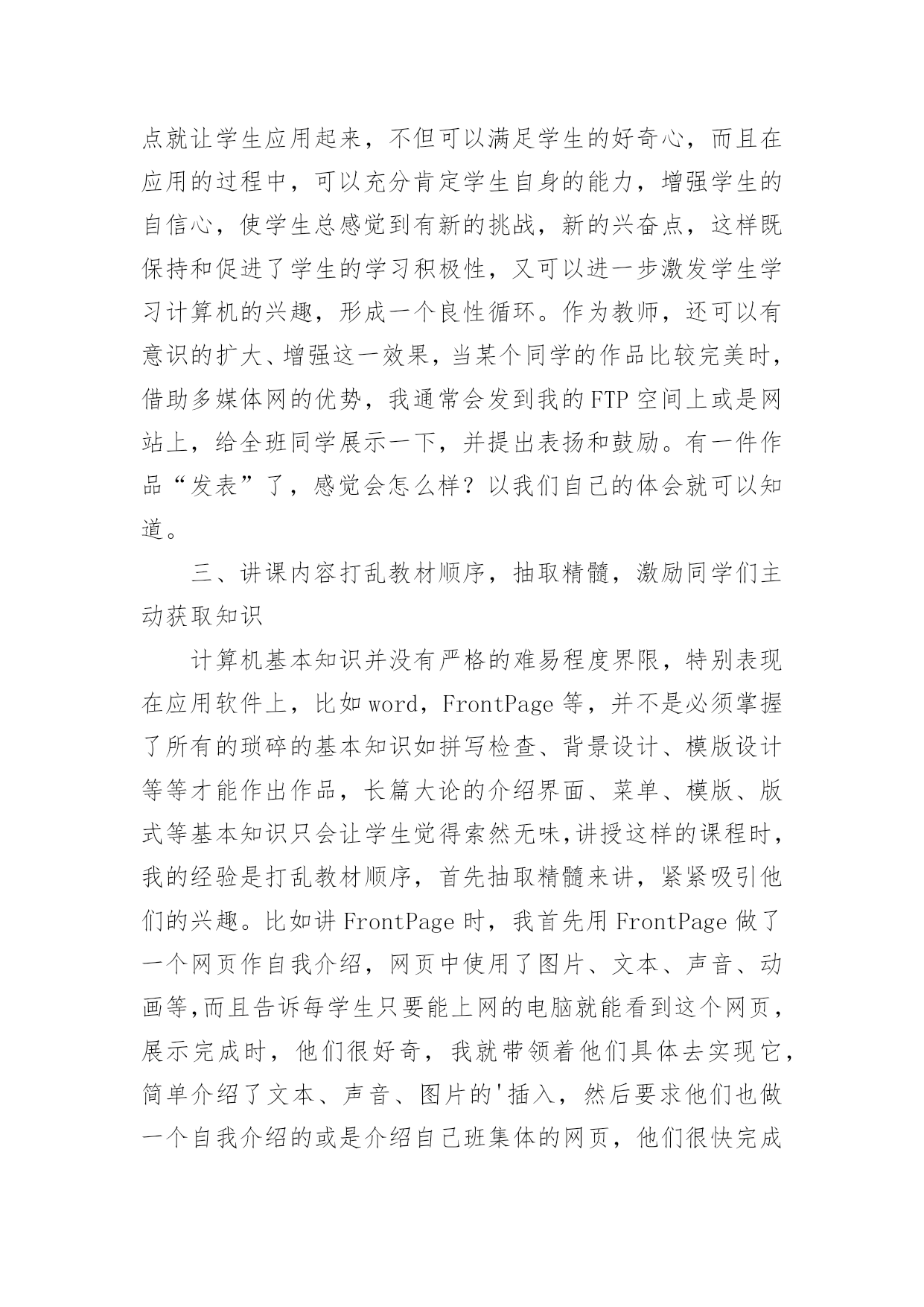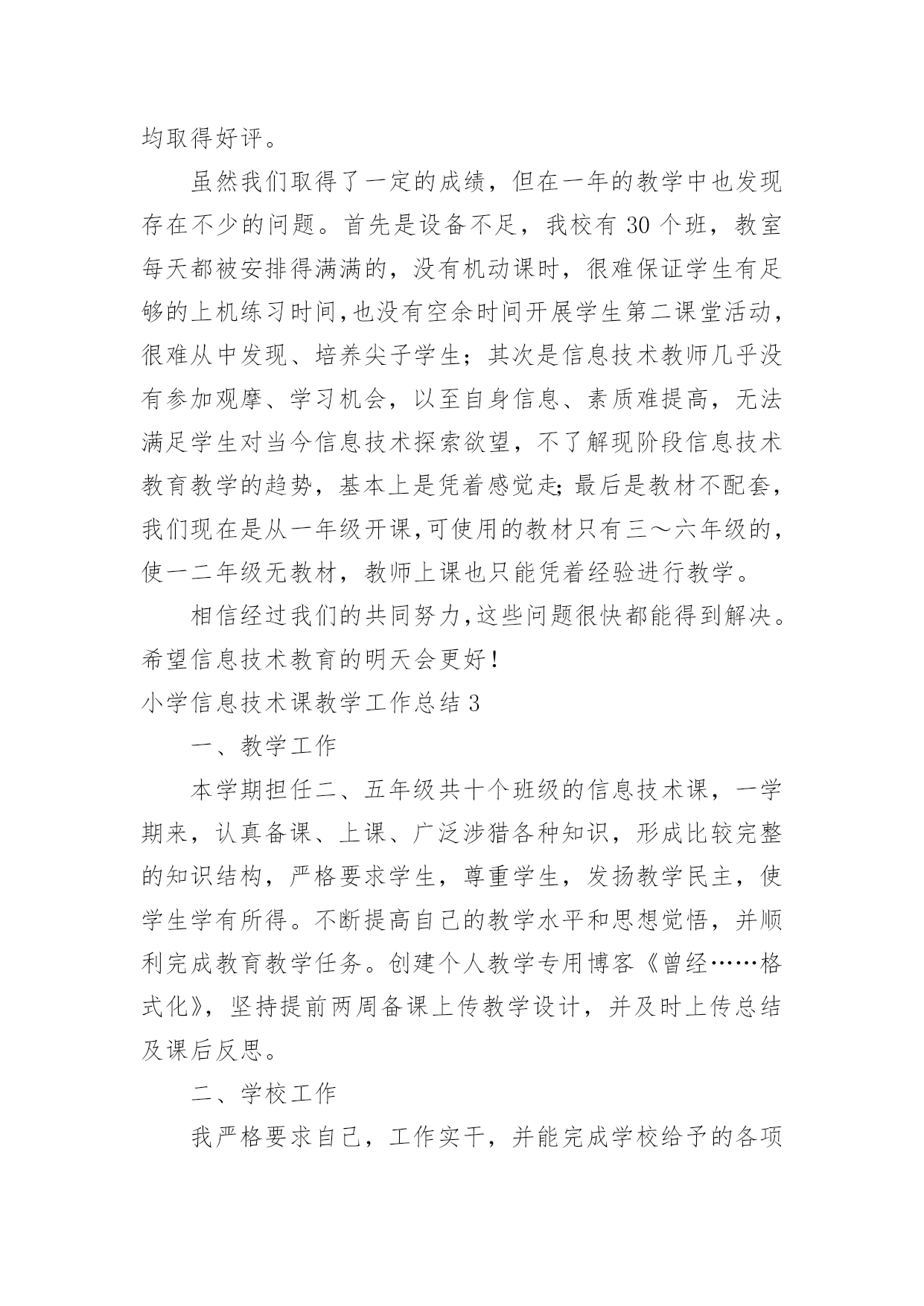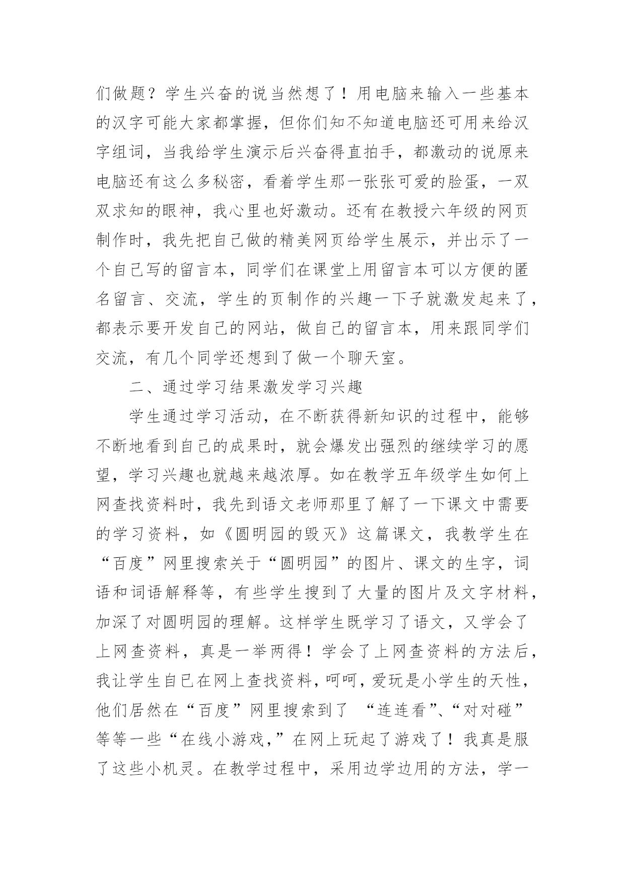 小学信息技术课教学工作总结小学信息技术课教学工作总结总结是对某一特定时间段内的学习和工作生活等表现情况加以回顾和分析的一种书面材料,它有助于我们寻找工作和事物发展的规律,从而掌握并运用这些规律,让我们一起认真地写一份总结吧。总结一般是怎么写的呢?下面是小编精心整理的小学信息技术课教学工作总结,欢迎大家分享。小学信息技术课教学工作总结1一、引入趣味课题,激发学习兴趣俗话说:兴趣是最好的老师。一个人只有对某个问题产生兴趣,才会启动思维,才会主动去寻找解决它的办法,才会主动获取相关的知识,将“要我学”变为“我要学”。并且,一个人只有在做事情时感到其乐无穷,精神才会高度集中,才能充分发挥自身的聪明才智,才能有所创造,有所发明,兴趣是激发学生学习积极性的动力,也是激发创造力的必要条件。因此,在计算机教学过程中,教师的重要任务之一就是激发学生的学习兴趣。这就要求教师从问题的引入和学习活动的设计上下功夫,引人入胜的开题,生动活泼的学习活动,是引发学生学习兴趣的关键因素。课题能否成功的引入,直接决定了一节课效果,每节课我都力求采用同学们最感兴趣事物来引导他们,如在教学四年级拼音输入法时,我问学生,你们想不想让电脑来帮助你们做题?学生兴奋的说当然想了!用电脑来输入一些基本的汉字可能大家都掌握,但你们知不知道电脑还可用来给汉字组词,当我给学生演示后兴奋得直拍手,都激动的说原来电脑还有这么多秘密,看着学生那一张张可爱的脸蛋,一双双求知的眼神,我心里也好激动。还有在教授六年级的网页制作时,我先把自己做的精美网页给学生展示,并出示了一个自己写的留言本,同学们在课堂上用留言本可以方便的匿名留言、交流,学生的页制作的兴趣一下子就激发起来了,都表示要开发自己的网站,做自己的留言本,用来跟同学们交流,有几个同学还想到了做一个聊天室。二、通过学习结果激发学习兴趣学生通过学习活动,在不断获得新知识的过程中,能够不断地看到自己的成果时,就会爆发出强烈的继续学习的愿望,学习兴趣也就越来越浓厚。如在教学五年级学生如何上网查找资料时,我先到语文老师那里了解了一下课文中需要的学习资料,如《圆明园的毁灭》这篇课文,我教学生在“百度”网里搜索关于“圆明园”的图片、课文的生字,词语和词语解释等,有些学生搜到了大量的图片及文字材料,加深了对圆明园的理解。这样学生既学习了语文,又学会了上网查资料,真是一举两得!学会了上网查资料的方法后,我让学生自已在网上查找资料,呵呵,爱玩是小学生的天性,他们居然在“百度”网里搜索到了“连连看”、“对对碰”等等一些“在线小游戏,”在网上玩起了游戏了!我真是服了这些小机灵。在教学过程中,采用边学边用的方法,学一点就让学生应用起来,不但可以满足学生的好奇心,而且在应用的过程中,可以充分肯定学生自身的能力,增强学生的自信心,使学生总感觉到有新的挑战,新的兴奋点,这样既保持和促进了学生的学习积极性,又可以进一步激发学生学习计算机的兴趣,形成一个良性循环。作为教师,还可以有意识的扩大、增强这一效果,当某个同学的作品比较完美时,借助多媒体网的优势,我通常会发到我的FTP空间上或是网站上,给全班同学展示一下,并提出表扬和鼓励。有一件作品“发表”了,感觉会怎么样?以我们自己的体会就可以知道。三、讲课内容打乱教材顺序,抽取精髓,激励同学们主动获取知识计算机基本知识并没有严格的难易程度界限,特别表现在应用软件上,比如word,FrontPage等,并不是必须掌握了所有的琐碎的基本知识如拼写检查、背景设计、模版设计等等才能作出作品,长篇大论的介绍界面、菜单、模版、版式等基本知识只会让学生觉得索然无味,讲授这样的课程时,我的经验是打乱教材顺序,首先抽取精髓来讲,紧紧吸引他们的兴趣。比如讲FrontPage时,我首先用FrontPage做了一个网页作自我介绍,网页中使用了图片、文本、声音、动画等,而且告诉每学生只要能上网的电脑就能看到这个网页,展示完成时,他们很好奇,我就带领着他们具体去实现它,简单介绍了文本、声音、图片的'插入,然后要求他们也做一个自我介绍的或是介绍自己班集体的网页,他们很快完成了,很兴奋,但是种种问题也出现了,为了让网页更为美观,错了的字怎么改正?字体、字色的怎么改变,超连接是怎么一回事,鼠标、时间的一些特效等等,有的同学掌握了这些知识,没掌握的怀着迫切的心情认真听我讲解,也能以最快的速度掌握且记忆深刻。只用了短短的几个课时,大部分同学都能随心所欲的制作简单的网页了。回顾这个学期所从事的电脑教学工作,基本上是比较顺利地完成了教学任务。当然,在工作中我享受到收获的喜悦,也在工作中发现一些存在的问题。我所享有的收获我会用于下个学期的工作中,我所碰到的问题我要认真思考想办法解决。作为教师,教学工作是主要的,但除了教学工作外,我也积极参加学校组织其它活动如:政