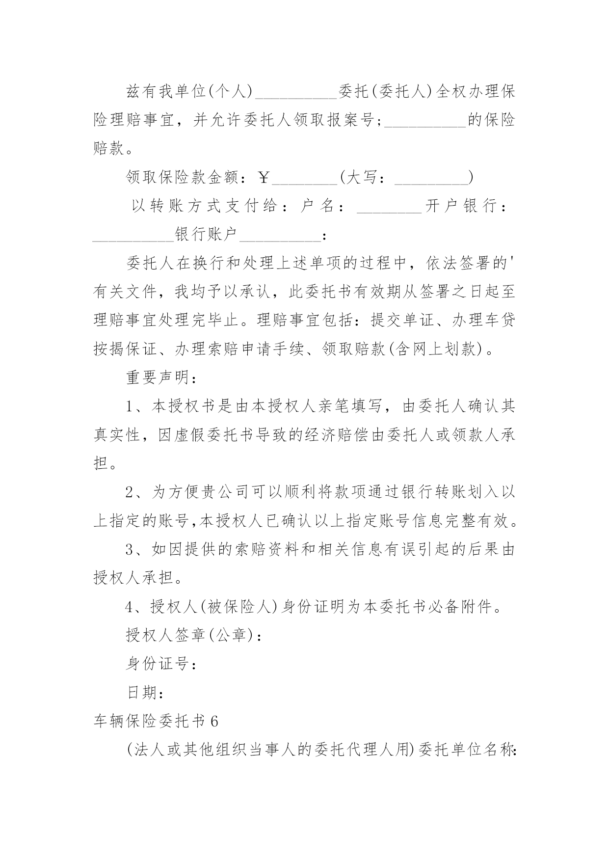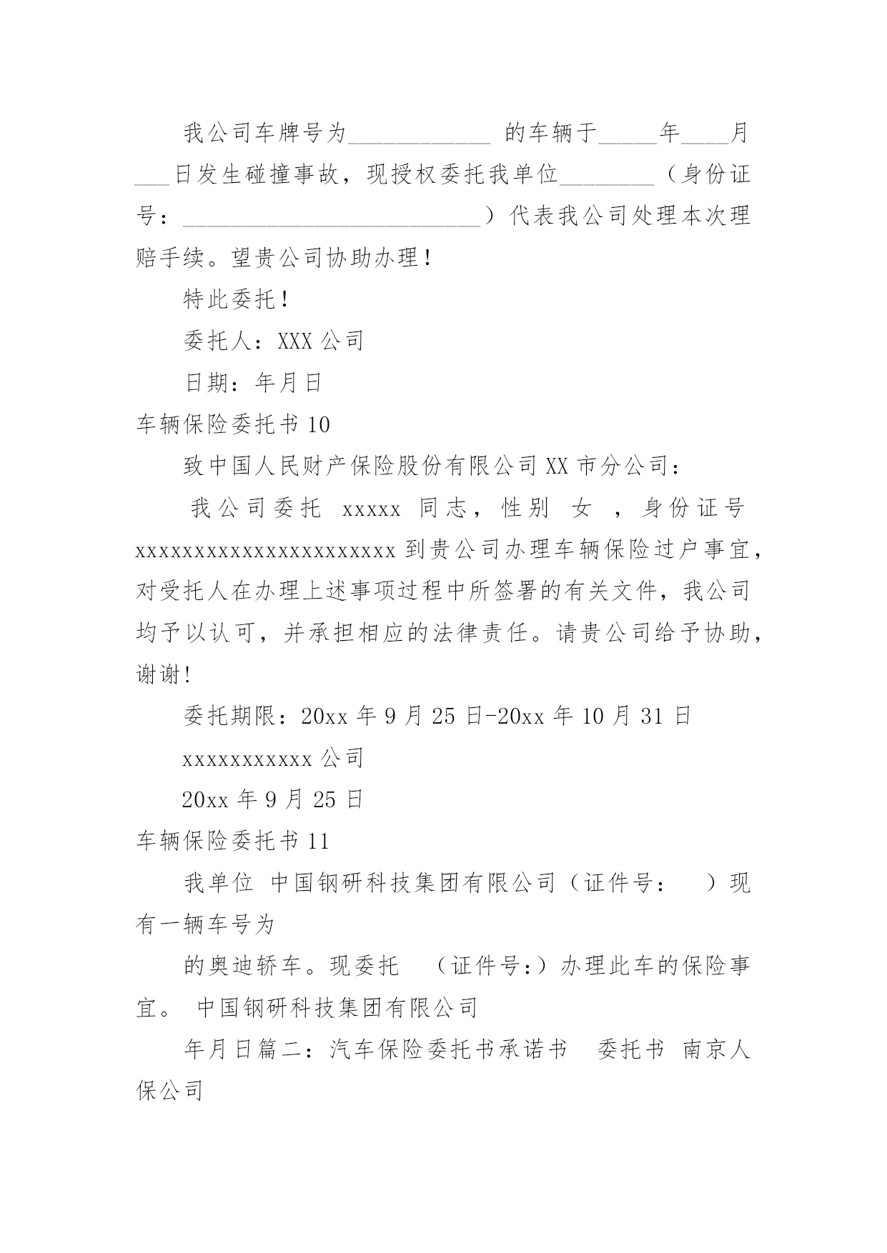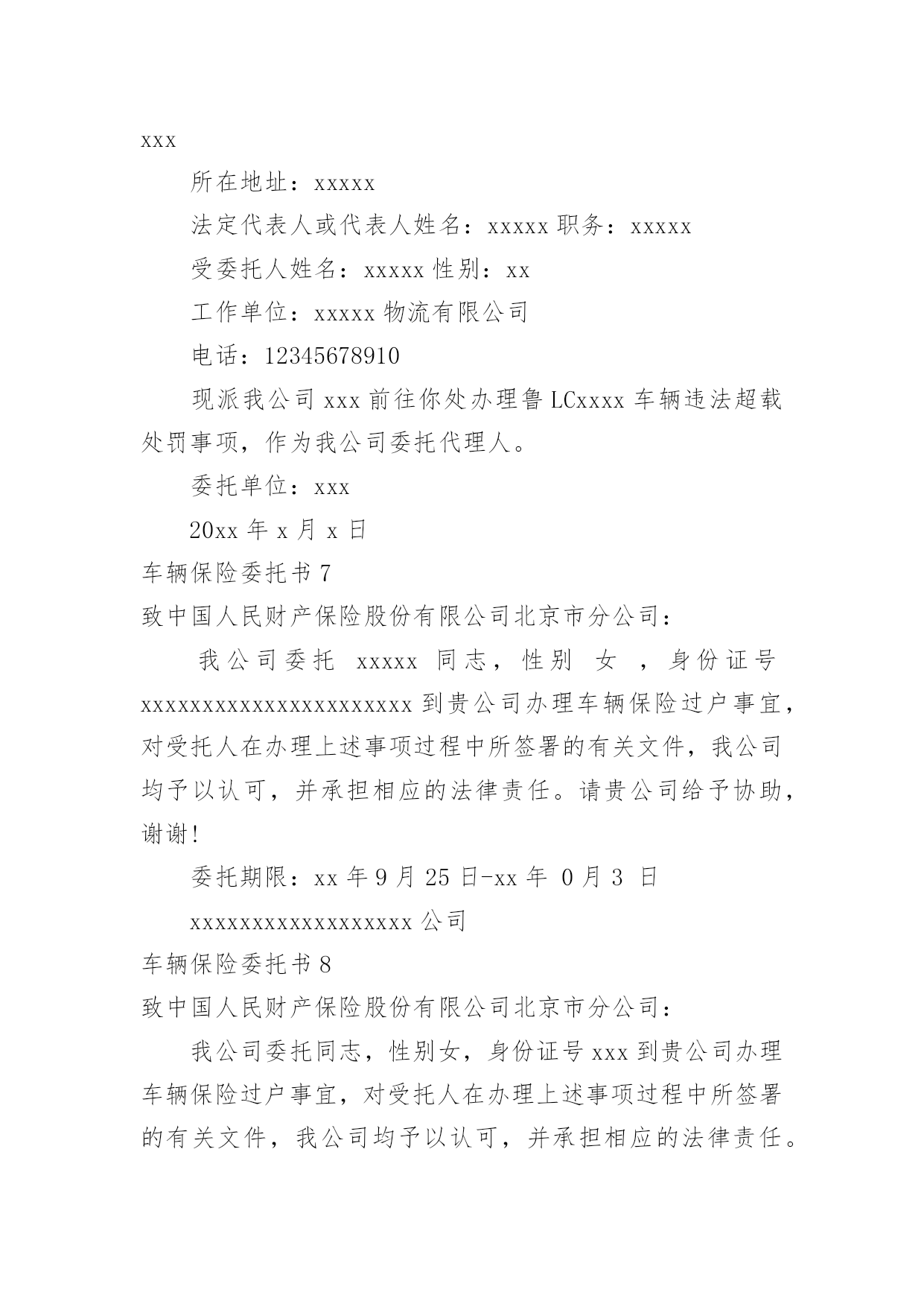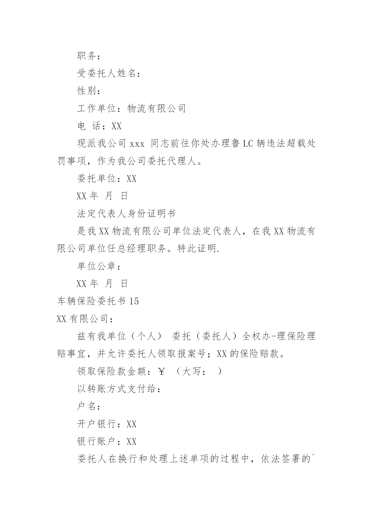 车辆保险委托书车辆保险委托书被委托人在行使委托书上的合法权益内,被委托人不承担任何法律责任。在社会发展不断提速的今天,委托书在处理事务上的使用频率越来越高,相信写委托书是一个让许多人都头痛的问题,下面是小编帮大家整理的车辆保险委托书,希望对大家有所帮助。车辆保险委托书1致中国人民财产保险股份有限公司北京市分公司:我公司委托xxxxx同事,性别女,身份证号xxxxxxxxxxxxxxxxxxxxxx到贵公司办理车辆保险过户事宜,对受托人在办理上述事项过程中所签署的有关文件,我公司均予以认可,并承担相应的法律责任。请贵公司给予协助,谢谢!委托期限:20xx年9月25日-20xx年10月31日xxxxxxxxxxxxxxxxxx公司车辆保险委托书2(法人或其他组织当事人的委托代理人用)委托单位名称:XX所在地址:XX法定代表人或代表人姓名:职务:受委托人姓名性别:工作单位:XX物流有限公司电话:XX现派我公司XX前往你处办理车辆违法超载处罚事项,作为我公司委托代理人。委托单位:XX年月日车辆保险委托书3xxxxxxx有限公司:兹有我单位(个人)__________委托(委托人)全权办理保险理赔事宜,并允许委托人领取报案号;__________的保险赔款。领取保险款金额:¥________(大写:_________)以转账方式支付给:户名:________开户银行:__________银行账户__________:委托人在换行和处理上述单项的过程中,依法签署的有关文件,我均予以承认,此委托书有效期从签署之日起至理赔事宜处理完毕止。理赔事宜包括:提交单证、办理车贷按揭保证、办理索赔申请手续、领取赔款(含网上划款)。重要声明:1、本授权书是由本授权人亲笔填写,由委托人确认其真实性,因虚假委托书导致的经济赔偿由委托人或领款人承担。2、为方便贵公司可以顺利将款项通过银行转账划入以上指定的`账号,本授权人已确认以上指定账号信息完整有效。3、如因提供的索赔资料和相关信息有误引起的后果由授权人承担。4、授权人(被保险人)身份证明为本委托书必备附件。授权人签章(公章):xxx身份证号:xxx日期:xxx车辆保险委托书4委托单位名称:xxx所在地址:xxxxx法定代表人或代表人姓名:xxxxx职务:xxxxx受委托人姓名:xxxxx性别:xx工作单位:xxxxx物流有限公司电话:现派我公司xxx前往你处办理鲁LCxxxx车辆违法超载处罚事项,作为我公司委托代理人。委托单位:xxx20xx年x月x日车辆保险委托书5有限公司:兹有我单位(个人)__________委托(委托人)全权办理保险理赔事宜,并允许委托人领取报案号;__________的保险赔款。领取保险款金额:¥________(大写:_________)以转账方式支付给:户名:________开户银行:__________银行账户__________:委托人在换行和处理上述单项的过程中,依法签署的'有关文件,我均予以承认,此委托书有效期从签署之日起至理赔事宜处理完毕止。理赔事宜包括:提交单证、办理车贷按揭保证、办理索赔申请手续、领取赔款(含网上划款)。重要声明:1、本授权书是由本授权人亲笔填写,由委托人确认其真实性,因虚假委托书导致的经济赔偿由委托人或领款人承担。2、为方便贵公司可以顺利将款项通过银行转账划入以上指定的账号,本授权人已确认以上指定账号信息完整有效。3、如因提供的索赔资料和相关信息有误引起的后果由授权人承担。4、授权人(被保险人)身份证明为本委托书必备附件。授权人签章(公章):身份证号:日期:车辆保险委托书6(法人或其他组织当事人的委托代理人用)委托单位名称:xxx所在地址:xxxxx法定代表人或代表人姓名:xxxxx职务:xxxxx受委托人姓名:xxxxx性别:xx工作单位:xxxxx物流有限公司电话:12345678910现派我公司xxx前往你处办理鲁LCxxxx车辆违法超载处罚事项,作为我公司委托代理人。委托单位:xxx20xx年x月x日车辆保险委托书7致中国人民财产保险股份有限公司北京市分公司:我公司委托xxxxx同志,性别女,身份证号xxxxxxxxxxxxxxxxxxxxxx到贵公司办理车辆保险过户事宜,对受托人在办理上述事项过程中所签署的有关文件,我公司均予以认可,并承担相应的法律责任。请贵公司给予协助,谢谢!委托期限:xx年9月25日-xx年0月3日xxxxxxxxxxxxxxxxxx公司车辆保险委托书8致中国人民财产保险股份有限公司北京市分公司:我公司委托同志,性别女,身份证号xxx到贵公司办理车辆保险过户事宜,对受托人在办理上述事项过程中所签署的有关文件,我公司均予以认可,并承担相应的法律责任。请贵公司给予协助,谢谢!委托期限:20xx年9月25日—20xx