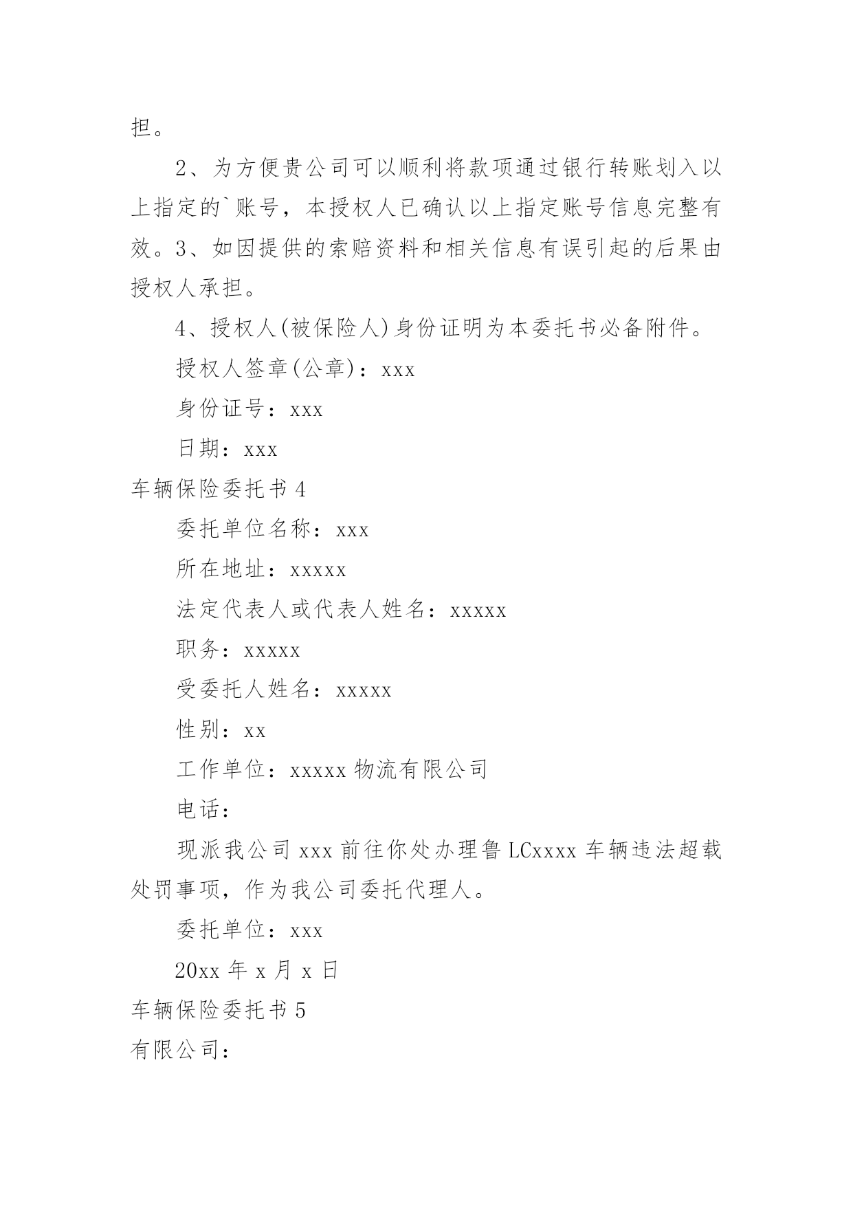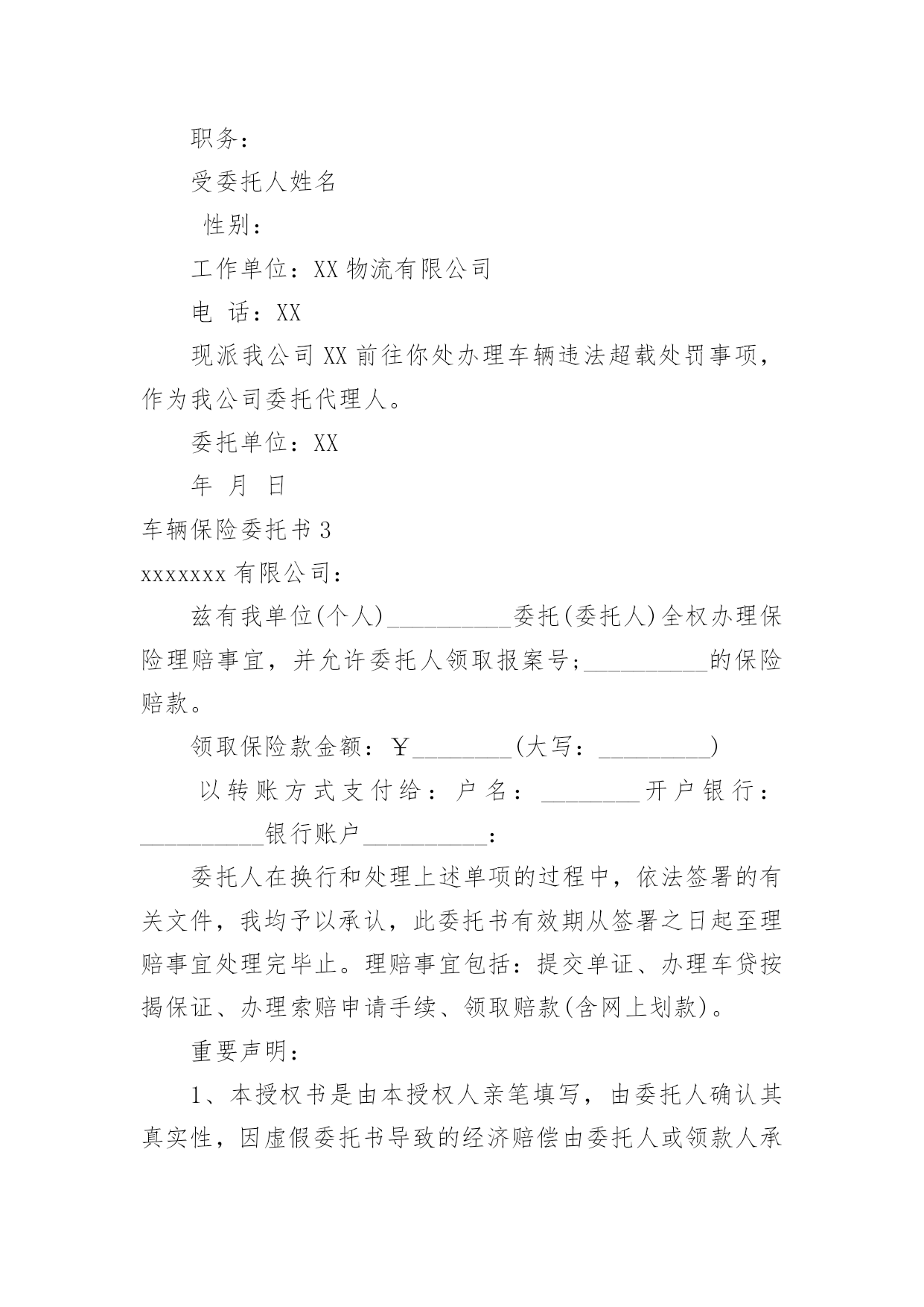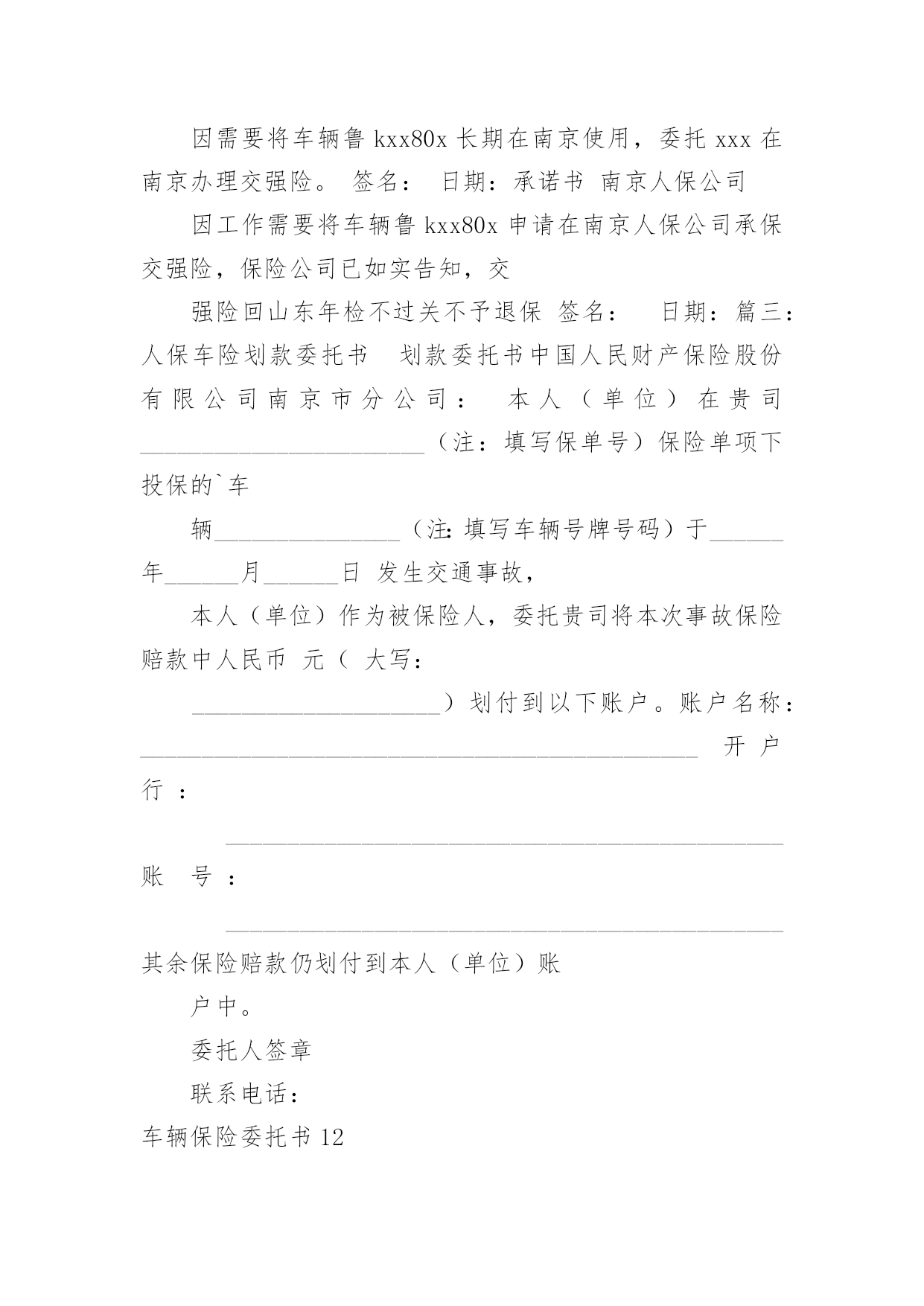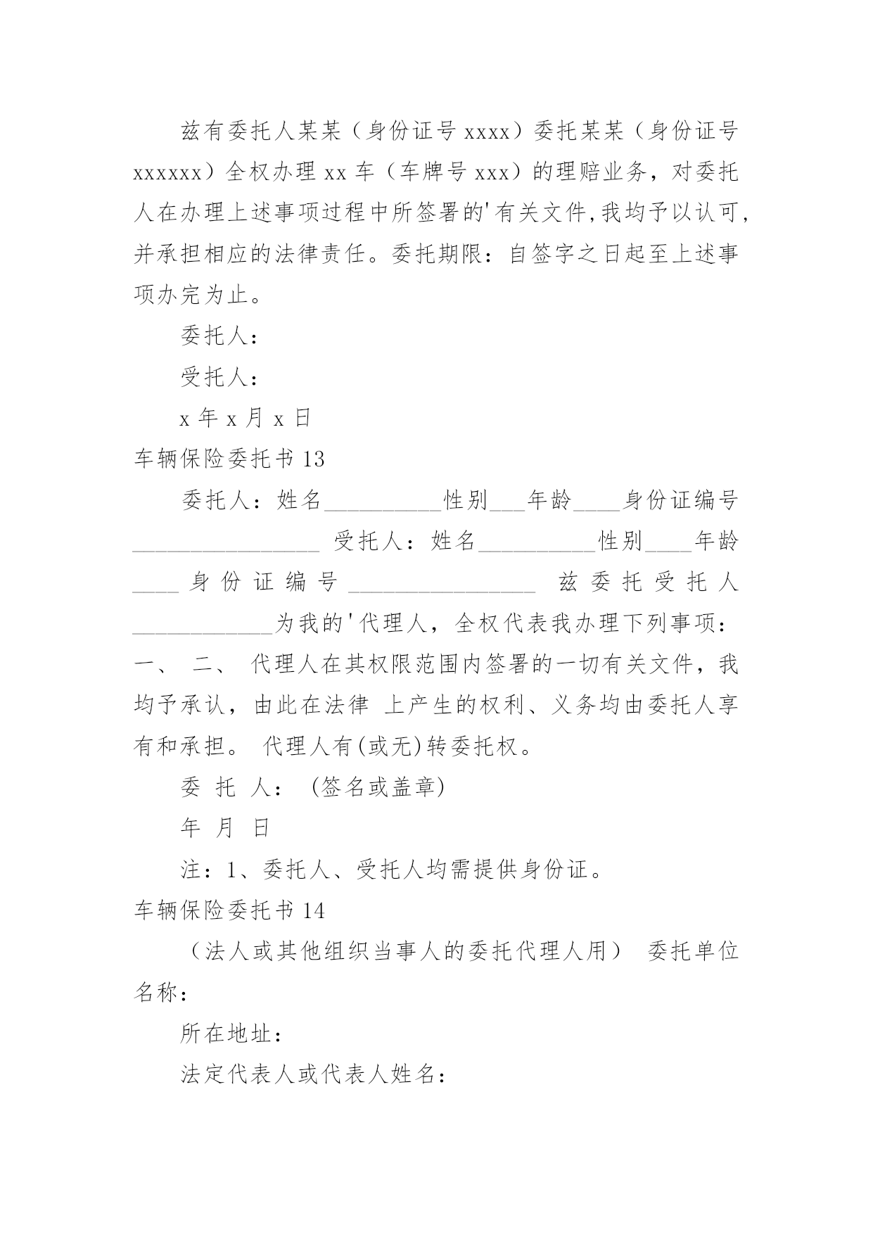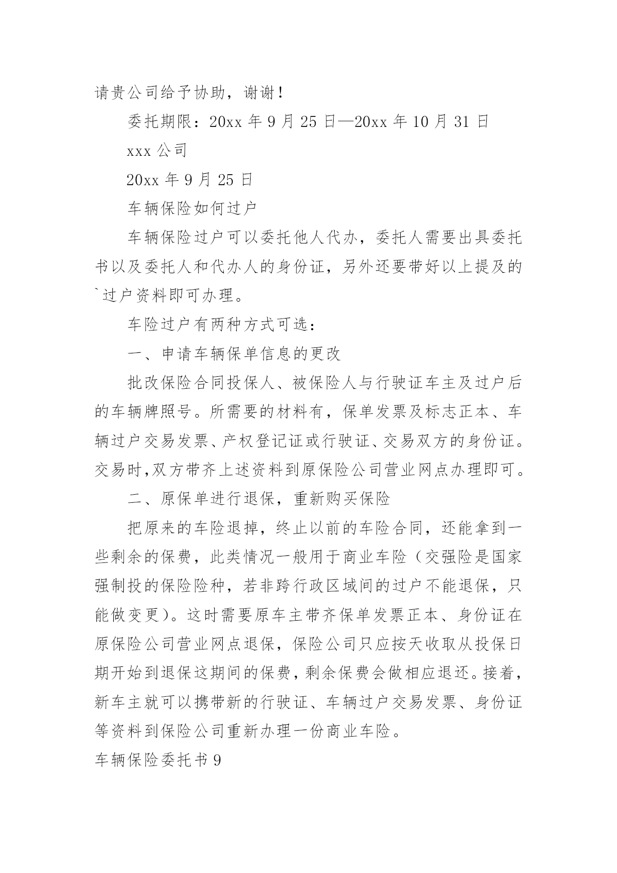 车辆保险委托书车辆保险委托书被委托人在行使委托书上的合法权益内,被委托人不承担任何法律责任。在社会发展不断提速的今天,委托书在处理事务上的使用频率越来越高,相信写委托书是一个让许多人都头痛的问题,下面是小编帮大家整理的车辆保险委托书,希望对大家有所帮助。车辆保险委托书1致中国人民财产保险股份有限公司北京市分公司:我公司委托xxxxx同事,性别女,身份证号xxxxxxxxxxxxxxxxxxxxxx到贵公司办理车辆保险过户事宜,对受托人在办理上述事项过程中所签署的有关文件,我公司均予以认可,并承担相应的法律责任。请贵公司给予协助,谢谢!委托期限:20xx年9月25日-20xx年10月31日xxxxxxxxxxxxxxxxxx公司车辆保险委托书2(法人或其他组织当事人的委托代理人用)委托单位名称:XX所在地址:XX法定代表人或代表人姓名:职务:受委托人姓名性别:工作单位:XX物流有限公司电话:XX现派我公司XX前往你处办理车辆违法超载处罚事项,作为我公司委托代理人。委托单位:XX年月日车辆保险委托书3xxxxxxx有限公司:兹有我单位(个人)__________委托(委托人)全权办理保险理赔事宜,并允许委托人领取报案号;__________的保险赔款。领取保险款金额:¥________(大写:_________)以转账方式支付给:户名:________开户银行:__________银行账户__________:委托人在换行和处理上述单项的过程中,依法签署的有关文件,我均予以承认,此委托书有效期从签署之日起至理赔事宜处理完毕止。理赔事宜包括:提交单证、办理车贷按揭保证、办理索赔申请手续、领取赔款(含网上划款)。重要声明:1、本授权书是由本授权人亲笔填写,由委托人确认其真实性,因虚假委托书导致的经济赔偿由委托人或领款人承担。2、为方便贵公司可以顺利将款项通过银行转账划入以上指定的`账号,本授权人已确认以上指定账号信息完整有效。3、如因提供的索赔资料和相关信息有误引起的后果由授权人承担。4、授权人(被保险人)身份证明为本委托书必备附件。授权人签章(公章):xxx身份证号:xxx日期:xxx车辆保险委托书4委托单位名称:xxx所在地址:xxxxx法定代表人或代表人姓名:xxxxx职务:xxxxx受委托人姓名:xxxxx性别:xx工作单位:xxxxx物流有限公司电话:现派我公司xxx前往你处办理鲁LCxxxx车辆违法超载处罚事项,作为我公司委托代理人。委托单位:xxx20xx年x月x日车辆保险委托书5有限公司:兹有我单位(个人)__________委托(委托人)全权办理保险理赔事宜,并允许委托人领取报案号;__________的保险赔款。领取保险款金额:¥________(大写:_________)以转账方式支付给:户名:________开户银行:__________银行账户__________:委托人在换行和处理上述单项的过程中,依法签署的'有关文件,我均予以承认,此委托书有效期从签署之日起至理赔事宜处理完毕止。理赔事宜包括:提交单证、办理车贷按揭保证、办理索赔申请手续、领取赔款(含网上划款)。重要声明:1、本授权书是由本授权人亲笔填写,由委托人确认其真实性,因虚假委托书导致的经济赔偿由委托人或领款人承担。2、为方便贵公司可以顺利将款项通过银行转账划入以上指定的账号,本授权人已确认以上指定账号信息完整有效。3、如因提供的索赔资料和相关信息有误引起的后果由授权人承担。4、授权人(被保险人)身份证明为本委托书必备附件。授权人签章(公章):身份证号:日期:车辆保险委托书6(法人或其他组织当事人的委托代理人用)委托单位名称:xxx所在地址:xxxxx法定代表人或代表人姓名:xxxxx职务:xxxxx受委托人姓名:xxxxx性别:xx工作单位:xxxxx物流有限公司电话:12345678910现派我公司xxx前往你处办理鲁LCxxxx车辆违法超载处罚事项,作为我公司委托代理人。委托单位:xxx20xx年x月x日车辆保险委托书7致中国人民财产保险股份有限公司北京市分公司:我公司委托xxxxx同志,性别女,身份证号xxxxxxxxxxxxxxxxxxxxxx到贵公司办理车辆保险过户事宜,对受托人在办理上述事项过程中所签署的有关文件,我公司均予以认可,并承担相应的法律责任。请贵公司给予协助,谢谢!委托期限:xx年9月25日-xx年0月3日xxxxxxxxxxxxxxxxxx公司车辆保险委托书8致中国人民财产保险股份有限公司北京市分公司:我公司委托同志,性别女,身份证号xxx到贵公司办理车辆保险过户事宜,对受托人在办理上述事项过程中所签署的有关文件,我公司均予以认可,并承担相应的法律责任。请贵公司给予协助,谢谢!委托期限:20xx年9月25日—20xx