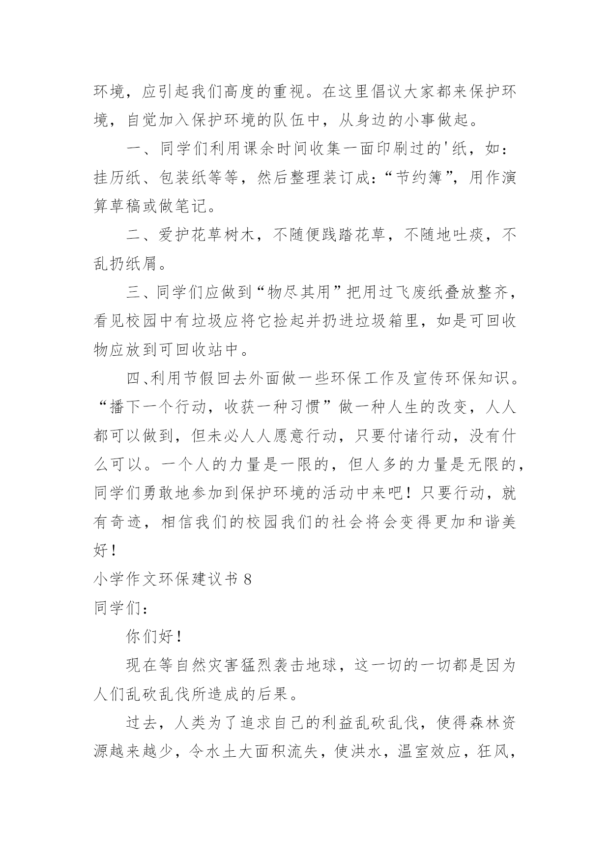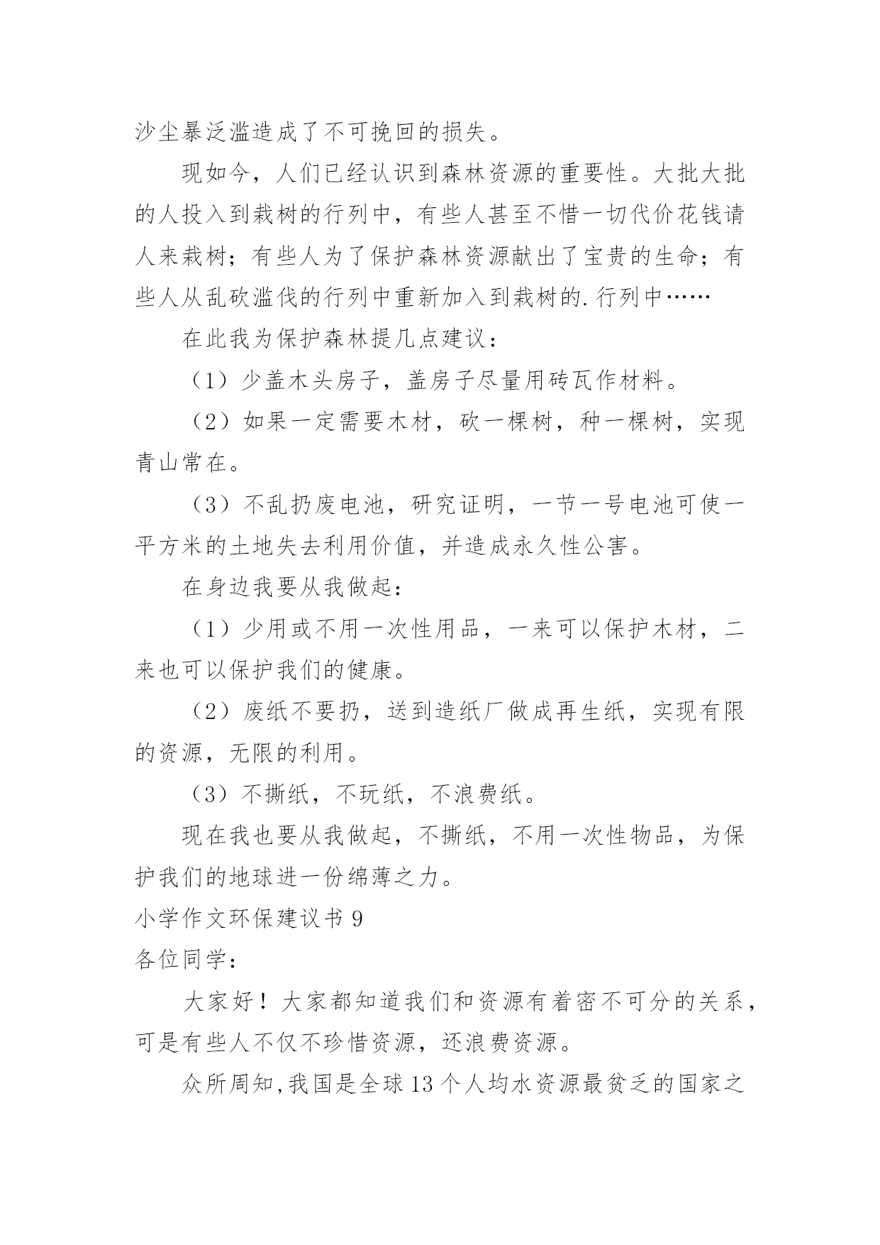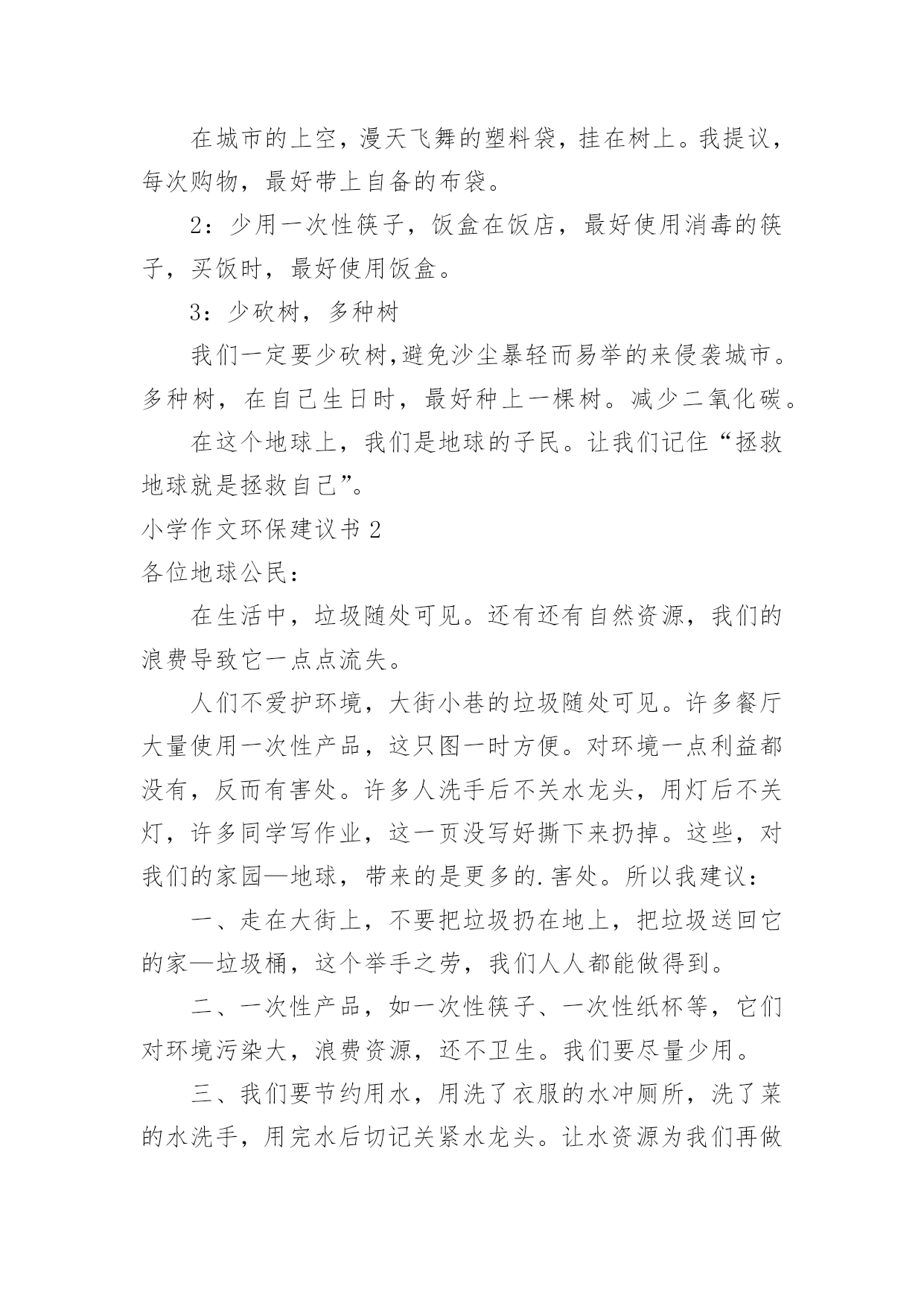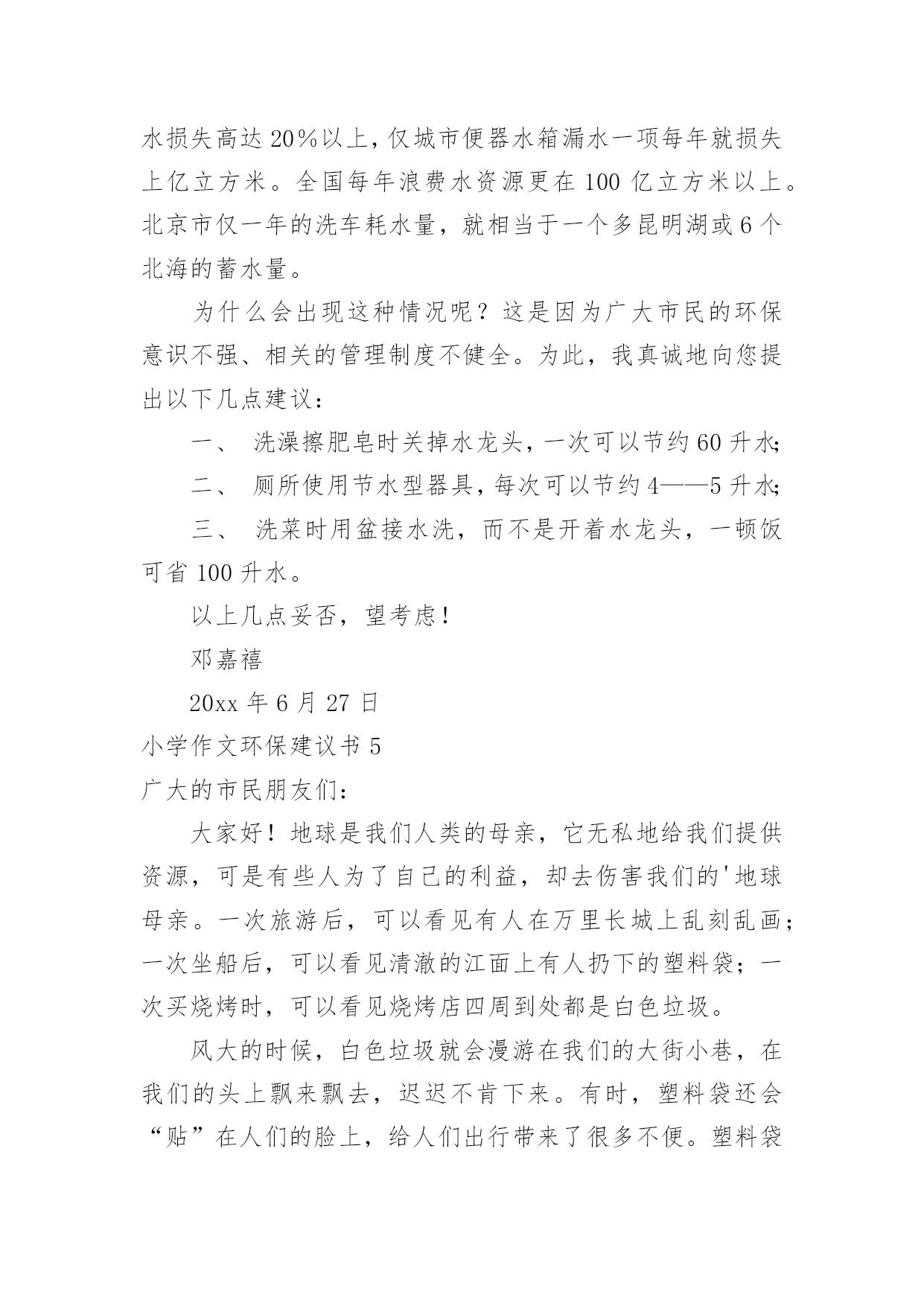 小学作文环保建议书小学作文环保建议书在现实社会中,能够利用到建议书的场合越来越多,我们在写建议书时要分条列出建议的具体内容。相信写建议书是一个让许多人都头痛的问题,下面是小编为大家收集的小学作文环保建议书,希望能够帮助到大家。小学作文环保建议书1各位市民,大家好!我是兴安一小的一名小学生。如今十分发达的地球,有着非常大的隐患。这一切都是我们人类造成的。贪婪的人类没有节制的'开采资源。人类所需要的“大气资源,水资源,森林资源”本来是可以不断生长的,但是人类随意破坏资源,滥用化学品,使我们的地球伤痕累累。人类随意破坏环境。比如我国的木兰溪,在50年代时,河水清澈见底,但现在的木兰溪,已是浑浊不清,鱼虾死亡。这一个个鲜活的例子,不都是人们不环保的后果吗?现在的天空,散布着汽车尾气,弥漫在我们生活的上空,早已在我们的身体里停留了。患上各种疾病。给我们的身体带来危害。面对这个充满污染的空气,我想对广大市民提出倡议:1:少用一次性塑料袋。在城市的上空,漫天飞舞的塑料袋,挂在树上。我提议,每次购物,最好带上自备的布袋。2:少用一次性筷子,饭盒在饭店,最好使用消毒的筷子,买饭时,最好使用饭盒。3:少砍树,多种树我们一定要少砍树,避免沙尘暴轻而易举的来侵袭城市。多种树,在自己生日时,最好种上一棵树。减少二氧化碳。在这个地球上,我们是地球的子民。让我们记住“拯救地球就是拯救自己”。小学作文环保建议书2各位地球公民:在生活中,垃圾随处可见。还有还有自然资源,我们的浪费导致它一点点流失。人们不爱护环境,大街小巷的垃圾随处可见。许多餐厅大量使用一次性产品,这只图一时方便。对环境一点利益都没有,反而有害处。许多人洗手后不关水龙头,用灯后不关灯,许多同学写作业,这一页没写好撕下来扔掉。这些,对我们的家园—地球,带来的是更多的.害处。所以我建议:一、走在大街上,不要把垃圾扔在地上,把垃圾送回它的家—垃圾桶,这个举手之劳,我们人人都能做得到。二、一次性产品,如一次性筷子、一次性纸杯等,它们对环境污染大,浪费资源,还不卫生。我们要尽量少用。三、我们要节约用水,用洗了衣服的水冲厕所,洗了菜的水洗手,用完水后切记关紧水龙头。让水资源为我们再做贡献。四、节约用电,家里的电器,如电脑、洗衣机等,不用拔掉插头,家里没人了,也要记住关灯。五、节约纸张,在写字前。要想好再写,这样可以减少写错,浪费纸张。尽量少用纸,无论是手纸还是餐巾纸,能用手帕代替的用手帕代替。作为地球人,我们应该节约资源,不随处乱扔垃圾。保护起我们的家园!小学作文环保建议书3四三班的同学们:你们好!大家都知道,地球是我们赖以生存的家园,地球是我们人类的母亲,是我们生命的摇篮。曾经的地球母亲是那样美丽,可是我们人类为了自己的利益,乱挖乱采矿产资源,随意排放废水、废气,随便乱扔生活垃圾……由于我们人类大量地破坏环境,如今已经把我们美丽的地球母亲折磨得不像样了。地球母亲在痛苦地呻吟。为了让我们的地球母亲不再受到伤害,让我们的地球母亲恢复她往日的风采,我们有责任,有义务来保护地球母亲。我们要从自我做起,从身边小事做起,来保护地球母亲,保护我们的'家园。我倡议:1、尽量不用一次性物品,去超市购物自备环保型购物袋,减少白色污染。2、节约每一滴水,每一度电,做到随手关紧水龙头,离人关闭电源。3、爱护花草树木,不乱践踏草坪。积极参加植树活动,多种些花草树木,这样既绿化环境,又净化空气。4、生活垃圾要分类放置,不乱丢弃废电池,从而减少垃圾污染。5、注意个人卫生,不随地吐痰,不在公共场所制造噪音。6、在公共场所树立一些提示标语,温馨提醒大家保护环境,爱护我们的地球。如果我们能够做到,我相信,那清清的小河、绿绿的森林,蓝蓝的天空终将重回我们人类的怀抱,我们就可以在这清新的家园里快乐的成长!小学作文环保建议书4尊敬的环保局局长:您好!我是东华小学六年级的学生,今天,我想和您探讨一下解决浪费水资源问题。我国水资源总量为2。8万亿立平方米左右,居世界第六位,人均占水量为2100多立方米,只占世界人均水平的'四分之一,属于缺水国家,全国600多座城市中就有400多座缺水。特别是西部地区缺水非常严重,一些山区地方连人、畜饮水都非常困难。实验表明,一个水龙头如果一秒钟漏滴一滴水,一年便滴掉360吨水,而我国多数城市输配水管网和用水器具的漏水损失高达20%以上,仅城市便器水箱漏水一项每年就损失上亿立方米。全国每年浪费水资源更在100亿立方米以上。北京市仅一年的洗车耗水量,就相当于一个多昆明湖或6个北海的蓄水量。为什么会出现这种情况呢?这是因为广大市民的环保意识不强、相关的管理制度不健全。为此,我真诚地向您提出以下几点建议:一、洗澡擦肥皂时关掉水龙头,一次可以节约60升水;二、厕所使用节水型器具,每次可以节约4——5升水;三、洗菜时用盆接水