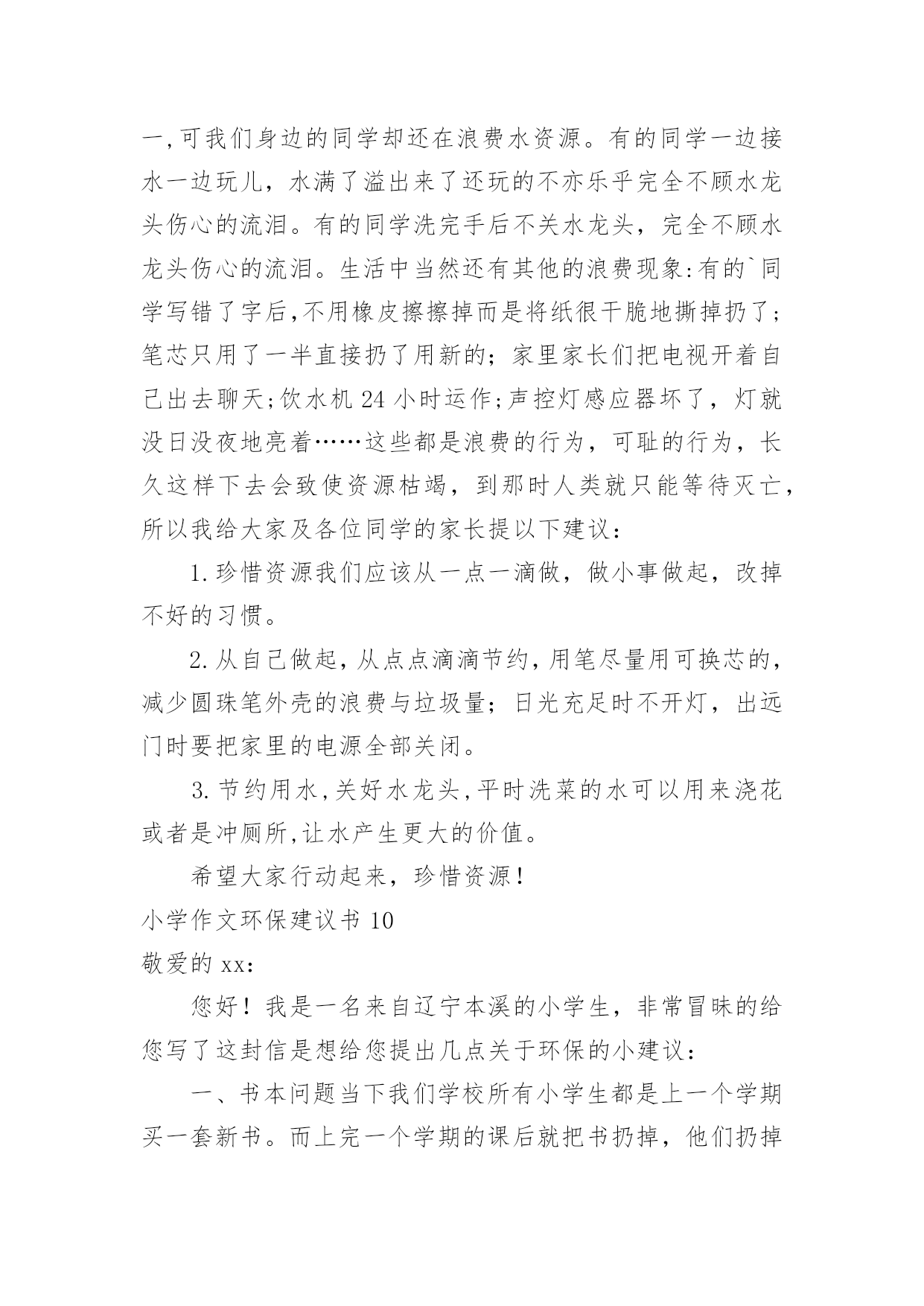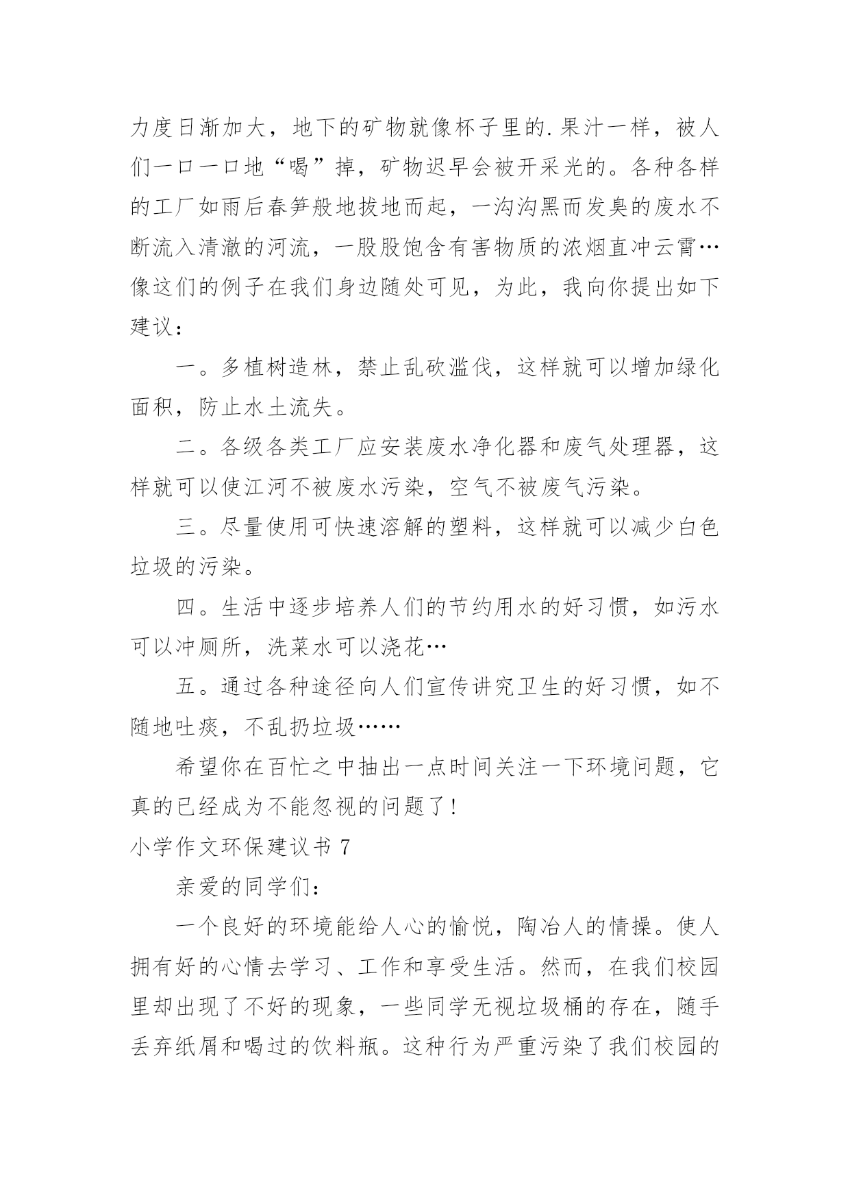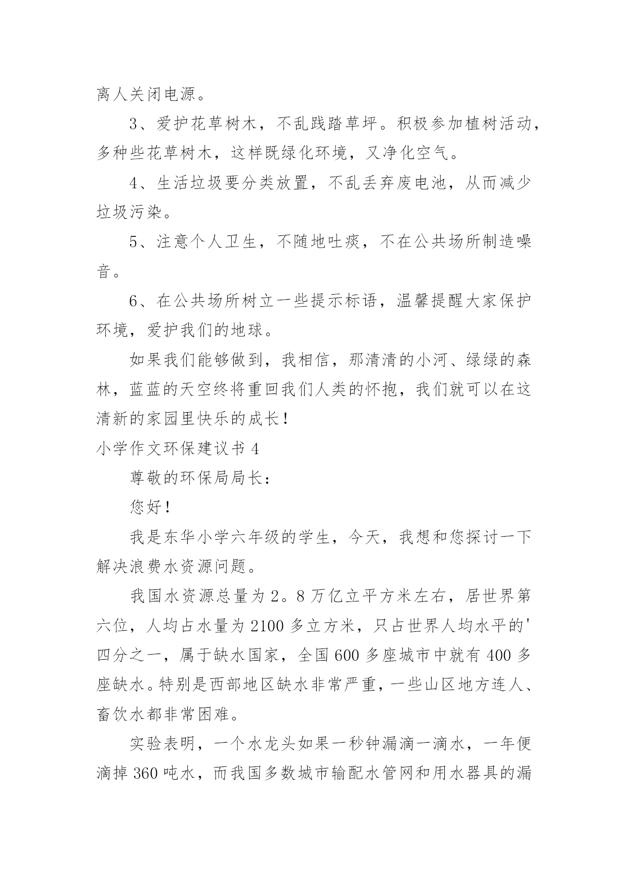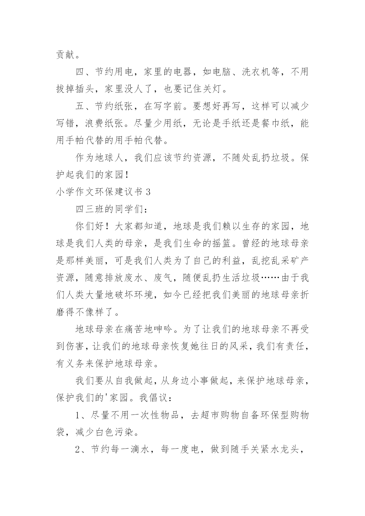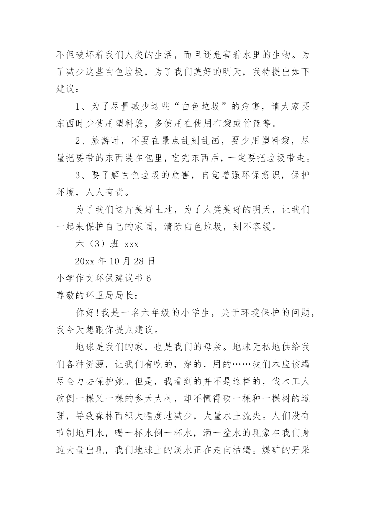 小学作文环保建议书小学作文环保建议书在现实社会中,能够利用到建议书的场合越来越多,我们在写建议书时要分条列出建议的具体内容。相信写建议书是一个让许多人都头痛的问题,下面是小编为大家收集的小学作文环保建议书,希望能够帮助到大家。小学作文环保建议书1各位市民,大家好!我是兴安一小的一名小学生。如今十分发达的地球,有着非常大的隐患。这一切都是我们人类造成的。贪婪的人类没有节制的'开采资源。人类所需要的“大气资源,水资源,森林资源”本来是可以不断生长的,但是人类随意破坏资源,滥用化学品,使我们的地球伤痕累累。人类随意破坏环境。比如我国的木兰溪,在50年代时,河水清澈见底,但现在的木兰溪,已是浑浊不清,鱼虾死亡。这一个个鲜活的例子,不都是人们不环保的后果吗?现在的天空,散布着汽车尾气,弥漫在我们生活的上空,早已在我们的身体里停留了。患上各种疾病。给我们的身体带来危害。面对这个充满污染的空气,我想对广大市民提出倡议:1:少用一次性塑料袋。在城市的上空,漫天飞舞的塑料袋,挂在树上。我提议,每次购物,最好带上自备的布袋。2:少用一次性筷子,饭盒在饭店,最好使用消毒的筷子,买饭时,最好使用饭盒。3:少砍树,多种树我们一定要少砍树,避免沙尘暴轻而易举的来侵袭城市。多种树,在自己生日时,最好种上一棵树。减少二氧化碳。在这个地球上,我们是地球的子民。让我们记住“拯救地球就是拯救自己”。小学作文环保建议书2各位地球公民:在生活中,垃圾随处可见。还有还有自然资源,我们的浪费导致它一点点流失。人们不爱护环境,大街小巷的垃圾随处可见。许多餐厅大量使用一次性产品,这只图一时方便。对环境一点利益都没有,反而有害处。许多人洗手后不关水龙头,用灯后不关灯,许多同学写作业,这一页没写好撕下来扔掉。这些,对我们的家园—地球,带来的是更多的.害处。所以我建议:一、走在大街上,不要把垃圾扔在地上,把垃圾送回它的家—垃圾桶,这个举手之劳,我们人人都能做得到。二、一次性产品,如一次性筷子、一次性纸杯等,它们对环境污染大,浪费资源,还不卫生。我们要尽量少用。三、我们要节约用水,用洗了衣服的水冲厕所,洗了菜的水洗手,用完水后切记关紧水龙头。让水资源为我们再做贡献。四、节约用电,家里的电器,如电脑、洗衣机等,不用拔掉插头,家里没人了,也要记住关灯。五、节约纸张,在写字前。要想好再写,这样可以减少写错,浪费纸张。尽量少用纸,无论是手纸还是餐巾纸,能用手帕代替的用手帕代替。作为地球人,我们应该节约资源,不随处乱扔垃圾。保护起我们的家园!小学作文环保建议书3四三班的同学们:你们好!大家都知道,地球是我们赖以生存的家园,地球是我们人类的母亲,是我们生命的摇篮。曾经的地球母亲是那样美丽,可是我们人类为了自己的利益,乱挖乱采矿产资源,随意排放废水、废气,随便乱扔生活垃圾……由于我们人类大量地破坏环境,如今已经把我们美丽的地球母亲折磨得不像样了。地球母亲在痛苦地呻吟。为了让我们的地球母亲不再受到伤害,让我们的地球母亲恢复她往日的风采,我们有责任,有义务来保护地球母亲。我们要从自我做起,从身边小事做起,来保护地球母亲,保护我们的'家园。我倡议:1、尽量不用一次性物品,去超市购物自备环保型购物袋,减少白色污染。2、节约每一滴水,每一度电,做到随手关紧水龙头,离人关闭电源。3、爱护花草树木,不乱践踏草坪。积极参加植树活动,多种些花草树木,这样既绿化环境,又净化空气。4、生活垃圾要分类放置,不乱丢弃废电池,从而减少垃圾污染。5、注意个人卫生,不随地吐痰,不在公共场所制造噪音。6、在公共场所树立一些提示标语,温馨提醒大家保护环境,爱护我们的地球。如果我们能够做到,我相信,那清清的小河、绿绿的森林,蓝蓝的天空终将重回我们人类的怀抱,我们就可以在这清新的家园里快乐的成长!小学作文环保建议书4尊敬的环保局局长:您好!我是东华小学六年级的学生,今天,我想和您探讨一下解决浪费水资源问题。我国水资源总量为2。8万亿立平方米左右,居世界第六位,人均占水量为2100多立方米,只占世界人均水平的'四分之一,属于缺水国家,全国600多座城市中就有400多座缺水。特别是西部地区缺水非常严重,一些山区地方连人、畜饮水都非常困难。实验表明,一个水龙头如果一秒钟漏滴一滴水,一年便滴掉360吨水,而我国多数城市输配水管网和用水器具的漏水损失高达20%以上,仅城市便器水箱漏水一项每年就损失上亿立方米。全国每年浪费水资源更在100亿立方米以上。北京市仅一年的洗车耗水量,就相当于一个多昆明湖或6个北海的蓄水量。为什么会出现这种情况呢?这是因为广大市民的环保意识不强、相关的管理制度不健全。为此,我真诚地向您提出以下几点建议:一、洗澡擦肥皂时关掉水龙头,一次可以节约60升水;二、厕所使用节水型器具,每次可以节约4——5升水;三、洗菜时用盆接水