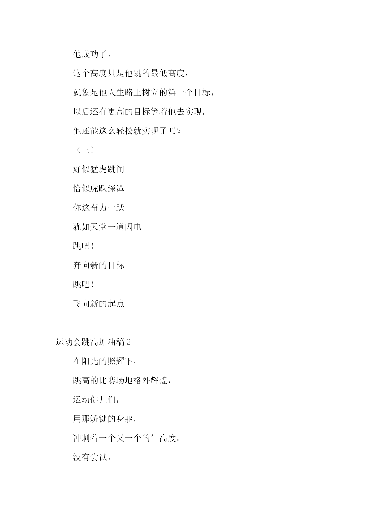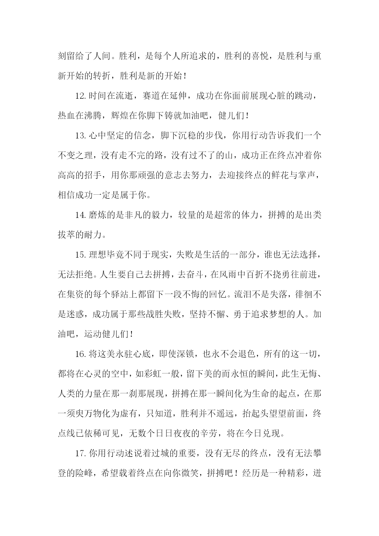 运动会跳高加油稿运动会跳高加油稿1(一)你像一只矫健的飞燕轻捷地掠过了横竿,顿时,全场晴天霹雳般哄起一片欢呼声。在喝彩声中横竿升上了新的高度伴随着这喝彩声你又开始向新的、更高的目标攀登(二)操场一角沙坑上,一根竹竿静静的恒在两个木架子上。距竹竿七八米的’西南角,一个运动员深邃的眼光注视着竹竿,右脚轻轻地往后一蹬,开始助跑,渐渐地速度在加快,在离竹竿约两步的地方,他左脚用力一蹬,随即右脚向上一抬,继而整个人越过竹竿,轻松着地,竹竿依然静静的躺在木架子上,他成功了,这个高度只是他跳的最低高度,就象是他人生路上树立的第一个目标,以后还有更高的目标等着他去实现,他还能这么轻松就实现了吗?(三)好似猛虎跳闸恰似虎跃深潭你这奋力一跃犹如天堂一道闪电跳吧!奔向新的目标跳吧!飞向新的起点运动会跳高加油稿2在阳光的照耀下,跳高的比赛场地格外辉煌,运动健儿们,用那矫键的身躯,冲刺着一个又一个的’高度。没有尝试,怎会知道自己是否为强者,超越自己,也许会创造一番新天地!运动健儿们加油吧,去创造一份份奇奇迹,去创造一份份惊喜!运动会跳高加油稿31.看!那一面面迎风飘舞的彩旗,是一朵朵盛开的鲜花;听!那一阵阵惊天动地的欢呼,是回响在耳边胜利的风声。运动场上的你们,是胜利的标志,运动场上的你们,是青春的赞叹。去吧!去迎接那伟大的挑战,去吧!去做一名追风的少年。2.超越对手,超越自我,是我们的目标,我们的信念,在清凉的初秋,在喧嚣的田径场上,你们点燃了似火的热情,无论成败,我们都为你们感到自豪,你们永远是我们的骄傲!3.这是意志的拼搏,这是速度的挑战,胜利在向你们招手,胜利在向你们呼唤!4.你用行动述说着过城的重要,没有无尽的终点,没有无法攀登的险峰,希望载着终点在向你微笑,拼搏吧!经历是一种精彩,迸发你全部的能量,成功是你汗水的写照。5.看!运动场上那一幕幕,无论是哭是笑,是喜是悲,其中都融入了他们的汗水辛劳。他们是真正的矫健者,是运动场上的骄儿,更是我们心中的英雄。加油吧!英雄们!每一份辛劳都有一份收获,每一次的痛苦都是快乐的开始,每一声呐喊都是力量的呼唤运动场上的健儿,掌声属于你们,鲜花属于你们,成功也是属于你们!6.生活中,我们每天都在尝试;我们走向成功,品味失败,走过心灵的阴雨晴空。运动员们,不要放弃尝试,无论失败与否,重要的是你勇于参与的精神,付出的背后是胜利;无论是否成功,我们永远赞美你,你们永远是我们的骄傲。7.就像花儿准备了春、秋、冬,就是为了红透整个盛夏。就像雪花经历了春、夏、秋就是为了洁白整个严冬。蹲下,昂首,出发……轻轻的一抬脚,便牵动了全场的目光潇洒的迫挥挥手,便满足了那一份无言的等待。迎着朝阳,你们踏歌而去,背着希望,我们等待你们的归来。8.虽然你们在场上的时间很短暂,但你们的身影依然停留在人们的’脑海里,因为你们是赛场上最可爱的人!9.光,是温暖的;月,是温馨的;星,是浪漫的;风,是清爽的;鱼,是滋润的;雪,是完美的;冰,是晶莹的;而我们的加油,是连绵不断的;期望你们能够加油,奋力拼搏!10.泰戈尔在诗中说,天空没有翅膀的影子,但我已飞过;艾青对朋友说,也许有人到达不了彼岸,但我们共同拥有大海。也许你们没有显赫的成绩,但运动场上留下了你们的足迹。也许你们没有奖品,但我们心中留下了你们拼搏的身影。所有的努力都是为了迎接这一刹那,所有的拼搏都是为了这一声令下。11.年轻的我们不言失败,没有风浪,就不能显示帆的本色;没有曲折,就无法品味人生的乐趣。固然我们没得第一,但至少我们付出过努力过拼搏过。人生又能有几次搏呢?12.踏着秋天的气息,迈着轻盈的脚步,我们迎来了心仪已久的运动会。那里就是展示自我的舞台。来吧,尽情释放你的活力。你的每一次冲刺,都叩动着我们的心弦;你的每一次跨越,都吸引着我们的视线;你的每一次起跳,都绷紧我们的神经。我们为你呐喊,我们为你自豪,我们为你疯狂。加油,xx班的你们永远是最棒的的!13.漫漫长路,你愿一人独撑,忍受着孤独与寂寞,承受着体力与精神的压迫,只任汗水溶于泪水,可脚步却从不停歇。好样的,纵然得不了桂冠,可坚持的你,定会赢得最后的掌声。14.蚂蚱似的起跳,空中的走步表演,引起阵阵惊叹,落地的瞬间,你触到了沙的柔软,不管怎样,荣誉永远属于你。15.大地属于你,蓝天属于你,在你一跃的瞬间,同时跃出了我们的期望。草儿欣赏你,白云欢迎你,身轻如燕,飞跃蓝天,奥林匹克精神在你的身上体现。跳吧,跳出你的自信,跳出你的顶尖,跳出你的胜利山巅。16.不为掌声的注释,不为刻意的征服,不为失败的痛苦,只有辛勤的汗水,化作成功的脚步!17.你是否感到,烈日的照射那是烈日对你的祝福;你是否感到,