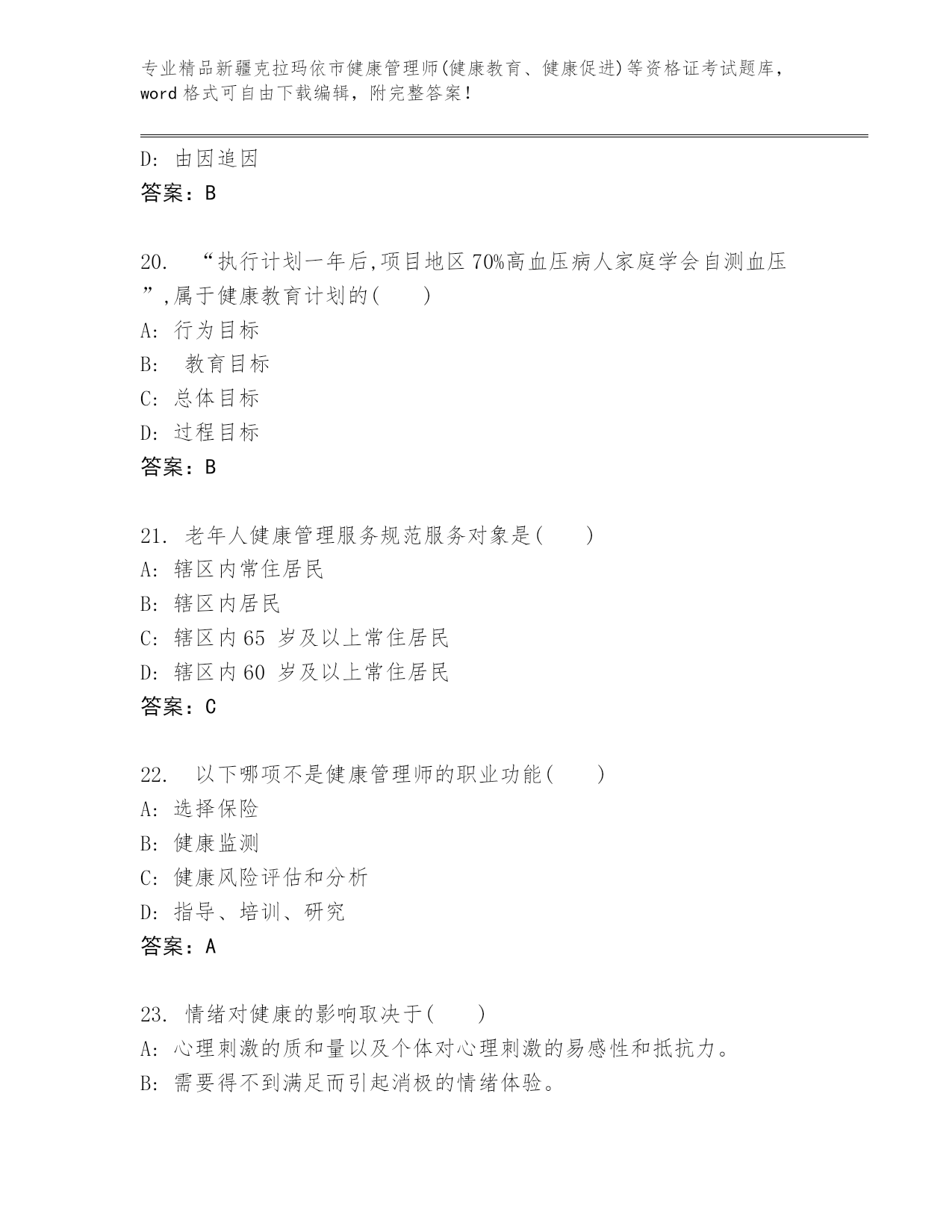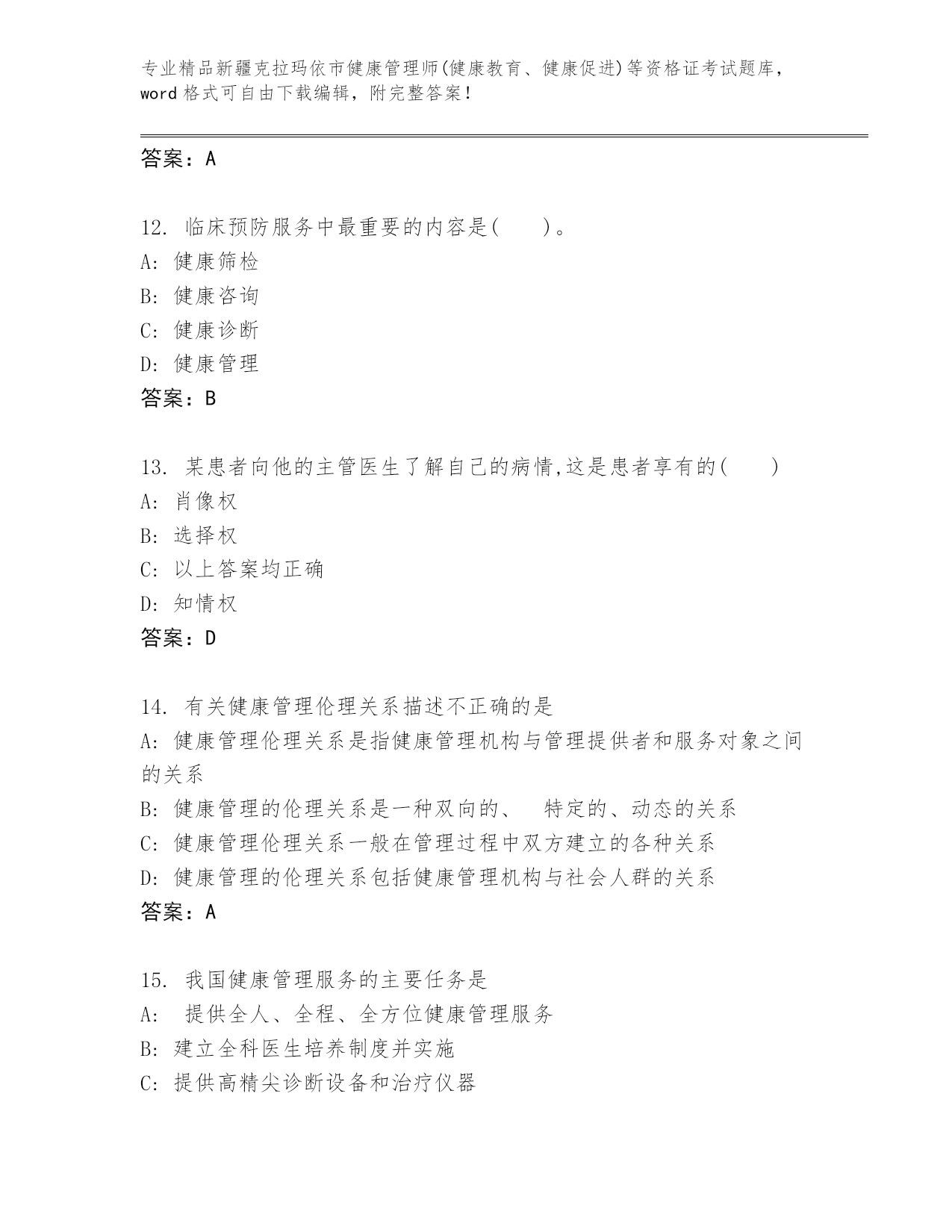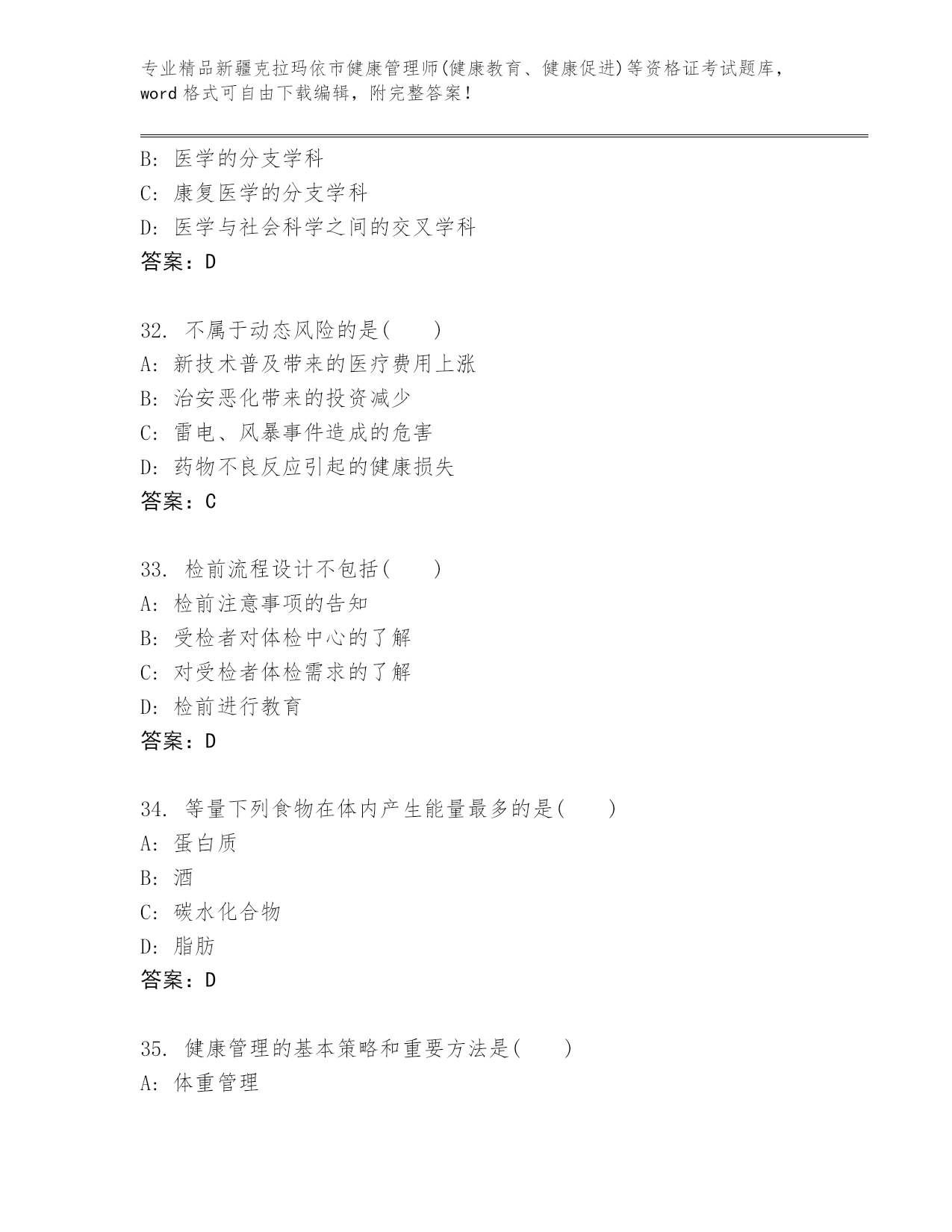 精品新疆克拉玛依市健康管理师(健康教育、健康促进)等资格证考试内部题库及答案参考