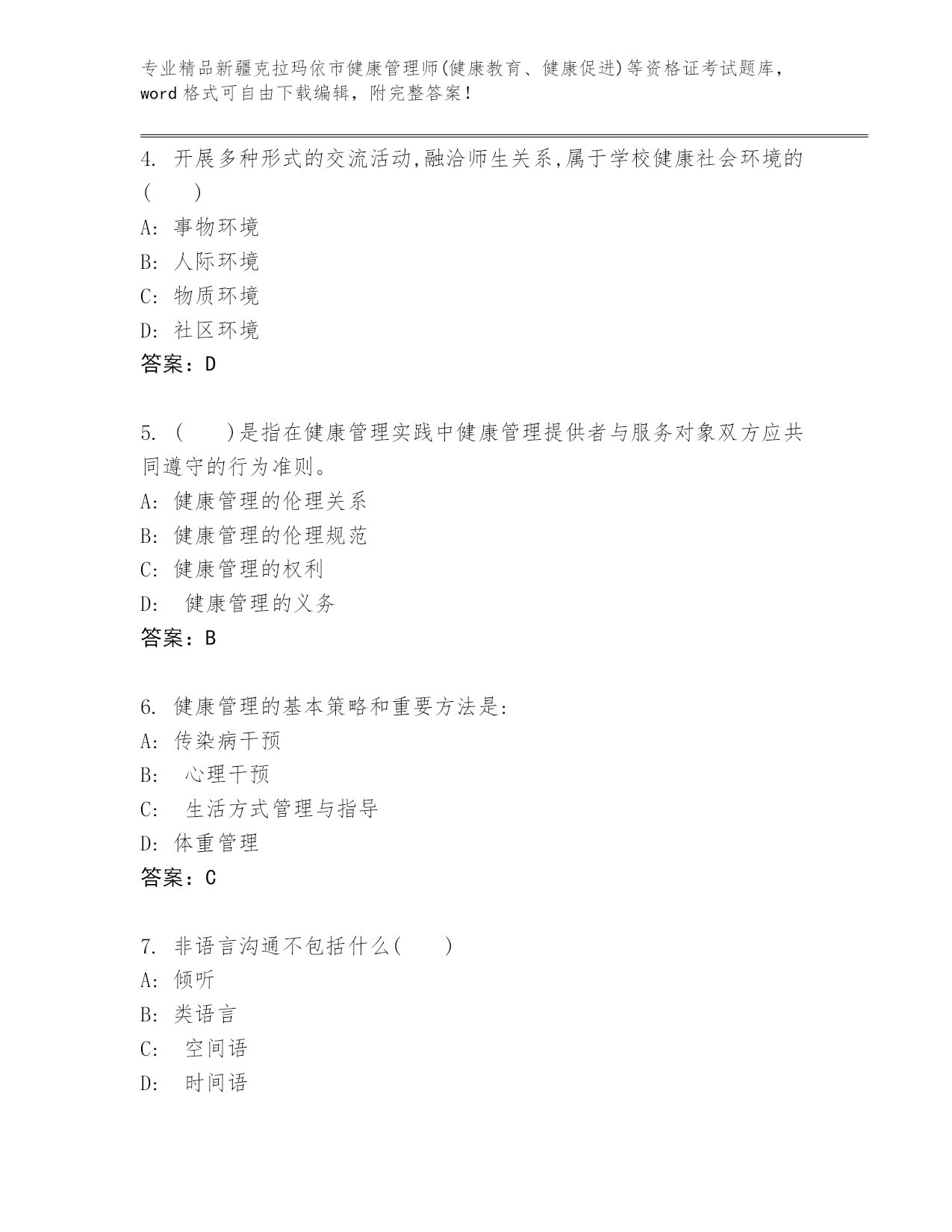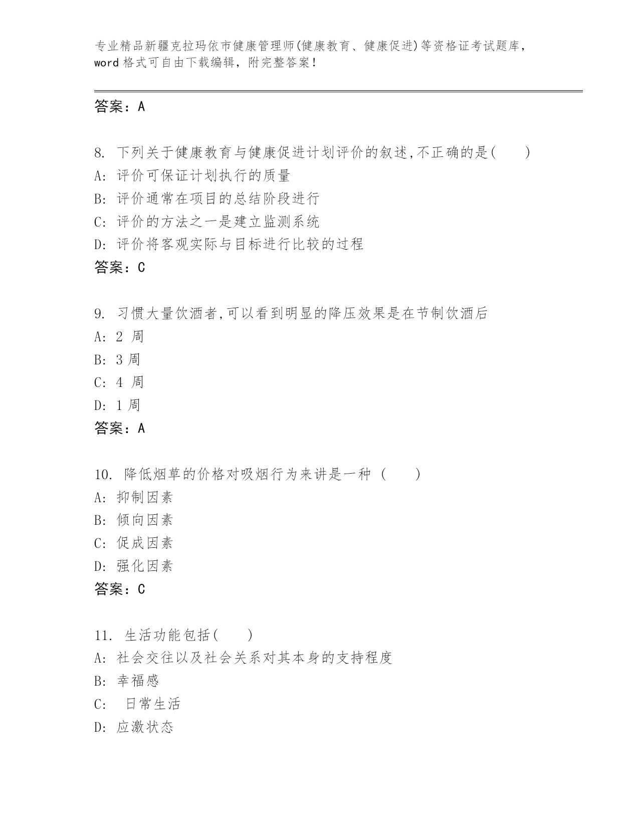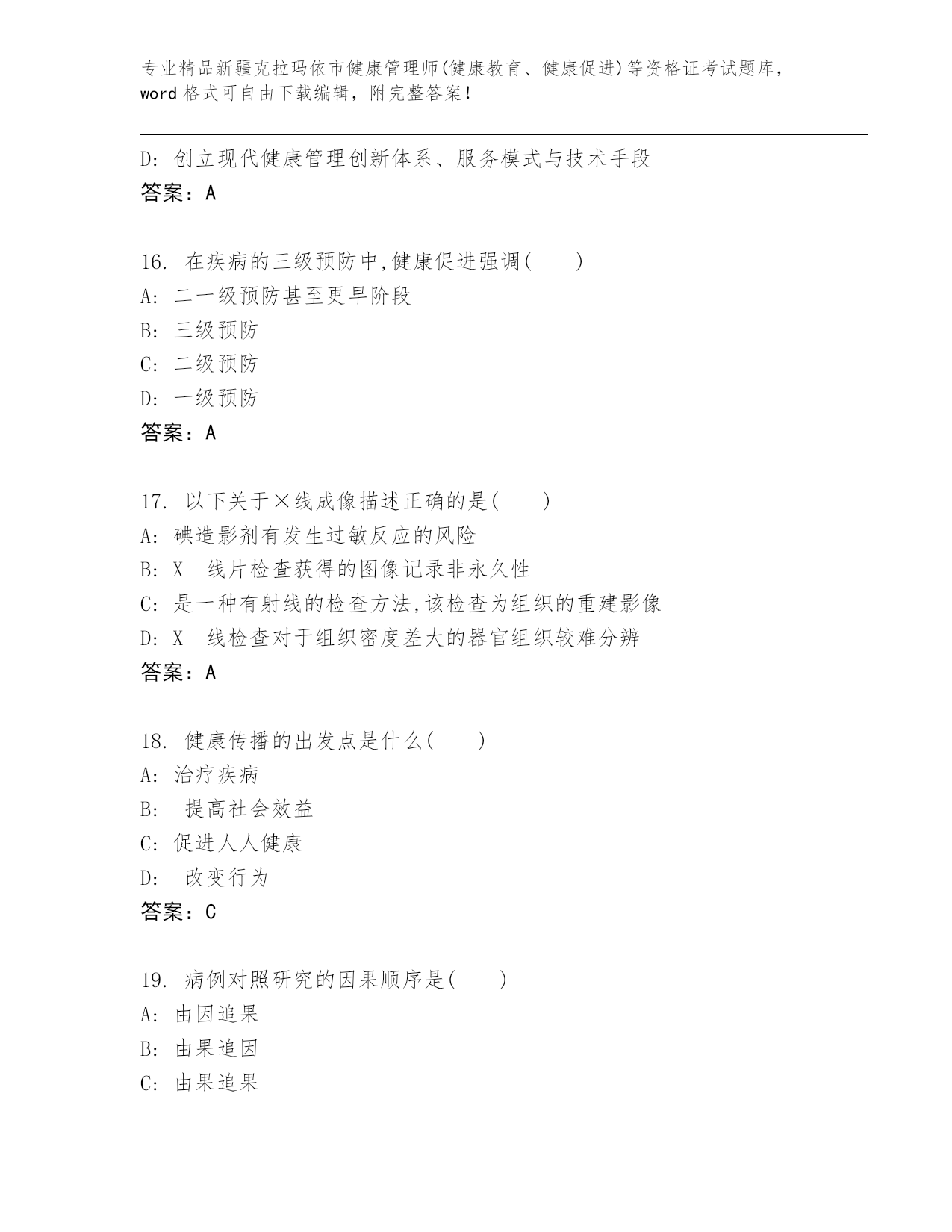 精品新疆克拉玛依市健康管理师(健康教育、健康促进)等资格证考试内部题库及答案参考