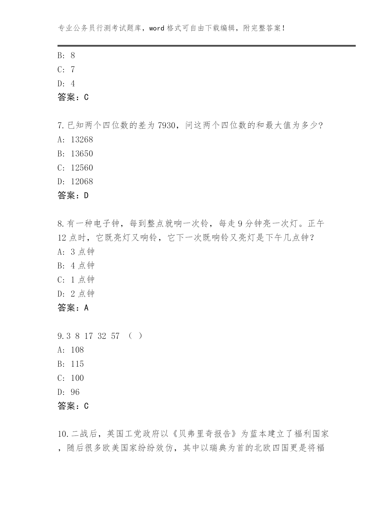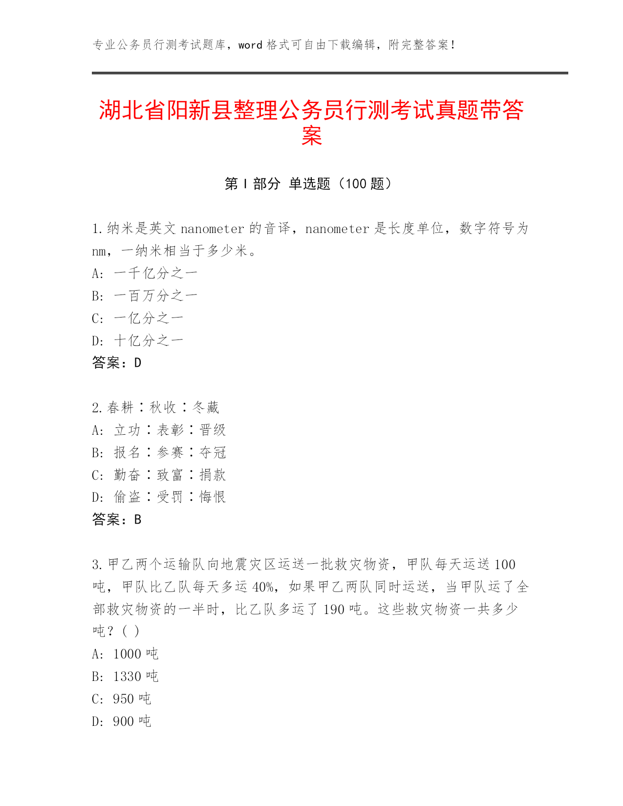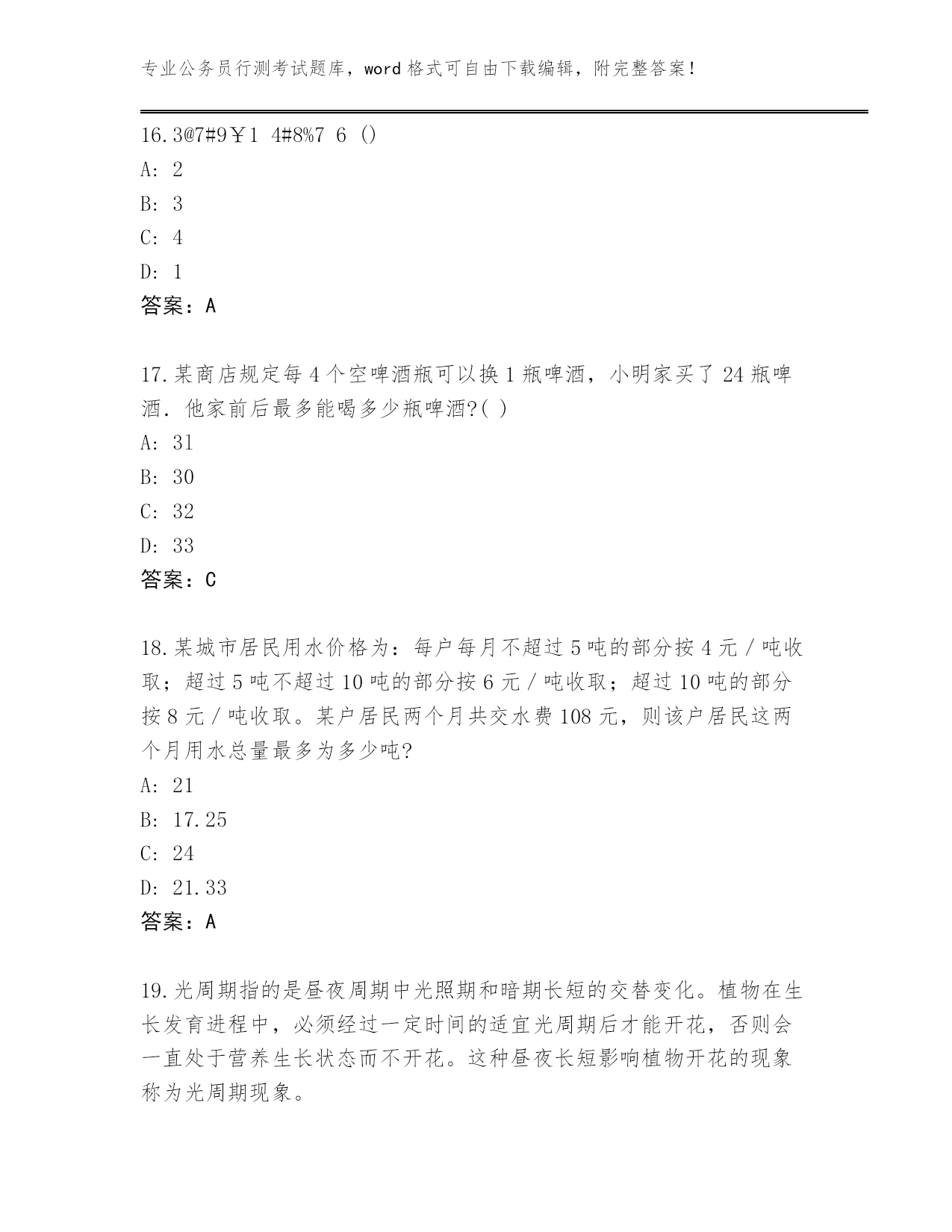 湖北省阳新县整理公务员行测考试真题带答案