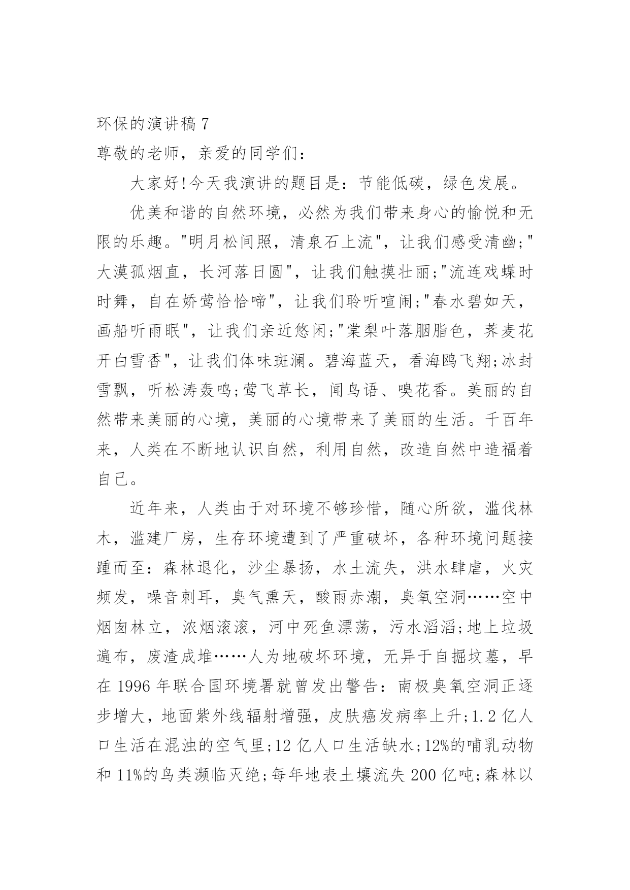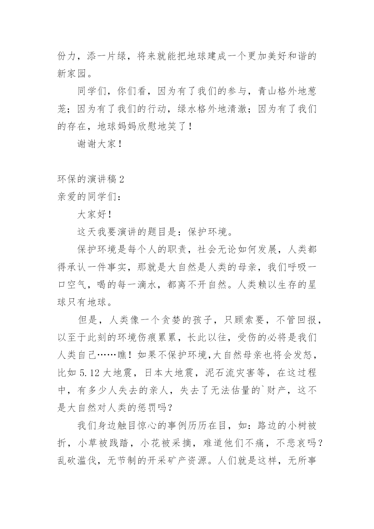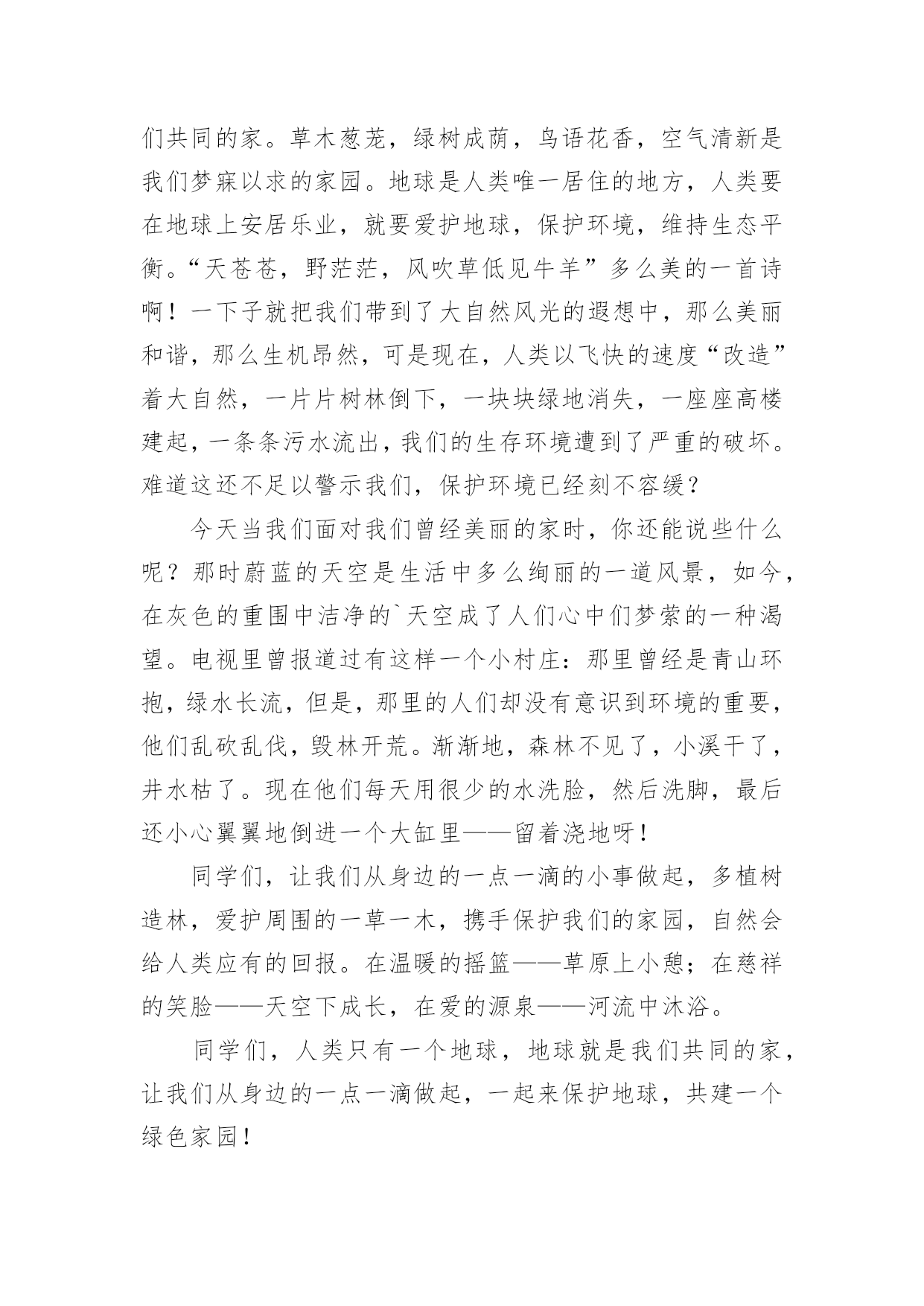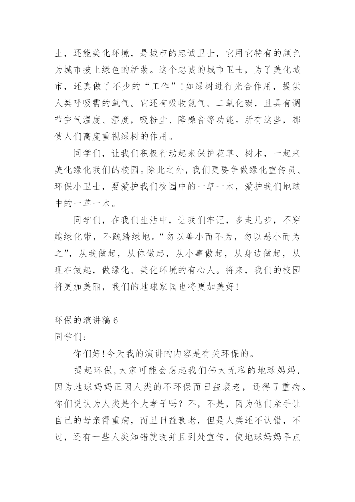 环保的演讲稿环保的演讲稿(推荐)通过对演讲稿语言的推究可以提高语言的表现力,增强语言的感染力。在当今社会生活中,越来越多人会去使用演讲稿,你写演讲稿时总是没有新意?以下是小编帮大家整理的环保的演讲稿,欢迎阅读与收藏。环保的演讲稿1老师们,同学们:早上好!今天我演讲的题目是保护环境,从我做起。同学们,我们的家园富饶而美丽,我们生活,学习的地方空气是那样的清新,环境是那么的优美。地球就像妈妈一样给我们带来幸福,带来快乐。可是,你们知道吗?我们生活的`地球上,美好的环境正在遭到破坏,它将给我们人类带来无穷的灾难。我们少先队员能为地球妈妈做些什么呢?那就从身边的小事做起吧。当你和家人出去旅游时,不但自己不乱扔果皮,包装纸,而且发现垃圾还能主动拣起来投进垃圾箱里,那你就是一个保护环境的好少年;在学校里,看见自来水龙头没关紧,你能上前动手把它拧紧;看到光线充足,能主动把教室里的灯关掉,那你就是一名节约资源的好学生……只要大家脑子里有爱护环境的有心人,就能为我们的家园尽一份力,添一片绿,将来就能把地球建成一个更加美好和谐的新家园。同学们,你们看,因为有了我们的参与,青山格外地葱茏;因为有了我们的行动,绿水格外地清澈;因为有了我们的存在,地球妈妈欣慰地笑了!谢谢大家!环保的演讲稿2亲爱的同学们:大家好!这天我要演讲的题目是:保护环境。保护环境是每个人的职责,社会无论如何发展,人类都得承认一件事实,那就是大自然是人类的母亲,我们呼吸一口空气,喝的每一滴水,都离不开自然。人类赖以生存的星球只有地球。但是,人类像一个贪婪的孩子,只顾索要,不管回报,以至于此刻的环境伤痕累累,长此以往,受伤的必将是我们人类自己……瞧!如果不保护环境,大自然母亲也将会发怒,比如5.12大地震,日本大地震,泥石流灾害等,在这过程中,有多少人失去的亲人,失去了无法估量的`财产,这不是大自然对人类的惩罚吗?我们身边触目惊心的事例历历在目,如:路边的小树被折,小草被践踏,小花被采摘,难道他们不痛,不悲哀吗?乱砍滥伐,无节制的开采矿产资源。人们就是这样,无所事事的破坏生态平衡。作为小学生,我们就应从身边做起,从小事做起,保护花草树木,不乱丢垃圾,不使用一次性筷子,尽自我一份微薄之力。在此我呼吁大家;请保护环境,只有这样才是最终保护了人类自己!因为地球只有一个,人类不能克隆。我的演讲到此结束,谢谢大家!环保的演讲稿3同学们:大家好!相信大家是经常看见河,有桥便有河,有河便有水。在洪家,有一条永宁河。我是听邻居说的,在很早以前,小河虽然不是清澈见底,可并不混浊。两旁栽着树,生着小草。人们在这儿洗衣、钓鱼。自从两旁开了几个工厂之后,污水就经常被排到这,但还是有人在钓鱼,可过不了几天,小河变得肮脏起来。虽然两旁都有三四个垃圾箱,可人们对小河的态度变了:他们经常把垃圾丢入小河,树木枯死,常年生在河岸边的小草也变臭了。行人路过这儿时总是捂住嘴巴,离得远远的。久而久之,小河越来越臭,站在几十米外臭味还是散发着。同学们,听了我的发言,我提议大家应该行动起来,保护小河,爱护环境环保演讲稿。为此,我想了以下几个方法:1。不乱丢垃圾,扔到指定的地方。2。制止工厂将污水排放到这里。3。将河面上的垃圾捞起。4。在两旁栽上花草树木。这些,并不是一两个人能够办到的.,希望大家鼓动起来,一起保护小河。相信我们的家园会越变越美丽。谢谢!环保的演讲稿4敬爱的老师,亲爱的同学们:你们好!世界上,每一天都有超多的物品被生产出来,也有超多的物品变成一堆堆没有用的垃圾,在这个科技发展迅速的21世纪,我们怎样能不为环保而着想呢?每当人们随地吐一口痰,每当人们把随地乱扔垃圾,我的心里就无法平静,如果人人都明白环保很重要的话,我们的`世界将会更完美!我们来做一个设想,如果全中国人每人每一天乱扔一个垃圾,那么世界上就多出14亿无家可归的垃圾,这还只是中国,如果是全世界那又是一个大数字,并且无环保意识的人一天还不止乱扔1个垃圾,这样算下来,那又是一个大数字,这还只是一天,如果这样下去,地球岂不是就成了一堆垃圾的星球?透过刚刚的设想,让我觉得很不可思议,我都不敢继续往下想了,继续往下想那又是一串天文数字,所以,为了我们共同的家园,让我们保护环境吧,我们要向环卫工人那样学习他们的精神,保护环境,人人有责!最后,我想说:为了我们一个共同的地球,让我们开始保护环境吧;为了我们能呼吸到新鲜的空气,让我们捡起无家可归的垃圾吧,让它们也有家,不让它们污染环境。大家开始行动起来,地球会变得更美丽!环保,人人有责,谁都不例外。环保的演讲稿5尊敬的老师,亲爱的同学们:大家上午好!今天国旗下讲话的题目是《护绿环保》。三月,细雨如丝,小树抽出了新的枝芽儿,花儿绽开了五彩的笑脸,小草儿也悄悄地探出了脑袋,同学们,你们是否闻到了春的气息?俗话说:“一年之计