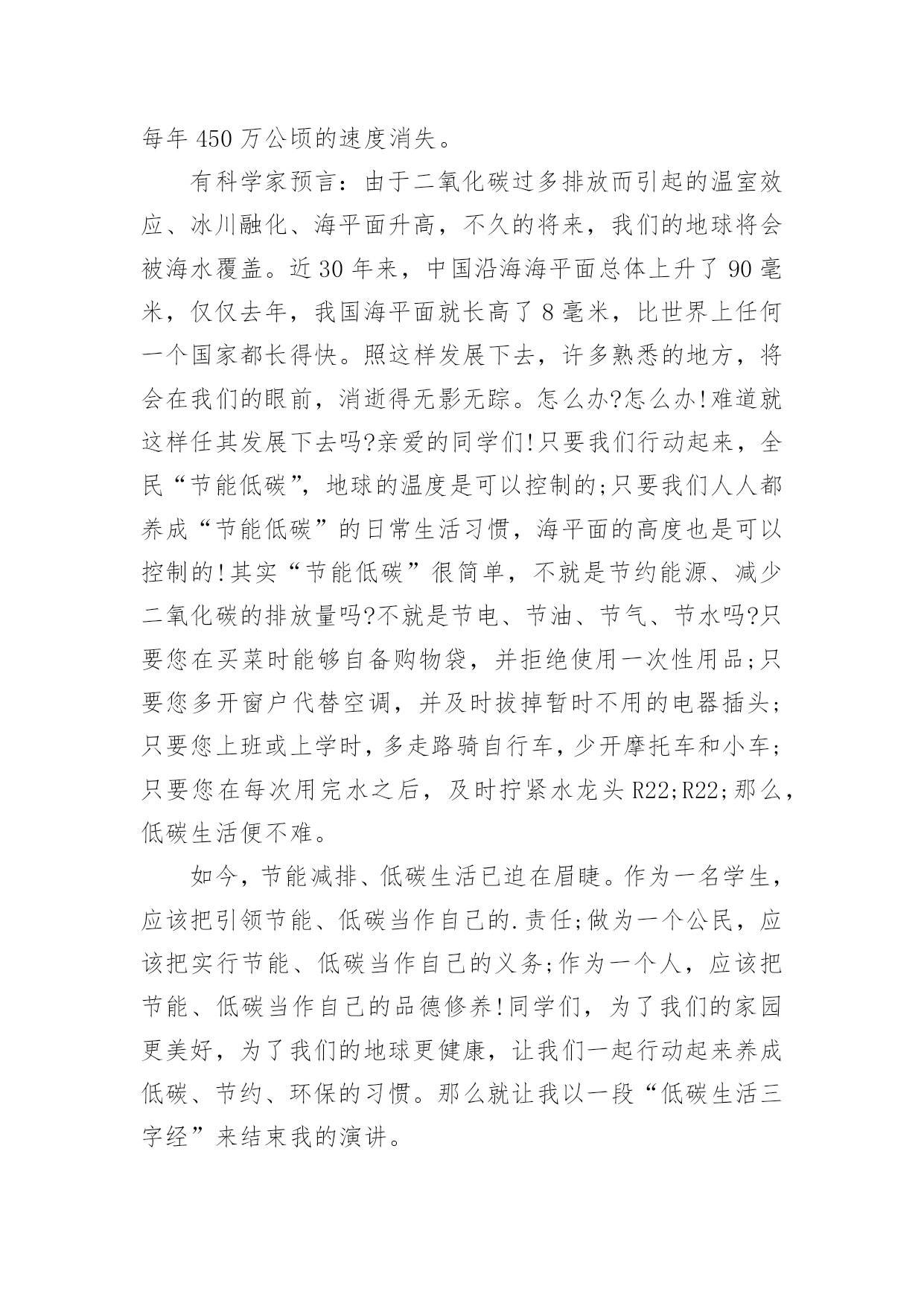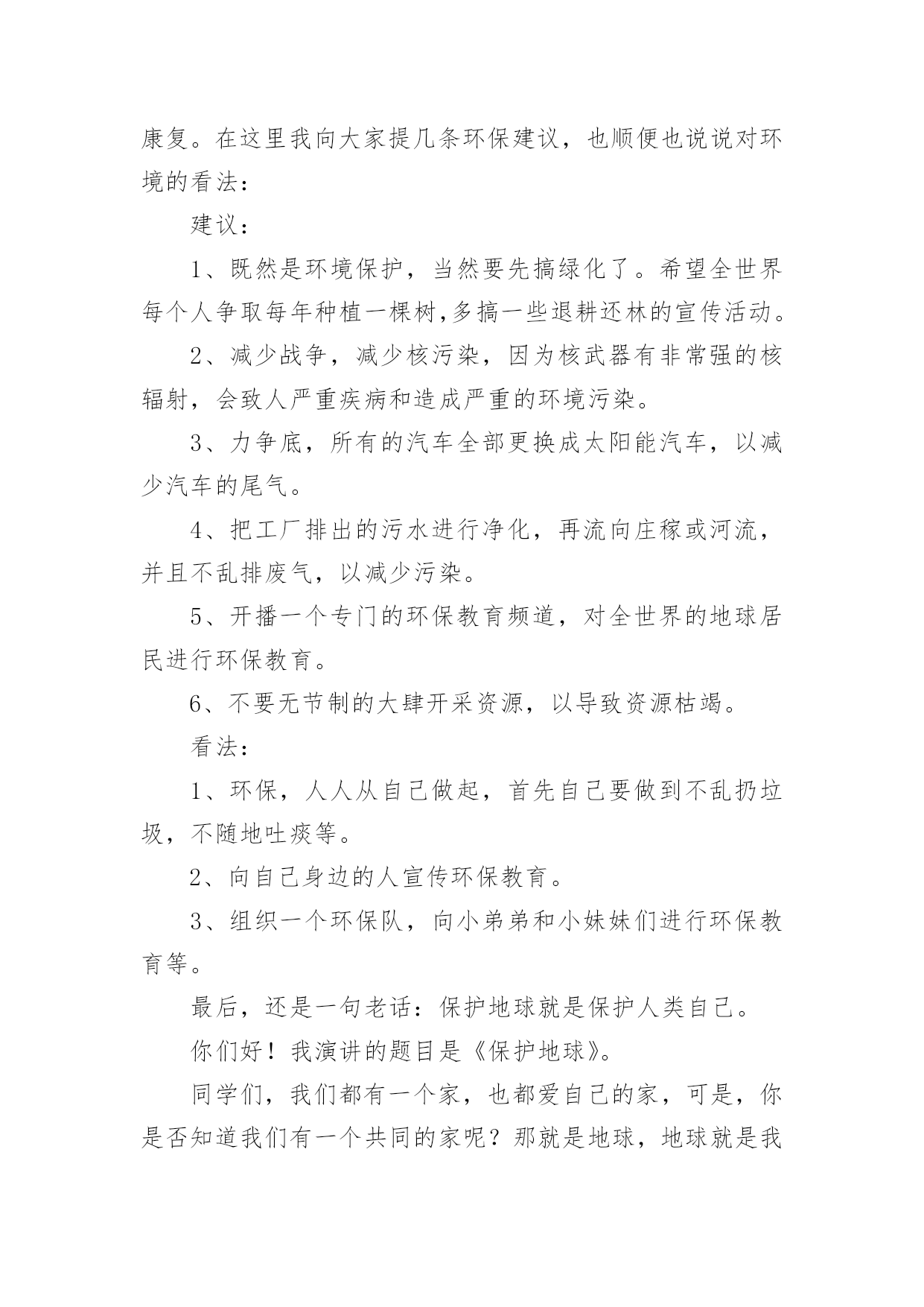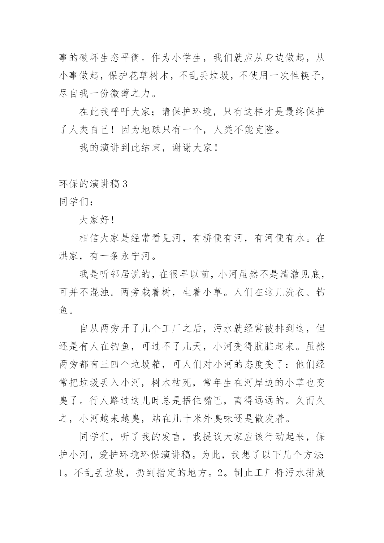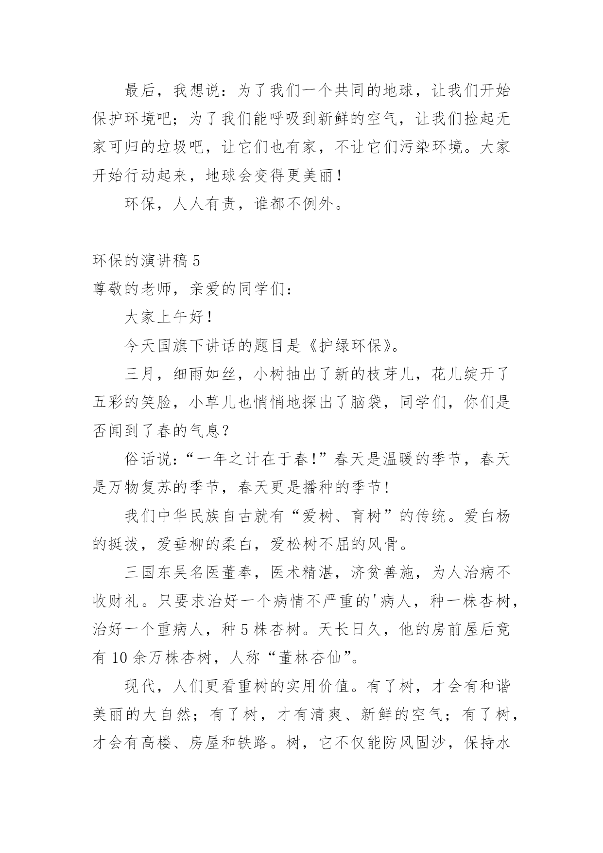 环保的演讲稿环保的演讲稿(推荐)通过对演讲稿语言的推究可以提高语言的表现力,增强语言的感染力。在当今社会生活中,越来越多人会去使用演讲稿,你写演讲稿时总是没有新意?以下是小编帮大家整理的环保的演讲稿,欢迎阅读与收藏。环保的演讲稿1老师们,同学们:早上好!今天我演讲的题目是保护环境,从我做起。同学们,我们的家园富饶而美丽,我们生活,学习的地方空气是那样的清新,环境是那么的优美。地球就像妈妈一样给我们带来幸福,带来快乐。可是,你们知道吗?我们生活的`地球上,美好的环境正在遭到破坏,它将给我们人类带来无穷的灾难。我们少先队员能为地球妈妈做些什么呢?那就从身边的小事做起吧。当你和家人出去旅游时,不但自己不乱扔果皮,包装纸,而且发现垃圾还能主动拣起来投进垃圾箱里,那你就是一个保护环境的好少年;在学校里,看见自来水龙头没关紧,你能上前动手把它拧紧;看到光线充足,能主动把教室里的灯关掉,那你就是一名节约资源的好学生……只要大家脑子里有爱护环境的有心人,就能为我们的家园尽一份力,添一片绿,将来就能把地球建成一个更加美好和谐的新家园。同学们,你们看,因为有了我们的参与,青山格外地葱茏;因为有了我们的行动,绿水格外地清澈;因为有了我们的存在,地球妈妈欣慰地笑了!谢谢大家!环保的演讲稿2亲爱的同学们:大家好!这天我要演讲的题目是:保护环境。保护环境是每个人的职责,社会无论如何发展,人类都得承认一件事实,那就是大自然是人类的母亲,我们呼吸一口空气,喝的每一滴水,都离不开自然。人类赖以生存的星球只有地球。但是,人类像一个贪婪的孩子,只顾索要,不管回报,以至于此刻的环境伤痕累累,长此以往,受伤的必将是我们人类自己……瞧!如果不保护环境,大自然母亲也将会发怒,比如5.12大地震,日本大地震,泥石流灾害等,在这过程中,有多少人失去的亲人,失去了无法估量的`财产,这不是大自然对人类的惩罚吗?我们身边触目惊心的事例历历在目,如:路边的小树被折,小草被践踏,小花被采摘,难道他们不痛,不悲哀吗?乱砍滥伐,无节制的开采矿产资源。人们就是这样,无所事事的破坏生态平衡。作为小学生,我们就应从身边做起,从小事做起,保护花草树木,不乱丢垃圾,不使用一次性筷子,尽自我一份微薄之力。在此我呼吁大家;请保护环境,只有这样才是最终保护了人类自己!因为地球只有一个,人类不能克隆。我的演讲到此结束,谢谢大家!环保的演讲稿3同学们:大家好!相信大家是经常看见河,有桥便有河,有河便有水。在洪家,有一条永宁河。我是听邻居说的,在很早以前,小河虽然不是清澈见底,可并不混浊。两旁栽着树,生着小草。人们在这儿洗衣、钓鱼。自从两旁开了几个工厂之后,污水就经常被排到这,但还是有人在钓鱼,可过不了几天,小河变得肮脏起来。虽然两旁都有三四个垃圾箱,可人们对小河的态度变了:他们经常把垃圾丢入小河,树木枯死,常年生在河岸边的小草也变臭了。行人路过这儿时总是捂住嘴巴,离得远远的。久而久之,小河越来越臭,站在几十米外臭味还是散发着。同学们,听了我的发言,我提议大家应该行动起来,保护小河,爱护环境环保演讲稿。为此,我想了以下几个方法:1。不乱丢垃圾,扔到指定的地方。2。制止工厂将污水排放到这里。3。将河面上的垃圾捞起。4。在两旁栽上花草树木。这些,并不是一两个人能够办到的.,希望大家鼓动起来,一起保护小河。相信我们的家园会越变越美丽。谢谢!环保的演讲稿4敬爱的老师,亲爱的同学们:你们好!世界上,每一天都有超多的物品被生产出来,也有超多的物品变成一堆堆没有用的垃圾,在这个科技发展迅速的21世纪,我们怎样能不为环保而着想呢?每当人们随地吐一口痰,每当人们把随地乱扔垃圾,我的心里就无法平静,如果人人都明白环保很重要的话,我们的`世界将会更完美!我们来做一个设想,如果全中国人每人每一天乱扔一个垃圾,那么世界上就多出14亿无家可归的垃圾,这还只是中国,如果是全世界那又是一个大数字,并且无环保意识的人一天还不止乱扔1个垃圾,这样算下来,那又是一个大数字,这还只是一天,如果这样下去,地球岂不是就成了一堆垃圾的星球?透过刚刚的设想,让我觉得很不可思议,我都不敢继续往下想了,继续往下想那又是一串天文数字,所以,为了我们共同的家园,让我们保护环境吧,我们要向环卫工人那样学习他们的精神,保护环境,人人有责!最后,我想说:为了我们一个共同的地球,让我们开始保护环境吧;为了我们能呼吸到新鲜的空气,让我们捡起无家可归的垃圾吧,让它们也有家,不让它们污染环境。大家开始行动起来,地球会变得更美丽!环保,人人有责,谁都不例外。环保的演讲稿5尊敬的老师,亲爱的同学们:大家上午好!今天国旗下讲话的题目是《护绿环保》。三月,细雨如丝,小树抽出了新的枝芽儿,花儿绽开了五彩的笑脸,小草儿也悄悄地探出了脑袋,同学们,你们是否闻到了春的气息?俗话说:“一年之计