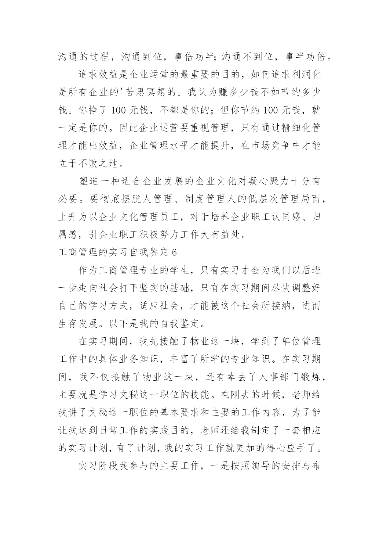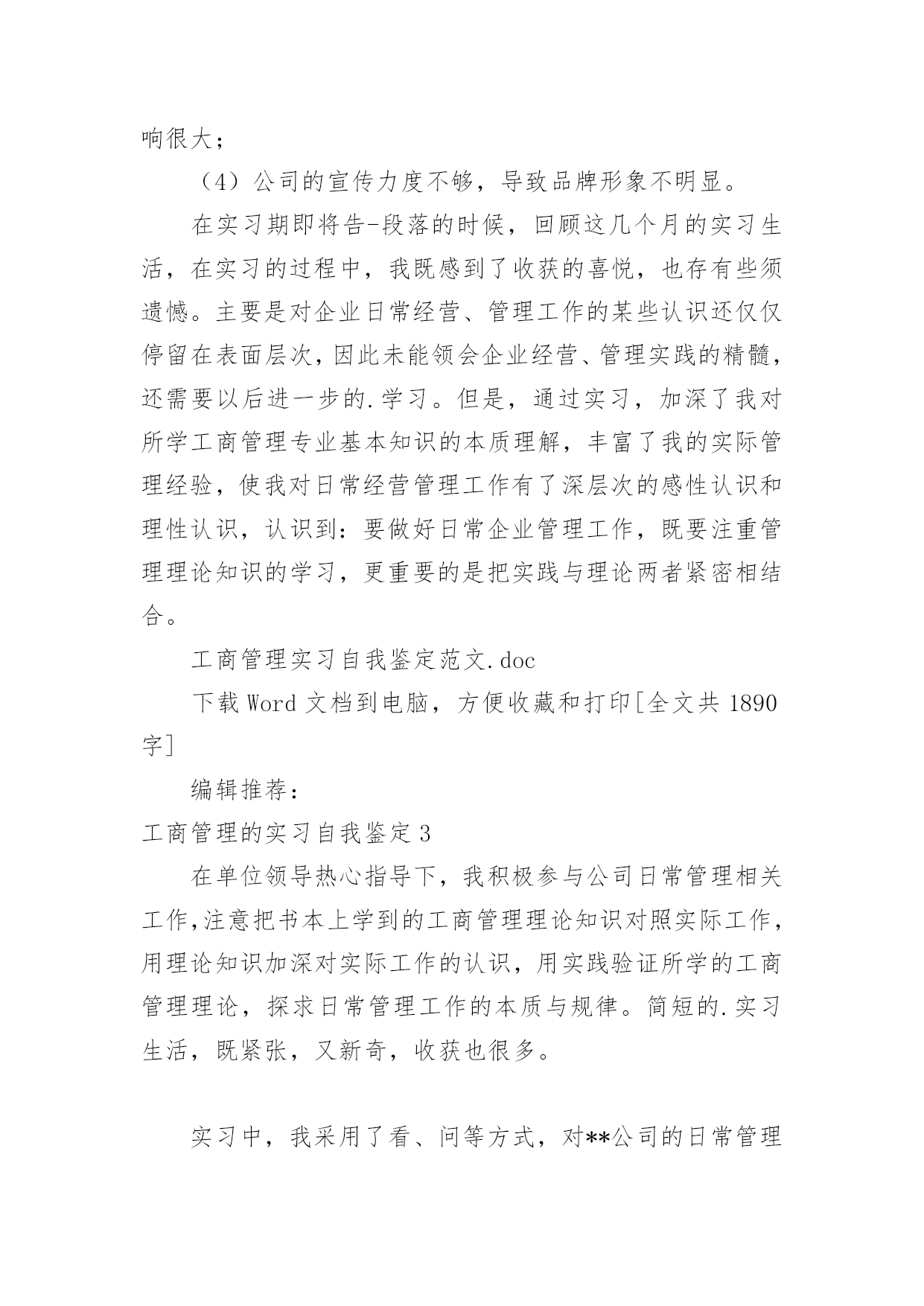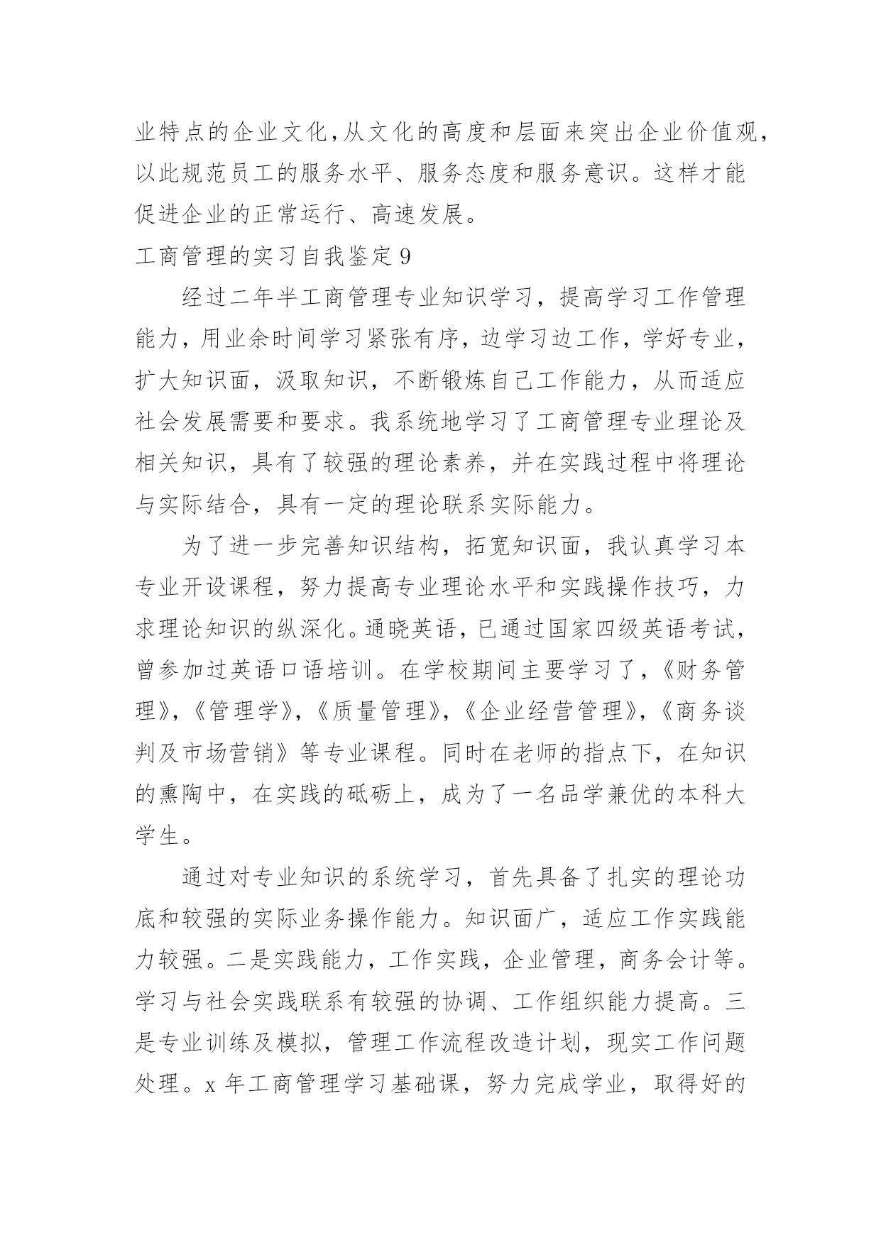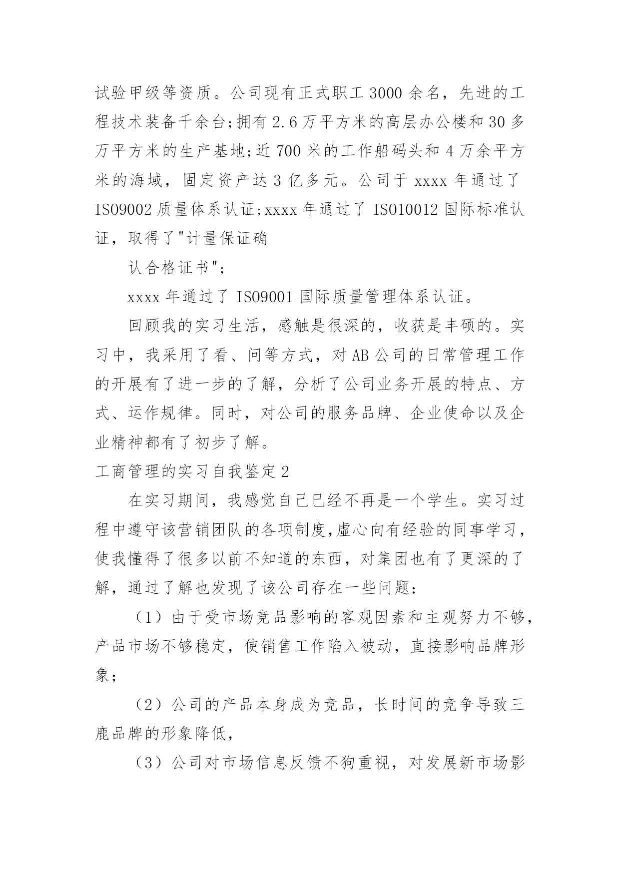 工商管理的实习自我鉴定工商管理的实习自我鉴定9篇自我鉴定就是把一个时段的个人情况进行一次全面系统的总结,自我鉴定可以提升对发现问题的能力,因此,让我们写一份自我鉴定吧。自我鉴定怎么写才不会千篇一律呢?以下是小编收集整理的工商管理的实习自我鉴定,欢迎大家分享。工商管理的实习自我鉴定1今年开始,我在某工程公司附属单位AB公司进行了工商管理实习工作。在实习中,我在公司指导老师的热心指导下,积极参与公司日常管理相关工作,注意把书本上学到的工商管理理论知识对照实际工作,用理论知识加深对实际工作的认识,用实践验证所学的工商管理理论,探求日常管理工作的本质与规律。简短的实习生活,既紧张,又新奇,收获也很多。通过实习,使我对日常管理工作有了深层次的`感性和理性的认识。我所实习的AB公司,隶属于某工程公司。该工程公司是以水工、市政、工民建、路桥、安装工程等为主要经营项目的国有大型骨干建筑施工企业,具有航务工程总承包一级、房建二级、市政、水利水电三级、地基与基础一级、钢结构一级、机电设备安装一级、商砼与预制构件二级、勘察设计甲级、计量二级、建筑材料试验甲级等资质。公司现有正式职工3000余名,先进的工程技术装备千余台;拥有2.6万平方米的高层办公楼和30多万平方米的生产基地;近700米的工作船码头和4万余平方米的海域,固定资产达3亿多元。公司于xxxx年通过了ISO9002质量体系认证;xxxx年通过了ISO10012国际标准认证,取得了"计量保证确认合格证书";xxxx年通过了ISO9001国际质量管理体系认证。回顾我的实习生活,感触是很深的,收获是丰硕的。实习中,我采用了看、问等方式,对AB公司的日常管理工作的开展有了进一步的了解,分析了公司业务开展的特点、方式、运作规律。同时,对公司的服务品牌、企业使命以及企业精神都有了初步了解。工商管理的实习自我鉴定2在实习期间,我感觉自己已经不再是一个学生。实习过程中遵守该营销团队的各项制度,虛心向有经验的同事学习,使我懂得了很多以前不知道的东西,对集团也有了更深的了解,通过了解也发现了该公司存在一些问题:(1)由于受市场竞品影响的客观因素和主观努力不够,产品市场不够稳定,使销售工作陷入被动,直接影响品牌形象;(2)公司的产品本身成为竞品,长时间的竞争导致三鹿品牌的形象降低,(3)公司对市场信息反馈不狗重视,对发展新市场影响很大;(4)公司的宣传力度不够,导致品牌形象不明显。在实习期即将告-段落的时候,回顾这几个月的实习生活,在实习的过程中,我既感到了收获的喜悦,也存有些须遗憾。主要是对企业日常经营、管理工作的某些认识还仅仅停留在表面层次,因此未能领会企业经营、管理实践的精髓,还需要以后进一步的.学习。但是,通过实习,加深了我对所学工商管理专业基本知识的本质理解,丰富了我的实际管理经验,使我对日常经营管理工作有了深层次的感性认识和理性认识,认识到:要做好日常企业管理工作,既要注重管理理论知识的学习,更重要的是把实践与理论两者紧密相结合。工商管理实习自我鉴定范文.doc下载Word文档到电脑,方便收藏和打印[全文共1890字]编辑推荐:工商管理的实习自我鉴定3在单位领导热心指导下,我积极参与公司日常管理相关工作,注意把书本上学到的工商管理理论知识对照实际工作,用理论知识加深对实际工作的认识,用实践验证所学的工商管理理论,探求日常管理工作的本质与规律。简短的.实习生活,既紧张,又新奇,收获也很多。实习中,我采用了看、问等方式,对**公司的日常管理工作的开展有了进一步的了解,分析了公司业务开展的特点、方式、运作规律。同时,对公司的服务品牌、企业使命以及企业精神都有了初步了解。在工作中与同事积极进行交流,取长补短,从而提高了个人的知识技能与素质。透过实习,使我对日常管理工作有了更进一步的认识。但是当代社会竞争激烈,知识的更新换代日新月异,我会不断学习、创新,提高自己的专业技能和人文素养,为社会和单位创造更多的价值。工商管理的实习自我鉴定4进入XX成教学院已经将近三年了,在这段时间里我积极参加政治学习,关心国家大事,拥护-的各项方针政策。遵守校纪校规,尊敬师长,团结同学;政治上要求进步,学习上勤奋刻苦;关心同学,热爱集体。由于函授教育的特殊性,就要求在课下练习巩固课堂上所学的知识,对于实在不明白的就要向老师积极请教,并时常去图书馆查一些相关资料。日积月累,自学能力得到了提高。并且学会了改进和独立思考。在学习中,我不只是学到了公共基础学科知识和很多专业知识,我的心智也有了一个质的飞跃。在学习知识这段时间里,更与老师建立了浓厚的师生情谊。老师们的谆谆教导,使我体会了学习的乐趣。我与身边许多同学,也建立了良好的学习关系,互帮互助,克服难关。平时友爱同学,尊师重道,乐于助人。以前只是觉得帮助别人感到很开心,是一种传统