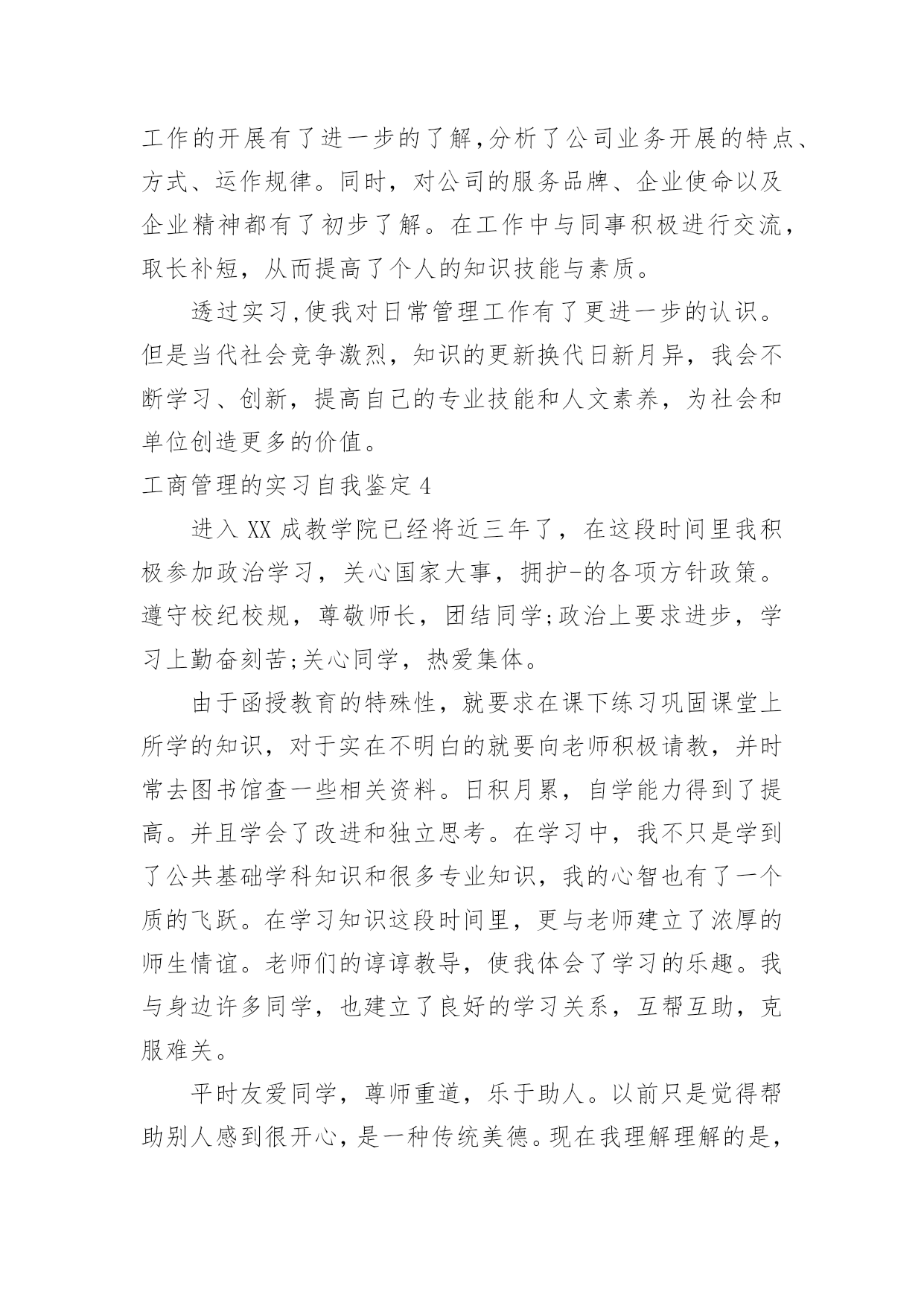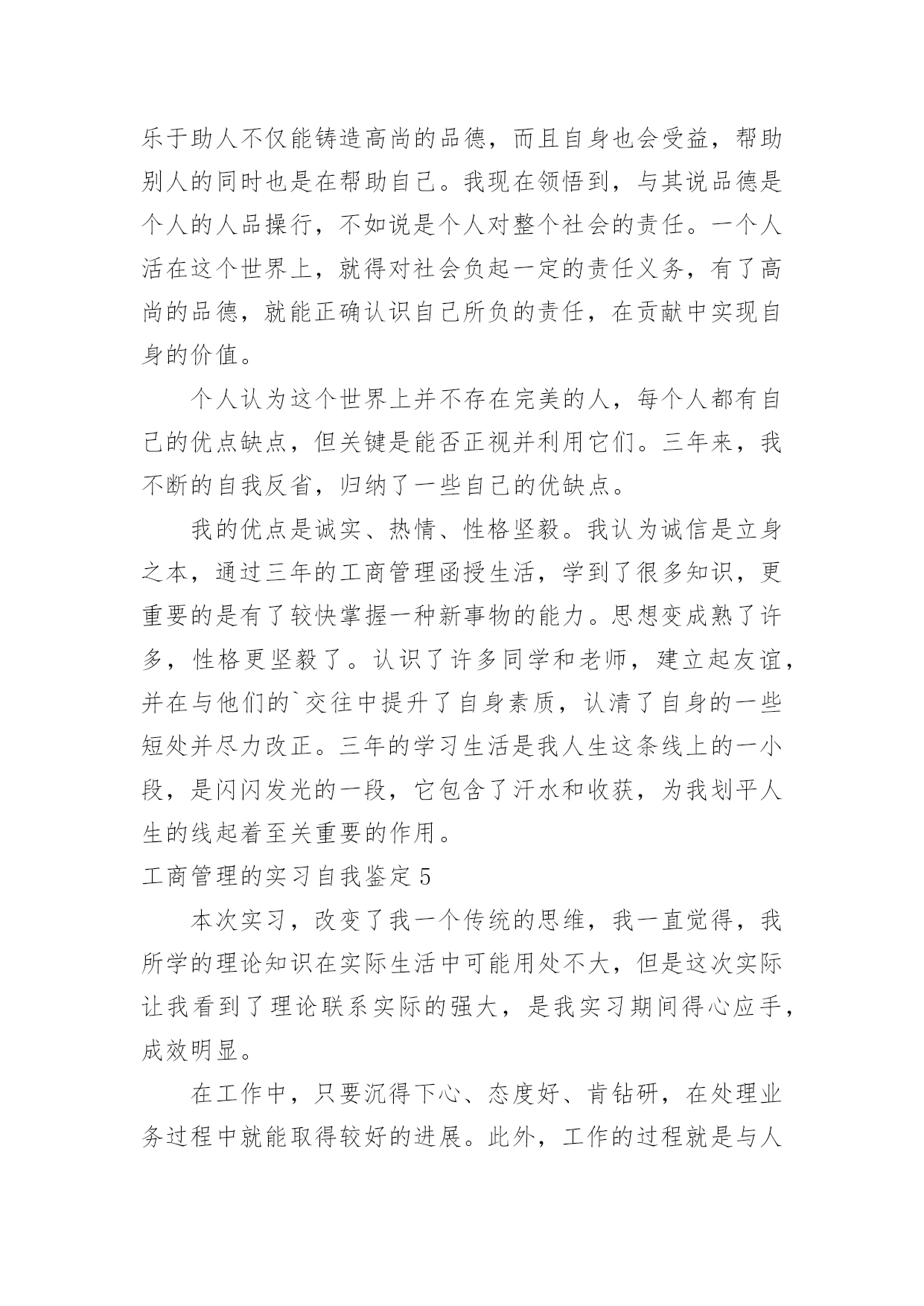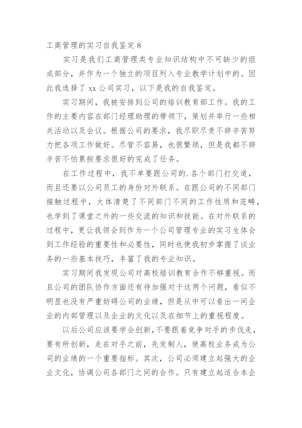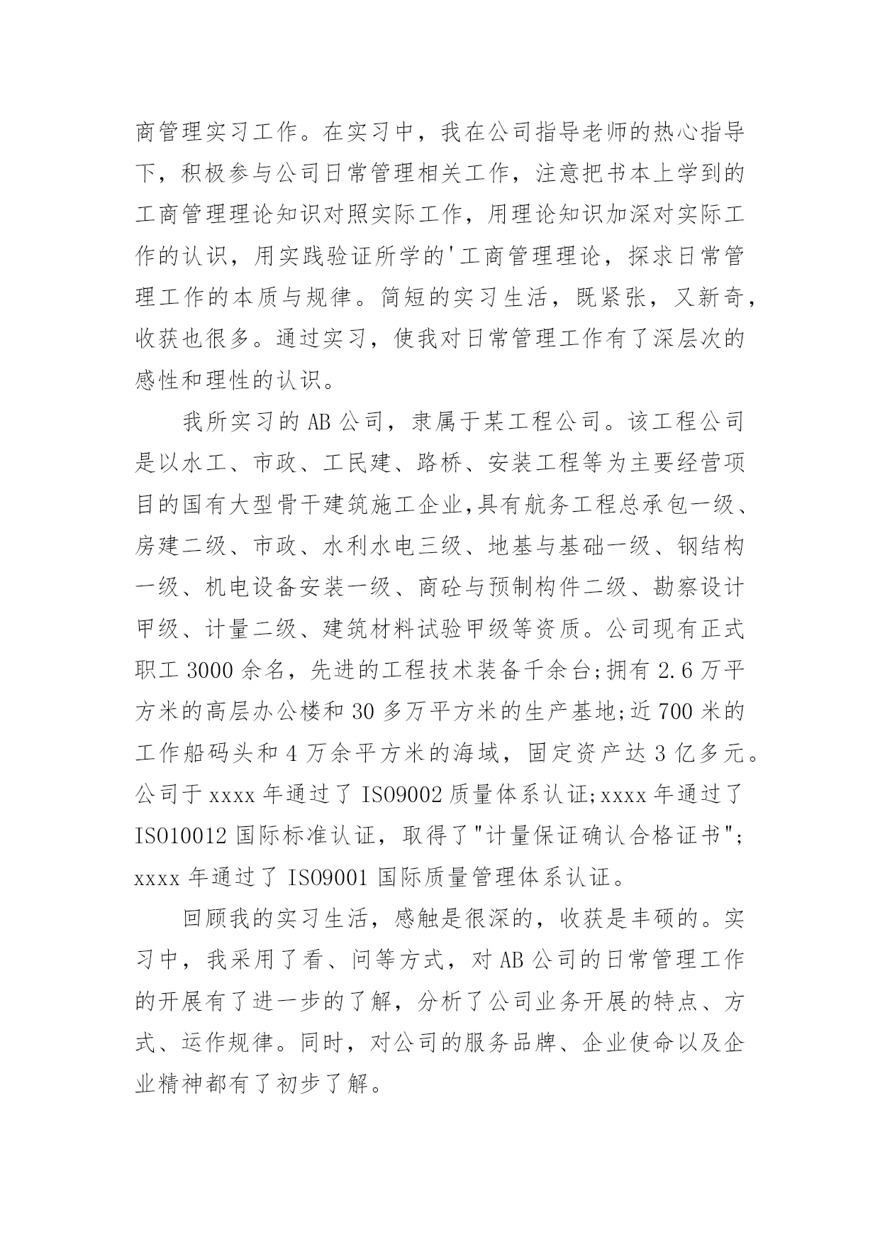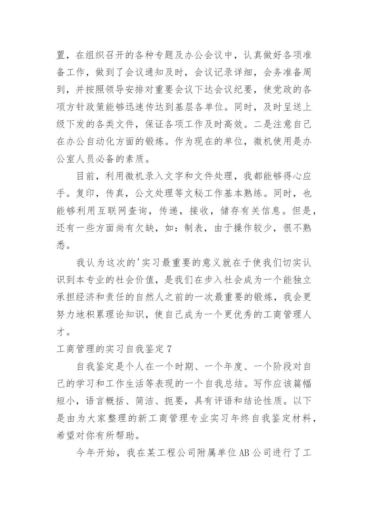 工商管理的实习自我鉴定工商管理的实习自我鉴定9篇自我鉴定就是把一个时段的个人情况进行一次全面系统的总结,自我鉴定可以提升对发现问题的能力,因此,让我们写一份自我鉴定吧。自我鉴定怎么写才不会千篇一律呢?以下是小编收集整理的工商管理的实习自我鉴定,欢迎大家分享。工商管理的实习自我鉴定1今年开始,我在某工程公司附属单位AB公司进行了工商管理实习工作。在实习中,我在公司指导老师的热心指导下,积极参与公司日常管理相关工作,注意把书本上学到的工商管理理论知识对照实际工作,用理论知识加深对实际工作的认识,用实践验证所学的工商管理理论,探求日常管理工作的本质与规律。简短的实习生活,既紧张,又新奇,收获也很多。通过实习,使我对日常管理工作有了深层次的`感性和理性的认识。我所实习的AB公司,隶属于某工程公司。该工程公司是以水工、市政、工民建、路桥、安装工程等为主要经营项目的国有大型骨干建筑施工企业,具有航务工程总承包一级、房建二级、市政、水利水电三级、地基与基础一级、钢结构一级、机电设备安装一级、商砼与预制构件二级、勘察设计甲级、计量二级、建筑材料试验甲级等资质。公司现有正式职工3000余名,先进的工程技术装备千余台;拥有2.6万平方米的高层办公楼和30多万平方米的生产基地;近700米的工作船码头和4万余平方米的海域,固定资产达3亿多元。公司于xxxx年通过了ISO9002质量体系认证;xxxx年通过了ISO10012国际标准认证,取得了"计量保证确认合格证书";xxxx年通过了ISO9001国际质量管理体系认证。回顾我的实习生活,感触是很深的,收获是丰硕的。实习中,我采用了看、问等方式,对AB公司的日常管理工作的开展有了进一步的了解,分析了公司业务开展的特点、方式、运作规律。同时,对公司的服务品牌、企业使命以及企业精神都有了初步了解。工商管理的实习自我鉴定2在实习期间,我感觉自己已经不再是一个学生。实习过程中遵守该营销团队的各项制度,虛心向有经验的同事学习,使我懂得了很多以前不知道的东西,对集团也有了更深的了解,通过了解也发现了该公司存在一些问题:(1)由于受市场竞品影响的客观因素和主观努力不够,产品市场不够稳定,使销售工作陷入被动,直接影响品牌形象;(2)公司的产品本身成为竞品,长时间的竞争导致三鹿品牌的形象降低,(3)公司对市场信息反馈不狗重视,对发展新市场影响很大;(4)公司的宣传力度不够,导致品牌形象不明显。在实习期即将告-段落的时候,回顾这几个月的实习生活,在实习的过程中,我既感到了收获的喜悦,也存有些须遗憾。主要是对企业日常经营、管理工作的某些认识还仅仅停留在表面层次,因此未能领会企业经营、管理实践的精髓,还需要以后进一步的.学习。但是,通过实习,加深了我对所学工商管理专业基本知识的本质理解,丰富了我的实际管理经验,使我对日常经营管理工作有了深层次的感性认识和理性认识,认识到:要做好日常企业管理工作,既要注重管理理论知识的学习,更重要的是把实践与理论两者紧密相结合。工商管理实习自我鉴定范文.doc下载Word文档到电脑,方便收藏和打印[全文共1890字]编辑推荐:工商管理的实习自我鉴定3在单位领导热心指导下,我积极参与公司日常管理相关工作,注意把书本上学到的工商管理理论知识对照实际工作,用理论知识加深对实际工作的认识,用实践验证所学的工商管理理论,探求日常管理工作的本质与规律。简短的.实习生活,既紧张,又新奇,收获也很多。实习中,我采用了看、问等方式,对**公司的日常管理工作的开展有了进一步的了解,分析了公司业务开展的特点、方式、运作规律。同时,对公司的服务品牌、企业使命以及企业精神都有了初步了解。在工作中与同事积极进行交流,取长补短,从而提高了个人的知识技能与素质。透过实习,使我对日常管理工作有了更进一步的认识。但是当代社会竞争激烈,知识的更新换代日新月异,我会不断学习、创新,提高自己的专业技能和人文素养,为社会和单位创造更多的价值。工商管理的实习自我鉴定4进入XX成教学院已经将近三年了,在这段时间里我积极参加政治学习,关心国家大事,拥护-的各项方针政策。遵守校纪校规,尊敬师长,团结同学;政治上要求进步,学习上勤奋刻苦;关心同学,热爱集体。由于函授教育的特殊性,就要求在课下练习巩固课堂上所学的知识,对于实在不明白的就要向老师积极请教,并时常去图书馆查一些相关资料。日积月累,自学能力得到了提高。并且学会了改进和独立思考。在学习中,我不只是学到了公共基础学科知识和很多专业知识,我的心智也有了一个质的飞跃。在学习知识这段时间里,更与老师建立了浓厚的师生情谊。老师们的谆谆教导,使我体会了学习的乐趣。我与身边许多同学,也建立了良好的学习关系,互帮互助,克服难关。平时友爱同学,尊师重道,乐于助人。以前只是觉得帮助别人感到很开心,是一种传统