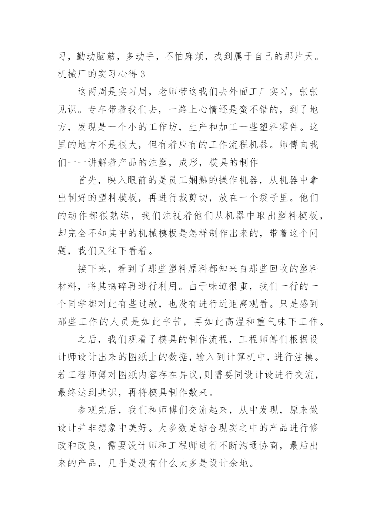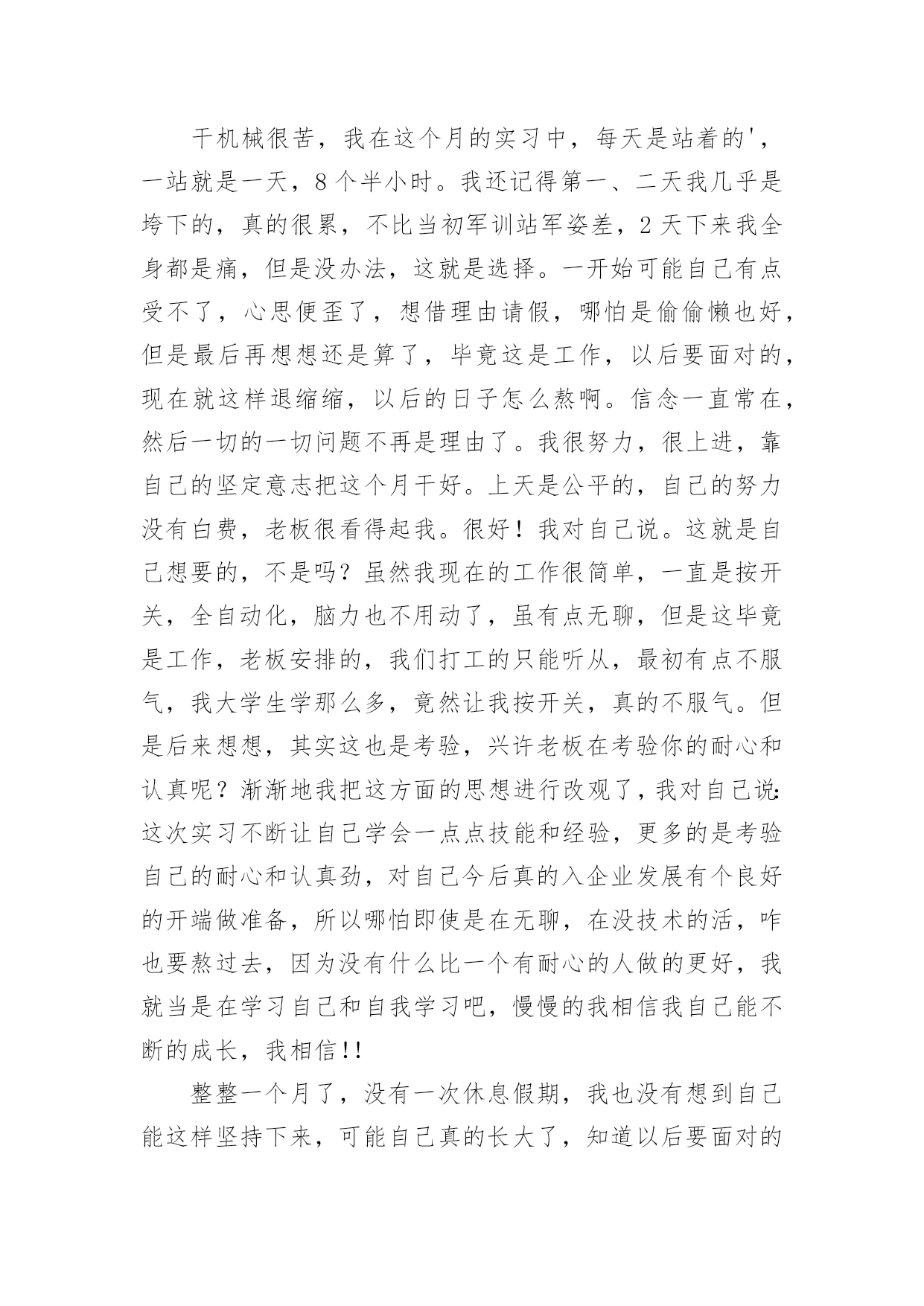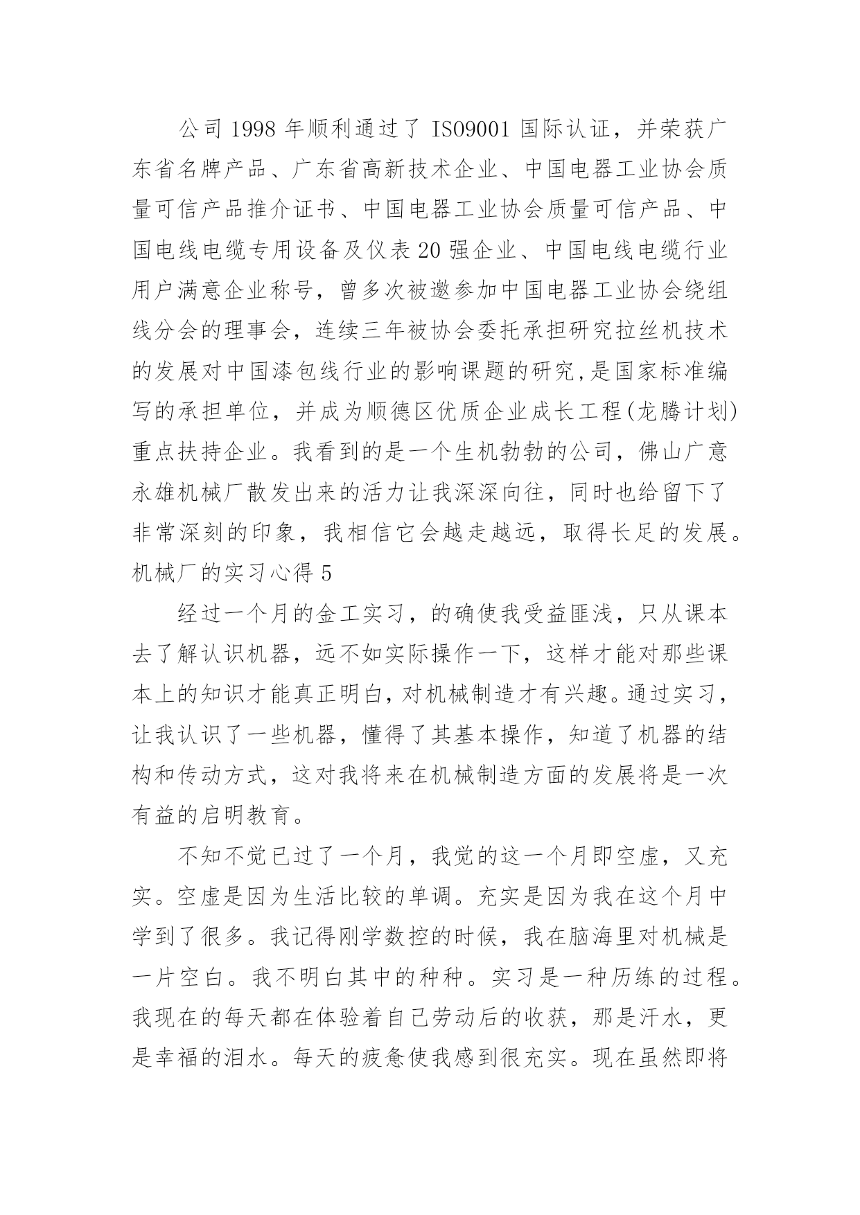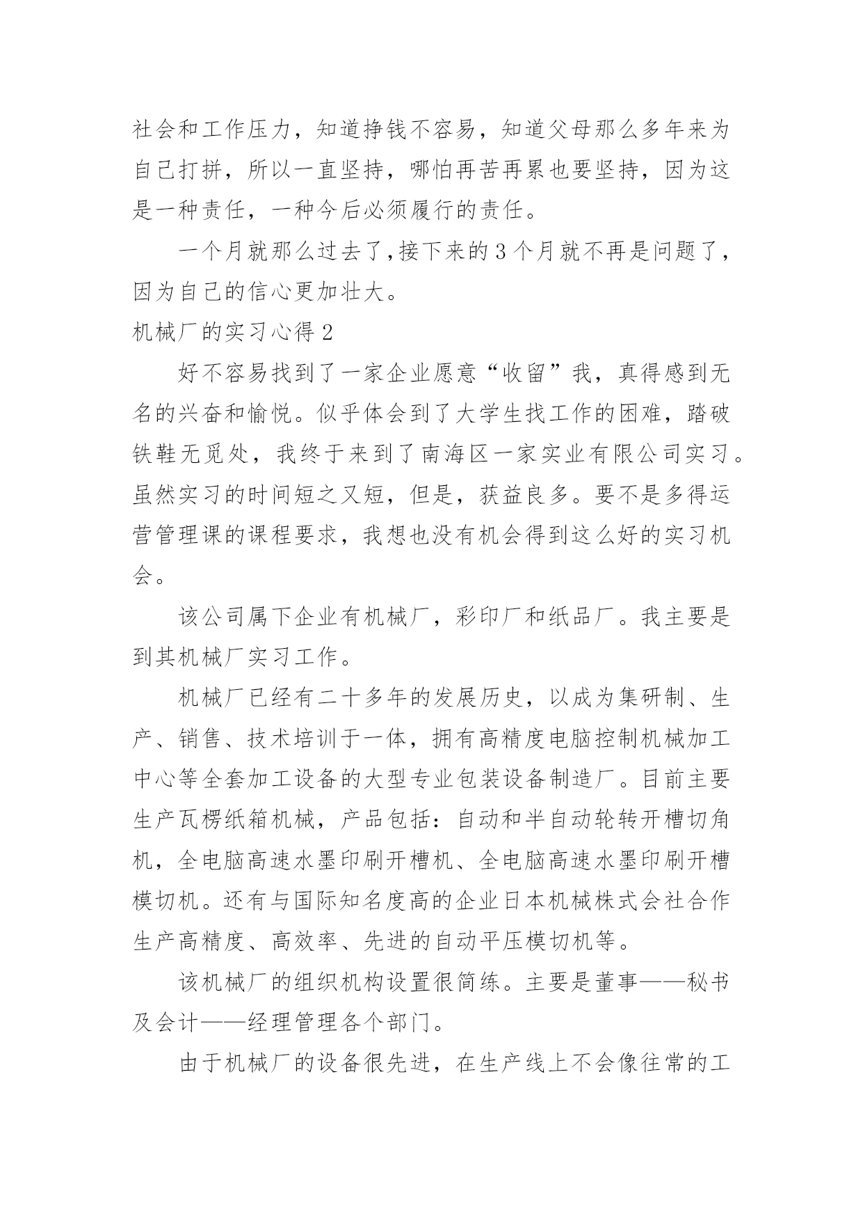 机械厂的实习心得机械厂的实习心得当我们备受启迪时,常常可以将它们写成一篇心得体会,如此就可以提升我们写作能力了。应该怎么写才合适呢?以下是小编整理的机械厂的实习心得,欢迎阅读与收藏。机械厂的实习心得1时间如流水一样竟消逝那么快,不知道不觉我在企业实习快一个月了。在这第一个月的时间里,辛酸苦辣,点点滴滴都藏在心里,过惯了学生时代的我突然自己的角色发生改变了,感觉生活的压力来了,一切的一切不再像以前那么简简单单,可能这就是真的生活吧。这次实习,我选择的单位是本镇的一家私营机械厂。在这一个月的实习中,我感受颇深,不管是作为一名学生,还是一名实习生,让我对企业的适应和自我发展有了很大的理解和提升,让我对自己在今后XX年内做了个职业规划,然后才能有信心,有目标的去朝着这个方向不断的努力发展。既然选择了这份职业,既然对其有兴趣,既然建立了目标,那么当初的选择就不再是问题了,因为自己有信心的走下去。机械在本世纪是个热门的专业,但是竞争和挑战非常的大,如果没有正确的目标和完整的思维发展观,那么走这条路永远是平平淡淡的,因为你的思想局限于此。干机械很苦,我在这个月的实习中,每天是站着的',一站就是一天,8个半小时。我还记得第一、二天我几乎是垮下的,真的很累,不比当初军训站军姿差,2天下来我全身都是痛,但是没办法,这就是选择。一开始可能自己有点受不了,心思便歪了,想借理由请假,哪怕是偷偷懒也好,但是最后再想想还是算了,毕竟这是工作,以后要面对的,现在就这样退缩缩,以后的日子怎么熬啊。信念一直常在,然后一切的一切问题不再是理由了。我很努力,很上进,靠自己的坚定意志把这个月干好。上天是公平的,自己的努力没有白费,老板很看得起我。很好!我对自己说。这就是自己想要的,不是吗?虽然我现在的工作很简单,一直是按开关,全自动化,脑力也不用动了,虽有点无聊,但是这毕竟是工作,老板安排的,我们打工的只能听从,最初有点不服气,我大学生学那么多,竟然让我按开关,真的不服气。但是后来想想,其实这也是考验,兴许老板在考验你的耐心和认真呢?渐渐地我把这方面的思想进行改观了,我对自己说:这次实习不断让自己学会一点点技能和经验,更多的是考验自己的耐心和认真劲,对自己今后真的入企业发展有个良好的开端做准备,所以哪怕即使是在无聊,在没技术的活,咋也要熬过去,因为没有什么比一个有耐心的人做的更好,我就当是在学习自己和自我学习吧,慢慢的我相信我自己能不断的成长,我相信!!整整一个月了,没有一次休息假期,我也没有想到自己能这样坚持下来,可能自己真的长大了,知道以后要面对的社会和工作压力,知道挣钱不容易,知道父母那么多年来为自己打拼,所以一直坚持,哪怕再苦再累也要坚持,因为这是一种责任,一种今后必须履行的责任。一个月就那么过去了,接下来的3个月就不再是问题了,因为自己的信心更加壮大。机械厂的实习心得2好不容易找到了一家企业愿意“收留”我,真得感到无名的兴奋和愉悦。似乎体会到了大学生找工作的困难,踏破铁鞋无觅处,我终于来到了南海区一家实业有限公司实习。虽然实习的时间短之又短,但是,获益良多。要不是多得运营管理课的课程要求,我想也没有机会得到这么好的实习机会。该公司属下企业有机械厂,彩印厂和纸品厂。我主要是到其机械厂实习工作。机械厂已经有二十多年的发展历史,以成为集研制、生产、销售、技术培训于一体,拥有高精度电脑控制机械加工中心等全套加工设备的大型专业包装设备制造厂。目前主要生产瓦楞纸箱机械,产品包括:自动和半自动轮转开槽切角机,全电脑高速水墨印刷开槽机、全电脑高速水墨印刷开槽模切机。还有与国际知名度高的企业日本机械株式会社合作生产高精度、高效率、先进的自动平压模切机等。该机械厂的组织机构设置很简练。主要是董事——秘书及会计——经理管理各个部门。由于机械厂的设备很先进,在生产线上不会像往常的工厂那样满布工人,主要是某一两个人负责工作流程。这对我了解该工厂的生产流程提供了方便。该厂生产的纸箱机械的需求量很稳定,是属于定单供货型的生产。由于产品的质量要求和技术含量要求都很高,因此,生产周期也比较长,单次产品需求的数量也不大。同时,每台产品的价格非常昂贵,在万元以上。生产部门主要包括,采购,技术,生产,供应,销售。我被安排在供应部工作。但其工作并不是坐在办公室悠闲地写写东西,而是跟住部长随处跑,跑车间,甚至到外面去跑业务。实习期间,刚好该厂正赶货,是与合作的日本企业的定单。生产进行得如火如荼。我在跟随供应部人员工作的时候,方才发现,供应这部门,在企业中极其重要。首先,供应部必须与往来企业打好交道。企业的供应部与下游企业的沟通好与坏,直接影响产品的最终销售。他直接影响企业生产运作系统运行,是“保证企业产品质量、价格、交货期和服务的关键因素之一”。我趁供应部的部长一有空,便向她问了很多很多的问题。她