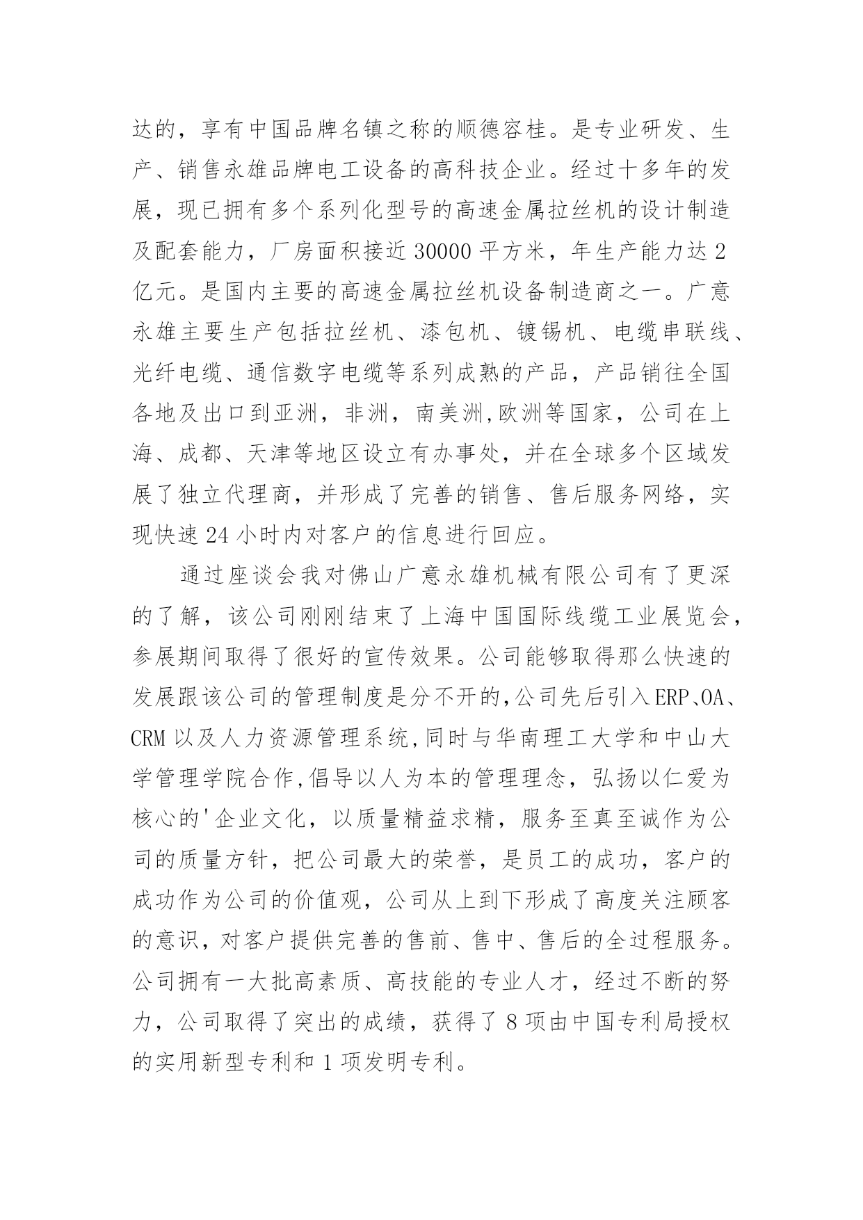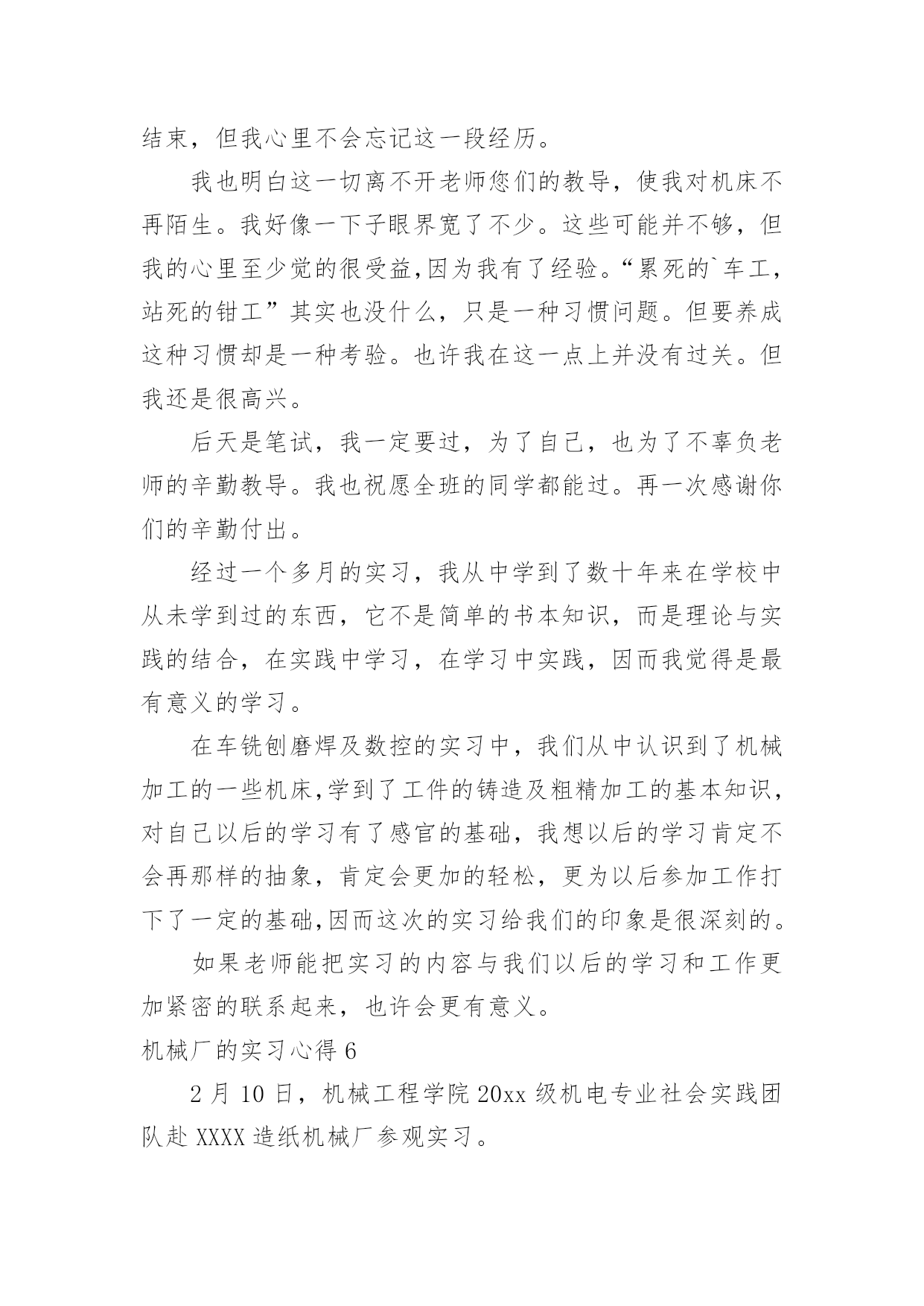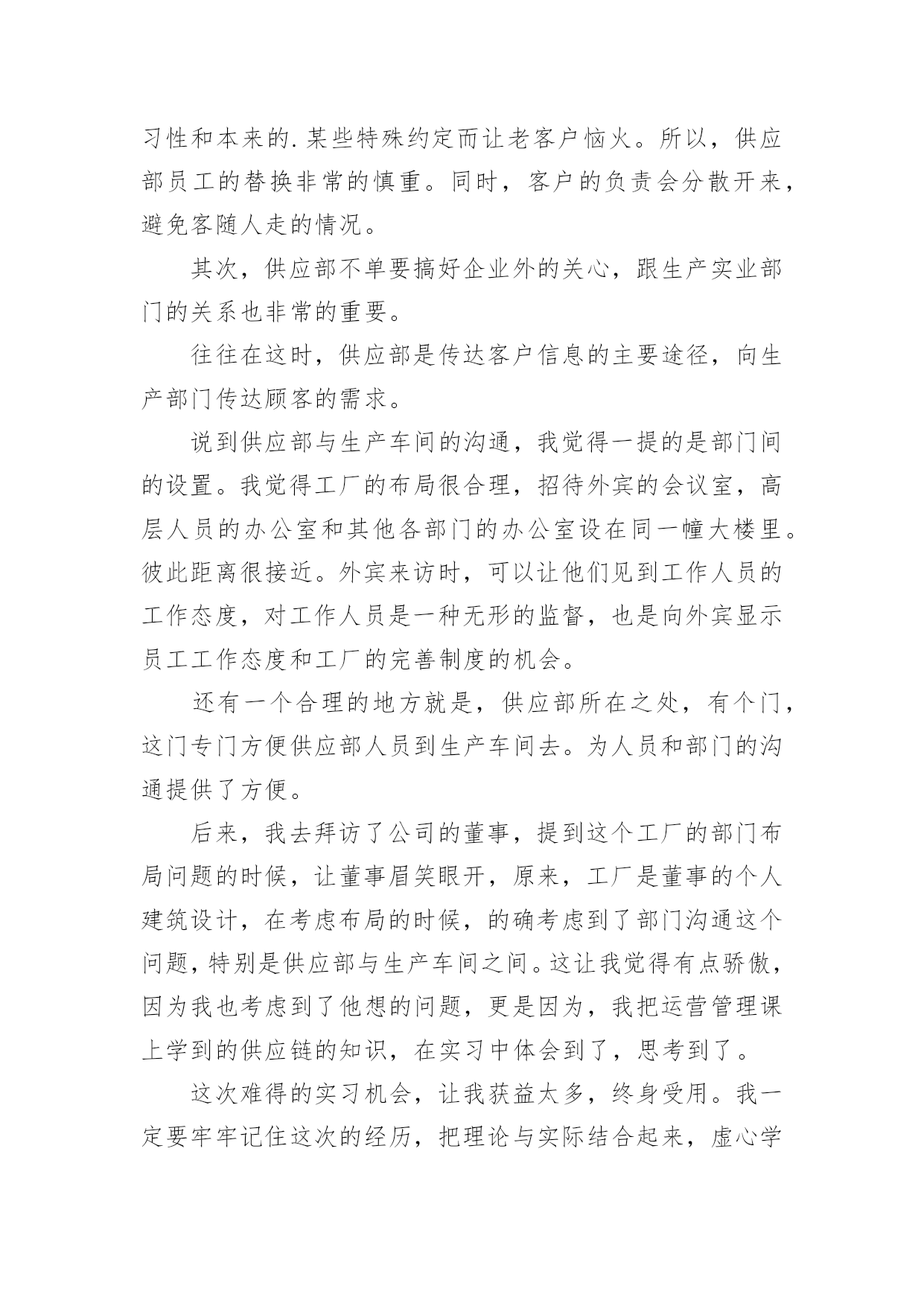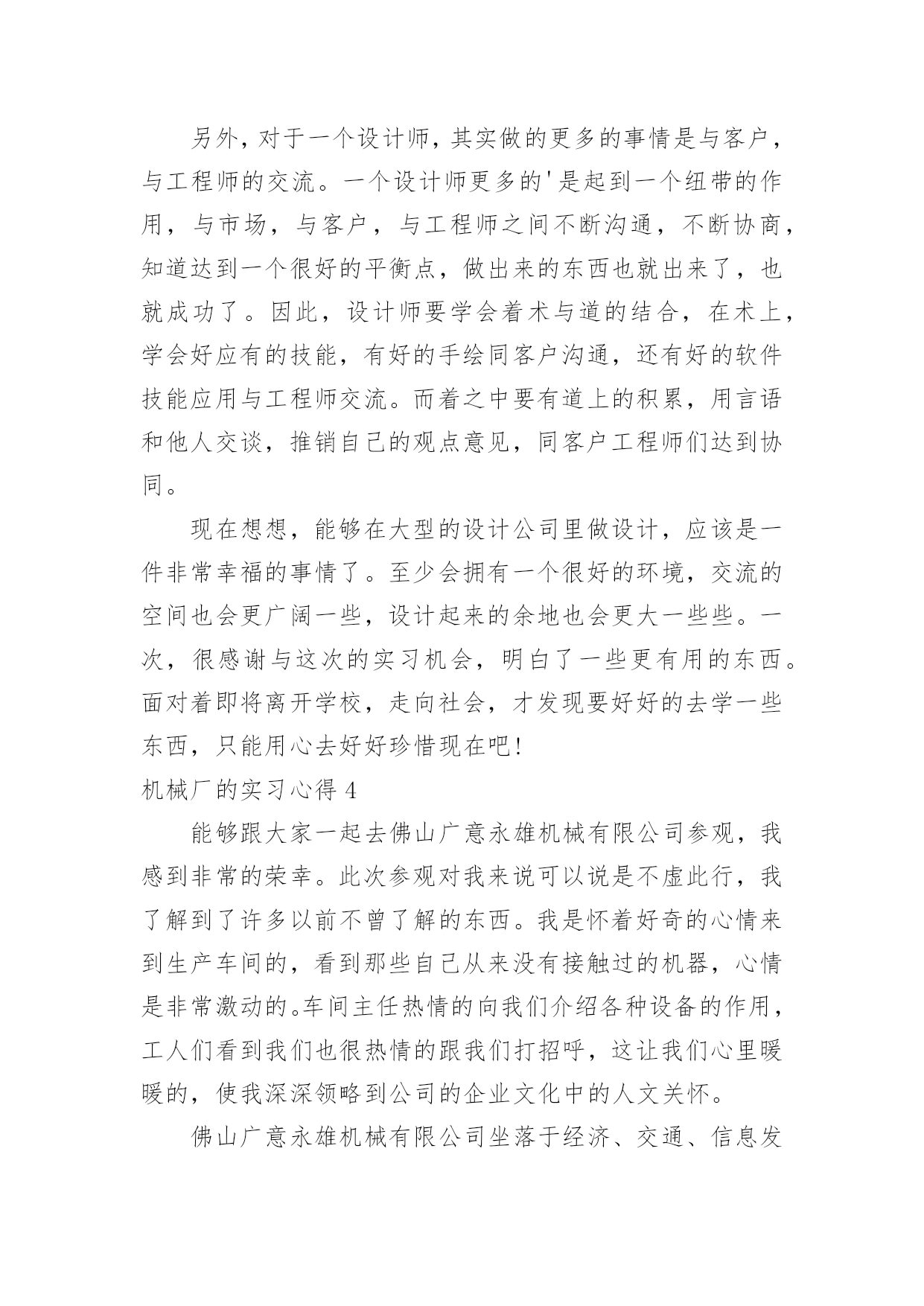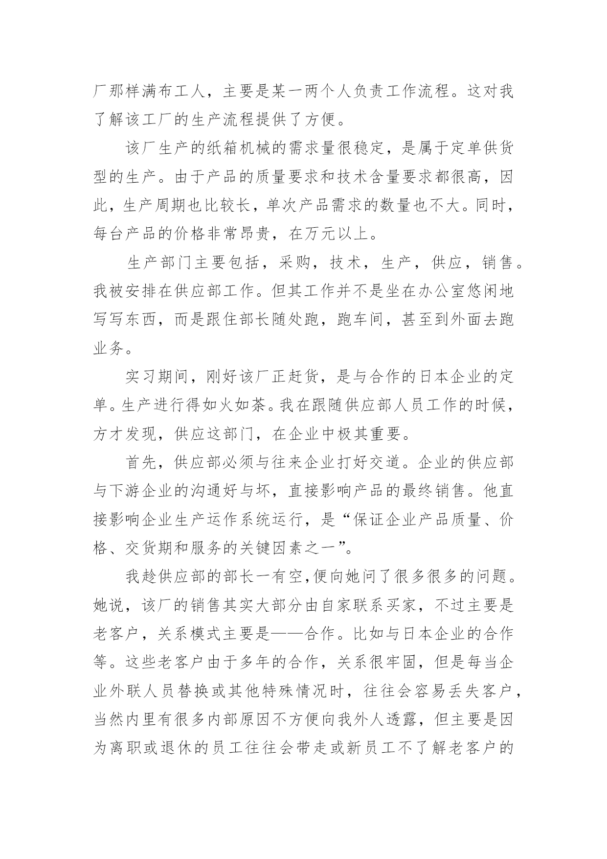 机械厂的实习心得机械厂的实习心得当我们备受启迪时,常常可以将它们写成一篇心得体会,如此就可以提升我们写作能力了。应该怎么写才合适呢?以下是小编整理的机械厂的实习心得,欢迎阅读与收藏。机械厂的实习心得1时间如流水一样竟消逝那么快,不知道不觉我在企业实习快一个月了。在这第一个月的时间里,辛酸苦辣,点点滴滴都藏在心里,过惯了学生时代的我突然自己的角色发生改变了,感觉生活的压力来了,一切的一切不再像以前那么简简单单,可能这就是真的生活吧。这次实习,我选择的单位是本镇的一家私营机械厂。在这一个月的实习中,我感受颇深,不管是作为一名学生,还是一名实习生,让我对企业的适应和自我发展有了很大的理解和提升,让我对自己在今后XX年内做了个职业规划,然后才能有信心,有目标的去朝着这个方向不断的努力发展。既然选择了这份职业,既然对其有兴趣,既然建立了目标,那么当初的选择就不再是问题了,因为自己有信心的走下去。机械在本世纪是个热门的专业,但是竞争和挑战非常的大,如果没有正确的目标和完整的思维发展观,那么走这条路永远是平平淡淡的,因为你的思想局限于此。干机械很苦,我在这个月的实习中,每天是站着的',一站就是一天,8个半小时。我还记得第一、二天我几乎是垮下的,真的很累,不比当初军训站军姿差,2天下来我全身都是痛,但是没办法,这就是选择。一开始可能自己有点受不了,心思便歪了,想借理由请假,哪怕是偷偷懒也好,但是最后再想想还是算了,毕竟这是工作,以后要面对的,现在就这样退缩缩,以后的日子怎么熬啊。信念一直常在,然后一切的一切问题不再是理由了。我很努力,很上进,靠自己的坚定意志把这个月干好。上天是公平的,自己的努力没有白费,老板很看得起我。很好!我对自己说。这就是自己想要的,不是吗?虽然我现在的工作很简单,一直是按开关,全自动化,脑力也不用动了,虽有点无聊,但是这毕竟是工作,老板安排的,我们打工的只能听从,最初有点不服气,我大学生学那么多,竟然让我按开关,真的不服气。但是后来想想,其实这也是考验,兴许老板在考验你的耐心和认真呢?渐渐地我把这方面的思想进行改观了,我对自己说:这次实习不断让自己学会一点点技能和经验,更多的是考验自己的耐心和认真劲,对自己今后真的入企业发展有个良好的开端做准备,所以哪怕即使是在无聊,在没技术的活,咋也要熬过去,因为没有什么比一个有耐心的人做的更好,我就当是在学习自己和自我学习吧,慢慢的我相信我自己能不断的成长,我相信!!整整一个月了,没有一次休息假期,我也没有想到自己能这样坚持下来,可能自己真的长大了,知道以后要面对的社会和工作压力,知道挣钱不容易,知道父母那么多年来为自己打拼,所以一直坚持,哪怕再苦再累也要坚持,因为这是一种责任,一种今后必须履行的责任。一个月就那么过去了,接下来的3个月就不再是问题了,因为自己的信心更加壮大。机械厂的实习心得2好不容易找到了一家企业愿意“收留”我,真得感到无名的兴奋和愉悦。似乎体会到了大学生找工作的困难,踏破铁鞋无觅处,我终于来到了南海区一家实业有限公司实习。虽然实习的时间短之又短,但是,获益良多。要不是多得运营管理课的课程要求,我想也没有机会得到这么好的实习机会。该公司属下企业有机械厂,彩印厂和纸品厂。我主要是到其机械厂实习工作。机械厂已经有二十多年的发展历史,以成为集研制、生产、销售、技术培训于一体,拥有高精度电脑控制机械加工中心等全套加工设备的大型专业包装设备制造厂。目前主要生产瓦楞纸箱机械,产品包括:自动和半自动轮转开槽切角机,全电脑高速水墨印刷开槽机、全电脑高速水墨印刷开槽模切机。还有与国际知名度高的企业日本机械株式会社合作生产高精度、高效率、先进的自动平压模切机等。该机械厂的组织机构设置很简练。主要是董事——秘书及会计——经理管理各个部门。由于机械厂的设备很先进,在生产线上不会像往常的工厂那样满布工人,主要是某一两个人负责工作流程。这对我了解该工厂的生产流程提供了方便。该厂生产的纸箱机械的需求量很稳定,是属于定单供货型的生产。由于产品的质量要求和技术含量要求都很高,因此,生产周期也比较长,单次产品需求的数量也不大。同时,每台产品的价格非常昂贵,在万元以上。生产部门主要包括,采购,技术,生产,供应,销售。我被安排在供应部工作。但其工作并不是坐在办公室悠闲地写写东西,而是跟住部长随处跑,跑车间,甚至到外面去跑业务。实习期间,刚好该厂正赶货,是与合作的日本企业的定单。生产进行得如火如荼。我在跟随供应部人员工作的时候,方才发现,供应这部门,在企业中极其重要。首先,供应部必须与往来企业打好交道。企业的供应部与下游企业的沟通好与坏,直接影响产品的最终销售。他直接影响企业生产运作系统运行,是“保证企业产品质量、价格、交货期和服务的关键因素之一”。我趁供应部的部长一有空,便向她问了很多很多的问题。她