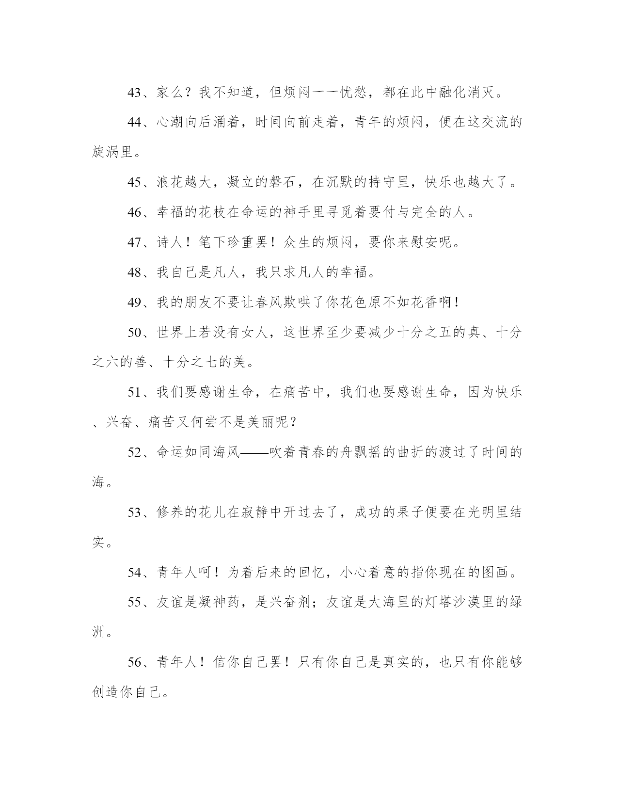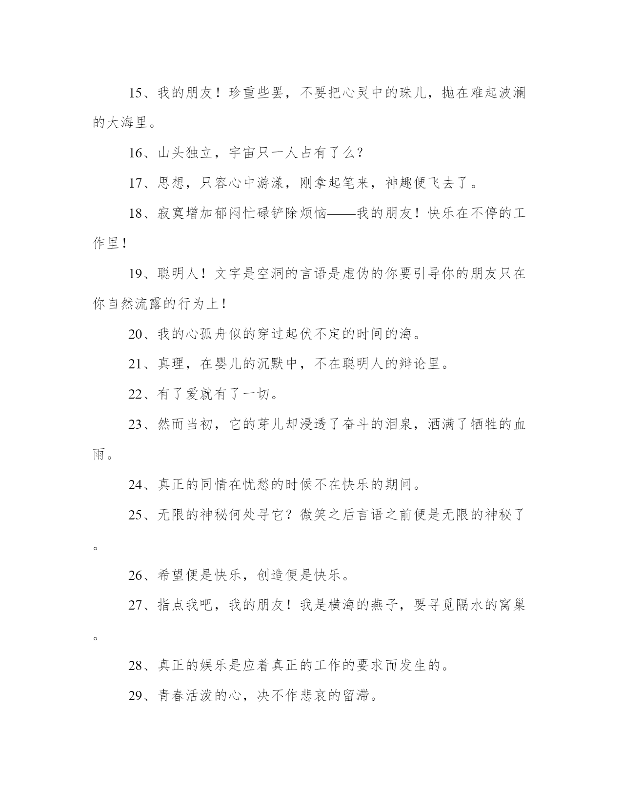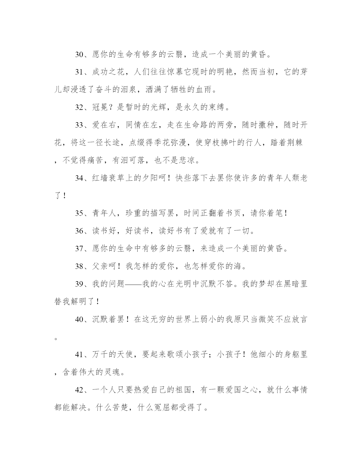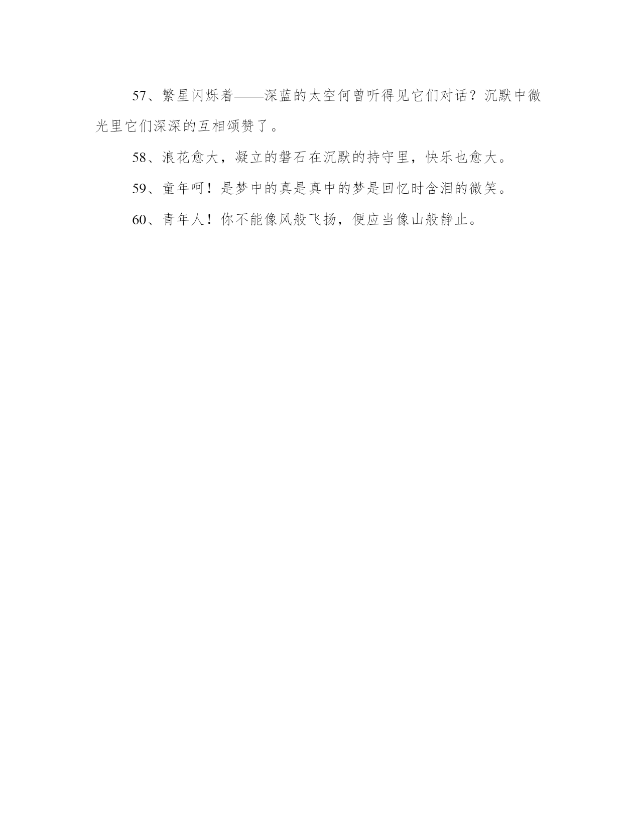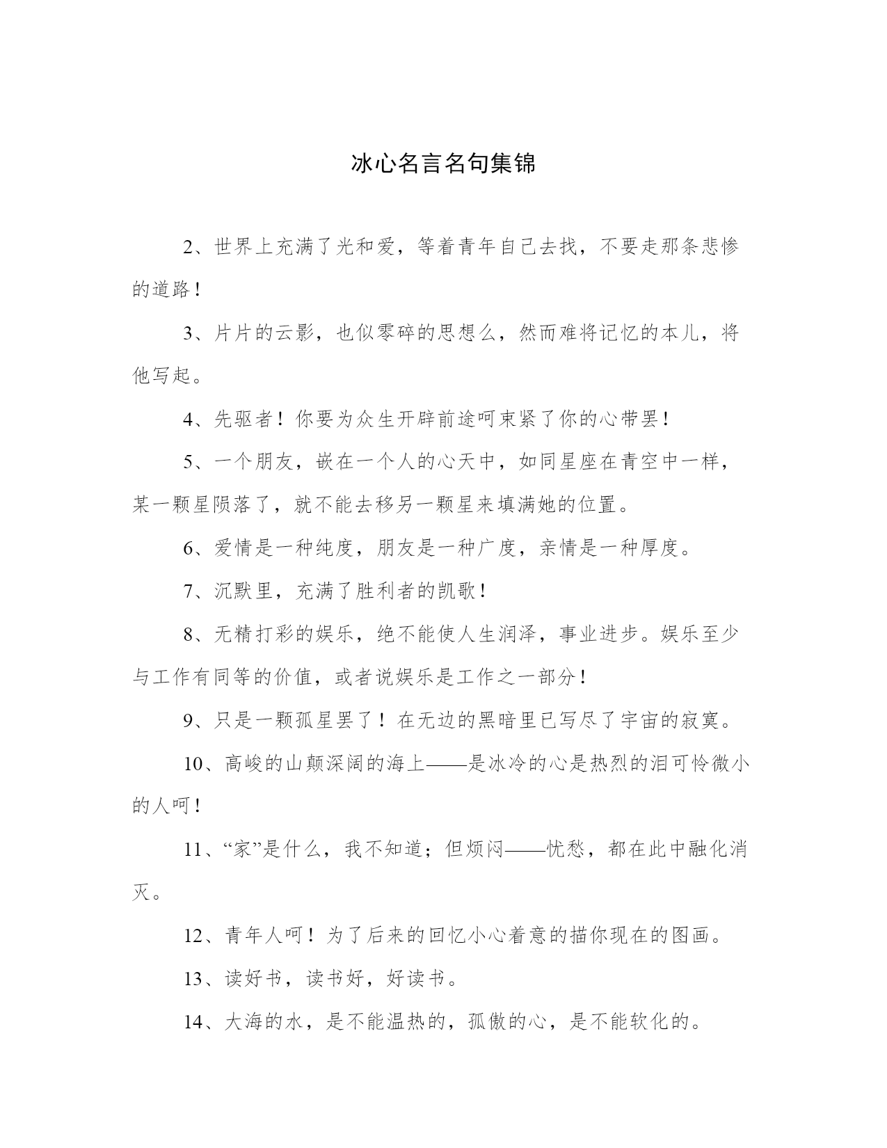 冰心名言名句集锦2、世界上充满了光和爱,等着青年自己去找,不要走那条悲惨的道路!3、片片的云影,也似零碎的思想么,然而难将记忆的本儿,将他写起。4、先驱者!你要为众生开辟前途呵束紧了你的心带罢!5、一个朋友,嵌在一个人的心天中,如同星座在青空中一样,某一颗星陨落了,就不能去移另一颗星来填满她的位置。6、爱情是一种纯度,朋友是一种广度,亲情是一种厚度。7、沉默里,充满了胜利者的凯歌!8、无精打彩的娱乐,绝不能使人生润泽,事业进步。娱乐至少与工作有同等的价值,或者说娱乐是工作之一部分!9、只是一颗孤星罢了!在无边的黑暗里已写尽了宇宙的寂寞。10、高峻的山颠深阔的海上——是冰冷的心是热烈的泪可怜微小的人呵!11、“家”是什么,我不知道;但烦闷——忧愁,都在此中融化消灭。12、青年人呵!为了后来的回忆小心着意的描你现在的图画。13、读好书,读书好,好读书。14、大海的水,是不能温热的,孤傲的心,是不能软化的。15、我的朋友!珍重些罢,不要把心灵中的珠儿,抛在难起波澜的大海里。16、山头独立,宇宙只一人占有了么?17、思想,只容心中游漾,刚拿起笔来,神趣便飞去了。18、寂寞增加郁闷忙碌铲除烦恼——我的朋友!快乐在不停的工作里!19、聪明人!文字是空洞的言语是虚伪的你要引导你的朋友只在你自然流露的行为上!20、我的心孤舟似的穿过起伏不定的时间的海。21、真理,在婴儿的沉默中,不在聪明人的辩论里。22、有了爱就有了一切。23、然而当初,它的芽儿却浸透了奋斗的泪泉,洒满了牺牲的血雨。24、真正的同情在忧愁的时候不在快乐的期间。25、无限的神秘何处寻它?微笑之后言语之前便是无限的神秘了。26、希望便是快乐,创造便是快乐。27、指点我吧,我的朋友!我是横海的燕子,要寻觅隔水的窝巢。28、真正的娱乐是应着真正的工作的要求而发生的。29、青春活泼的心,决不作悲哀的留滞。30、愿你的生命有够多的云翳,造成一个美丽的黄昏。31、成功之花,人们往往惊慕它现时的明艳,然而当初,它的芽儿却浸透了奋斗的泪泉,洒满了牺牲的血雨。32、冠冕?是暂时的光辉,是永久的束缚。33、爱在右,同情在左,走在生命路的两旁,随时撒种,随时开花,将这一径长途,点缀得季花弥漫,使穿枝拂叶的行人,踏着荆棘,不觉得痛苦,有泪可落,也不是悲凉。34、红墙衰草上的夕阳呵!快些落下去罢你使许多的青年人颓老了!35、青年人,珍重的描写罢,时间正翻着书页,请你着笔!36、读书好,好读书,读好书有了爱就有了一切。37、愿你的生命中有够多的云翳,来造成一个美丽的黄昏。38、父亲呵!我怎样的爱你,也怎样爱你的海。39、我的问题——我的心在光明中沉默不答。我的梦却在黑暗里替我解明了!40、沉默着罢!在这无穷的世界上弱小的我原只当微笑不应放言。41、万千的天使,要起来歌颂小孩子;小孩子!他细小的身躯里,含着伟大的灵魂。42、一个人只要热爱自己的祖国,有一颗爱国之心,就什么事情都能解决。什么苦楚,什么冤屈都受得了。43、家么?我不知道,但烦闷一一忧愁,都在此中融化消灭。44、心潮向后涌着,时间向前走着,青年的烦闷,便在这交流的旋涡里。45、浪花越大,凝立的磐石,在沉默的持守里,快乐也越大了。46、幸福的花枝在命运的神手里寻觅着要付与完全的人。47、诗人!笔下珍重罢!众生的烦闷,要你来慰安呢。48、我自己是凡人,我只求凡人的幸福。49、我的朋友不要让春风欺哄了你花色原不如花香啊!50、世界上若没有女人,这世界至少要减少十分之五的真、十分之六的善、十分之七的美。51、我们要感谢生命,在痛苦中,我们也要感谢生命,因为快乐、兴奋、痛苦又何尝不是美丽呢?52、命运如同海风——吹着青春的舟飘摇的曲折的渡过了时间的海。53、修养的花儿在寂静中开过去了,成功的果子便要在光明里结实。54、青年人呵!为着后来的回忆,小心着意的指你现在的图画。55、友谊是凝神药,是兴奋剂;友谊是大海里的灯塔沙漠里的绿洲。56、青年人!信你自己罢!只有你自己是真实的,也只有你能够创造你自己。57、繁星闪烁着——深蓝的太空何曾听得见它们对话?沉默中微光里它们深深的互相颂赞了。58、浪花愈大,凝立的磐石在沉默的持守里,快乐也愈大。59、童年呵!是梦中的真是真中的梦是回忆时含泪的微笑。60、青年人!你不能像风般飞扬,便应当像山般静止。