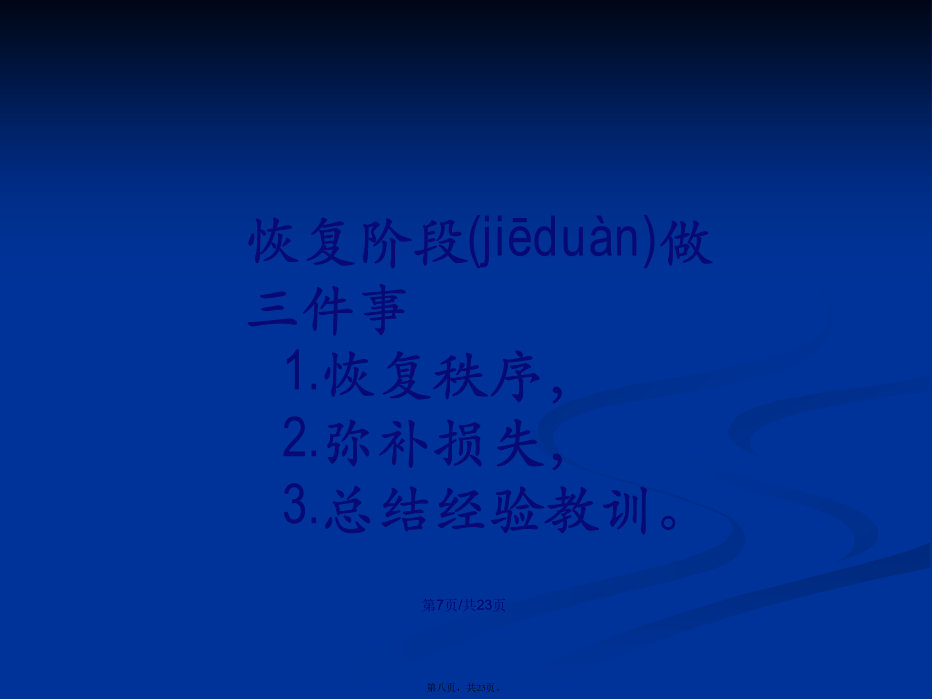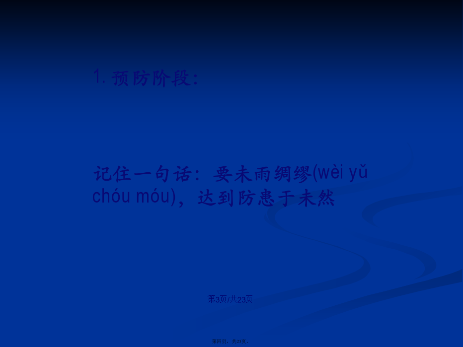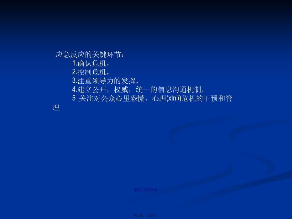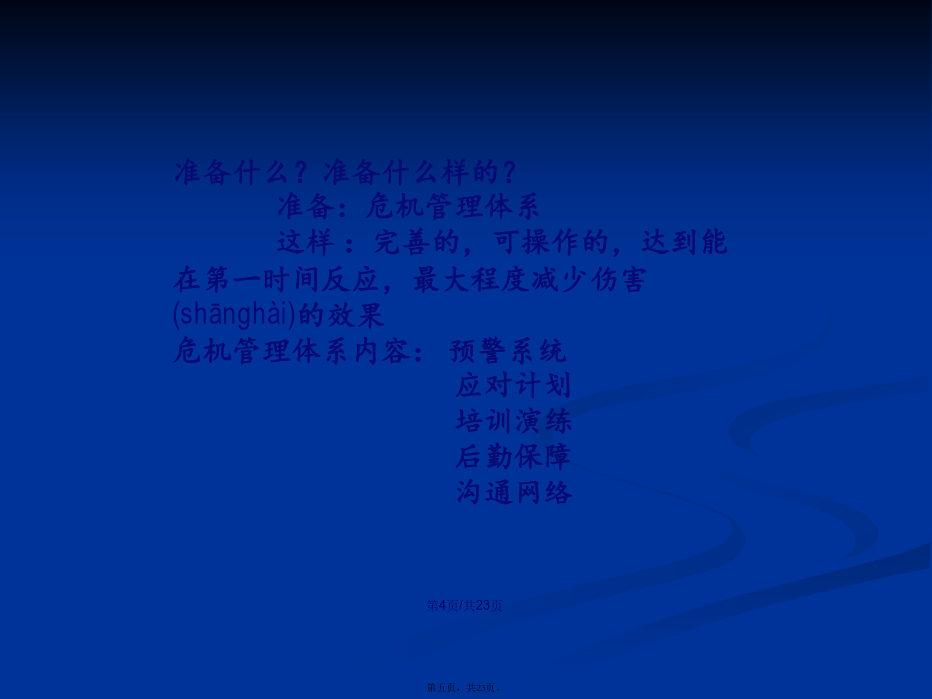 会计学1.预防阶段:记住一句话:要未雨绸缪(wèiyǔchóumóu),达到防患于未然准备什么?准备什么样的?准备:危机管理体系这样:完善的,可操作的,达到能在第一时间反应,最大程度减少伤害(shānghài)的效果危机管理体系内容:预警系统应对计划培训演练后勤保障沟通网络3.反应阶段(应急反应)形式:预防性反应(危机爆发前)以风险(fēngxiǎn)为靶向的反应(有苗头时),被动反应(正在进行)主动反应(之后)影响反应质量的关键因素反应意愿反应准备情况反应的能力应急反应的关键环节:1.确认危机,2.控制危机,3.注重领导力的发挥,4.建立公开,权威,统一的信息沟通机制,5.关注对公众心里恐慌,心理(xīnlǐ)危机的干预和管理恢复阶段(jiēduàn)做三件事1.恢复秩序,2.弥补损失,3.总结经验教训。风险管理风险:指导致负面效应的某一因素或者(huòzhě)给人们健康和安全造成潜在的损失和危险的可能性。风险管理过程(guòchéng)一、强调事前管理。二、数量化佐证以衡量风险程度。三、预设最坏的情境。四、模拟(mónǐ)评估。五、弹性化调整。风险分析(fēnxī)主要研究方法危机(wēijī)沟通应急(yìngjí)沟通的基本形式是什么?外部和内部沟通应急(yìngjí)沟通的原则是什么?1.提早准备,迅速行动,及时主动2.真实准确,信息一致(四)突发事件不同阶段(jiēduàn)(五个阶段(jiēduàn))的应急沟通准备,初始,持续,平息,总结五个阶段(jiēduàn)(具体内容看书上的P334,表18-4)(五)实现有效(yǒuxiào)应急沟通的策略(四)卫生应急(yìngjí)核心能力评价工具与方法
