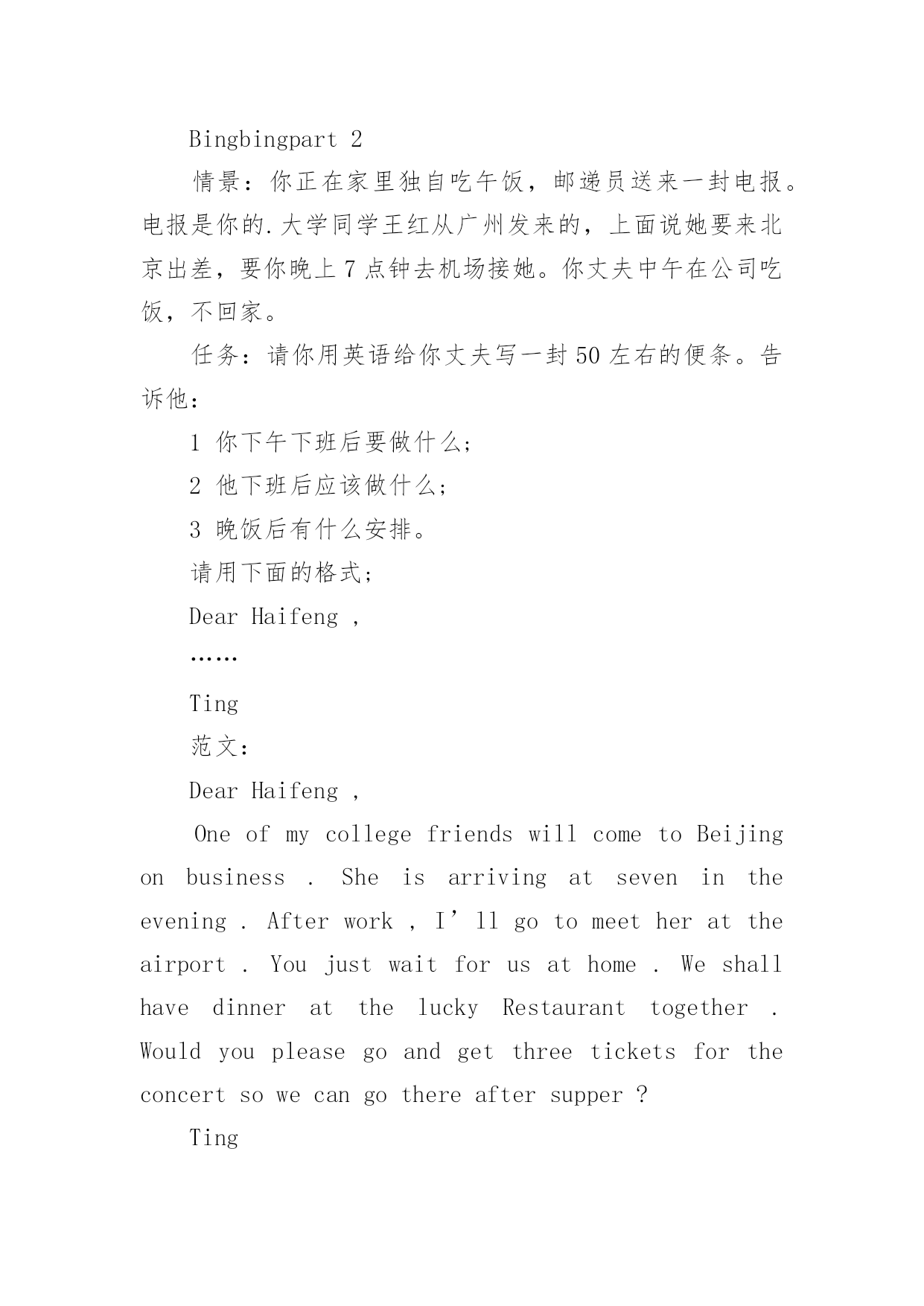 公共英语pets一级情景写作公共英语pets一级情景写作范文Bingbingpart1情景:班里来了一名新同学,学习跟不上。作为班长你要主动帮他补课,放学时,你请同学给父母带一张便条。任务:请你用英语给父母写一封50左右的便条。告诉他们:1为什么今天回家会晚一些;2大约补多长时间的课;3什么时候到家。请用下面格式:Dearmumanddad,……Bingbing范文:Dearmumanddad,I’mafraidIhavetogohomelatetoday,becausewehaveanewclassmate.HeisverypoorinmathsandEnglish,soIneedtohelphimtocatchupwiththeclassafterschool.Wewillstayatschoolforaboutanhour.Iwillgethomeataboutsix.Bingbingpart2情景:你正在家里独自吃午饭,邮递员送来一封电报。电报是你的.大学同学王红从广州发来的,上面说她要来北京出差,要你晚上7点钟去机场接她。你丈夫中午在公司吃饭,不回家。任务:请你用英语给你丈夫写一封50左右的便条。告诉他:1你下午下班后要做什么;2他下班后应该做什么;3晚饭后有什么安排。请用下面的格式;DearHaifeng,……Ting范文:DearHaifeng,OneofmycollegefriendswillcometoBeijingonbusiness.Sheisarrivingatsevenintheevening.Afterwork,I’llgotomeetherattheairport.Youjustwaitforusathome.WeshallhavedinnerattheluckyRestauranttogether.Wouldyoupleasegoandgetthreeticketsfortheconcertsowecangothereaftersupper?Ting