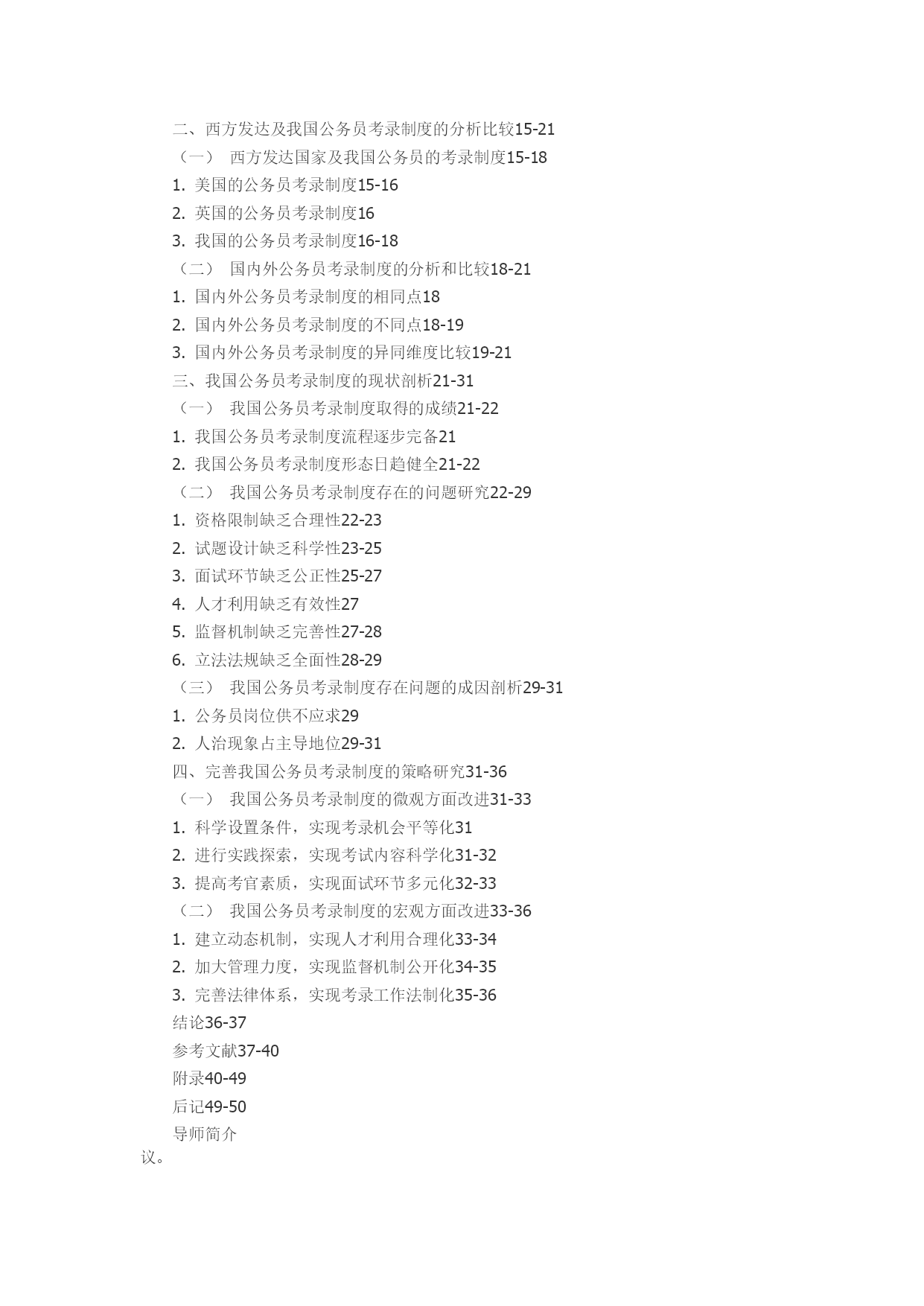 【摘要】:公务员考录制度是国家公务员制度的入口环节,是公务员制度的重要组成部分,这一制度很大程度上决定了政府部门是否能够录用到符合要求的人才。公务员考录制度的原则、程序和方法等对于整个公务员制度的建构、巩固、发展、完善和创新都具有指导性的意义。健全、合理、科学的公务员考录制度,可以为国家选拔优秀的人才,从而提高政府的行政效能,但是如果公务员考录制度不健全,将会造成政府机构效能低下。因此,完善公务员考录制度对整个公务员制度有着举足轻重的作用和意义。我国自1994年正式建立公务员考录制度至今已经十六年,在这期间全国的省、市、自治区都开始以考试的形式录用公务员,坚持凡进必考,真正为国家选拔出了优秀人才,而且以考试的形式录用公务员对促进我国行政管理体制的完善,也产生了不可估量的作用。但是由于我国的公务员考录制度起步较晚,而且发展速度又较快,我国公务员考试录用在实践中也出现了一些问题。本文在阐述我国公务员考录制度概念的基础上,着眼于考试录用制度的实施现状,分析了公务员考录制度存在的问题,并提出完善建议。本论文一共包括六个部分:第一部分为引言,介绍本文选题的背景和意义、国内外研究现状及本文的研究方法和论文的主要内容;第二部分为公务员考录制度概述。分别阐述了国家公务员、国家公务员制度和公务员考录制度的定义;第三部分为西方发达国家公务员考录制度与我国公务员考录制度的分析比较,首先主要介绍了美、英两国的公务员考录制度,其次详细的阐述了我国公务员考录制度的适用范围、基本原则、录用的方法和内容、标准、程序以及考试录用的主管部门,然后对三国的公务员考录制度进行比较分析;第四部分描述了公务员考录制度的实施现状。首先,具体的介绍了我国实施公务员考录制度后取得的成绩,其次归纳概括了我国公务员考录制度存在的问题,并且对我国公务员考录制度存在问题的成因进行剖析;第五部分提出完善我国公务员考录制度的建议,分别从我国公务员考录制度所面临的实际问题的两个方面,即微观方面和宏观方面,提出完善我国公务员考录制度的策略;第六部分为结论。总之,建设和完善我国公务员考录制度依然任重道远,而且需要解决的问题和涉及的方面还很多。笔者希望能够通过本文的阐述给我国公务员考试录用的管理体制的改革提出一些可行的意见和建中文摘要3-5英文摘要5-9引言9-13(一)研究背景及意义91.研究背景92.研究意义9(二)国内外研究现状9-111.国外研究现状9-102.国内研究现状10-11(三)研究方法11-12(四)学位论文的主要内容12-13一、国家公务员考录制度概述13-15(一)国家公务员的概念13-14(二)国家公务员制度的概念14(三)国家公务员考录制度的概念14-15二、西方发达及我国公务员考录制度的分析比较15-21(一)西方发达国家及我国公务员的考录制度15-181.美国的公务员考录制度15-162.英国的公务员考录制度163.我国的公务员考录制度16-18(二)国内外公务员考录制度的分析和比较18-211.国内外公务员考录制度的相同点182.国内外公务员考录制度的不同点18-193.国内外公务员考录制度的异同维度比较19-21三、我国公务员考录制度的现状剖析21-31(一)我国公务员考录制度取得的成绩21-221.我国公务员考录制度流程逐步完备212.我国公务员考录制度形态日趋健全21-22(二)我国公务员考录制度存在的问题研究22-291.资格限制缺乏合理性22-232.试题设计缺乏科学性23-253.面试环节缺乏公正性25-274.人才利用缺乏有效性275.监督机制缺乏完善性27-286.立法法规缺乏全面性28-29(三)我国公务员考录制度存在问题的成因剖析29-311.公务员岗位供不应求292.人治现象占主导地位29-31四、完善我国公务员考录制度的策略研究31-36(一)我国公务员考录制度的微观方面改进31-331.科学设置条件,实现考录机会平等化312.进行实践探索,实现考试内容科学化31-323.提高考官素质,实现面试环节多元化32-33(二)我国公务员考录制度的宏观方面改进33-361.建立动态机制,实现人才利用合理化33-342.加大管理力度,实现监督机制公开化34-353.完善法律体系,实现考录工作法制化35-36结论36-37参考文献37-40附录40-49后记49-50导师简介议。