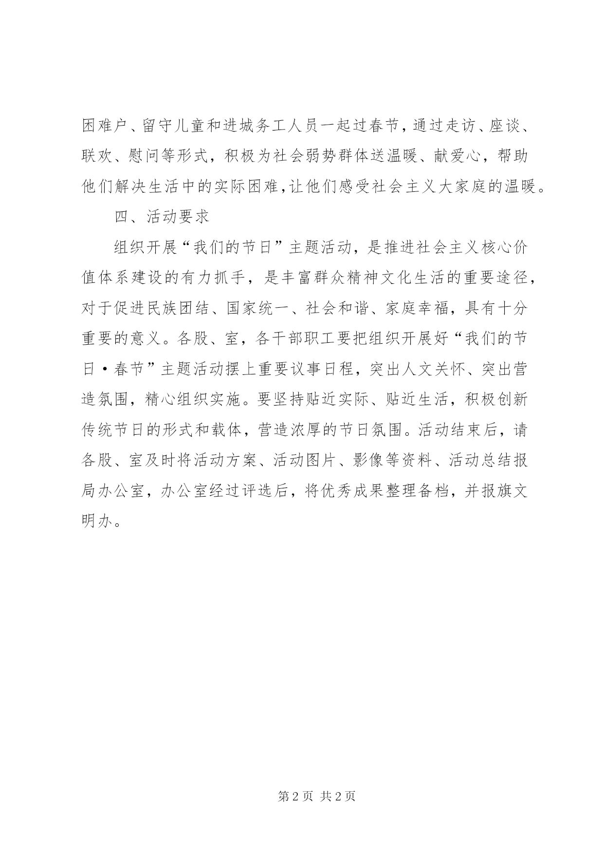 第PAGE\*Arabic\*MERGEFORMAT2页共NUMPAGES\*MERGEFORMAT2页春节主题活动方案范本一、指导思想紧紧围绕党的十八大这个主题,充分挖掘传统节日文化的内涵,广泛开展群众性节日民俗、文化娱乐、经典诵读和扶贫助困等主题实践活动,在家家思团圆的气氛中融入爱我中华、振兴中华的民族大义,进一步唱响共产党好、社会主义好、改革开放好、伟大祖国好、各族人民好的时代主旋律。二、活动主题欢度春节三、活动内容(一)深入开展群众性节日民俗文化活动。节日期间,各股、室深入挖掘春节文化内涵,积极创新传统节日的形式和载体,广泛开展形式多样的春节民俗文化表演、春节团圆和体育健身等文化活动,努力营造民族团结、国家统一、社会和谐的节日氛围。(二)广泛开展中华经典诵读活动。结合春节活动主题,精心选择有关春节的名篇,在全单位广泛开展学习经典、诵读经典活动。努力培养积极的人生追求、高尚的情感境界、健康的生活情趣,让全体干部职工特别是广大年轻干部热爱经典、亲近经典、熟知经典,更好地弘扬中华民族的优秀传统。(三)组织开展“关爱他人”志愿服务活动。组织动员党员、共青团员和年轻干部与帮扶单位的孤寡老人、空巢老人、残疾人、困难户、留守儿童和进城务工人员一起过春节,通过走访、座谈、联欢、慰问等形式,积极为社会弱势群体送温暖、献爱心,帮助他们解决生活中的实际困难,让他们感受社会主义大家庭的温暖。四、活动要求组织开展“我们的节日”主题活动,是推进社会主义核心价值体系建设的有力抓手,是丰富群众精神文化生活的重要途径,对于促进民族团结、国家统一、社会和谐、家庭幸福,具有十分重要的意义。各股、室,各干部职工要把组织开展好“我们的节日·春节”主题活动摆上重要议事日程,突出人文关怀、突出营造氛围,精心组织实施。要坚持贴近实际、贴近生活,积极创新传统节日的形式和载体,营造浓厚的节日氛围。活动结束后,请各股、室及时将活动方案、活动图片、影像等资料、活动总结报局办公室,办公室经过评选后,将优秀成果整理备档,并报旗文明办。