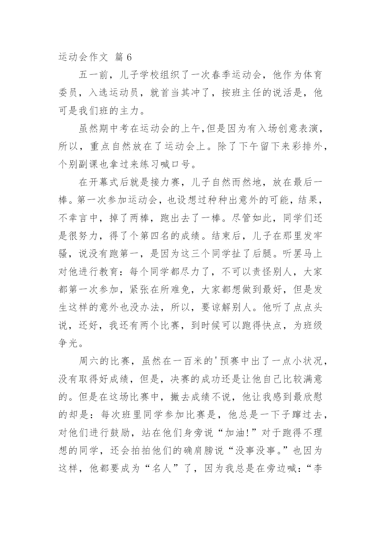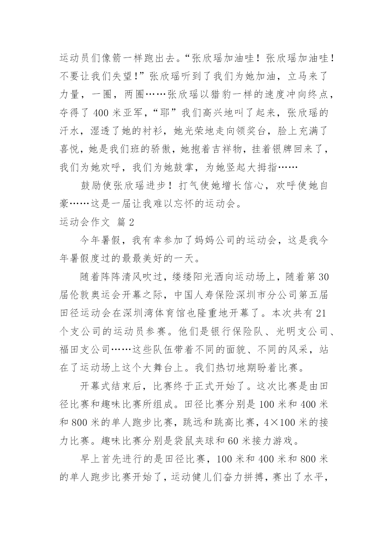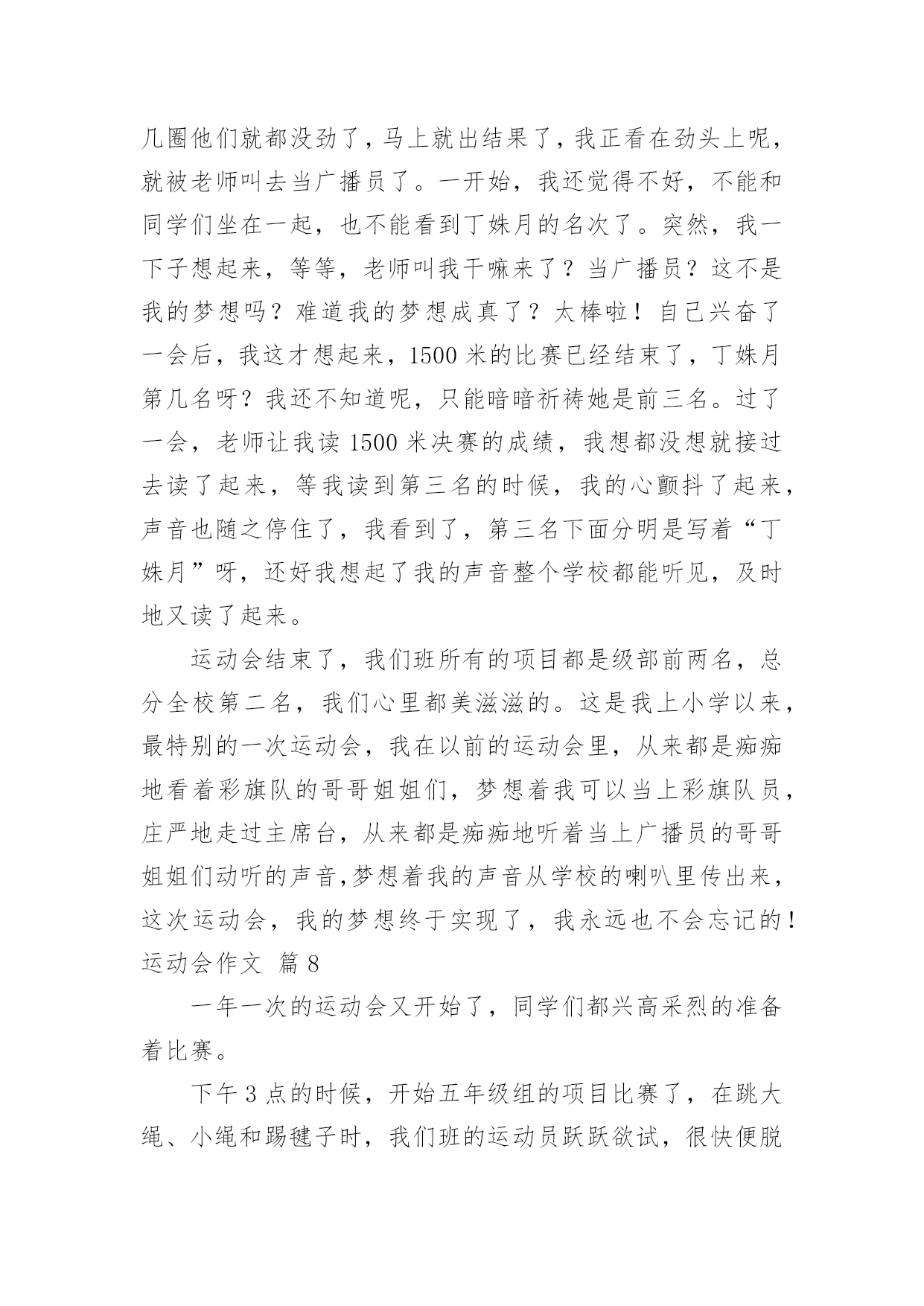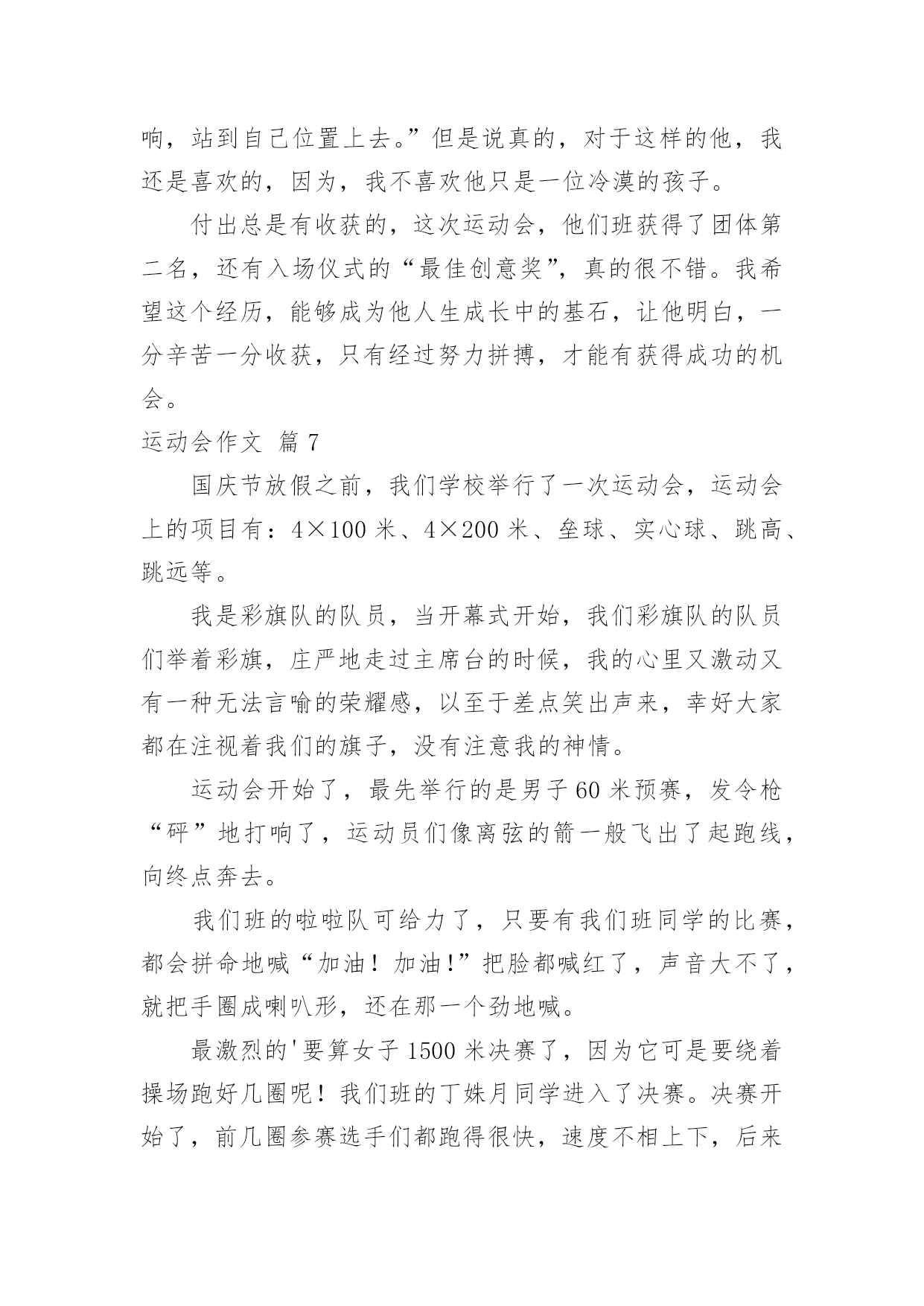 运动会作文【精】运动会作文在日复一日的学习、工作或生活中,大家或多或少都会接触过作文吧,借助作文人们可以反映客观事物、表达思想感情、传递知识信息。还是对作文一筹莫展吗?下面是小编为大家收集的运动会作文8篇,欢迎阅读与收藏。运动会作文篇1轻轻的微风,温暖的阳光,激动的心情,长征小学一年一度的春季田径运动会开始了。运动员进行曲响了,同学们昂首挺胸,踏起步来雄纠纠,气昂昂的。当我们踏过国旗台,我们大声喊出口号:“四《7》,四《7》,力争第一!团结一心!共创佳绩!”瞧我们班这气势,多威武啊!回到自己班的位置,只听校长庄严的宣布:“我校第九届春季田径运动会现在开始!”一个个精彩的.棍术表演,彩带表演,彩球表演……背后都有一段鲜为人知的辛苦,尤其是气球表演,每放飞一捆气球,也就放飞彩色的梦想,放飞希望,放飞快乐,操场上的笑声响彻天空。运动会终于开始了,台下的观众们抓紧了心,一个个都紧张兮兮的,运动员们在一旁热了热身,准备上场比赛,运动员们,加油啊!加油!女子60米,200米,400米,男子60米,200米,400米……“呯”随着发令员的一声枪响,运动员们像箭一样跑出去。“张欣瑶加油哇!张欣瑶加油哇!不要让我们失望!”张欣瑶听到了我们为她加油,立马来了力量,一圈,两圈……张欣瑶以猎豹一样的速度冲向终点,夺得了400米亚军,“耶”我们高兴地叫了起来,张欣瑶的汗水,湿透了她的衬衫,她光荣地走向领奖台,脸上充满了喜悦,她是我们班的骄傲,她抱着吉祥物,挂着银牌回来了,我们为她欢呼,我们为她鼓掌,为她竖起大拇指……鼓励使张欣瑶进步!打气使她增长信心,欢呼使她自豪……这是一届让我难以忘怀的运动会。运动会作文篇2今年暑假,我有幸参加了妈妈公司的运动会,这是我今年暑假度过的最最美好的一天。随着阵阵清风吹过,缕缕阳光洒向运动场上,随着第30届伦敦奥运会开幕之际,中国人寿保险深圳市分公司第五届田径运动会在深圳湾体育馆也隆重地开幕了。本次共有21个支公司的运动员参赛。他们是银行保险队、光明支公司、福田支公司……这些队伍带着不同的面貌、不同的风采,站在了运动场上这个大舞台上。我们热切地期盼着比赛。开幕式结束后,比赛终于正式开始了。这次比赛是由田径比赛和趣味比赛所组成。田径比赛分别是100米和400米和800米的单人跑步比赛,跳远和跳高比赛,4×100米的接力比赛。趣味比赛分别是袋鼠夹球和60米接力游戏。早上首先进行的是田径比赛,100米和400米和800米的单人跑步比赛开始了,运动健儿们奋力拼搏,赛出了水平,赛出了风格!“加油!加油!”的声音盖过了广播的声音。到了4×100米的接力比赛,是全场最激动人心的时刻。当炮声响起,运动健儿们像飞驰的汽车一样,带着必胜的决心,坚定的信念,向终点冲去。第一棒换第二棒时,第二棒的运动员接过棒子,奋力地摆动着手臂,蹬着脚,像离弦的箭一样冲了出去。要到终点的时候,运动员更是用足了劲,加快了速度,像在战场上威武的.战士,正要打一场殊死拼搏的战斗。“加油!加油!”的声音越越大,“胜利了”这个声音不停着在我耳旁飘过。田径比赛过后,是中午的休息时间。大家休息完后,开始了趣味比赛。运动员们在这场比赛中展示出了他们独有的团结精神。趣味比赛过后,是这次最后一个活动内容,就是风采展示表演。每个团队在队长的指导下,发出声声必胜的口号,做出加油的表演。真是美丽的一个个风采。那天,是一场有趣的运动会它让我感受到什么事团结,什么事勇气,什么是拼搏。它让我明白:只要永不放弃,就能走向成功。运动会作文篇3为迎接我们学校举行的“20xx春季运动会”,为赛出自己的水平为班级争光,大家每天都在认认真真地练习。你看,大家累得满头大汗也不停歇。为了全力以赴准备,取得好成绩,老师那几天也不布置什么作业,而是让“小运动员”有更多时间和精力来练习。运动会的开幕式是表演诗朗诵《花的学校》,我是其中之一。我心里既激动又忐忑不安,因为要是出一点差错,就会影响整个班级的荣誉,一想到这儿,我就不敢掉以轻心,而是专心致志地朗读。表演完后,全校同学齐唱《歌唱祖国》。在这庄严而神圣的时刻,五星红旗徐徐升起。升完国旗后,大家以最热烈的掌声,欢迎校长致辞。“20xx春季运动会”开始了,“小运动员”们整齐有序地进入赛场,个个摩拳擦掌,生龙活虎。一声令下,接力比赛开始了,我们班的“小运动员”个个健步如飞,远远超过别的班级。坐在一旁观看的人紧张又激动。眼看我们就要胜利了,朵朵突然掉棒,这就像晴天霹雳,给我们当头一棒,一下子被别班赶超过去了,但我们的队员不气馁,仍然非常努力,非常拼,结果取得了不错的成绩。但有小观众还是难过的哭了起来;而有一些同学却责怪朵朵,我觉得不要去责怪朵朵,她也尽力了,她也不想掉棒。队员们休息了一阵子后,又开始了横叉接龙,因为老师挑的都是腿长的人,有些还下不去,有些队员忍着剧痛