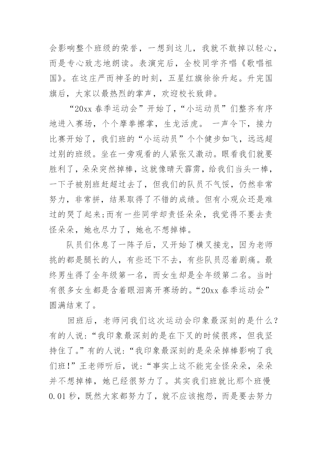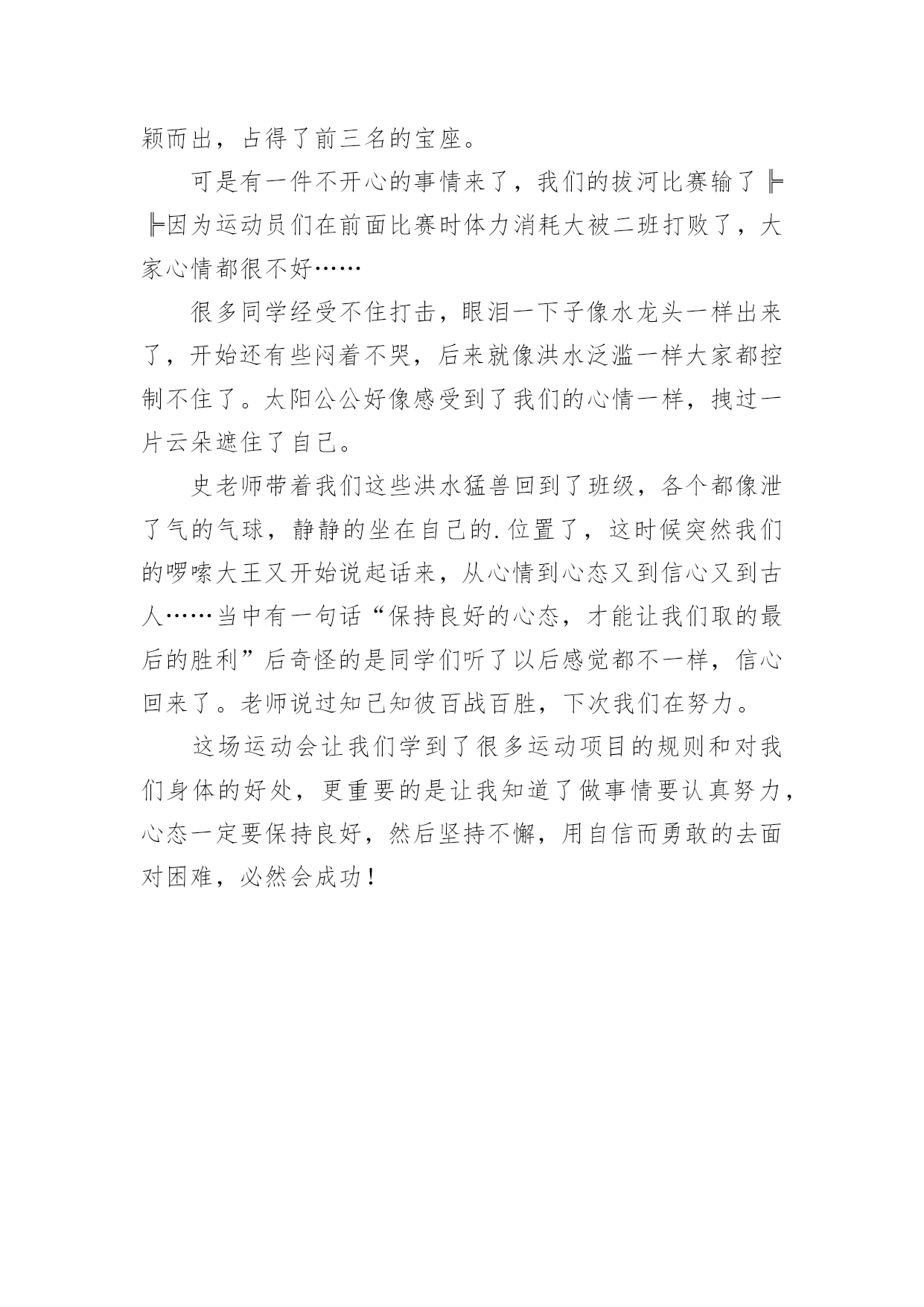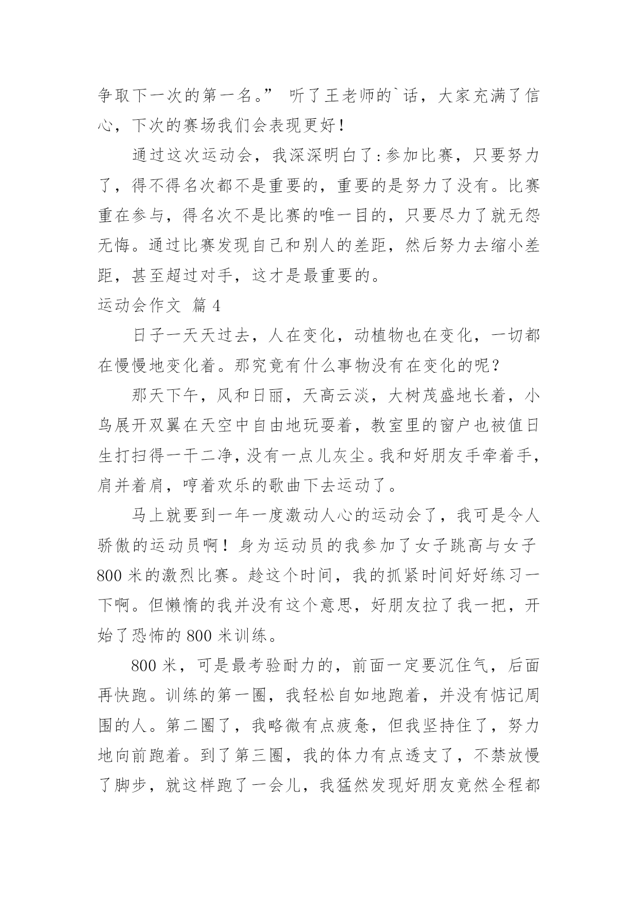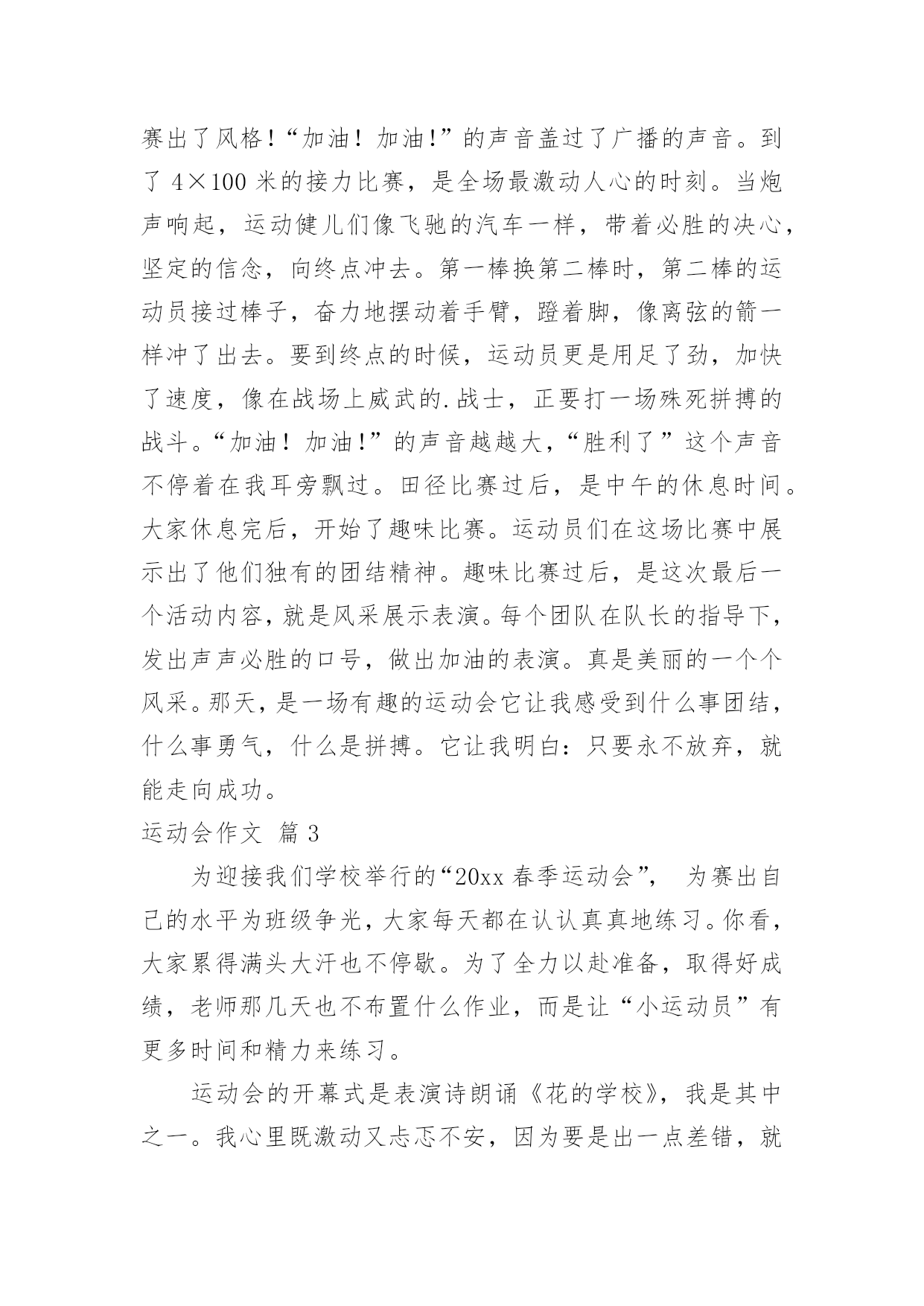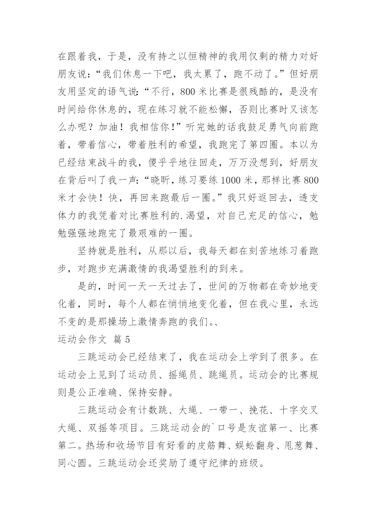 运动会作文【精】运动会作文在日复一日的学习、工作或生活中,大家或多或少都会接触过作文吧,借助作文人们可以反映客观事物、表达思想感情、传递知识信息。还是对作文一筹莫展吗?下面是小编为大家收集的运动会作文8篇,欢迎阅读与收藏。运动会作文篇1轻轻的微风,温暖的阳光,激动的心情,长征小学一年一度的春季田径运动会开始了。运动员进行曲响了,同学们昂首挺胸,踏起步来雄纠纠,气昂昂的。当我们踏过国旗台,我们大声喊出口号:“四《7》,四《7》,力争第一!团结一心!共创佳绩!”瞧我们班这气势,多威武啊!回到自己班的位置,只听校长庄严的宣布:“我校第九届春季田径运动会现在开始!”一个个精彩的.棍术表演,彩带表演,彩球表演……背后都有一段鲜为人知的辛苦,尤其是气球表演,每放飞一捆气球,也就放飞彩色的梦想,放飞希望,放飞快乐,操场上的笑声响彻天空。运动会终于开始了,台下的观众们抓紧了心,一个个都紧张兮兮的,运动员们在一旁热了热身,准备上场比赛,运动员们,加油啊!加油!女子60米,200米,400米,男子60米,200米,400米……“呯”随着发令员的一声枪响,运动员们像箭一样跑出去。“张欣瑶加油哇!张欣瑶加油哇!不要让我们失望!”张欣瑶听到了我们为她加油,立马来了力量,一圈,两圈……张欣瑶以猎豹一样的速度冲向终点,夺得了400米亚军,“耶”我们高兴地叫了起来,张欣瑶的汗水,湿透了她的衬衫,她光荣地走向领奖台,脸上充满了喜悦,她是我们班的骄傲,她抱着吉祥物,挂着银牌回来了,我们为她欢呼,我们为她鼓掌,为她竖起大拇指……鼓励使张欣瑶进步!打气使她增长信心,欢呼使她自豪……这是一届让我难以忘怀的运动会。运动会作文篇2今年暑假,我有幸参加了妈妈公司的运动会,这是我今年暑假度过的最最美好的一天。随着阵阵清风吹过,缕缕阳光洒向运动场上,随着第30届伦敦奥运会开幕之际,中国人寿保险深圳市分公司第五届田径运动会在深圳湾体育馆也隆重地开幕了。本次共有21个支公司的运动员参赛。他们是银行保险队、光明支公司、福田支公司……这些队伍带着不同的面貌、不同的风采,站在了运动场上这个大舞台上。我们热切地期盼着比赛。开幕式结束后,比赛终于正式开始了。这次比赛是由田径比赛和趣味比赛所组成。田径比赛分别是100米和400米和800米的单人跑步比赛,跳远和跳高比赛,4×100米的接力比赛。趣味比赛分别是袋鼠夹球和60米接力游戏。早上首先进行的是田径比赛,100米和400米和800米的单人跑步比赛开始了,运动健儿们奋力拼搏,赛出了水平,赛出了风格!“加油!加油!”的声音盖过了广播的声音。到了4×100米的接力比赛,是全场最激动人心的时刻。当炮声响起,运动健儿们像飞驰的汽车一样,带着必胜的决心,坚定的信念,向终点冲去。第一棒换第二棒时,第二棒的运动员接过棒子,奋力地摆动着手臂,蹬着脚,像离弦的箭一样冲了出去。要到终点的时候,运动员更是用足了劲,加快了速度,像在战场上威武的.战士,正要打一场殊死拼搏的战斗。“加油!加油!”的声音越越大,“胜利了”这个声音不停着在我耳旁飘过。田径比赛过后,是中午的休息时间。大家休息完后,开始了趣味比赛。运动员们在这场比赛中展示出了他们独有的团结精神。趣味比赛过后,是这次最后一个活动内容,就是风采展示表演。每个团队在队长的指导下,发出声声必胜的口号,做出加油的表演。真是美丽的一个个风采。那天,是一场有趣的运动会它让我感受到什么事团结,什么事勇气,什么是拼搏。它让我明白:只要永不放弃,就能走向成功。运动会作文篇3为迎接我们学校举行的“20xx春季运动会”,为赛出自己的水平为班级争光,大家每天都在认认真真地练习。你看,大家累得满头大汗也不停歇。为了全力以赴准备,取得好成绩,老师那几天也不布置什么作业,而是让“小运动员”有更多时间和精力来练习。运动会的开幕式是表演诗朗诵《花的学校》,我是其中之一。我心里既激动又忐忑不安,因为要是出一点差错,就会影响整个班级的荣誉,一想到这儿,我就不敢掉以轻心,而是专心致志地朗读。表演完后,全校同学齐唱《歌唱祖国》。在这庄严而神圣的时刻,五星红旗徐徐升起。升完国旗后,大家以最热烈的掌声,欢迎校长致辞。“20xx春季运动会”开始了,“小运动员”们整齐有序地进入赛场,个个摩拳擦掌,生龙活虎。一声令下,接力比赛开始了,我们班的“小运动员”个个健步如飞,远远超过别的班级。坐在一旁观看的人紧张又激动。眼看我们就要胜利了,朵朵突然掉棒,这就像晴天霹雳,给我们当头一棒,一下子被别班赶超过去了,但我们的队员不气馁,仍然非常努力,非常拼,结果取得了不错的成绩。但有小观众还是难过的哭了起来;而有一些同学却责怪朵朵,我觉得不要去责怪朵朵,她也尽力了,她也不想掉棒。队员们休息了一阵子后,又开始了横叉接龙,因为老师挑的都是腿长的人,有些还下不去,有些队员忍着剧痛