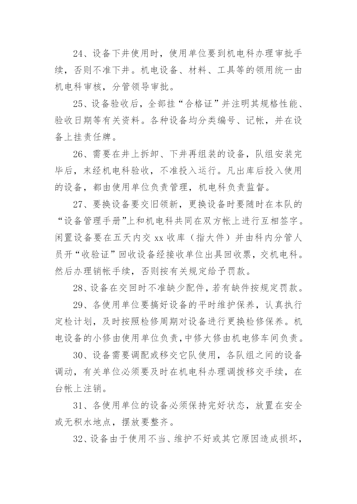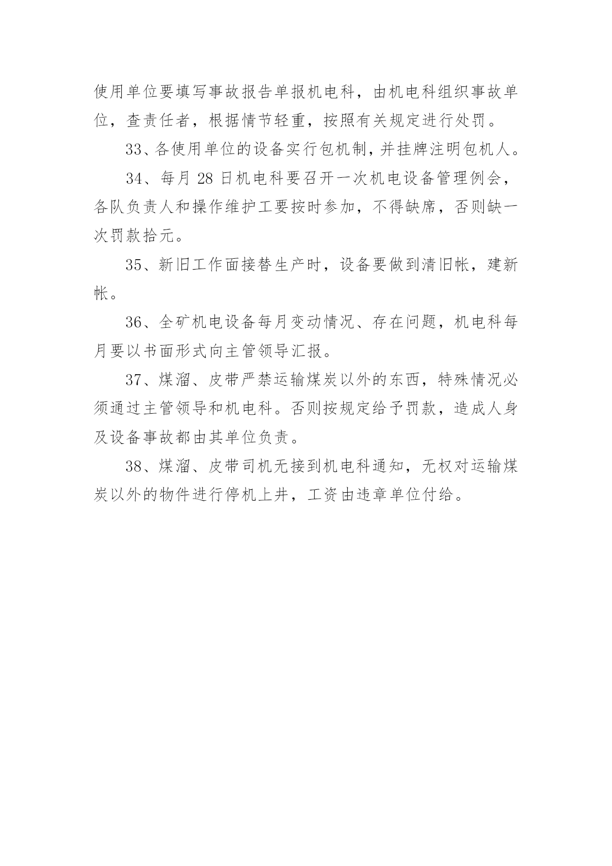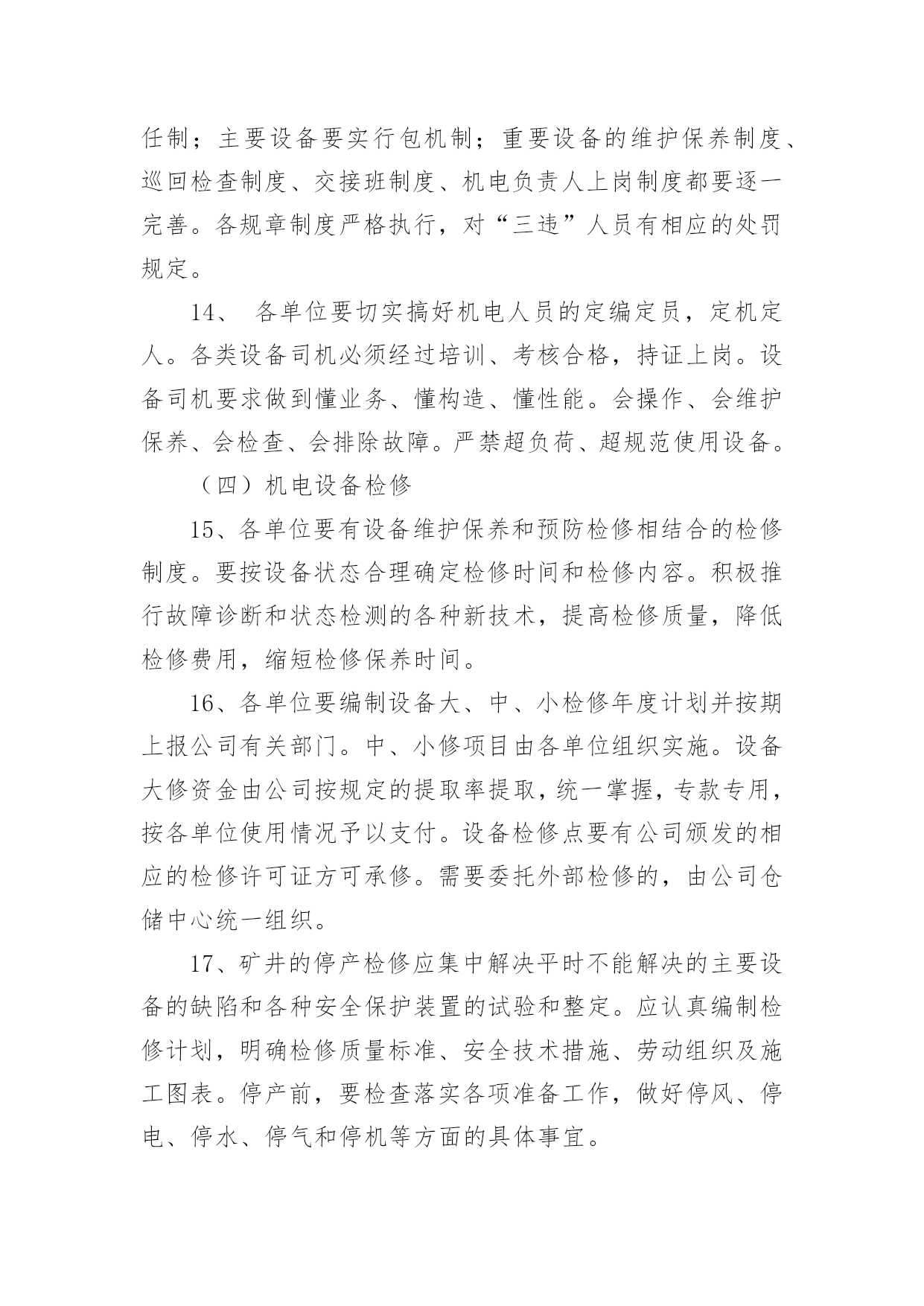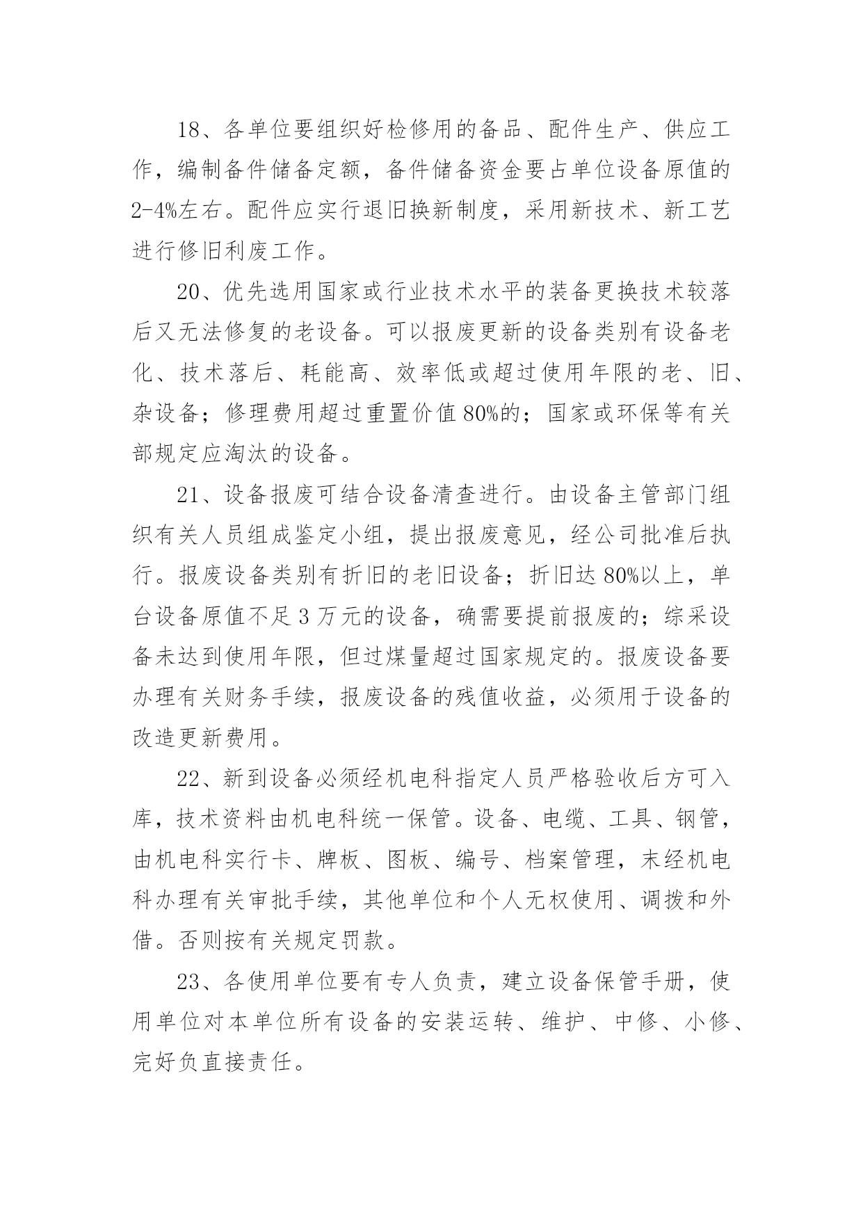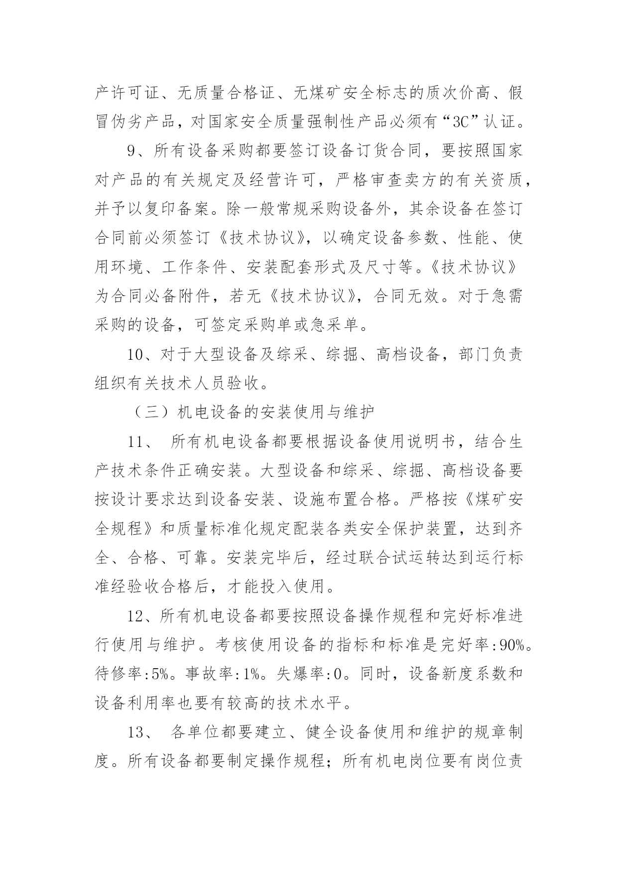 煤矿机电设备管理规定最新(一)总则1、为适应公司的快速发展,加强机电设备管理,提高生产装备水平和经济效益,保证安全生产和设备正常运行,根据国家有关规定,结合我矿特点,特制定本规定。2、机电设备管理要依靠科技进步,充分发挥设备效能和投资效益,坚持决策、研制、与使用相结合,维护、保养与计划检修相结合,修理、改造与更新相结合,技术管理与经济管理相结合的原则。3、公司采购中心是设备采购供应的专门机构,凡列入公司专用资金计划的设备,均由其统一组织采购供应;公司财务部负责设备固定资产的购入、折旧提取、大中修、报废、调拨等财务帐目及经济核算工作;公司生产技术部参与矿井技术改造机电设备部分的设计审核工作,参与主要机电设备的选型配套审定,参与机电工程的竣工投产验收工作。4、机电设备管理人员要自觉执行本规定,维护公司利益,面向基层、服务生产,热情周到地搞好本职工作。(二)机电设备的购置计划与采购5、机电管理部门应根据年度计划、月度计划或紧急情况下安全生产急需设备的指令、指示编制采购计划。6、各单位机电设备管理部门要根据设备需要时间,按规定期限向供应部门申请设备购置计划,要求详细准确。8、设备的选型应注意通用化、标准化,严禁采购无生产许可证、无质量合格证、无煤矿安全标志的质次价高、假冒伪劣产品,对国家安全质量强制性产品必须有“3C”认证。9、所有设备采购都要签订设备订货合同,要按照国家对产品的有关规定及经营许可,严格审查卖方的有关资质,并予以复印备案。除一般常规采购设备外,其余设备在签订合同前必须签订《技术协议》,以确定设备参数、性能、使用环境、工作条件、安装配套形式及尺寸等。《技术协议》为合同必备附件,若无《技术协议》,合同无效。对于急需采购的设备,可签定采购单或急采单。10、对于大型设备及综采、综掘、高档设备,部门负责组织有关技术人员验收。(三)机电设备的安装使用与维护11、所有机电设备都要根据设备使用说明书,结合生产技术条件正确安装。大型设备和综采、综掘、高档设备要按设计要求达到设备安装、设施布置合格。严格按《煤矿安全规程》和质量标准化规定配装各类安全保护装置,达到齐全、合格、可靠。安装完毕后,经过联合试运转达到运行标准经验收合格后,才能投入使用。12、所有机电设备都要按照设备操作规程和完好标准进行使用与维护。考核使用设备的指标和标准是完好率:90%。待修率:5%。事故率:1%。失爆率:0。同时,设备新度系数和设备利用率也要有较高的技术水平。13、各单位都要建立、健全设备使用和维护的规章制度。所有设备都要制定操作规程;所有机电岗位要有岗位责任制;主要设备要实行包机制;重要设备的维护保养制度、巡回检查制度、交接班制度、机电负责人上岗制度都要逐一完善。各规章制度严格执行,对“三违”人员有相应的处罚规定。14、各单位要切实搞好机电人员的定编定员,定机定人。各类设备司机必须经过培训、考核合格,持证上岗。设备司机要求做到懂业务、懂构造、懂性能。会操作、会维护保养、会检查、会排除故障。严禁超负荷、超规范使用设备。(四)机电设备检修15、各单位要有设备维护保养和预防检修相结合的检修制度。要按设备状态合理确定检修时间和检修内容。积极推行故障诊断和状态检测的各种新技术,提高检修质量,降低检修费用,缩短检修保养时间。16、各单位要编制设备大、中、小检修年度计划并按期上报公司有关部门。中、小修项目由各单位组织实施。设备大修资金由公司按规定的提取率提取,统一掌握,专款专用,按各单位使用情况予以支付。设备检修点要有公司颁发的相应的检修许可证方可承修。需要委托外部检修的,由公司仓储中心统一组织。17、矿井的停产检修应集中解决平时不能解决的主要设备的缺陷和各种安全保护装置的试验和整定。应认真编制检修计划,明确检修质量标准、安全技术措施、劳动组织及施工图表。停产前,要检查落实各项准备工作,做好停风、停电、停水、停气和停机等方面的具体事宜。18、各单位要组织好检修用的备品、配件生产、供应工作,编制备件储备定额,备件储备资金要占单位设备原值的2-4%左右。配件应实行退旧换新制度,采用新技术、新工艺进行修旧利废工作。20、优先选用国家或行业技术水平的装备更换技术较落后又无法修复的老设备。可以报废更新的设备类别有设备老化、技术落后、耗能高、效率低或超过使用年限的老、旧、杂设备;修理费用超过重置价值80%的;国家或环保等有关部规定应淘汰的设备。21、设备报废可结合设备清查进行。由设备主管部门组织有关人员组成鉴定小组,提出报废意见,经公司批准后执行。报废设备类别有折旧的老旧设备;折旧达80%以上,单台设备原值不足3万元的设备,确需要提前报废的;综采设备未达到使用年限,但过煤量超过国家规定的。报废设备要办理有关财务手续,报废设备的残值收益,必须用于设备的改造更新费用。22、新到设备必