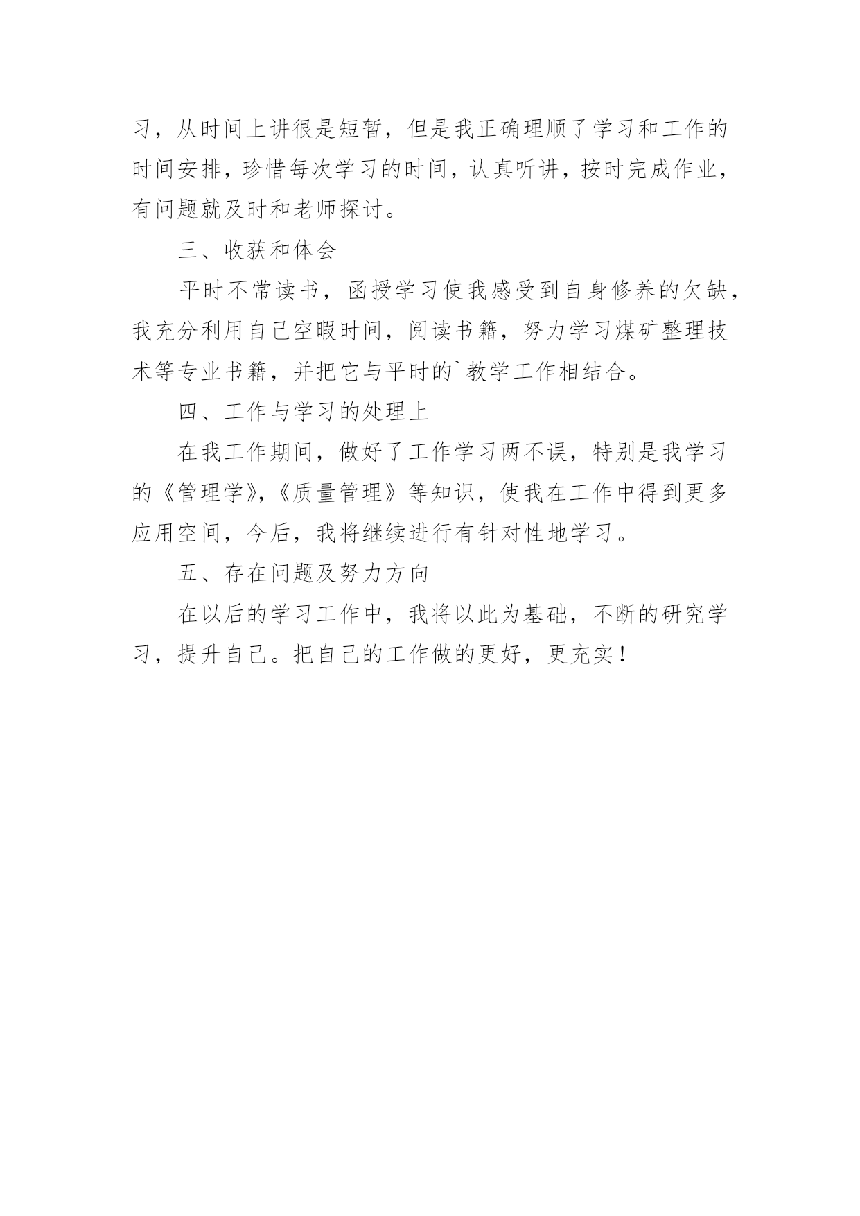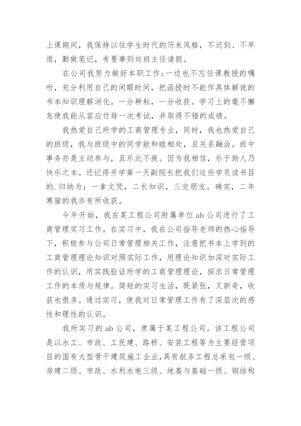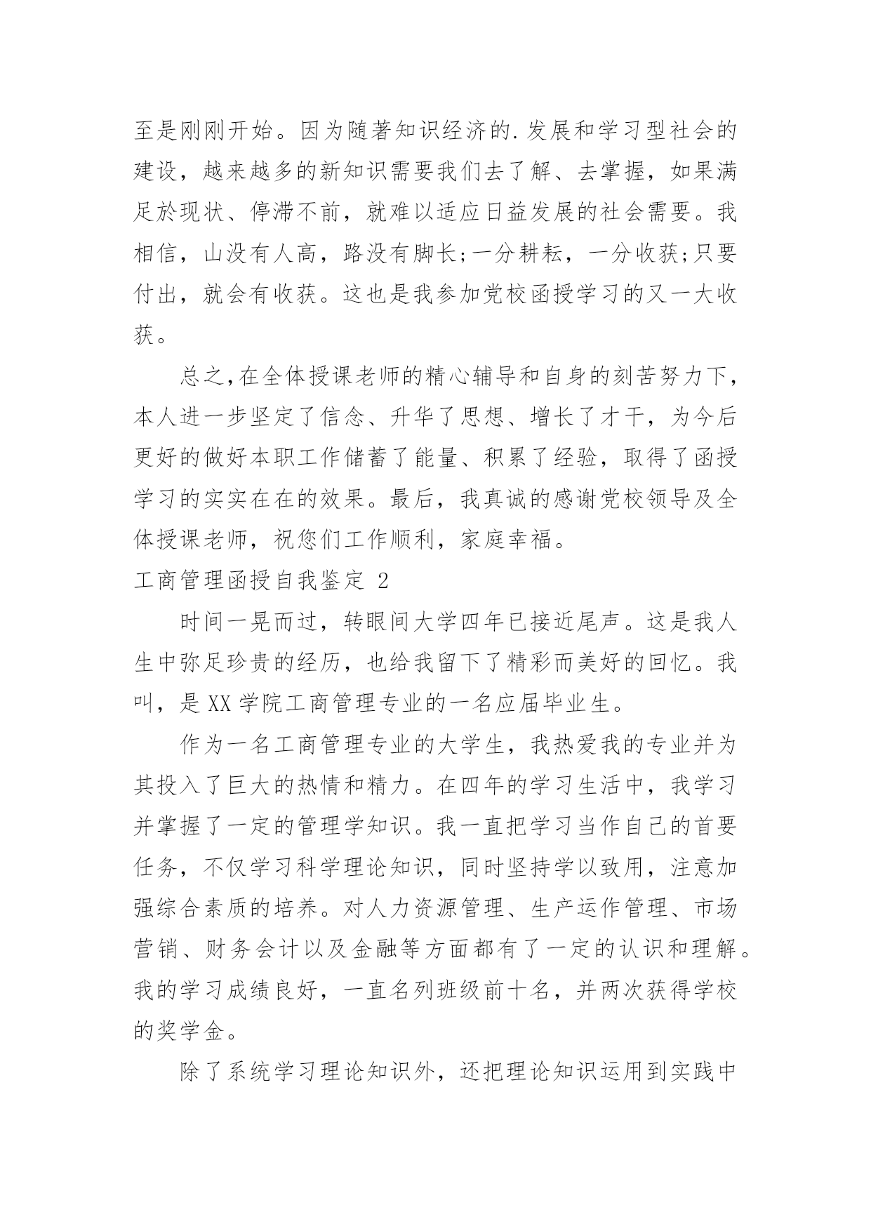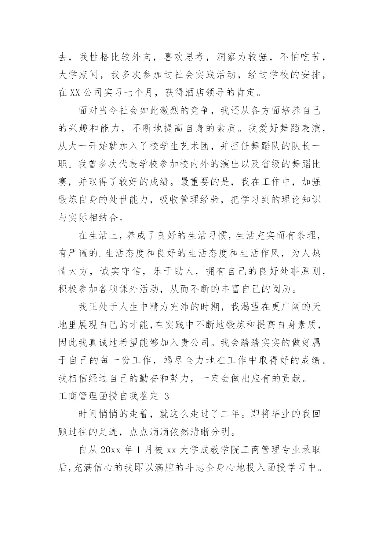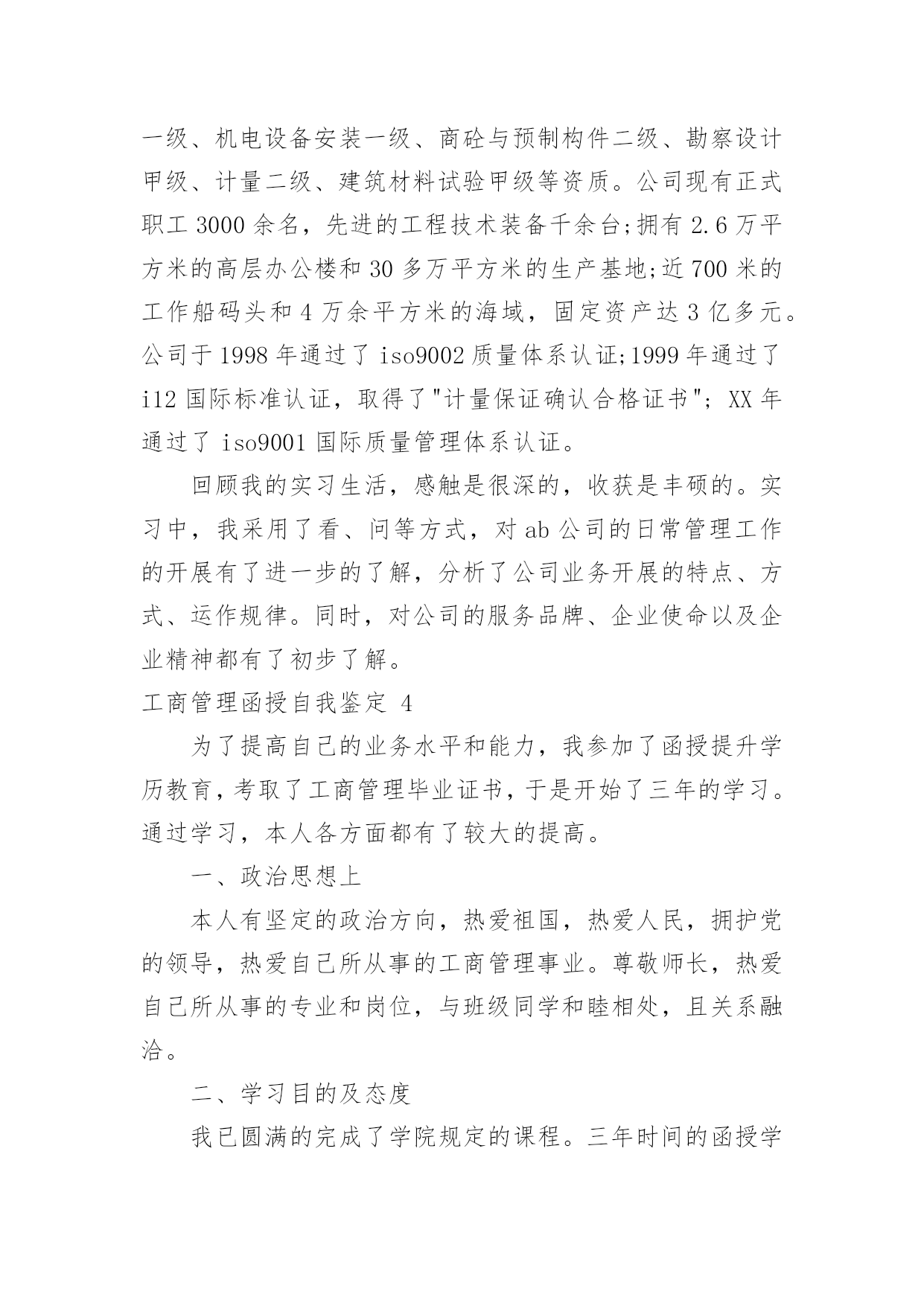 工商管理函授自我鉴定工商管理函授自我鉴定(4篇)自我鉴定是一个人对某一特定时间段内的学习和工作生活等表现的自我总结,自我鉴定可以让我们对自己有个正确的认知,让我们一起认真地写一份自我鉴定吧。如何把自我鉴定做到重点突出呢?以下是小编整理的工商管理函授自我鉴定,欢迎阅读与收藏。工商管理函授自我鉴定1经过入学考试,我如愿成为中共省委党校经济管理专业专科班的一名学员。在参加党校函授学习的日子裏,我珍惜每一次面授辅导机会,认真抓好自学,顺利完成了学业。这段学习经历,给我留下了美好记忆,也为我以后的工作奠定了良好的基础。通过学习本人能正确处理“工”学矛盾,能按照学校的有关规定,积极参加集中面授和考试,利用业余时间自学各门课程,按时完成各项作业。通过三年学习,现已认真完成了经济管理专业专科所有课程的学习,顺利完成了学业本人通过党校的教育,更加注重政治理论学习,能在工作和学习中认真践行“三个代表”重要思想,能自觉与党中央保持高度一致;尊重领导,团结同志,热爱本职,作风严谨,为人正派,能够在本单位模范地履行个人的职责和义务。学无止境。虽然参加党校函授学习的任务结束了,但学习并没有结束,甚至是刚刚开始。因为随著知识经济的.发展和学习型社会的建设,越来越多的新知识需要我们去了解、去掌握,如果满足於现状、停滞不前,就难以适应日益发展的社会需要。我相信,山没有人高,路没有脚长;一分耕耘,一分收获;只要付出,就会有收获。这也是我参加党校函授学习的又一大收获。总之,在全体授课老师的精心辅导和自身的刻苦努力下,本人进一步坚定了信念、升华了思想、增长了才干,为今后更好的做好本职工作储蓄了能量、积累了经验,取得了函授学习的实实在在的效果。最后,我真诚的感谢党校领导及全体授课老师,祝您们工作顺利,家庭幸福。工商管理函授自我鉴定2时间一晃而过,转眼间大学四年已接近尾声。这是我人生中弥足珍贵的经历,也给我留下了精彩而美好的回忆。我叫,是XX学院工商管理专业的一名应届毕业生。作为一名工商管理专业的大学生,我热爱我的专业并为其投入了巨大的热情和精力。在四年的学习生活中,我学习并掌握了一定的管理学知识。我一直把学习当作自己的首要任务,不仅学习科学理论知识,同时坚持学以致用,注意加强综合素质的培养。对人力资源管理、生产运作管理、市场营销、财务会计以及金融等方面都有了一定的认识和理解。我的学习成绩良好,一直名列班级前十名,并两次获得学校的奖学金。除了系统学习理论知识外,还把理论知识运用到实践中去,我性格比较外向,喜欢思考,洞察力较强,不怕吃苦,大学期间,我多次参加过社会实践活动,经过学校的安排,在XX公司实习七个月,获得酒店领导的肯定。面对当今社会如此激烈的竞争,我还从各方面培养自己的兴趣和能力,不断地提高自身的素质。我爱好舞蹈表演,从大一开始就加入了校学生艺术团,并担任舞蹈队的队长一职。我曾多次代表学校参加校内外的演出以及省级的舞蹈比赛,并取得了较好的成绩。最重要的是,我在工作中,加强锻炼自身的处世能力,吸收管理经验,把学习到的理论知识与实际相结合。在生活上,养成了良好的生活习惯,生活充实而有条理,有严谨的.生活态度和良好的生活态度和生活作风,为人热情大方,诚实守信,乐于助人,拥有自己的良好处事原则,积极参加各项课外活动,从而不断的丰富自己的阅历。我正处于人生中精力充沛的时期,我渴望在更广阔的天地里展现自己的才能,在实践中不断地锻炼和提高自身素质,因此我真诚地希望能够加入贵公司。我会踏踏实实的做好属于自己的每一份工作,竭尽全力地在工作中取得好的成绩。我相信经过自己的勤奋和努力,一定会做出应有的贡献。工商管理函授自我鉴定3时间悄悄的走着,就这么走过了二年。即将毕业的我回顾过往的足迹,点点滴滴依然清晰分明。自从20xx年1月被xx大学成教学院工商管理专业录取后,充满信心的我即以满腔的斗志全身心地投入函授学习中。上课期间,我保持以往学生时代的历来风格,不迟到、不早退,勤做笔记,有要事则向班主任请假。在公司我努力做好本职工作;一边也不忘任课教授的嘱咐,充分利用自己的闲暇时间,把函授时不能作具体解说的书本知识理解消化。一分耕耘,一分收获。学习上的毫不懈怠使我能从容应付每一次考试,并取得不错的成绩。我热爱自己所学的工商管理专业,同时,我也热爱自己的班级,我与班级中的同学能和睦相处,且关系融洽。班中事务亦是主动参与,且乐此不疲。因为我相信,乐于助人乃快乐之本。还记得开学第一天副院长把我们这些学员读书目的.归纳为:一拿文凭,二长知识,三交朋友。确实,二年寒窗的我亦有所收获。今年开始,我在某工程公司附属单位ab公司进行了工商管理实习工作。在实习中,我在公司指导老师的热心指导下,积极参与公司日常管理相关工作,注意把书本上学到的工商管理理论知识对照实际工作,用理论知识加深对实际工作的认识,用实