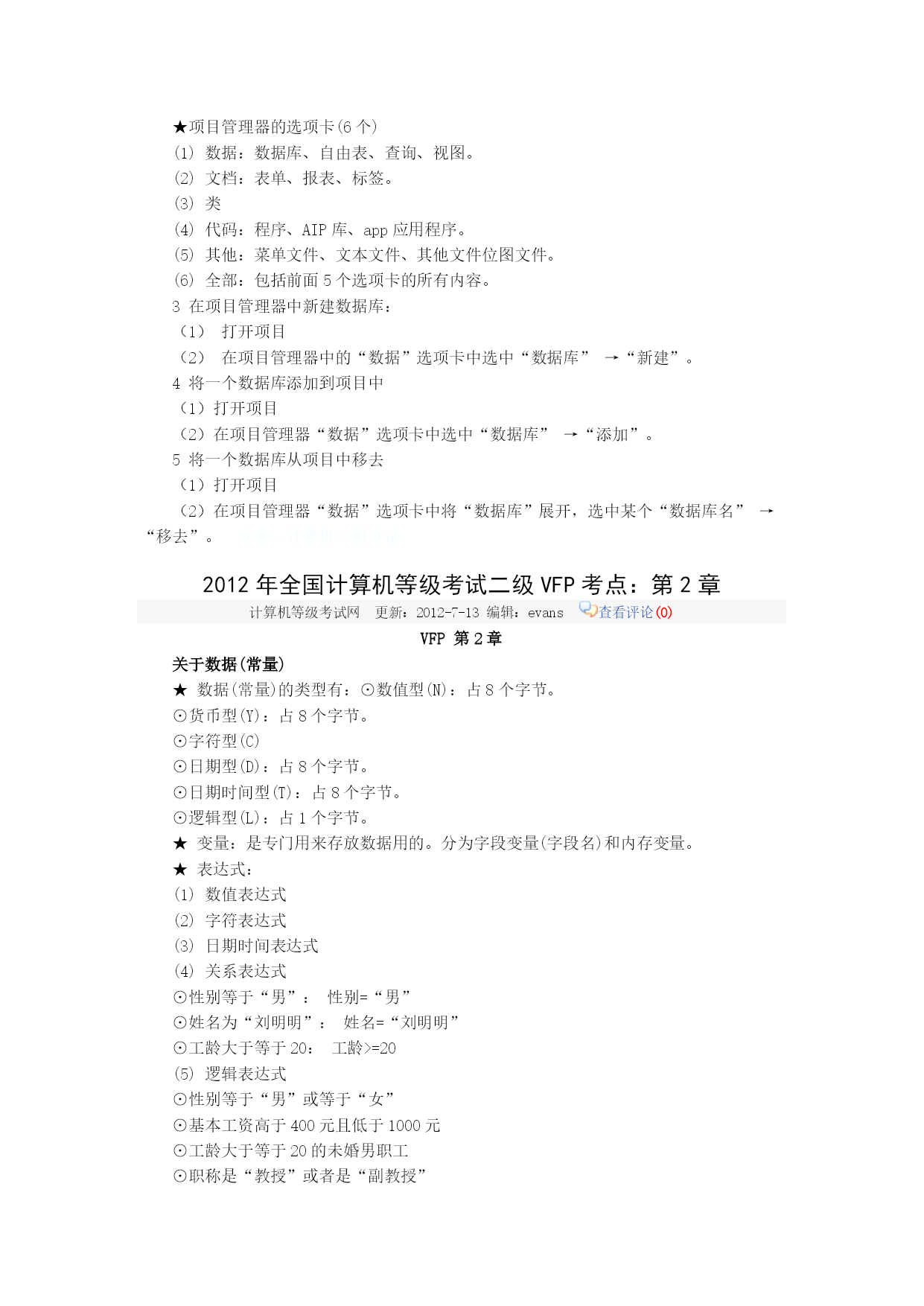 2012年全国计算机等级考试二级VFP考点:第1章HYPERLINK"http://edu.21cn.com/ncre"计算机等级考试网更新:2012-7-13编辑:evansHYPERLINK"http://edu.21cn.com/ncre/g_51_942724-1.htm"\l"lookall"查看评论(0)VFP第1章关于数据库的基础知识1数据库(DB):是存储在计算机存储设备上的结构化的相关数据集合。即是存放数据的仓库。2数据库管理系统(DBMS):实现各种数据管理功能的核心软件。或者说为数据库的建立、使用和维护而配置的软件称为数据库管理系统。3数据库应用系统(DBAS):是由系统开发人员开发的。4数据库管理员(DBA):DBA的职责不包括开发数据库应用系统。5数据库系统的组成:硬件系统、数据库、数据库管理系统、数据库管理员和用户。其中DBMS是核心。6实体间的联系有三种:一对一、一对多、多对多。7数据模型分为三种:层次模型、网状模型、关系模型。★其中关系模型就是用二维表的结构来描述。一张二维表就是一个关系。★关系术语⊙关系:就是一张二维表。⊙元组(记录):水平方向的行。⊙属性(字段):垂直方向的列。⊙域:属性的取值范围。⊙关键字:关系中最关键的那一个字段,即能够唯一标识一个元组。⊙外部关键字:在两个有联系表中,若两个表有相同的字段名,其中一个表中的是关键字,那它在另外一张表中不是关键字,那就是外部关键字。两个表之间的字段起着“桥梁”的作用。8专门的关系运算:选择、投影、连接。关于VFP系统1启动:单击“开始”→“程序”→“MicrosoftVisualFoxPro6.0”→“MicrosoftVisualFoxPro6.0”。2退出:(1)单击右上角的“”。(2)单击“文件”→“退出”。(3)ALT+F4。(4)在命令窗口中键入QUIT。3两种工作方式:交互式和自动化工作方式(程序运行方式)。4显示与隐藏命令窗口的三种操作方法。P245设置VFP的默认目录位置:单击“工具”→“选项”→“文件位置”→“默认目录”→“修改”。★在学习VFP时,请同学们一定要养成设置文件的默认存储位置的好习惯。关于项目管理器1新建:(1)鼠标操作:“文件”→“新建”→勾选“项目”→“新建文件”。(2)命令操作:createproject[项目名]2打开:(1)鼠标操作:“文件”→“打开”。(2)命令操作:modifyproject[项目名]★项目管理器的选项卡(6个)(1)数据:数据库、自由表、查询、视图。(2)文档:表单、报表、标签。(3)类(4)代码:程序、AIP库、app应用程序。(5)其他:菜单文件、文本文件、其他文件位图文件。(6)全部:包括前面5个选项卡的所有内容。3在项目管理器中新建数据库:(1)打开项目(2)在项目管理器中的“数据”选项卡中选中“数据库”→“新建”。4将一个数据库添加到项目中(1)打开项目(2)在项目管理器“数据”选项卡中选中“数据库”→“添加”。5将一个数据库从项目中移去(1)打开项目(2)在项目管理器“数据”选项卡中将“数据库”展开,选中某个“数据库名”→“移去”。来源:-计算机二级考试2012年全国计算机等级考试二级VFP考点:第2章HYPERLINK"http://edu.21cn.com/ncre"计算机等级考试网更新:2012-7-13编辑:evansHYPERLINK"http://edu.21cn.com/ncre/g_51_942723-1.htm"\l"lookall"查看评论(0)VFP第2章关于数据(常量)★数据(常量)的类型有:⊙数值型(N):占8个字节。⊙货币型(Y):占8个字节。⊙字符型(C)⊙日期型(D):占8个字节。⊙日期时间型(T):占8个字节。⊙逻辑型(L):占1个字节。★变量:是专门用来存放数据用的。分为字段变量(字段名)和内存变量。★表达式:(1)数值表达式(2)字符表达式(3)日期时间表达式(4)关系表达式⊙性别等于“男”:性别=“男”⊙姓名为“刘明明”:姓名=“刘明明”⊙工龄大于等于20:工龄>=20(5)逻辑表达式⊙性别等于“男”或等于“女”⊙基本工资高于400元且低于1000元⊙工龄大于等于20的未婚男职工⊙职称是“教授”或者是“副教授”⊙工龄大于20年,职称为“副教授”或“讲师”的未婚男职工⊙职称为“副教授”且年龄不超过35岁的未婚女职工本章的相关命令⊙?:打印输出符,输出时换行。⊙??:打印输出符,输出时不换行。⊙SETCENTURYON:设置4位数字年份⊙SETCENTURYOFF:设置2位数字年份⊙STORE<表达式>TO<内存变量>:内存变量的赋值。⊙CLEAR:清除窗口屏幕中显示的内容。⊙DIMENSIO