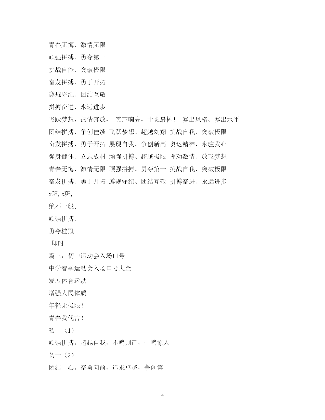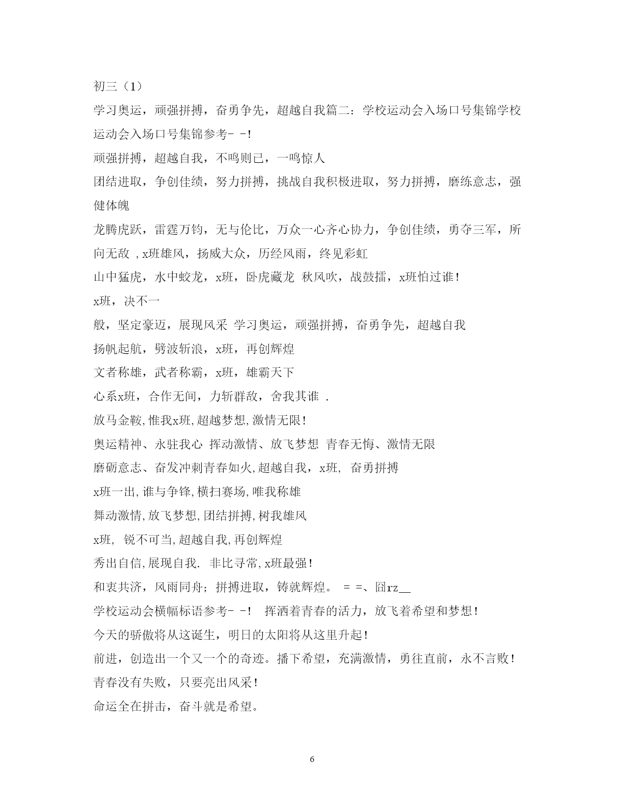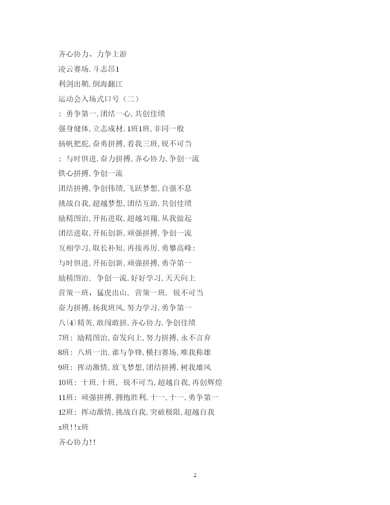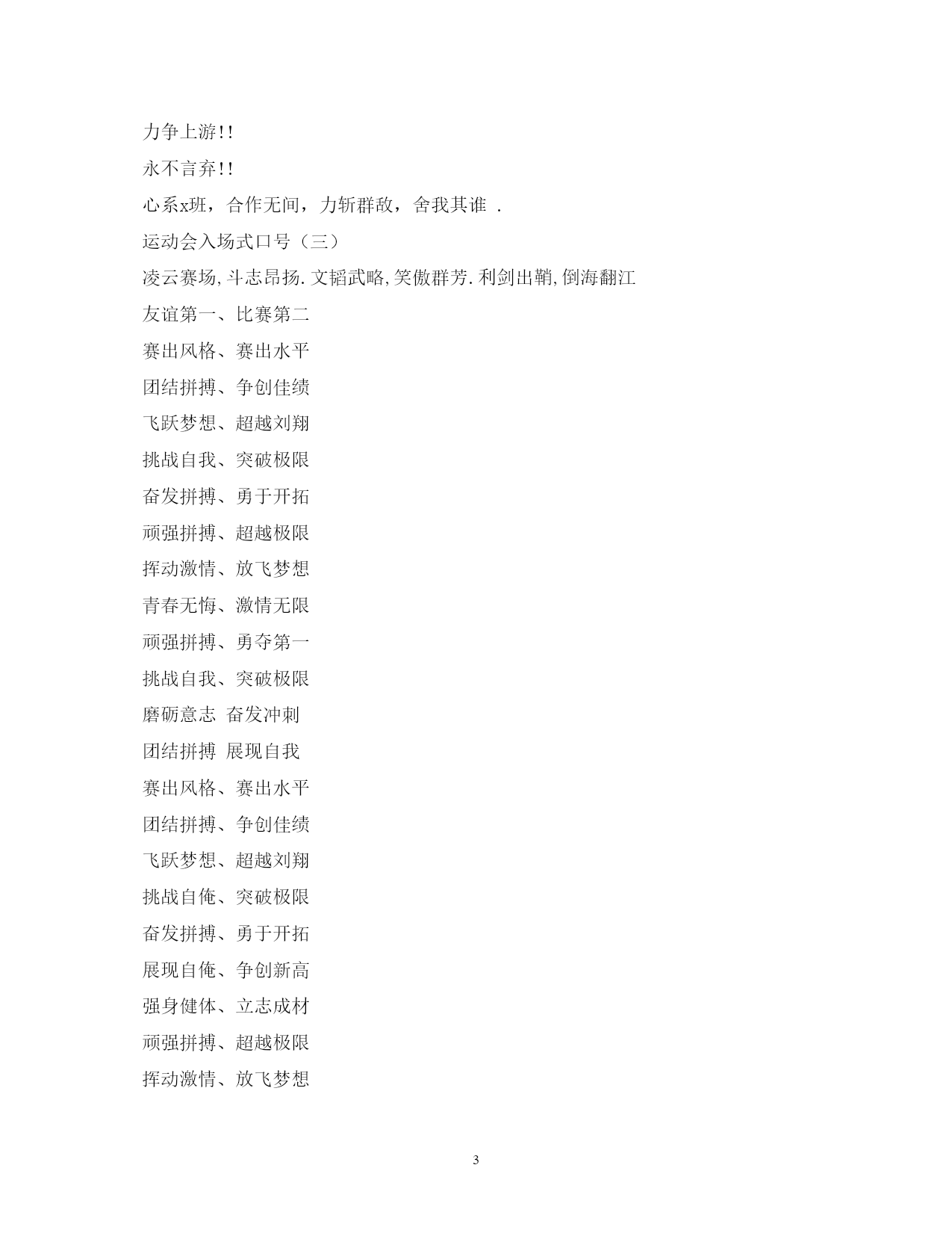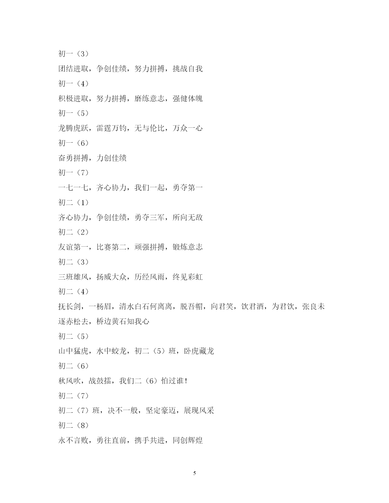 此资料由网络收集而来,如有侵权请告知上传者立即删除。资料共分享,我们负责传递知识。PAGEPAGE7初中运动会口号篇一:初中运动会口号初中运动会口号七年级一班:华中七一,永争第一.我努力,我精彩。七年级二班:坚强、诚实、进取。7、2加油,7、2雄起!七年级三班:走进华中,走向成功。我爱我校,我爱我班。七年级四班:放飞理想,勇于高攀。走进华中,走向成功。七年级五班:鸟美在羽毛,人美在心!七年级六班:齐心协力,牛气冲天。七六七六,一枝独秀。八年级一班:眼中有生命,心中有学生。八年级二班:走进华中,走向成功。没有最好,只有更好。八年级三班:华中学子,中华栋梁!八年级四班:精诚所至,金石为开!九年级一班:挑战自我,超越自我!九年级二班:淡泊明志,宁静致远,团结友爱,顽强拼搏。九年级三班:态度决定一切。九年级四班:为XX级四班加油。九年级五班:青春、活力、聪明、美丽、帅气。赛出风格、赛出水平团结拼搏、争创佳绩飞跃梦想、超越刘翔挑战自我、突破极限奋发拼搏、勇于开拓展现自我、争创新高奥运精神、永驻我心强身健体、立志成材顽强拼搏、超越极限挥动激-情、放飞梦想青春无悔、激-情无限顽强拼搏、勇夺第一挑战自我、突破极限奋发拼搏、勇于开拓遵规守纪、团结互敬拼搏奋进、永远进步篇二:学校运动会入场口号大全学校运动会入场口号大全齐心协力、力争上游凌云赛场,斗志昂1利剑出鞘,倒海翻江运动会入场式口号(二):勇争第一,团结一心,共创佳绩强身健体,立志成材,1班1班,非同一般扬帆把舵,奋勇拼搏,看我三班,锐不可当:与时俱进,奋力拼搏,齐心协力,争创一流铁心拼搏,争创一流团结拼搏,争创伟绩,飞跃梦想,自强不息挑战自我,超越梦想,团结互助,共创佳绩励精图治,开拓进取,超越刘翔,从我做起团结进取,开拓创新,顽强拼搏,争创一流互相学习,取长补短,再接再厉,勇攀高峰:与时俱进,开拓创新,顽强拼搏,勇夺第一励精图治,争创一流,好好学习,天天向上营策一班,猛虎出山,营策一班,锐不可当奋力拼搏,扬我班风,努力学习,勇争第一八(4)精英,敢闯敢拼,齐心协力,争创佳绩7班:励精图治,奋发向上,努力拼搏,永不言弃8班:八班一出,谁与争锋,横扫赛场,唯我称雄9班:挥动激情,放飞梦想,团结拼搏,树我雄风10班:十班,十班,锐不可当,超越自我,再创辉煌11班:顽强拼搏,拥抱胜利,十一,十一,勇争第一12班:挥动激情,挑战自我,突破极限,超越自我x班!!x班齐心协力!!力争上游!!永不言弃!!心系x班,合作无间,力斩群敌,舍我其谁.运动会入场式口号(三)凌云赛场,斗志昂扬.文韬武略,笑傲群芳.利剑出鞘,倒海翻江友谊第一、比赛第二赛出风格、赛出水平团结拼搏、争创佳绩飞跃梦想、超越刘翔挑战自我、突破极限奋发拼搏、勇于开拓顽强拼搏、超越极限挥动激情、放飞梦想青春无悔、激情无限顽强拼搏、勇夺第一挑战自我、突破极限磨砺意志奋发冲刺团结拼搏展现自我赛出风格、赛出水平团结拼搏、争创佳绩飞跃梦想、超越刘翔挑战自俺、突破极限奋发拼搏、勇于开拓展现自俺、争创新高强身健体、立志成材顽强拼搏、超越极限挥动激情、放飞梦想青春无悔、激情无限顽强拼搏、勇夺第一挑战自俺、突破极限奋发拼搏、勇于开拓遵规守纪、团结互敬拼搏奋进、永远进步飞跃梦想,热情奔放,笑声响亮,十班最棒!赛出风格、赛出水平团结拼搏、争创佳绩飞跃梦想、超越刘翔挑战自我、突破极限奋发拼搏、勇于开拓展现自我、争创新高奥运精神、永驻我心强身健体、立志成材顽强拼搏、超越极限挥动激情、放飞梦想青春无悔、激情无限顽强拼搏、勇夺第一挑战自我、突破极限奋发拼搏、勇于开拓遵规守纪、团结互敬拼搏奋进、永远进步x班,x班,绝不一般;顽强拼搏、勇夺桂冠即时篇三:初中运动会入场口号中学春季运动会入场口号大全发展体育运动增强人民体质年轻无极限!青春我代言!初一(1)顽强拼搏,超越自我,不鸣则已,一鸣惊人初一(2)团结一心,奋勇向前,追求卓越,争创第一初一(3)团结进取,争创佳绩,努力拼搏,挑战自我初一(4)积极进取,努力拼搏,磨练意志,强健体魄初一(5)龙腾虎跃,雷霆万钧,无与伦比,万众一心初一(6)奋勇拼搏,力创佳绩初一(7)一七一七,齐心协力,我们一起,勇夺第一初二(1)齐心协力,争创佳绩,勇夺三军,所向无敌初二(2)友谊第一,比赛第二,顽强拼搏,锻炼意志初二(3)三班雄风,扬威大众,历经风雨,终见彩虹初二(4)抚长剑,一杨眉,清水白石何离离,脱吾帽,向君笑,饮君酒,为君饮,张良未逐赤松去,桥边黄石知我心初二(5)山中猛虎,水中蛟龙,初二(
