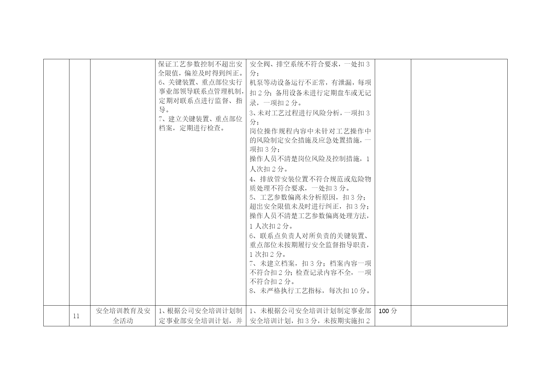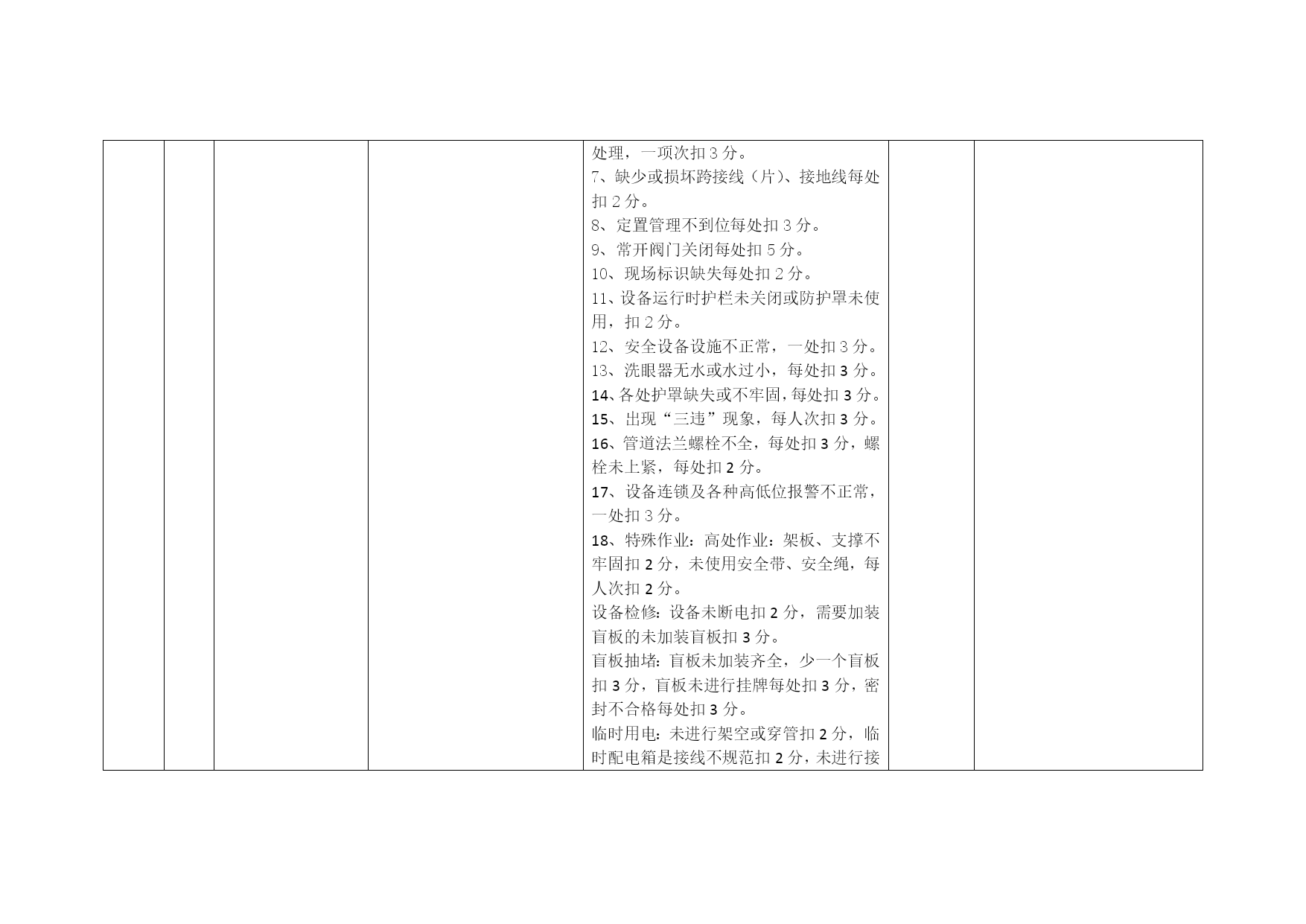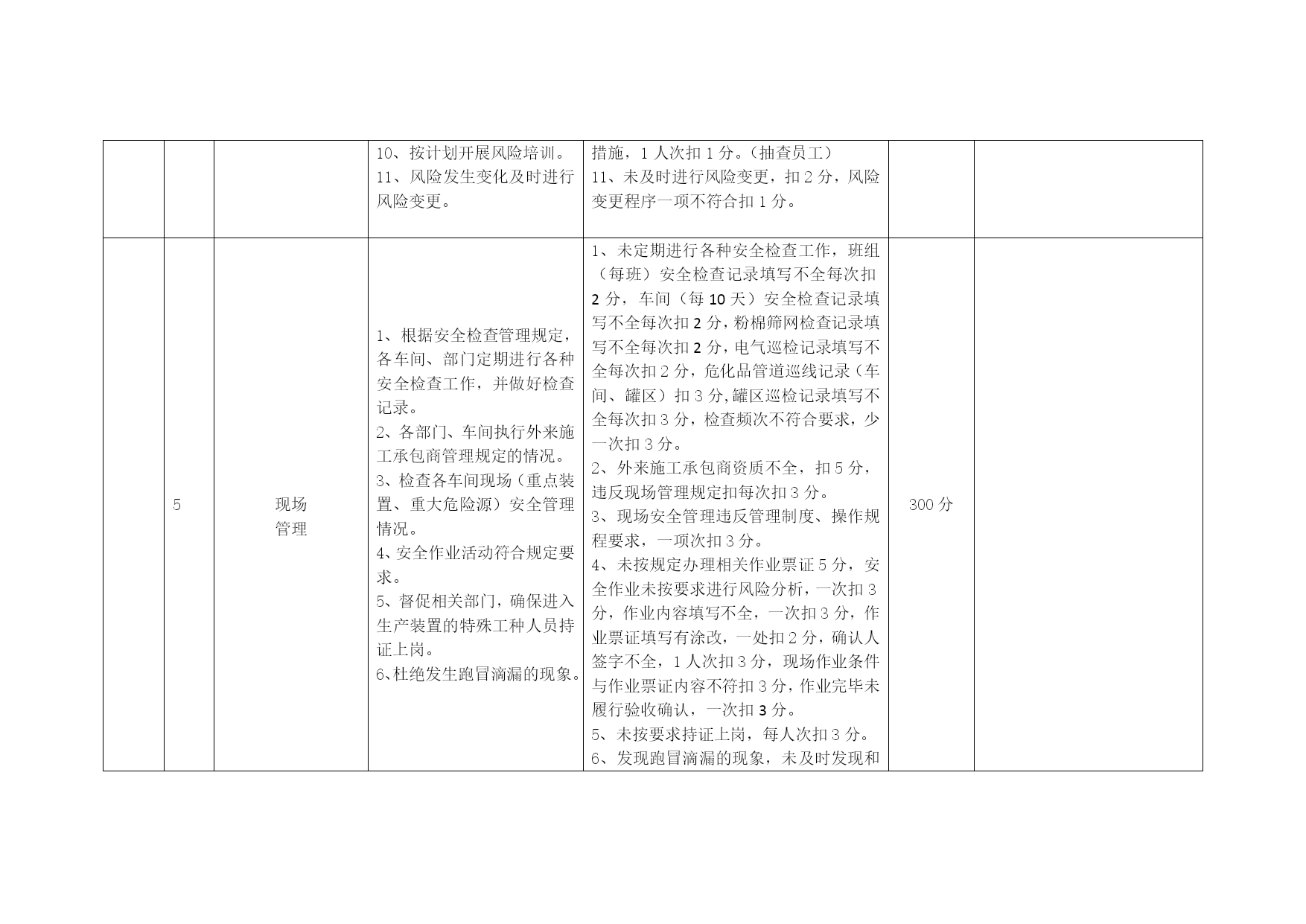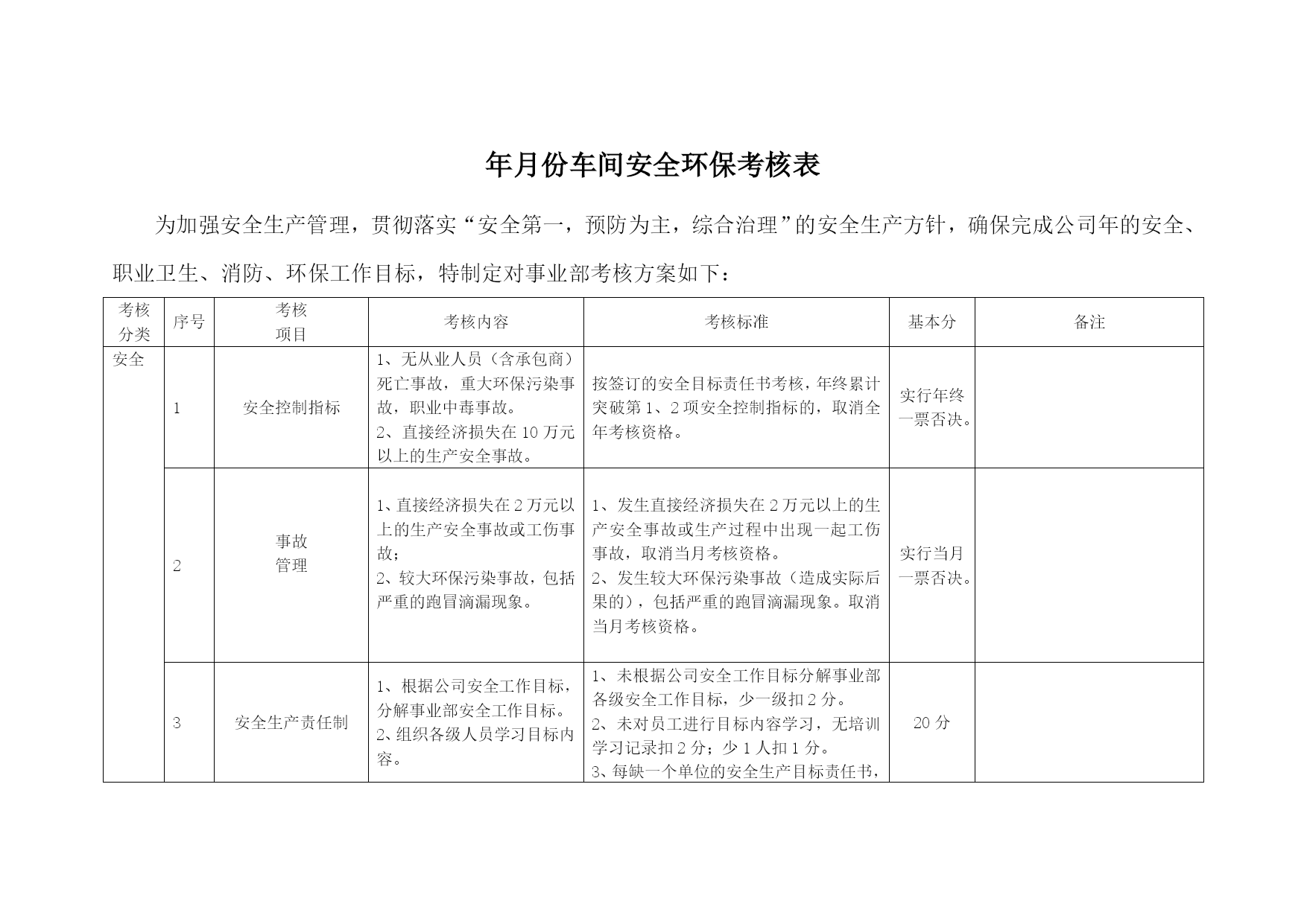 车间安全环保考核表优质资料(可以直接使用,可编辑优质资料,欢迎下载)年月份车间安全环保考核表为加强安全生产管理,贯彻落实“安全第一,预防为主,综合治理”的安全生产方针,确保完成公司年的安全、职业卫生、消防、环保工作目标,特制定对事业部考核方案如下:考核分类序号考核项目考核内容考核标准基本分备注安全1安全控制指标1、无从业人员(含承包商)死亡事故,重大环保污染事故,职业中毒事故。2、直接经济损失在10万元以上的生产安全事故。按签订的安全目标责任书考核,年终累计突破第1、2项安全控制指标的,取消全年考核资格。实行年终一票否决。2事故管理1、直接经济损失在2万元以上的生产安全事故或工伤事故;2、较大环保污染事故,包括严重的跑冒滴漏现象。1、发生直接经济损失在2万元以上的生产安全事故或生产过程中出现一起工伤事故,取消当月考核资格。2、发生较大环保污染事故(造成实际后果的),包括严重的跑冒滴漏现象。取消当月考核资格。实行当月一票否决。3安全生产责任制根据公司安全工作目标,分解事业部安全工作目标。组织各级人员学习目标内容。根据工作目标,各级签订安全目标责任书。根据工作目标,制定各单位的安全工作计划。5、每月进行考核,安全考核内容符合安全职责要求。未根据公司安全工作目标分解事业部各级安全工作目标,少一级扣2分。未对员工进行目标内容学习,无培训学习记录扣2分;少1人扣1分。每缺一个单位的安全生产目标责任书,扣2分;安全生产目标责任书内容与安全职责不符,每项扣1分。事业部未制定各级单位未制定年度安全生产工作计划,缺一个单位扣2分。安全考核内容不全,缺1项扣1分。未按要求进行各级安全责任制考核,少一级扣2分,少1人扣1分。20分4风险管理明确风险评价的目的、频次、工作程序。明确各部门及有关人员在开展风险评价过程中的职责和任务。选定风险评价方法开展风险评价工作。建立作业活动清单和设备、设施清单。5、根据规定的频次和时机,开展危险、有害因素辨识、风险评价。6、各级管理人员参加风险评价工作,厂级评价组织应有企业负责人参加;车间级评价组织应有车间负责人参加。7、根据风险评价的结果,建立重大风险清单。8、根据风险情况制定风险控制措施。9、制定风险管理培训计划。10、按计划开展风险培训。11、风险发生变化及时进行风险变更。未明确风险评价的目的、频次、工作程序,一项不符合扣1分;未明确各部门及有关人员的职责和任务,一项不符合扣1分,员工不了解风险评价的内容,1人次扣1分。(将以抽查负责人或员工的方式进行考核)有关人员不清楚或未掌握选定的风险评价方法,1人次扣1分。未建立作业活动清单、设备设施清单,每一项不符合扣1分。危险、有害因素识别、评价不全面或不正确,一项扣1分。6、各级管理人员及从业人员未参与风险评价工作,1人次扣1分。(查看记录及照片)7、未建立重大风险清单,扣2分;8、风险控制措施缺乏针对性、可操作性和可靠性,一项扣1分。9、没有风险管理培训教育计划,扣1分,培训教育记录缺少风险评价内容,一项扣1分。10、从业人员不了解本岗位风险及其控制措施,1人次扣1分。(抽查员工)11、未及时进行风险变更,扣2分,风险变更程序一项不符合扣1分。20分5现场管理1、根据安全检查管理规定,各车间、部门定期进行各种安全检查工作,并做好检查记录。2、各部门、车间执行外来施工承包商管理规定的情况。3、检查各车间现场(重点装置、重大危险源)安全管理情况。4、安全作业活动符合规定要求。5、督促相关部门,确保进入生产装置的特殊工种人员持证上岗。6、杜绝发生跑冒滴漏的现象。1、未定期进行各种安全检查工作,班组(每班)安全检查记录填写不全每次扣2分,车间(每10天)安全检查记录填写不全每次扣2分,粉棉筛网检查记录填写不全每次扣2分,电气巡检记录填写不全每次扣2分,危化品管道巡线记录(车间、罐区)扣3分,罐区巡检记录填写不全每次扣3分,检查频次不符合要求,少一次扣3分。2、外来施工承包商资质不全,扣5分,违反现场管理规定扣每次扣3分。3、现场安全管理违反管理制度、操作规程要求,一项次扣3分。4、未按规定办理相关作业票证5分,安全作业未按要求进行风险分析,一次扣3分,作业内容填写不全,一次扣3分,作业票证填写有涂改,一处扣2分,确认人签字不全,1人次扣3分,现场作业条件与作业票证内容不符扣3分,作业完毕未履行验收确认,一次扣3分。5、未按要求持证上岗,每人次扣3分。6、发现跑冒滴漏的现象,未及时发现和处理,一项次扣3分。7、缺少或损坏跨接线(片)、接地线每处扣2分。8、定置管理不到位每处扣3分。9、常开阀门关闭每处扣5分。10、现场标识缺失每处扣2分。1