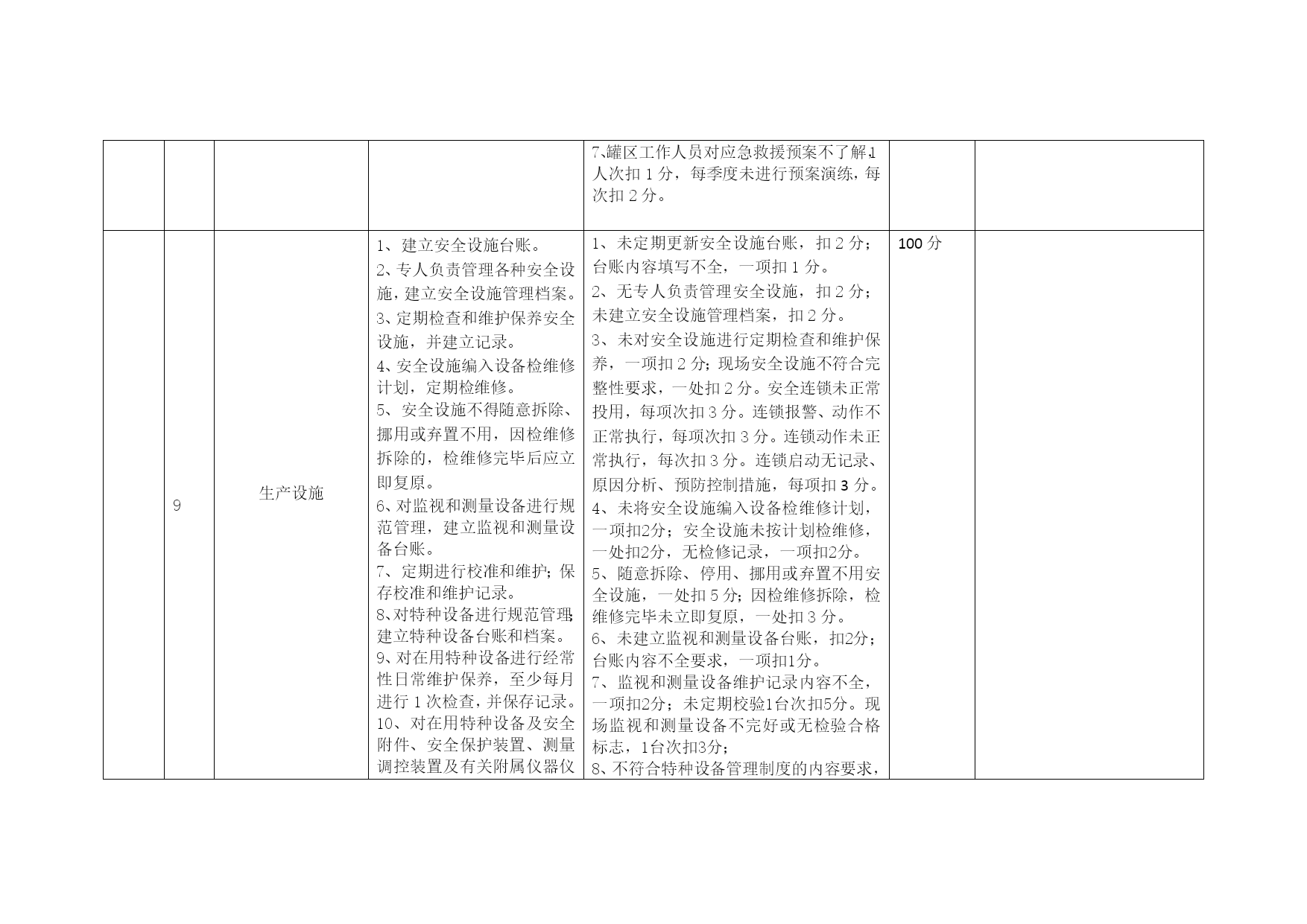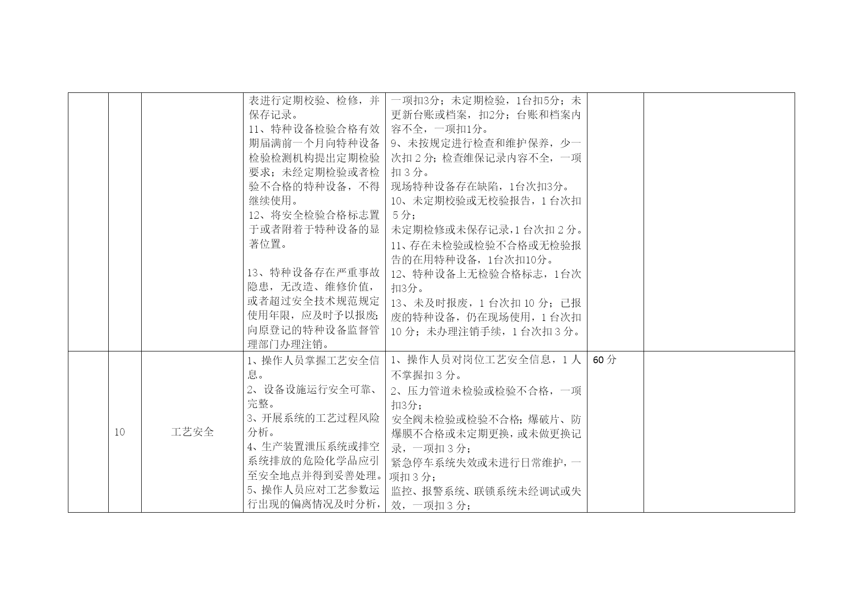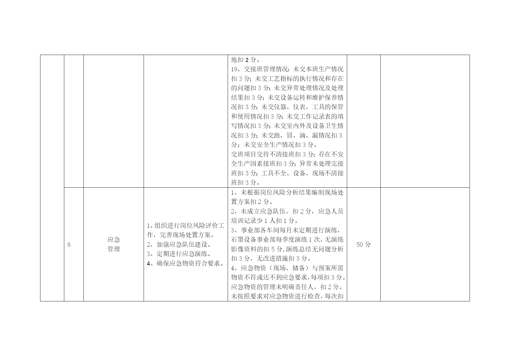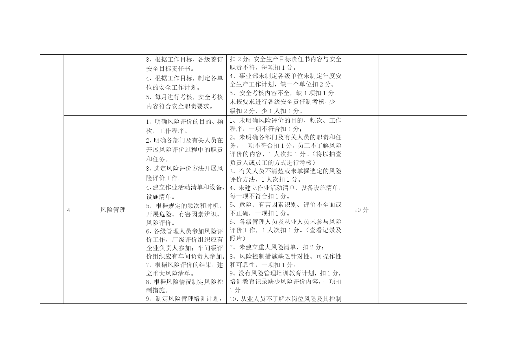 车间安全环保考核表优质资料(可以直接使用,可编辑优质资料,欢迎下载)年月份车间安全环保考核表为加强安全生产管理,贯彻落实“安全第一,预防为主,综合治理”的安全生产方针,确保完成公司年的安全、职业卫生、消防、环保工作目标,特制定对事业部考核方案如下:考核分类序号考核项目考核内容考核标准基本分备注安全1安全控制指标1、无从业人员(含承包商)死亡事故,重大环保污染事故,职业中毒事故。2、直接经济损失在10万元以上的生产安全事故。按签订的安全目标责任书考核,年终累计突破第1、2项安全控制指标的,取消全年考核资格。实行年终一票否决。2事故管理1、直接经济损失在2万元以上的生产安全事故或工伤事故;2、较大环保污染事故,包括严重的跑冒滴漏现象。1、发生直接经济损失在2万元以上的生产安全事故或生产过程中出现一起工伤事故,取消当月考核资格。2、发生较大环保污染事故(造成实际后果的),包括严重的跑冒滴漏现象。取消当月考核资格。实行当月一票否决。3安全生产责任制根据公司安全工作目标,分解事业部安全工作目标。组织各级人员学习目标内容。根据工作目标,各级签订安全目标责任书。根据工作目标,制定各单位的安全工作计划。5、每月进行考核,安全考核内容符合安全职责要求。未根据公司安全工作目标分解事业部各级安全工作目标,少一级扣2分。未对员工进行目标内容学习,无培训学习记录扣2分;少1人扣1分。每缺一个单位的安全生产目标责任书,扣2分;安全生产目标责任书内容与安全职责不符,每项扣1分。事业部未制定各级单位未制定年度安全生产工作计划,缺一个单位扣2分。安全考核内容不全,缺1项扣1分。未按要求进行各级安全责任制考核,少一级扣2分,少1人扣1分。20分4风险管理明确风险评价的目的、频次、工作程序。明确各部门及有关人员在开展风险评价过程中的职责和任务。选定风险评价方法开展风险评价工作。建立作业活动清单和设备、设施清单。5、根据规定的频次和时机,开展危险、有害因素辨识、风险评价。6、各级管理人员参加风险评价工作,厂级评价组织应有企业负责人参加;车间级评价组织应有车间负责人参加。7、根据风险评价的结果,建立重大风险清单。8、根据风险情况制定风险控制措施。9、制定风险管理培训计划。10、按计划开展风险培训。11、风险发生变化及时进行风险变更。未明确风险评价的目的、频次、工作程序,一项不符合扣1分;未明确各部门及有关人员的职责和任务,一项不符合扣1分,员工不了解风险评价的内容,1人次扣1分。(将以抽查负责人或员工的方式进行考核)有关人员不清楚或未掌握选定的风险评价方法,1人次扣1分。未建立作业活动清单、设备设施清单,每一项不符合扣1分。危险、有害因素识别、评价不全面或不正确,一项扣1分。6、各级管理人员及从业人员未参与风险评价工作,1人次扣1分。(查看记录及照片)7、未建立重大风险清单,扣2分;8、风险控制措施缺乏针对性、可操作性和可靠性,一项扣1分。9、没有风险管理培训教育计划,扣1分,培训教育记录缺少风险评价内容,一项扣1分。10、从业人员不了解本岗位风险及其控制措施,1人次扣1分。(抽查员工)11、未及时进行风险变更,扣2分,风险变更程序一项不符合扣1分。20分5现场管理1、根据安全检查管理规定,各车间、部门定期进行各种安全检查工作,并做好检查记录。2、各部门、车间执行外来施工承包商管理规定的情况。3、检查各车间现场(重点装置、重大危险源)安全管理情况。4、安全作业活动符合规定要求。5、督促相关部门,确保进入生产装置的特殊工种人员持证上岗。6、杜绝发生跑冒滴漏的现象。1、未定期进行各种安全检查工作,班组(每班)安全检查记录填写不全每次扣2分,车间(每10天)安全检查记录填写不全每次扣2分,粉棉筛网检查记录填写不全每次扣2分,电气巡检记录填写不全每次扣2分,危化品管道巡线记录(车间、罐区)扣3分,罐区巡检记录填写不全每次扣3分,检查频次不符合要求,少一次扣3分。2、外来施工承包商资质不全,扣5分,违反现场管理规定扣每次扣3分。3、现场安全管理违反管理制度、操作规程要求,一项次扣3分。4、未按规定办理相关作业票证5分,安全作业未按要求进行风险分析,一次扣3分,作业内容填写不全,一次扣3分,作业票证填写有涂改,一处扣2分,确认人签字不全,1人次扣3分,现场作业条件与作业票证内容不符扣3分,作业完毕未履行验收确认,一次扣3分。5、未按要求持证上岗,每人次扣3分。6、发现跑冒滴漏的现象,未及时发现和处理,一项次扣3分。7、缺少或损坏跨接线(片)、接地线每处扣2分。8、定置管理不到位每处扣3分。9、常开阀门关闭每处扣5分。10、现场标识缺失每处扣2分。1