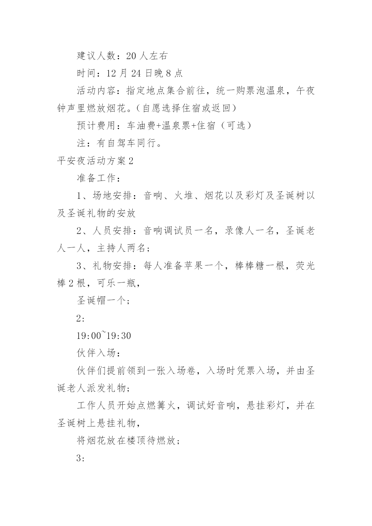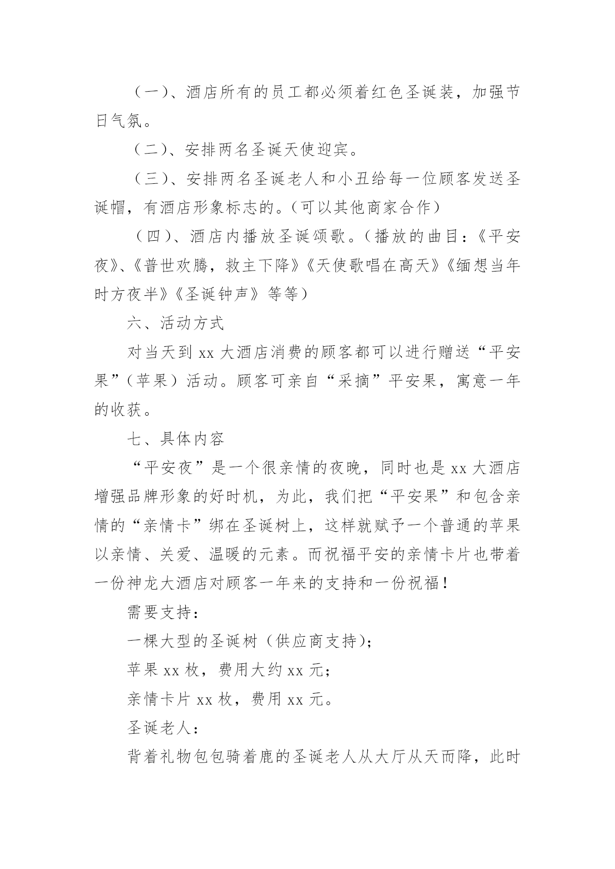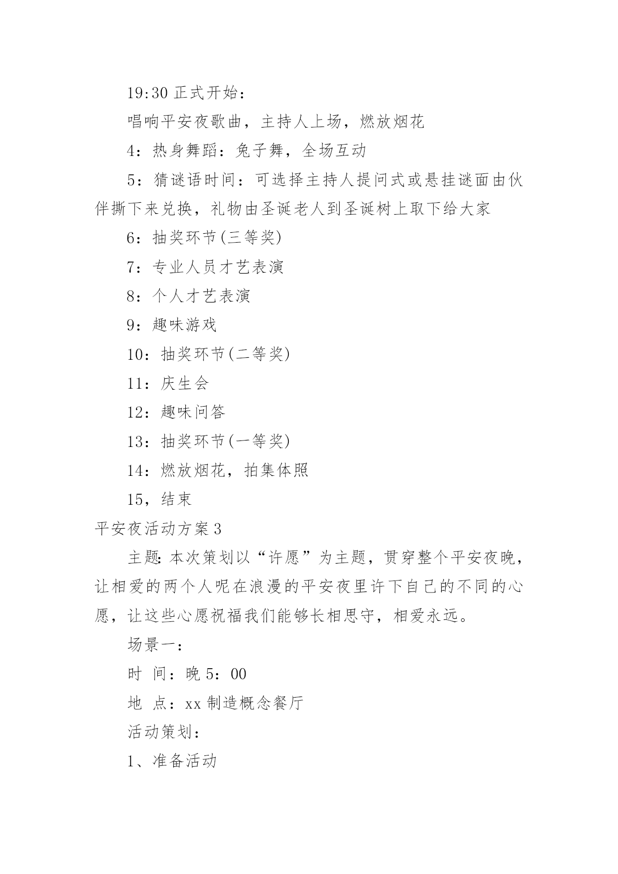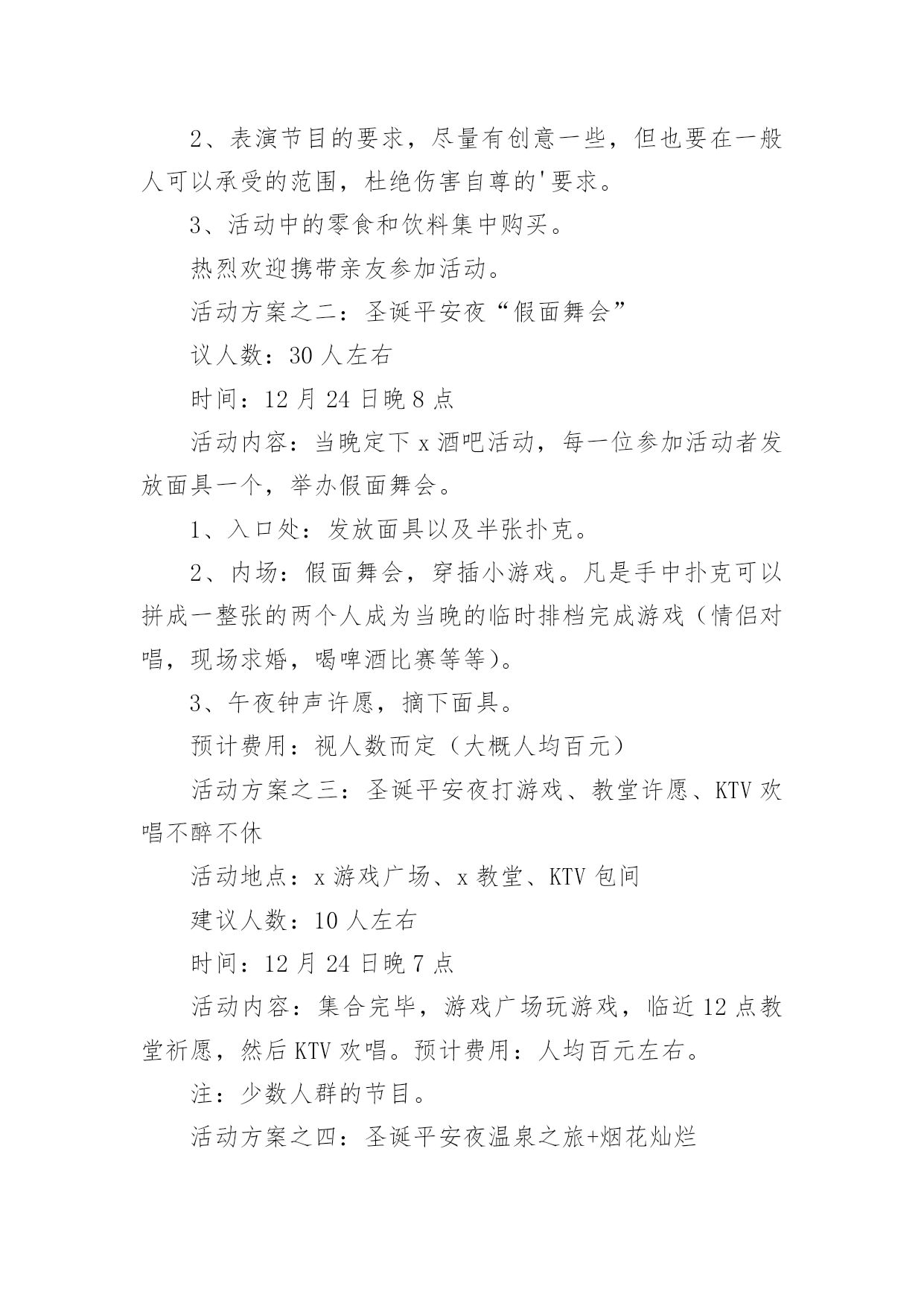 平安夜活动方案平安夜活动方案集锦15篇为保障事情或工作顺利开展,通常会被要求事先制定方案,方案是从目的、要求、方式、方法、进度等方面进行安排的书面计划。方案应该怎么制定呢?下面是小编整理的平安夜活动方案,仅供参考,希望能够帮助到大家。平安夜活动方案1活动方案之一:圣诞平安夜聚会活动时间:12月24日晚上20:00开始活动地点:x酒吧公园活动具体方案:每位参加的选手,事先准备好一份圣诞礼物,再将你要求收到礼物的人要表演的节目,写在一张纸条上,和礼物放在一起,然后包装起来。选手到达活动地点之后,将礼物交给活动主持人,主持人将礼物集中放在一起,并且在每份礼物上贴上号码,同时,准备相同号码的抽签条。所有选手到齐,活动开始之后,大家先抽签,抽签完毕之后,从抽到一号的选手开始,领取一号礼物,当场将礼物拆开,并按照礼物中那张纸条的要求表演节目。之后按号码顺序进行,所有参加选手机会均等,公平合理。如果不肯按要求表演节目的人,将被惩罚。活动注意事项:1、礼物中的纸条不要署名。2、表演节目的要求,尽量有创意一些,但也要在一般人可以承受的范围,杜绝伤害自尊的'要求。3、活动中的零食和饮料集中购买。热烈欢迎携带亲友参加活动。活动方案之二:圣诞平安夜“假面舞会”议人数:30人左右时间:12月24日晚8点活动内容:当晚定下x酒吧活动,每一位参加活动者发放面具一个,举办假面舞会。1、入口处:发放面具以及半张扑克。2、内场:假面舞会,穿插小游戏。凡是手中扑克可以拼成一整张的两个人成为当晚的临时排档完成游戏(情侣对唱,现场求婚,喝啤酒比赛等等)。3、午夜钟声许愿,摘下面具。预计费用:视人数而定(大概人均百元)活动方案之三:圣诞平安夜打游戏、教堂许愿、KTV欢唱不醉不休活动地点:x游戏广场、x教堂、KTV包间建议人数:10人左右时间:12月24日晚7点活动内容:集合完毕,游戏广场玩游戏,临近12点教堂祈愿,然后KTV欢唱。预计费用:人均百元左右。注:少数人群的节目。活动方案之四:圣诞平安夜温泉之旅+烟花灿烂建议人数:20人左右时间:12月24日晚8点活动内容:指定地点集合前往,统一购票泡温泉,午夜钟声里燃放烟花。(自愿选择住宿或返回)预计费用:车油费+温泉票+住宿(可选)注:有自驾车同行。平安夜活动方案2准备工作:1、场地安排:音响、火堆、烟花以及彩灯及圣诞树以及圣诞礼物的安放2、人员安排:音响调试员一名,录像人一名,圣诞老人一人,主持人两名;3、礼物安排:每人准备苹果一个,棒棒糖一根,荧光棒2根,可乐一瓶,圣诞帽一个;2:19:00~19:30伙伴入场:伙伴们提前领到一张入场卷,入场时凭票入场,并由圣诞老人派发礼物;工作人员开始点燃篝火,调试好音响,悬挂彩灯,并在圣诞树上悬挂礼物,将烟花放在楼顶待燃放;3:19:30正式开始:唱响平安夜歌曲,主持人上场,燃放烟花4:热身舞蹈:兔子舞,全场互动5:猜谜语时间:可选择主持人提问式或悬挂谜面由伙伴撕下来兑换,礼物由圣诞老人到圣诞树上取下给大家6:抽奖环节(三等奖)7:专业人员才艺表演8:个人才艺表演9:趣味游戏10:抽奖环节(二等奖)11:庆生会12:趣味问答13:抽奖环节(一等奖)14:燃放烟花,拍集体照15,结束平安夜活动方案3主题:本次策划以“许愿”为主题,贯穿整个平安夜晚,让相爱的两个人呢在浪漫的平安夜里许下自己的不同的心愿,让这些心愿祝福我们能够长相思守,相爱永远。场景一:时间:晚5:00地点:xx制造概念餐厅活动策划:1、准备活动事先前往约会地点踩点,和服务员沟通好,定好位置,最好是19号桌,这是我们共同的幸运日,沟通好晚上自己的一些想法,把礼物寄存到吧台。2、提前到达约会地点,把第一份礼物——许愿瓶放到她的椅子底下,等她来了以后,先吃晚餐。然后,中途借机会去洗手间。3、来到表演的舞台,由于事先和乐队及主持人打好了招呼,来到舞台进行爱情表白。在这个浪漫的夜晚,要感谢我爱的人。一年前的圣诞节,我许下了一个愿望,在15年遇到我相爱的人,17天以后,我就实现了这个愿望,一年里,我们相识,相知,相恋,相爱,348个日日夜夜,我们共同走过。在这里,我要送给我的爱人第一份圣诞礼物,在她的凳子底下,一个许愿瓶,在所有朋友们的祝福下,我们共同把我们的心愿写在纸上,装进许愿瓶,每年的`今天,我们都会放进共同的心愿,十年后,再开启。也祝愿所有在场的有情人能梦想成真,幸福美满。然后神情的走到阳阳面前,相拥相吻。(请乐队奏本晚主题曲《许愿》场景二:时间:晚饭后地点:xx广场海边活动策划:1、晚饭后,打车来到XX广场,来到脚印旁边的海边。2、拿出第二份礼物——许愿灯。相继在灯上写下我们的新的一年的心愿,然后共同放飞许愿灯到天空,让我们的愿望飞上天空,让上天见证我们的爱情,对着大海和天空,看着冉冉上升上的愿望灯,抱着自己相爱的人