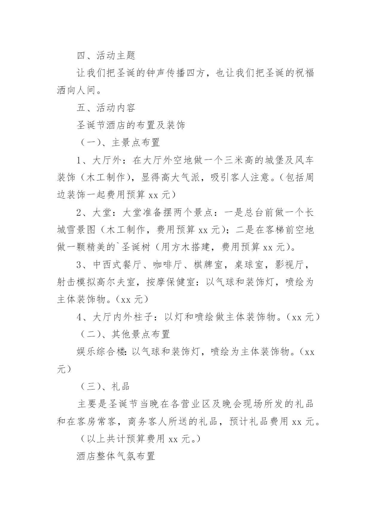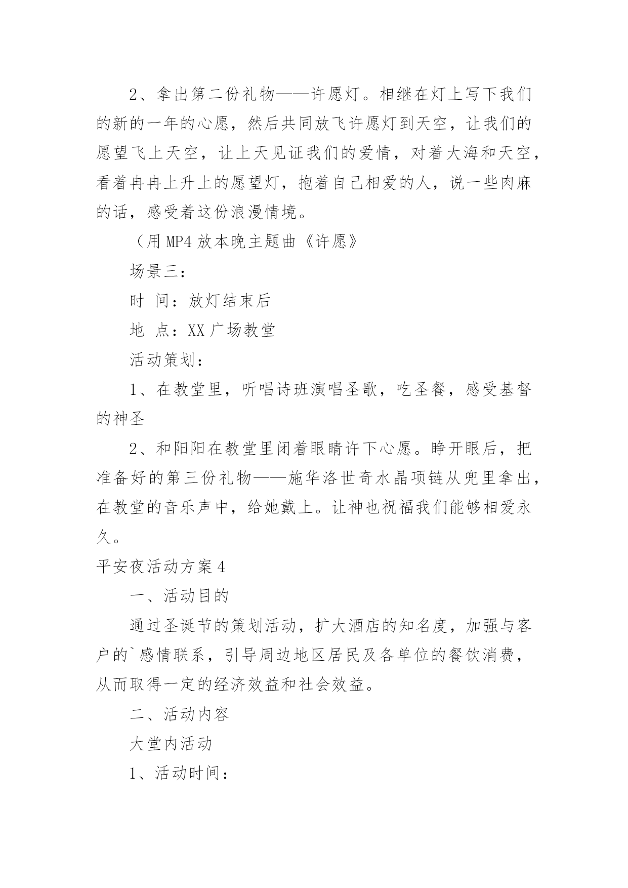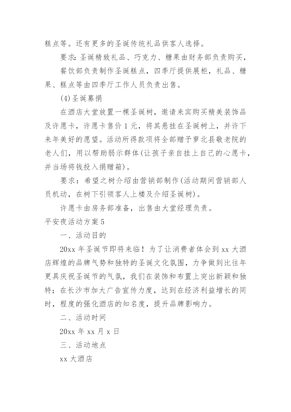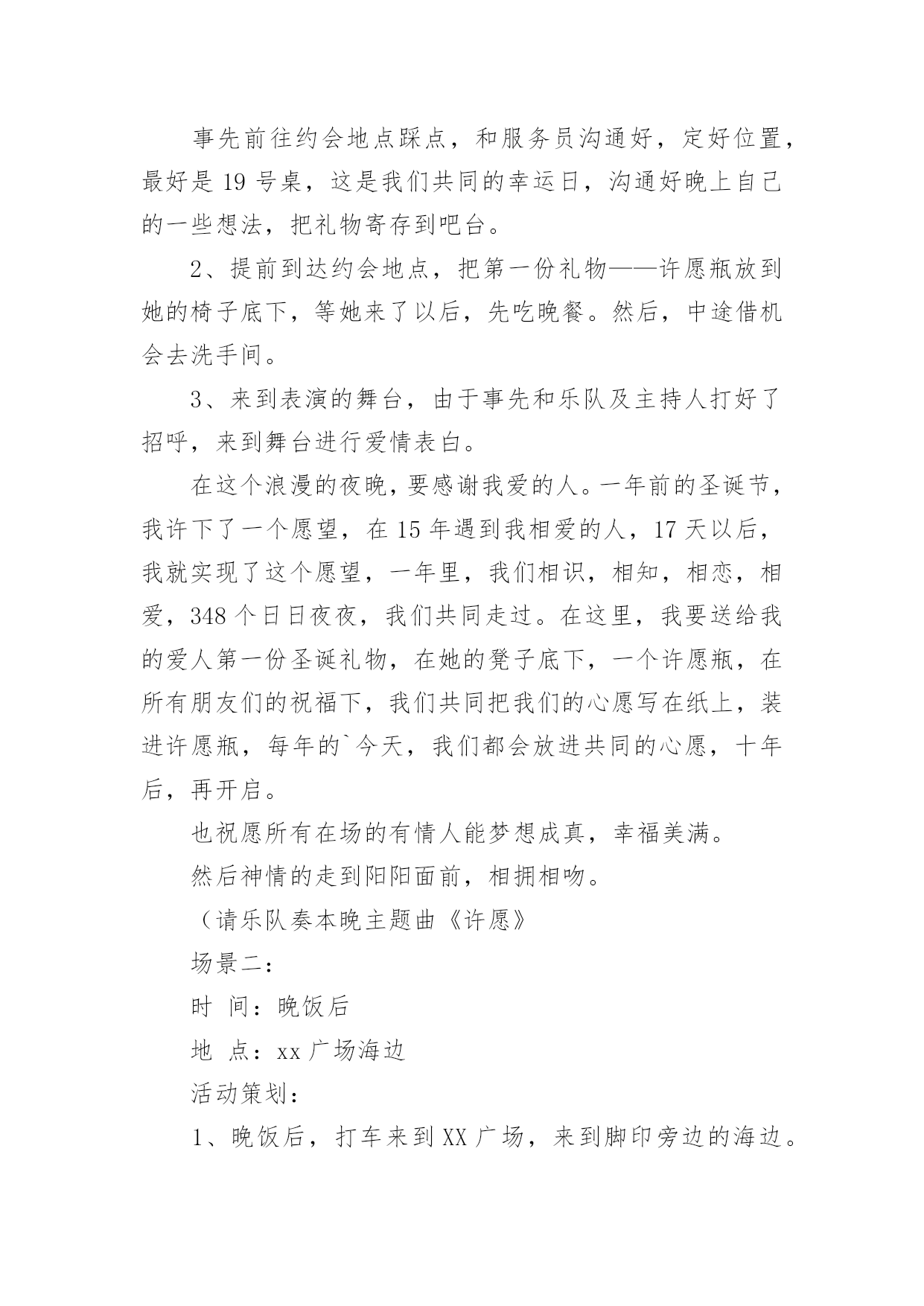 平安夜活动方案平安夜活动方案集锦15篇为保障事情或工作顺利开展,通常会被要求事先制定方案,方案是从目的、要求、方式、方法、进度等方面进行安排的书面计划。方案应该怎么制定呢?下面是小编整理的平安夜活动方案,仅供参考,希望能够帮助到大家。平安夜活动方案1活动方案之一:圣诞平安夜聚会活动时间:12月24日晚上20:00开始活动地点:x酒吧公园活动具体方案:每位参加的选手,事先准备好一份圣诞礼物,再将你要求收到礼物的人要表演的节目,写在一张纸条上,和礼物放在一起,然后包装起来。选手到达活动地点之后,将礼物交给活动主持人,主持人将礼物集中放在一起,并且在每份礼物上贴上号码,同时,准备相同号码的抽签条。所有选手到齐,活动开始之后,大家先抽签,抽签完毕之后,从抽到一号的选手开始,领取一号礼物,当场将礼物拆开,并按照礼物中那张纸条的要求表演节目。之后按号码顺序进行,所有参加选手机会均等,公平合理。如果不肯按要求表演节目的人,将被惩罚。活动注意事项:1、礼物中的纸条不要署名。2、表演节目的要求,尽量有创意一些,但也要在一般人可以承受的范围,杜绝伤害自尊的'要求。3、活动中的零食和饮料集中购买。热烈欢迎携带亲友参加活动。活动方案之二:圣诞平安夜“假面舞会”议人数:30人左右时间:12月24日晚8点活动内容:当晚定下x酒吧活动,每一位参加活动者发放面具一个,举办假面舞会。1、入口处:发放面具以及半张扑克。2、内场:假面舞会,穿插小游戏。凡是手中扑克可以拼成一整张的两个人成为当晚的临时排档完成游戏(情侣对唱,现场求婚,喝啤酒比赛等等)。3、午夜钟声许愿,摘下面具。预计费用:视人数而定(大概人均百元)活动方案之三:圣诞平安夜打游戏、教堂许愿、KTV欢唱不醉不休活动地点:x游戏广场、x教堂、KTV包间建议人数:10人左右时间:12月24日晚7点活动内容:集合完毕,游戏广场玩游戏,临近12点教堂祈愿,然后KTV欢唱。预计费用:人均百元左右。注:少数人群的节目。活动方案之四:圣诞平安夜温泉之旅+烟花灿烂建议人数:20人左右时间:12月24日晚8点活动内容:指定地点集合前往,统一购票泡温泉,午夜钟声里燃放烟花。(自愿选择住宿或返回)预计费用:车油费+温泉票+住宿(可选)注:有自驾车同行。平安夜活动方案2准备工作:1、场地安排:音响、火堆、烟花以及彩灯及圣诞树以及圣诞礼物的安放2、人员安排:音响调试员一名,录像人一名,圣诞老人一人,主持人两名;3、礼物安排:每人准备苹果一个,棒棒糖一根,荧光棒2根,可乐一瓶,圣诞帽一个;2:19:00~19:30伙伴入场:伙伴们提前领到一张入场卷,入场时凭票入场,并由圣诞老人派发礼物;工作人员开始点燃篝火,调试好音响,悬挂彩灯,并在圣诞树上悬挂礼物,将烟花放在楼顶待燃放;3:19:30正式开始:唱响平安夜歌曲,主持人上场,燃放烟花4:热身舞蹈:兔子舞,全场互动5:猜谜语时间:可选择主持人提问式或悬挂谜面由伙伴撕下来兑换,礼物由圣诞老人到圣诞树上取下给大家6:抽奖环节(三等奖)7:专业人员才艺表演8:个人才艺表演9:趣味游戏10:抽奖环节(二等奖)11:庆生会12:趣味问答13:抽奖环节(一等奖)14:燃放烟花,拍集体照15,结束平安夜活动方案3主题:本次策划以“许愿”为主题,贯穿整个平安夜晚,让相爱的两个人呢在浪漫的平安夜里许下自己的不同的心愿,让这些心愿祝福我们能够长相思守,相爱永远。场景一:时间:晚5:00地点:xx制造概念餐厅活动策划:1、准备活动事先前往约会地点踩点,和服务员沟通好,定好位置,最好是19号桌,这是我们共同的幸运日,沟通好晚上自己的一些想法,把礼物寄存到吧台。2、提前到达约会地点,把第一份礼物——许愿瓶放到她的椅子底下,等她来了以后,先吃晚餐。然后,中途借机会去洗手间。3、来到表演的舞台,由于事先和乐队及主持人打好了招呼,来到舞台进行爱情表白。在这个浪漫的夜晚,要感谢我爱的人。一年前的圣诞节,我许下了一个愿望,在15年遇到我相爱的人,17天以后,我就实现了这个愿望,一年里,我们相识,相知,相恋,相爱,348个日日夜夜,我们共同走过。在这里,我要送给我的爱人第一份圣诞礼物,在她的凳子底下,一个许愿瓶,在所有朋友们的祝福下,我们共同把我们的心愿写在纸上,装进许愿瓶,每年的`今天,我们都会放进共同的心愿,十年后,再开启。也祝愿所有在场的有情人能梦想成真,幸福美满。然后神情的走到阳阳面前,相拥相吻。(请乐队奏本晚主题曲《许愿》场景二:时间:晚饭后地点:xx广场海边活动策划:1、晚饭后,打车来到XX广场,来到脚印旁边的海边。2、拿出第二份礼物——许愿灯。相继在灯上写下我们的新的一年的心愿,然后共同放飞许愿灯到天空,让我们的愿望飞上天空,让上天见证我们的爱情,对着大海和天空,看着冉冉上升上的愿望灯,抱着自己相爱的人