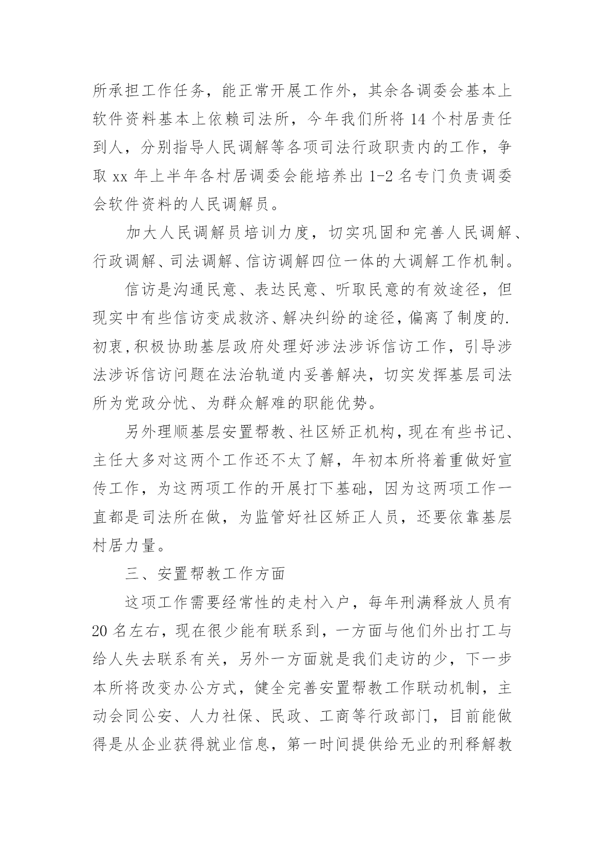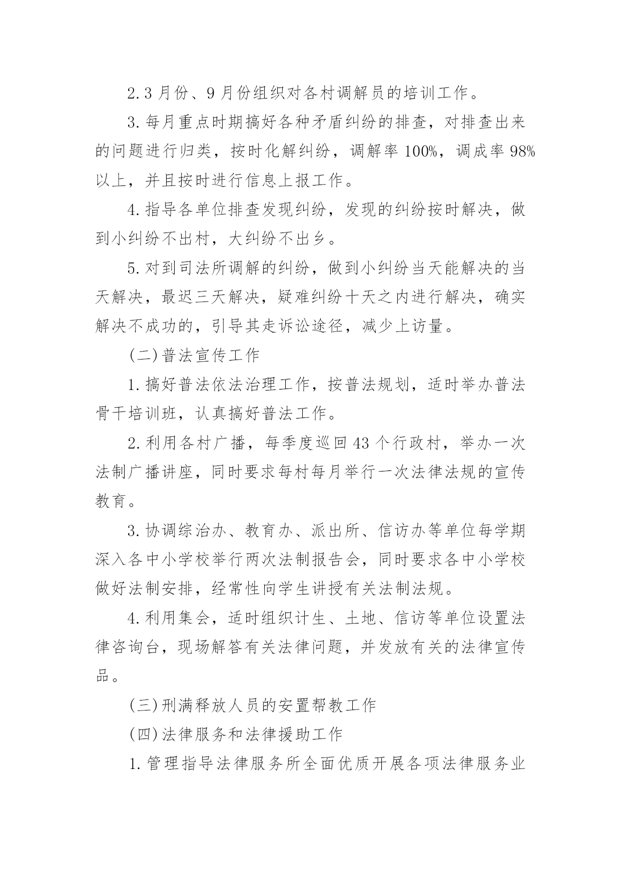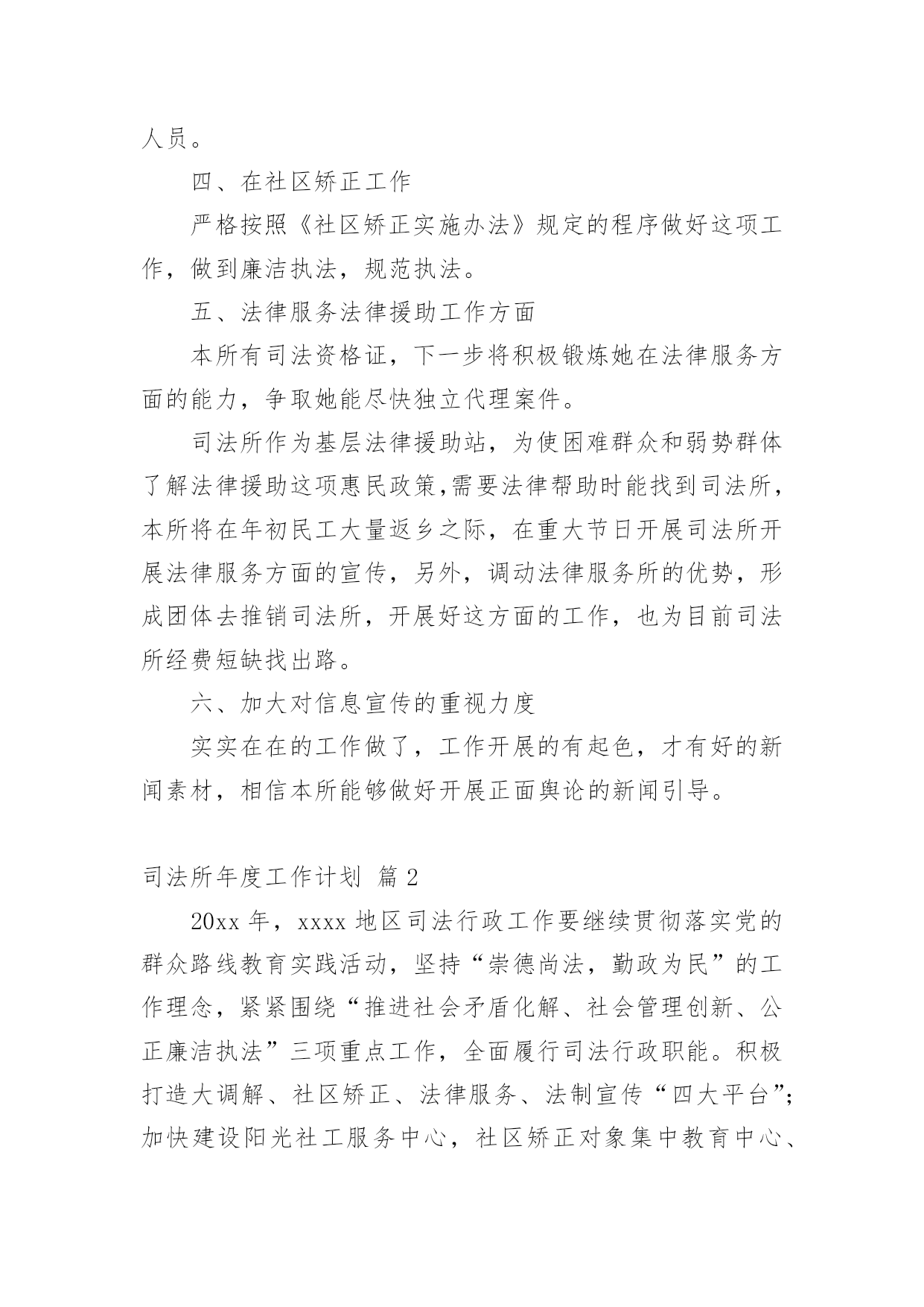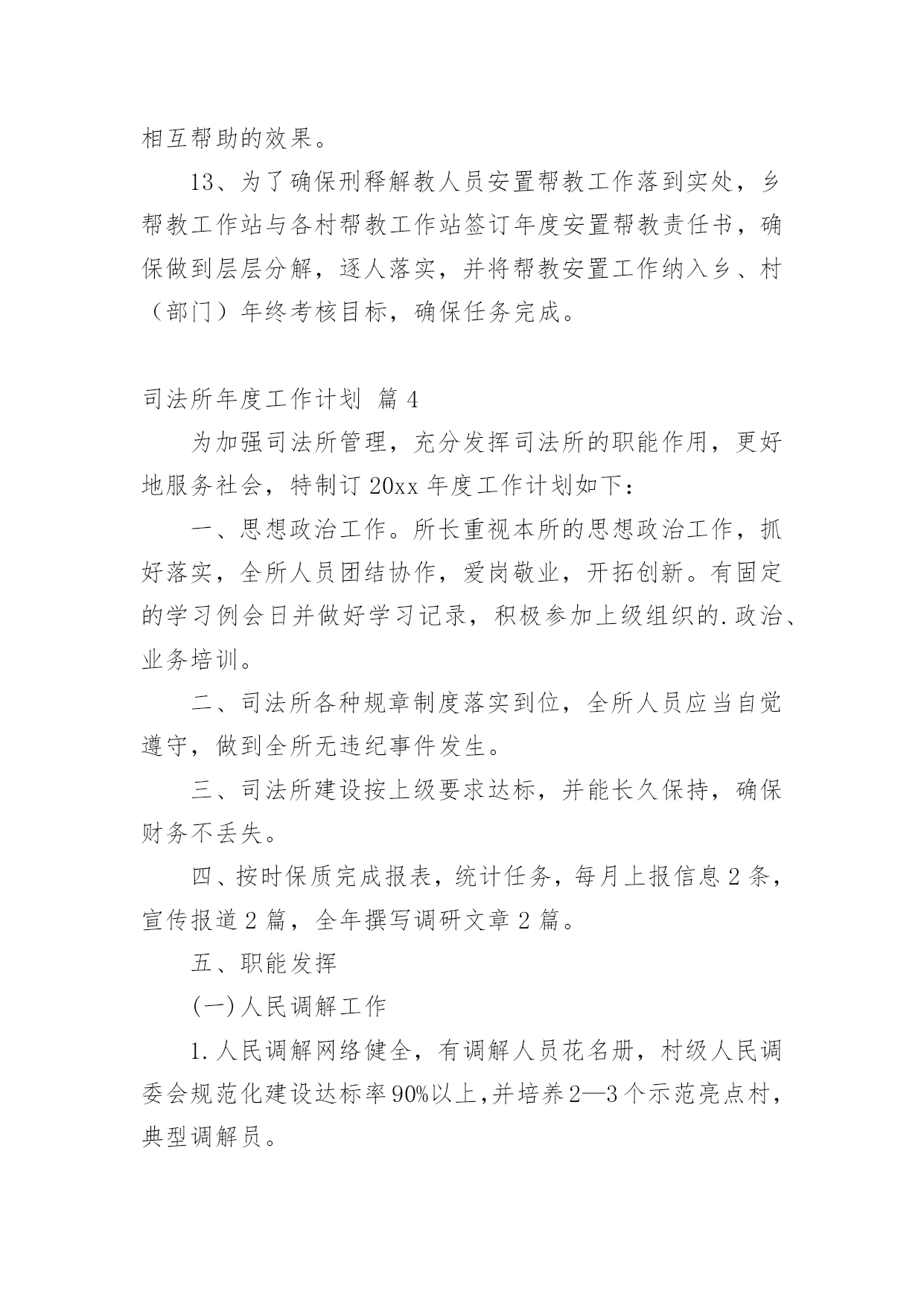 司法所年度工作计划司法所年度工作计划四篇日子在弹指一挥间就毫无声息的流逝,又将迎来新的工作,新的挑战,请一起努力,写一份计划吧。想学习拟定计划却不知道该请教谁?以下是小编帮大家整理的司法所年度工作计划4篇,欢迎阅读与收藏。司法所年度工作计划篇1一、在司法所建设工作方面,着重加强司法所队伍建设我所将以打造一支“讲责任、重感情、作风强、素质高”的司法行政干警为目标,加强司法所队伍建设,定期开展岗位练兵或业务主题实践活动,鼓励督促干警参加国家司法考试、自学考试,提高信息化应用水平,并充分利用“省干部在线学习”、“科学发展大讲堂”等学习平台,教育全体党员保持先进性和纯洁性,在充分调动工作人员的工作积极性方面做到所内纪律严明、分工明确、责任落实,财务公开、奖惩分明。提高司法所工作人员在做好新形势下群众工作能力、维护社会公平正义能力、新媒体时代舆论引导能力、科技信息化应用能力、拒腐防变能力。二、在人民调解工作方面全镇已建立16个镇、村级人民调解委员会,xx年7月,镇又成立了劳动争议调解中心,目前镇调委会因为是由司法所承担工作任务,能正常开展工作外,其余各调委会基本上软件资料基本上依赖司法所,今年我们所将14个村居责任到人,分别指导人民调解等各项司法行政职责内的工作,争取xx年上半年各村居调委会能培养出1-2名专门负责调委会软件资料的人民调解员。加大人民调解员培训力度,切实巩固和完善人民调解、行政调解、司法调解、信访调解四位一体的大调解工作机制。信访是沟通民意、表达民意、听取民意的有效途径,但现实中有些信访变成救济、解决纠纷的途径,偏离了制度的.初衷,积极协助基层政府处理好涉法涉诉信访工作,引导涉法涉诉信访问题在法治轨道内妥善解决,切实发挥基层司法所为党政分忧、为群众解难的职能优势。另外理顺基层安置帮教、社区矫正机构,现在有些书记、主任大多对这两个工作还不太了解,年初本所将着重做好宣传工作,为这两项工作的开展打下基础,因为这两项工作一直都是司法所在做,为监管好社区矫正人员,还要依靠基层村居力量。三、安置帮教工作方面这项工作需要经常性的走村入户,每年刑满释放人员有20名左右,现在很少能有联系到,一方面与他们外出打工与给人失去联系有关,另外一方面就是我们走访的少,下一步本所将改变办公方式,健全完善安置帮教工作联动机制,主动会同公安、人力社保、民政、工商等行政部门,目前能做得是从企业获得就业信息,第一时间提供给无业的刑释解教人员。四、在社区矫正工作严格按照《社区矫正实施办法》规定的程序做好这项工作,做到廉洁执法,规范执法。五、法律服务法律援助工作方面本所有司法资格证,下一步将积极锻炼她在法律服务方面的能力,争取她能尽快独立代理案件。司法所作为基层法律援助站,为使困难群众和弱势群体了解法律援助这项惠民政策,需要法律帮助时能找到司法所,本所将在年初民工大量返乡之际,在重大节日开展司法所开展法律服务方面的宣传,另外,调动法律服务所的优势,形成团体去推销司法所,开展好这方面的工作,也为目前司法所经费短缺找出路。六、加大对信息宣传的重视力度实实在在的工作做了,工作开展的有起色,才有好的新闻素材,相信本所能够做好开展正面舆论的新闻引导。司法所年度工作计划篇220xx年,xxxx地区司法行政工作要继续贯彻落实党的群众路线教育实践活动,坚持“崇德尚法,勤政为民”的工作理念,紧紧围绕“推进社会矛盾化解、社会管理创新、公正廉洁执法”三项重点工作,全面履行司法行政职能。积极打造大调解、社区矫正、法律服务、法制宣传“四大平台”;加快建设阳光社工服务中心,社区矫正对象集中教育中心、心理咨询指导中心,刑满释放解除劳教人员技能培训中心,具体工作计划如下一、夯实基层基础这是推动司法行政工作持续发展的根基所在,坚持司法工作重心下移到街道、社区一级,把基层工作是否落实、基础工作是否扎实作为衡量工作实绩的重要标志,下大力气使基层法律服务工作活跃起来、整合起来、规范起来,健全完善区、街道、社区三级调解网络,推进安置帮教工作向纵深发展,不断规范、完善制度建设,以多形式多方法开展帮教,确保社会稳定。要按照《XX区司法行政系统基层基础设施建设“十一五”规划》的要求及年度计划,积极争取各级财政支持,扎实推进司法所规范化建设。二、发挥法律援助维权功能深入开展法律援助工作,加强法律援助工作的制度化、规范化建设,整合资源,加大华考|zk168办理法律援助案件的力度,加强法律援助队伍建设,努力提高法律援助服务质量和人员素质,积极开展法律援助的宣传工作,强化法律援助外部联动机制作用,进一步扩大社会影响力。及时帮助解决群众来电、来访的涉法事项,做到应援尽援,维护社会弱势群体合法权益。三、大力推进民主法制建设要实现普法依法治理工作的制度化、规范化。加强对各层次人员的普法教育工作,将各种普法形式推向生活,