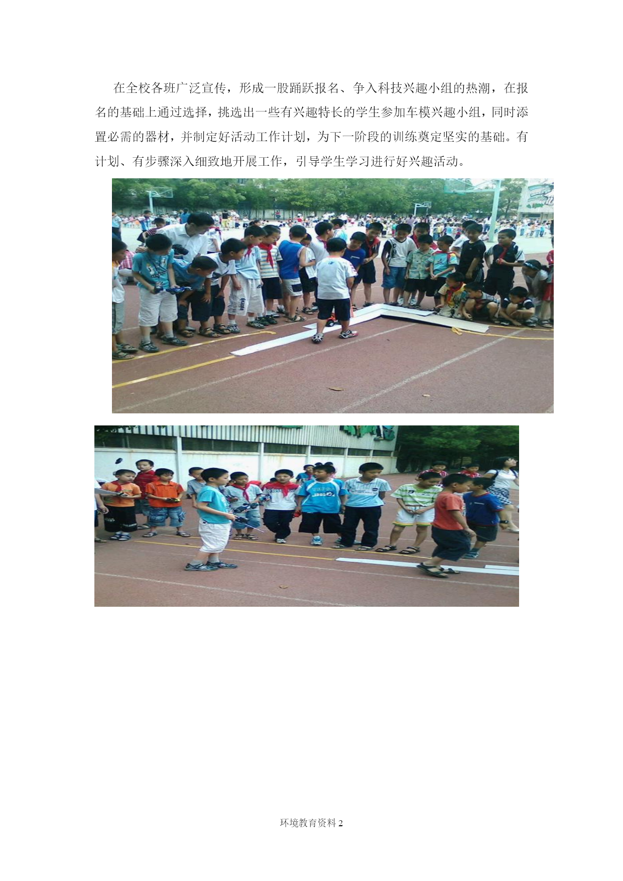 环境教育资料2012-2013学年度第二学期东莞市茶山镇第三小学第二课堂车模小组教学工作总结执笔人:陈锡斌近几年来,我校积极响应党中央关于“在青少年中普及科技”和落实《全民健身计划纲要》的号召,开展多项科技活动,丰富少年儿童课余文化生活,更好地发展他们的个性,发挥他们的特长,促进青少年德、智、体、美、劳全面发展,在2012学年,学校的车模兴趣小组继续以培养学生创造能力和动手实践能力为主要目标,根据教导处工作安排,进行每月一次活动,本组参加学生有12人,主要地点放在学校教室和操场。现将本学年兴趣小组工作总结如下:一、动手操作,提高学习兴趣。通过这一学年的车模教学,深深体会到同学们对这一兴趣活动的喜爱。车模不仅因为它具有趣味性,而且还是一项科技活动和劳技活动。通过活动,学生们了解了许多材料的性能,掌握了工具的使用方法和完成成品的工艺过程,培养了学生爱劳动、爱科学,既能动手又能动脑和克服困难勇于进取的品质。二、开发智力,激发学生想像。车模活动给了学生一个充分展示才能和想象力的舞台,为学生提供了一个开发智力和培养能力的好机会。也激发学生参与劳动实践活动的积极性,通过亲身实践,学生更多的了解科学知识在生产实践中的应用,从而产生积极情感,逐步形成在日常生活学习中喜爱质疑,乐于探索,努力求知的心理倾向。在车模活动中学生确实学到了不少的知识,他们学会了四驱车拼装、操控以及改装,这项兴趣活动给学生提供了智力开发,科技成材的舞台。同学们体验了科技与体育相结合的快乐。也学会了仔细辨别材料,熟练使用工具,在实践中增长了创新意识,培养了创新能力。三、观察生活,提高环保意识。学生观察不同汽车和车模,通过学习和实践,大家对我们周围的汽车类型、燃料、动力更加了解了,并且对环保车辆有了更多的了解,并且在学习实践过程中我们还渗透环境保护的意义和方法,使学生们提高环境意识。我还注重在教学过程中适当地渗透环境教育知识,培养学生的环境保护意识。在全校各班广泛宣传,形成一股踊跃报名、争入科技兴趣小组的热潮,在报名的基础上通过选择,挑选出一些有兴趣特长的学生参加车模兴趣小组,同时添置必需的器材,并制定好活动工作计划,为下一阶段的训练奠定坚实的基础。有计划、有步骤深入细致地开展工作,引导学生学习进行好兴趣活动。