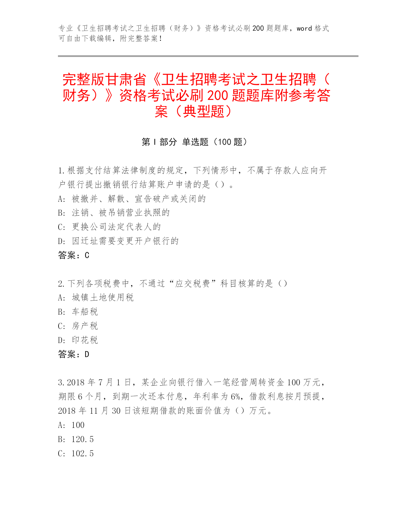 完整版甘肃省《卫生招聘考试之卫生招聘(财务)》资格考试必刷200题题库附参考答案(典型题)