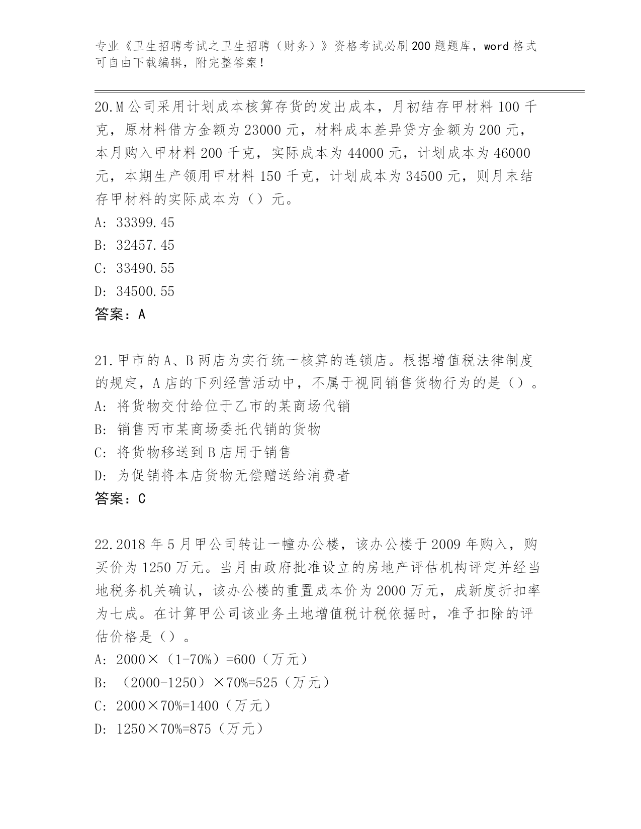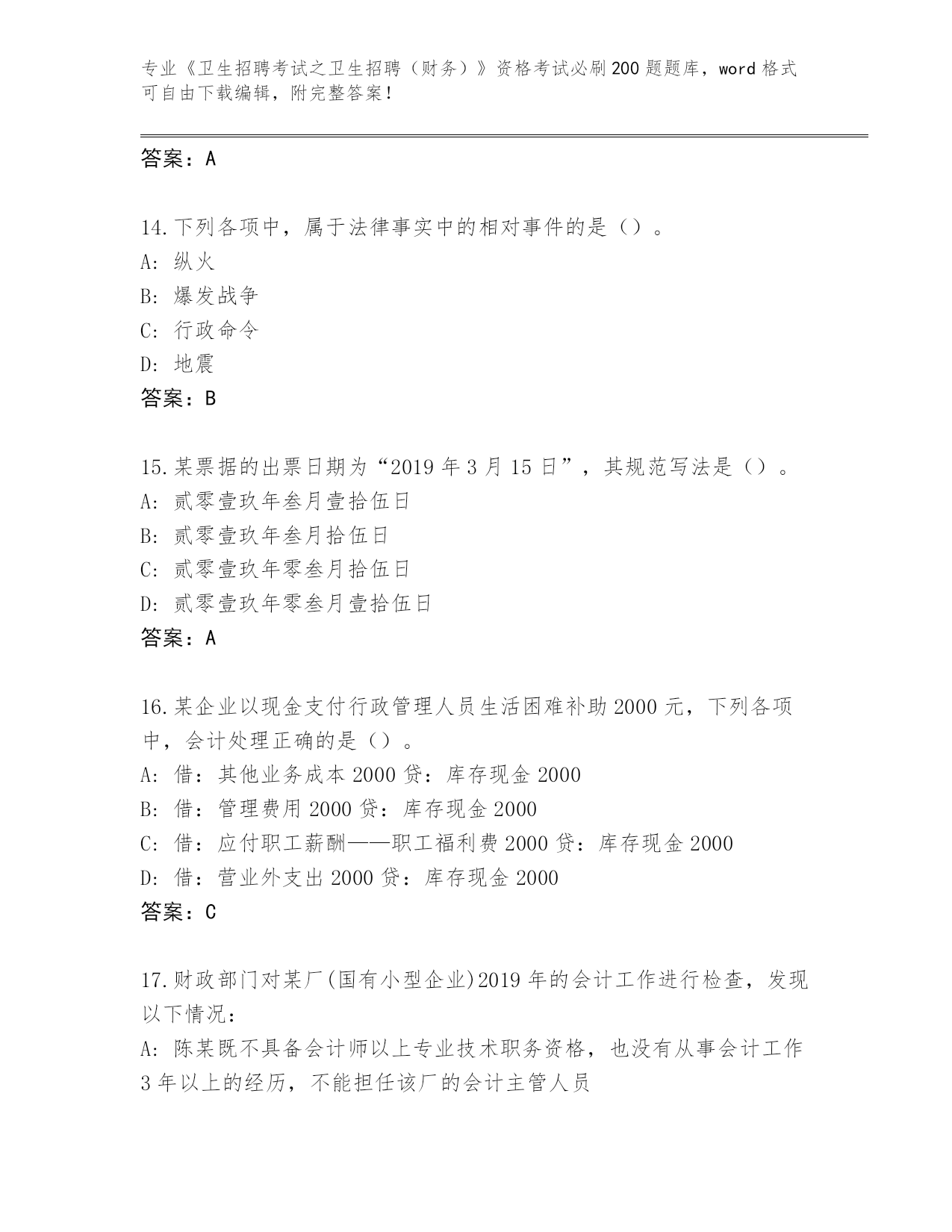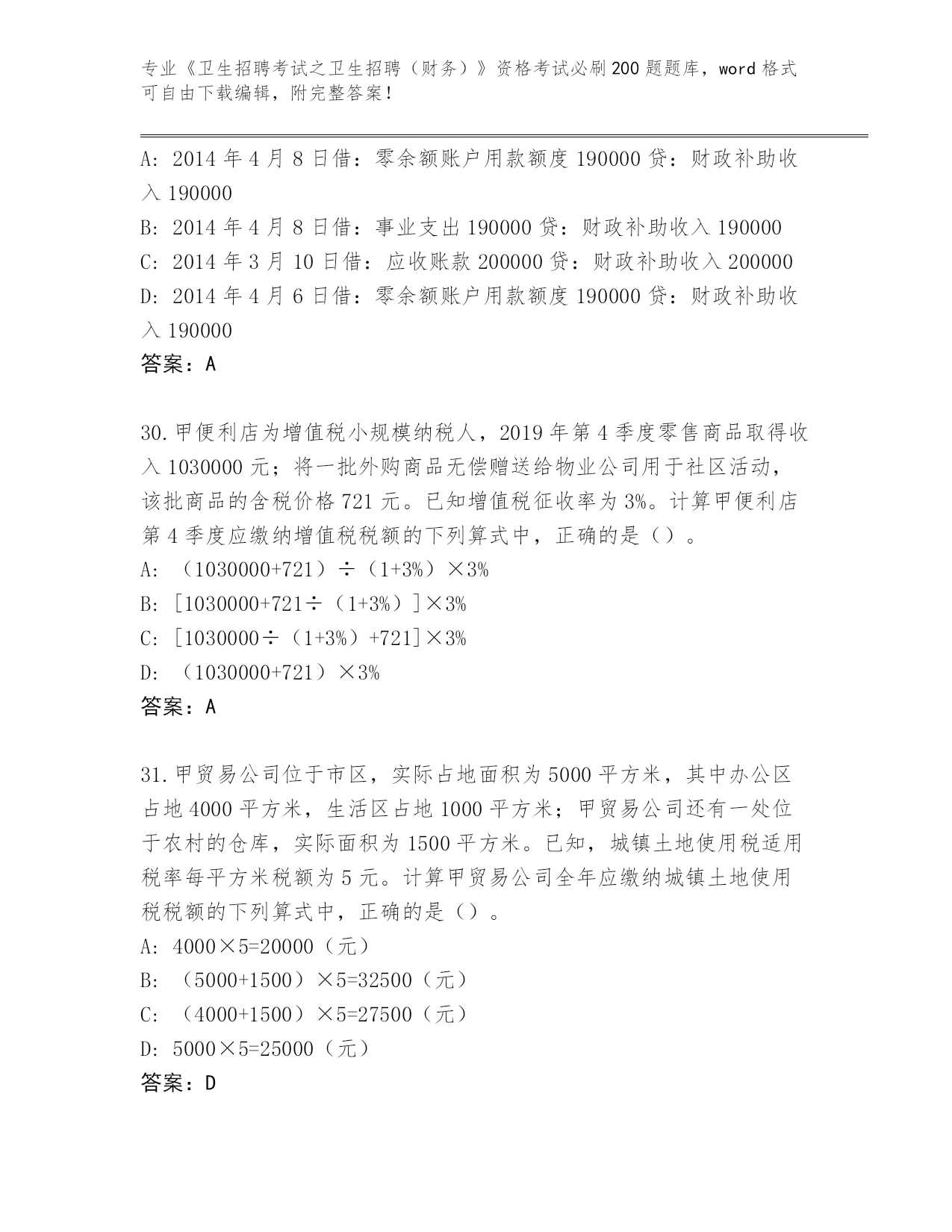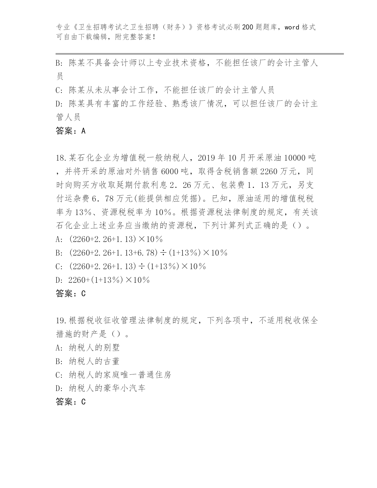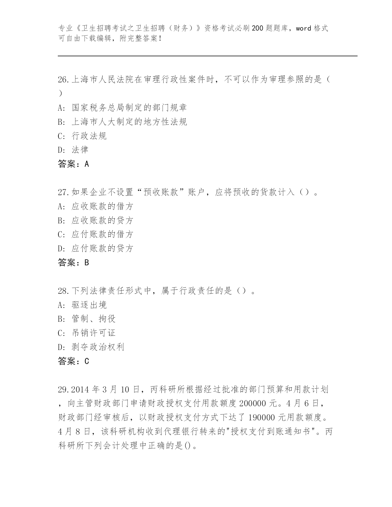 甘肃省甘谷县完整版《卫生招聘考试之卫生招聘(财务)》资格考试必背200题【典型题】
