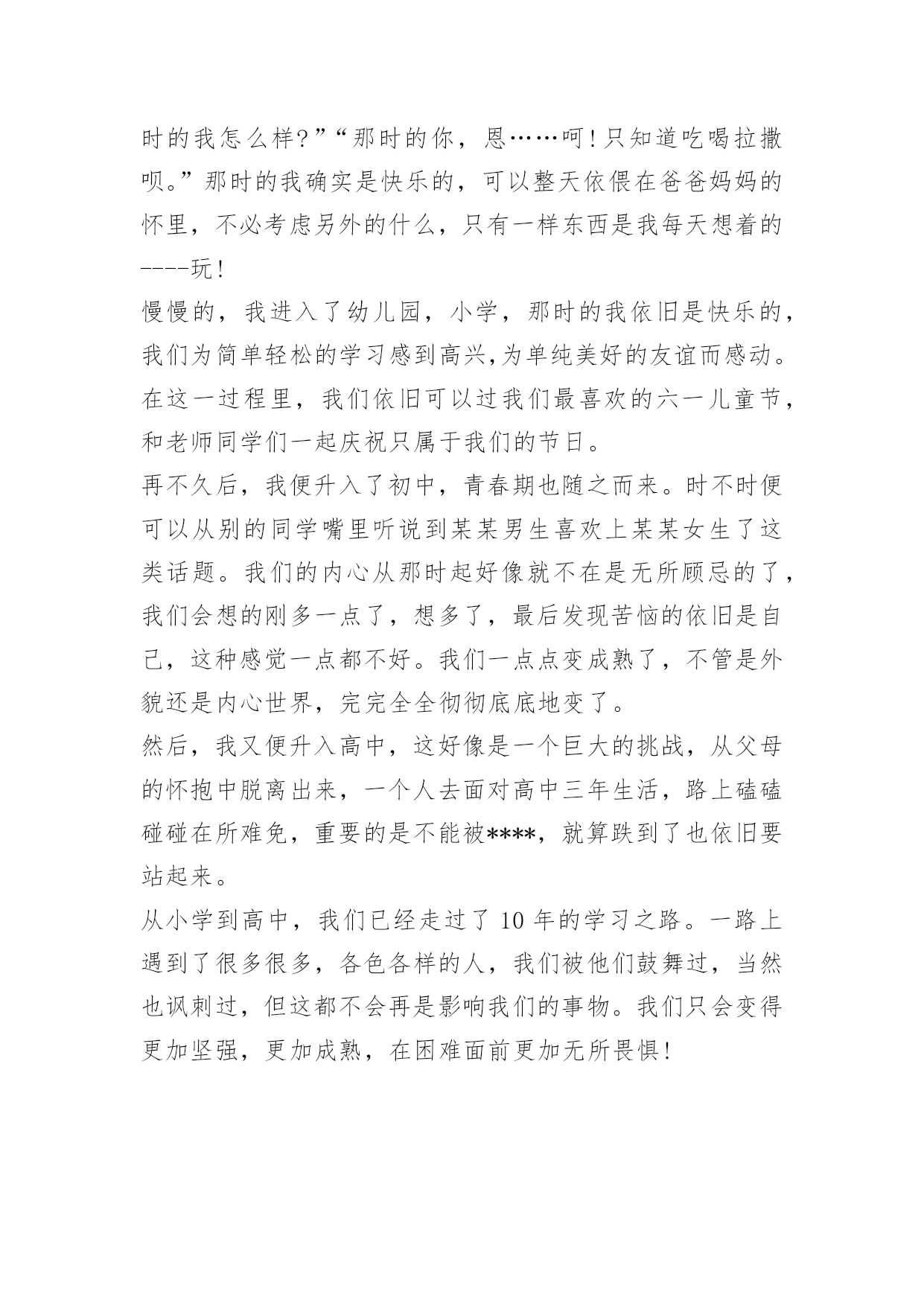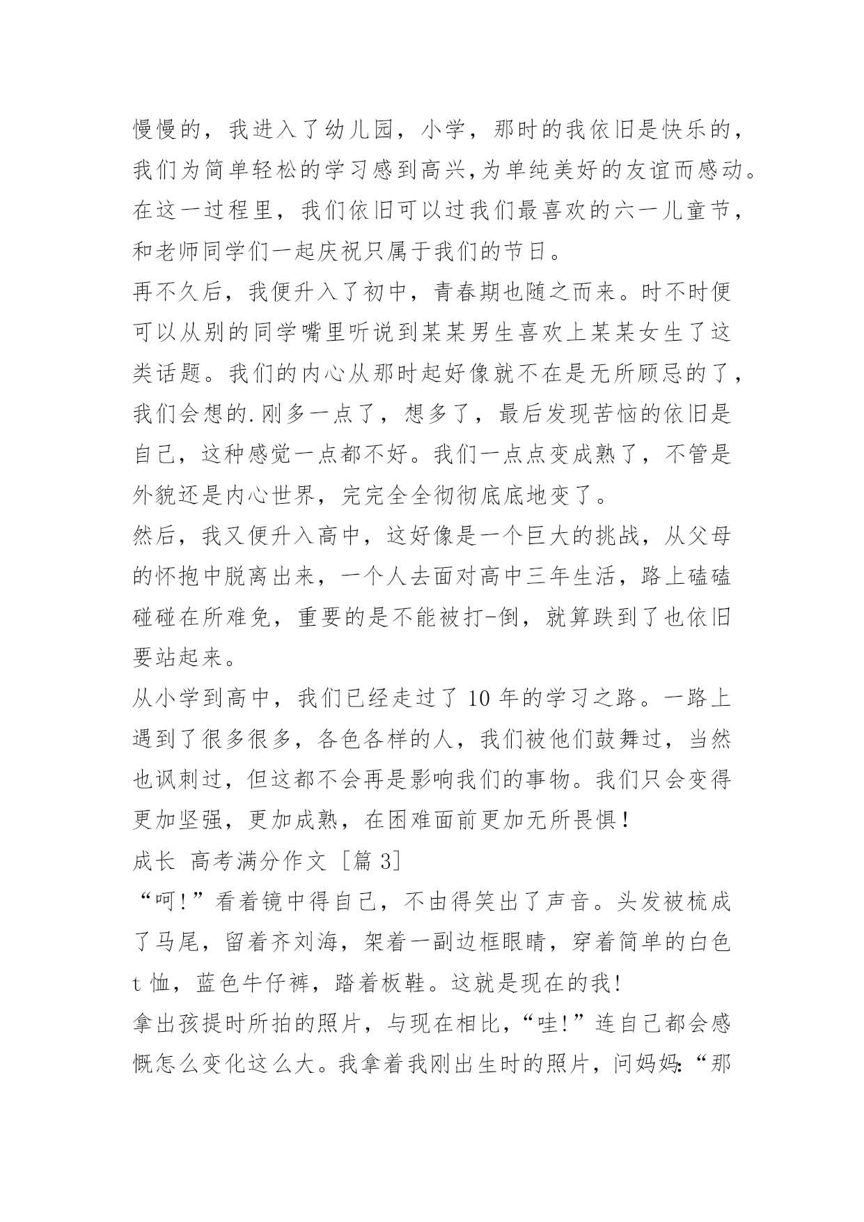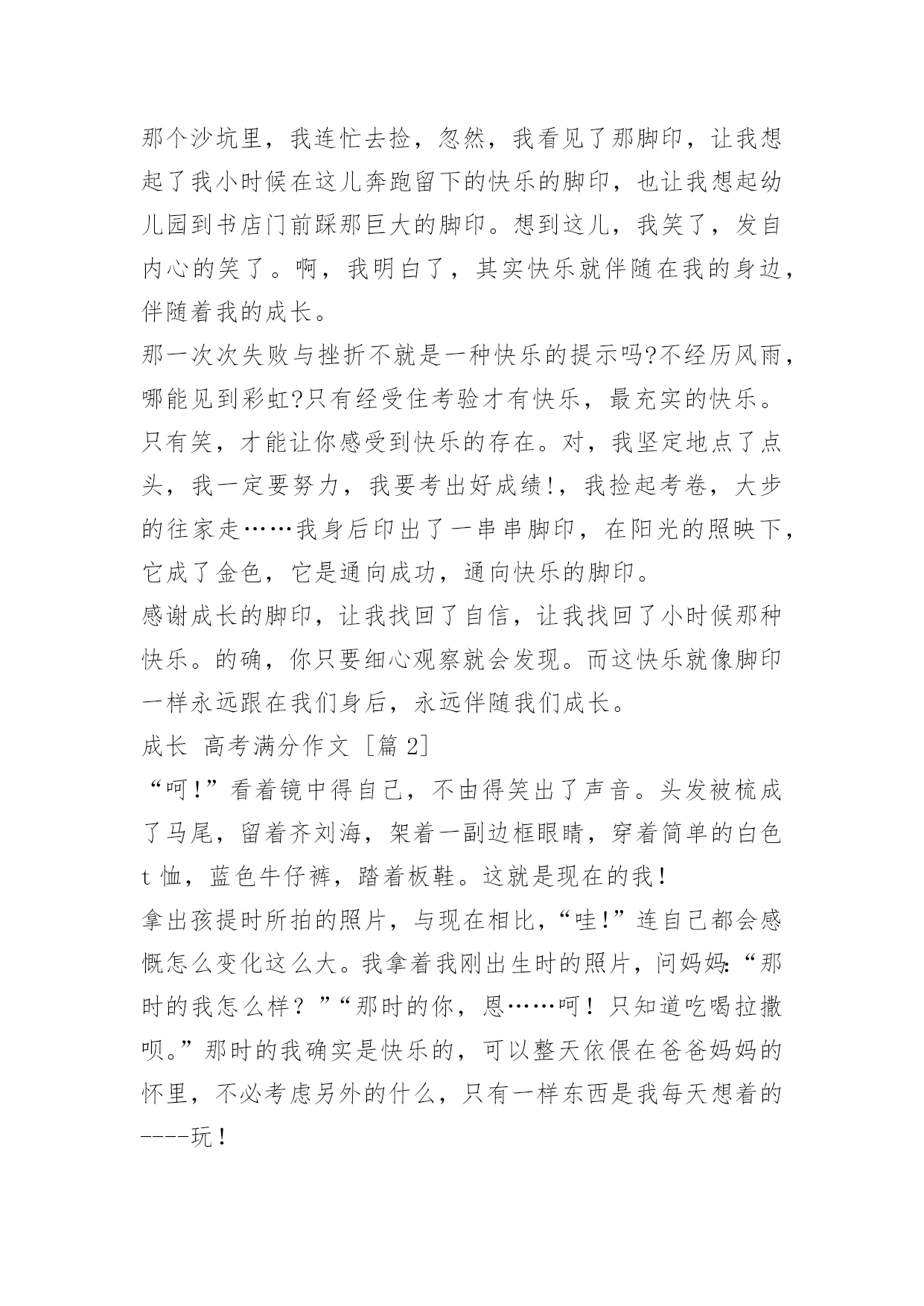 成长高考满分作文成长高考满分作文岁月的河流缓缓流过,成长的脚印深深留下,蓦然回首,长大的路上留下一串串或深或浅的脚印,记载着欢乐,记载着忧伤,伴随我一路走来。小时候的我总爱和伙伴们在楼下的沙坑里玩,踩着一粒粒极软极软的沙子,感到多么快乐,多么惬意。一不小心,摔倒了,努力地爬起来。身后出现了一连串的脚印,太阳照着我们一张张笑脸,笑容更加灿烂了。那一串串脚印记载着欢乐的,记载着我的成长。小时候就是快乐的、考试吧无虑的,好希望永远都是小时候。上幼儿园了,那时的我最爱看书了。每天傍晚,总是缠着妈妈带我去书店看书,穿过繁华的步行街,来到书店门口。儿时的我总爱在门外印着的那几个大脚印上踩来踩去,多好玩啊。如今的我虽然没有小时候的那种快乐,却有了另一种更充实的快乐,那便是读书。书带我到知识的海洋里遨游,那书店门外的大脚印便是我快乐成长的见证。现在的我已经是八年级的学生了,一个个压力压得我喘不过气来,伴随我的还有一次次的失败。今天,又考砸了,手里拿着那张不到八十分的数学考卷,泪水在眼眶里打转着,心里烦透了。无精打采地走在回家的路上,不经意间又踏进了那儿时玩耍过的沙坑,一串串脚印印了下来,一阵风吹过,把我手中的那张试卷吹走了,吹到了那个沙坑里,我连忙去捡,忽然,我看见了那脚印,让我想起了我小时候在这儿奔跑留下的快乐的脚印,也让我想起幼儿园到书店门前踩那巨大的脚印。想到这儿,我笑了,发自内心的笑了。啊,我明白了,其实快乐就伴随在我的身边,伴随着我的成长。那一次次失败与挫折不就是一种快乐的提示吗?不经历风雨,哪能见到彩虹?只有经受住考验才有快乐,最充实的快乐。只有笑,才能让你感受到快乐的存在。对,我坚定地点了点头,我一定要努力,我要考出好成绩!,我捡起考卷,大步的往家走……我身后印出了一串串脚印,在阳光的照映下,它成了金色,它是通向成功,通向快乐的脚印。感谢成长的脚印,让我找回了自信,让我找回了小时候那种快乐。的确,你只要细心观察就会发现。而这快乐就像脚印一样永远跟在我们身后,永远伴随我们成长。成长高考满分作文[篇2]“呵!”看着镜中得自己,不由得笑出了声音。头发被梳成了马尾,留着齐刘海,架着一副边框眼睛,穿着简单的白色t恤,蓝色牛仔裤,踏着板鞋。这就是现在的我!拿出孩提时所拍的照片,与现在相比,“哇!”连自己都会感慨怎么变化这么大。我拿着我刚出生时的照片,问妈妈:“那时的我怎么样?”“那时的你,恩……呵!只知道吃喝拉撒呗。”那时的我确实是快乐的,可以整天依偎在爸爸妈妈的怀里,不必考虑另外的什么,只有一样东西是我每天想着的----玩!慢慢的,我进入了幼儿园,小学,那时的我依旧是快乐的,我们为简单轻松的学习感到高兴,为单纯美好的友谊而感动。在这一过程里,我们依旧可以过我们最喜欢的六一儿童节,和老师同学们一起庆祝只属于我们的节日。再不久后,我便升入了初中,青春期也随之而来。时不时便可以从别的同学嘴里听说到某某男生喜欢上某某女生了这类话题。我们的内心从那时起好像就不在是无所顾忌的了,我们会想的.刚多一点了,想多了,最后发现苦恼的依旧是自己,这种感觉一点都不好。我们一点点变成熟了,不管是外貌还是内心世界,完完全全彻彻底底地变了。然后,我又便升入高中,这好像是一个巨大的挑战,从父母的怀抱中脱离出来,一个人去面对高中三年生活,路上磕磕碰碰在所难免,重要的是不能被打-倒,就算跌到了也依旧要站起来。从小学到高中,我们已经走过了10年的学习之路。一路上遇到了很多很多,各色各样的人,我们被他们鼓舞过,当然也讽刺过,但这都不会再是影响我们的事物。我们只会变得更加坚强,更加成熟,在困难面前更加无所畏惧!成长高考满分作文[篇3]“呵!”看着镜中得自己,不由得笑出了声音。头发被梳成了马尾,留着齐刘海,架着一副边框眼睛,穿着简单的白色t恤,蓝色牛仔裤,踏着板鞋。这就是现在的我!拿出孩提时所拍的照片,与现在相比,“哇!”连自己都会感慨怎么变化这么大。我拿着我刚出生时的照片,问妈妈:“那时的我怎么样?”“那时的你,恩……呵!只知道吃喝拉撒呗。”那时的我确实是快乐的,可以整天依偎在爸爸妈妈的怀里,不必考虑另外的什么,只有一样东西是我每天想着的----玩!慢慢的,我进入了幼儿园,小学,那时的我依旧是快乐的,我们为简单轻松的学习感到高兴,为单纯美好的友谊而感动。在这一过程里,我们依旧可以过我们最喜欢的六一儿童节,和老师同学们一起庆祝只属于我们的节日。再不久后,我便升入了初中,青春期也随之而来。时不时便可以从别的同学嘴里听说到某某男生喜欢上某某女生了这类话题。我们的内心从那时起好像就不在是无所顾忌的了,我们会想的刚多一点了,想多了,最后发现苦恼的依旧是自己,这种感觉一点都不好。我们一点点变成熟了,不管是外貌还是内心世界,完完全全彻彻底底地变了。然后,我又便升入高中,这好像是一个巨大的挑