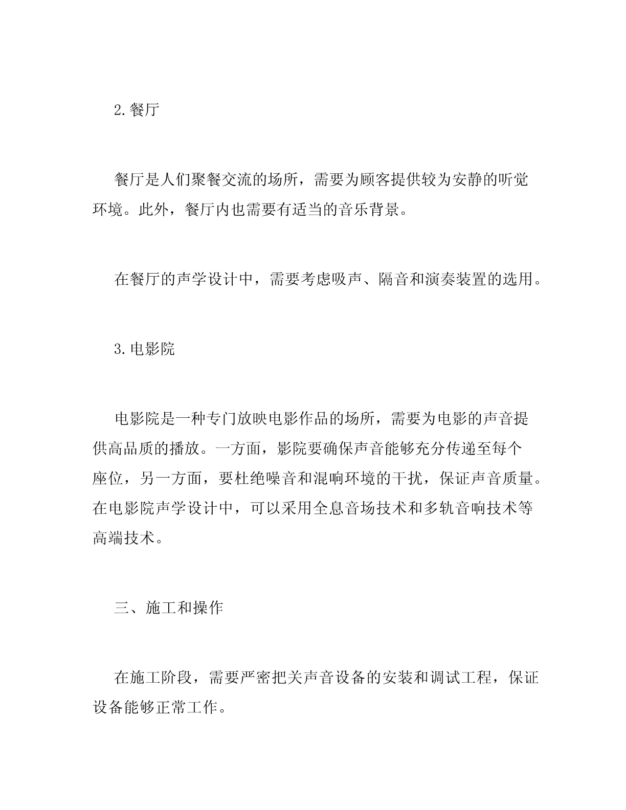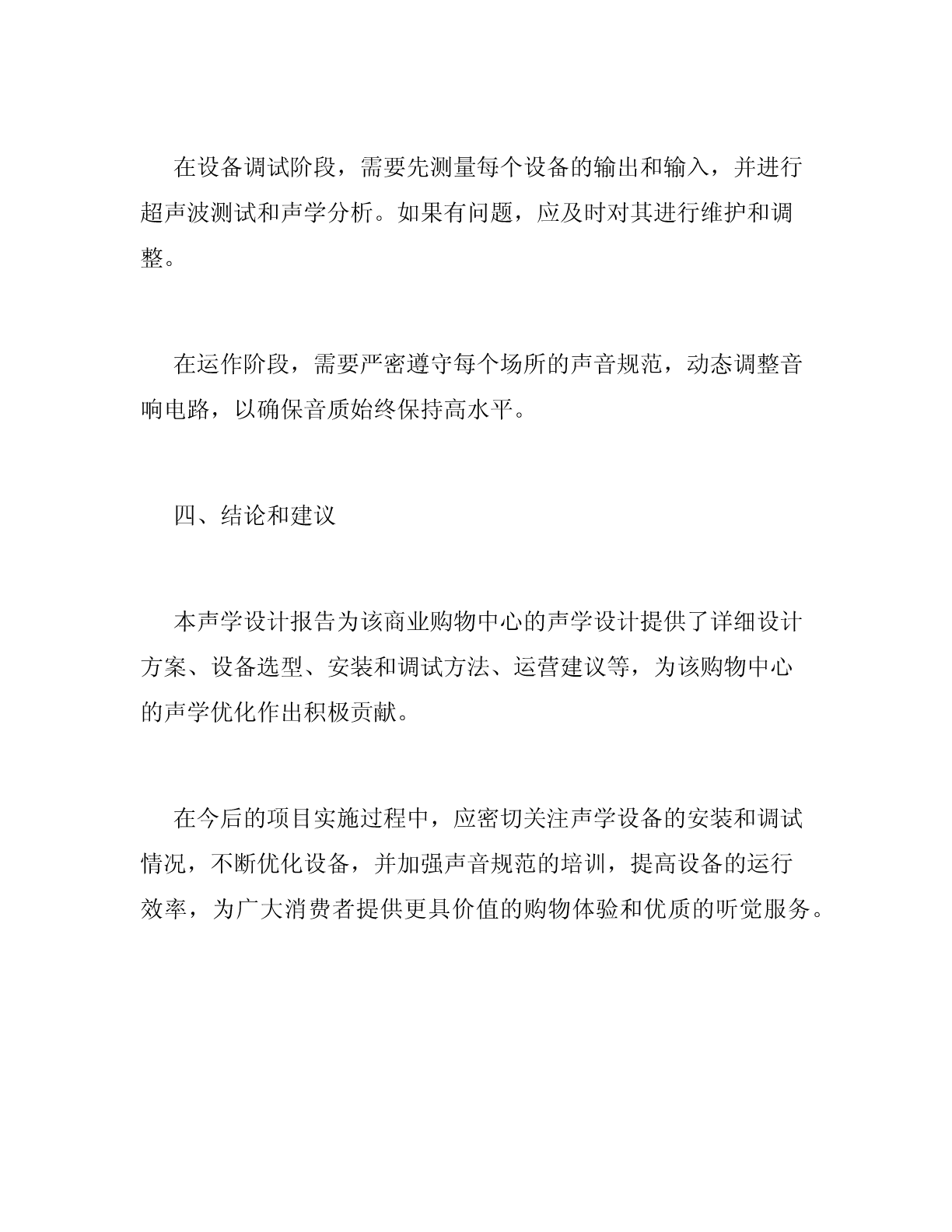 声学设计报告一、目的和背景本声学设计报告为某商业建筑物的声学设计,主要目的是优化建筑物内音效,提高使用者的听觉体验。该商业建筑物为一家大型购物中心,计划面积达10万平方米,预计客流量较大,需考虑如何让顾客体验到优质的声音效果。二、设备设计商业购物中心通常包括商店、餐厅、电影院等各种场所,每个场所都会有不同的声音需求。因此,在声学设计中,需要分别考虑不同场所的声音需求,并作相应的设计。1.商店商店一般会播放背景音乐,同时也可能需要在广播中播放促销信息。在设计商店声学时,需要指定设计音响的覆盖范围和音量,为顾客营造舒适的听觉环境。2.餐厅餐厅是人们聚餐交流的场所,需要为顾客提供较为安静的听觉环境。此外,餐厅内也需要有适当的音乐背景。在餐厅的声学设计中,需要考虑吸声、隔音和演奏装置的选用。3.电影院电影院是一种专门放映电影作品的场所,需要为电影的声音提供高品质的播放。一方面,影院要确保声音能够充分传递至每个座位,另一方面,要杜绝噪音和混响环境的干扰,保证声音质量。在电影院声学设计中,可以采用全息音场技术和多轨音响技术等高端技术。三、施工和操作在施工阶段,需要严密把关声音设备的安装和调试工程,保证设备能够正常工作。在设备调试阶段,需要先测量每个设备的输出和输入,并进行超声波测试和声学分析。如果有问题,应及时对其进行维护和调整。在运作阶段,需要严密遵守每个场所的声音规范,动态调整音响电路,以确保音质始终保持高水平。四、结论和建议本声学设计报告为该商业购物中心的声学设计提供了详细设计方案、设备选型、安装和调试方法、运营建议等,为该购物中心的声学优化作出积极贡献。在今后的项目实施过程中,应密切关注声学设备的安装和调试情况,不断优化设备,并加强声音规范的培训,提高设备的运行效率,为广大消费者提供更具价值的购物体验和优质的听觉服务。