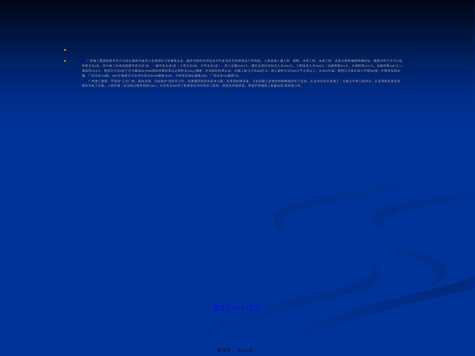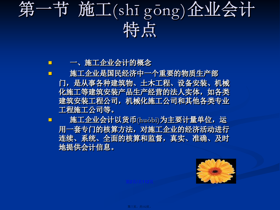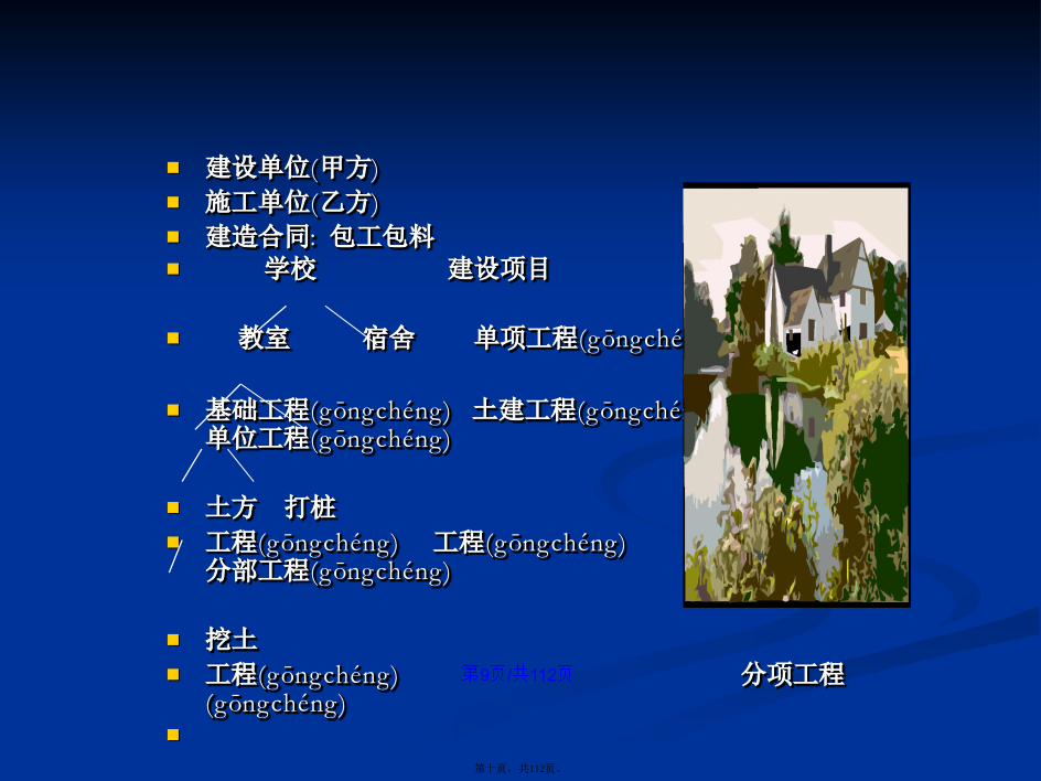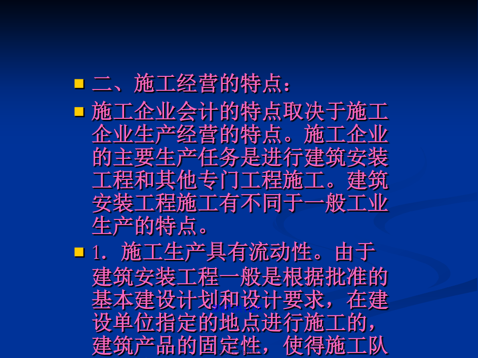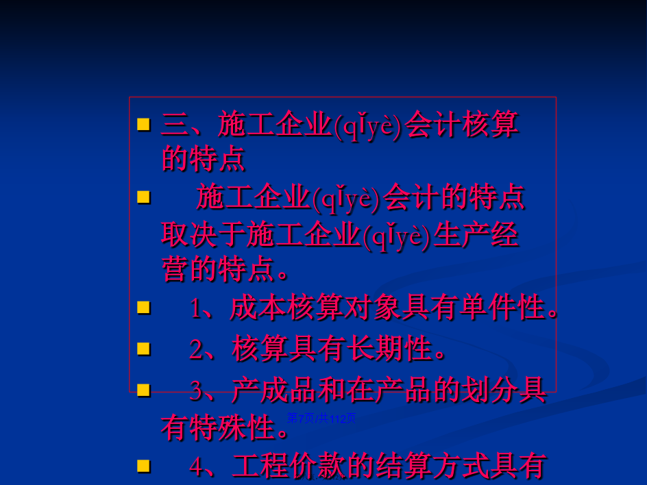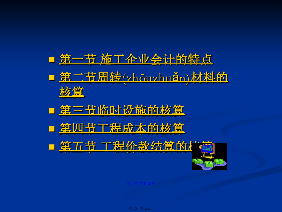 会计学第一节施工企业会计的特点第二节周转(zhōuzhuǎn)材料的核算第三节临时设施的核算第四节工程成本的核算第五节工程价款结算的核算第一节施工(shīgōng)企业会计特点广西建工集团有限责任公司是以建筑安装为主业的国有大型建筑企业,拥有对国外经济技术合作业务经营权和进出口贸易权,主要承建土建工程,路桥、水利工程,市政工程,设备安装和建筑机械制造。集团全资子公司10家,参股企业2家,其中施工总承包特级资质企业1家、一级资质企业8家(大型企业6家,中型企业4家)。职工总数62254人;拥有各类经济技术人员5824人;工程技术人员4588人(高级职称214人,中级职称1531人,初级职称1667人);建造师1818人。集团公司及8家子公司通过ISO9000国际质量体系认证和职业(zhíyè)健康、环境国际体系认证;年施工能力可达200亿元、竣工面积可达1000万平方米以上。从2003年起,集团公司连年进入中国500强,中国承包商60强,广西企业100强。2009年集团公司名列中国企业500强第390位,中国承包商60强第22位,广西企业100强第7位。广西建工集团一贯坚持“立足广西、面向全国、开拓海外”的经营方针,凭着雄厚的经济技术力量、先进的机械设备、丰富的施工管理经验和熟练的生产技术,在自治区内外承建了一大批大中型工程项目,在非洲和东南业各国也开拓了市场,工程质量一次交验合格率保持100%,先后有近400项工程荣获自治区优质工程奖、国家优质银质奖,荣获中国建筑工程最高奖-鲁班奖13项。荔园山庄(shānzhuāng)广西大学图书馆楼二、施工经营的特点:施工企业会计的特点取决于施工企业生产经营的特点。施工企业的主要生产任务是进行建筑安装工程和其他专门工程施工。建筑安装工程施工有不同于一般工业生产的特点。1.施工生产具有流动性。由于建筑安装工程一般是根据批准的基本建设计划和设计要求,在建设单位指定的地点进行施工的,建筑产品的固定性,使得施工队伍和施工机械在不同工地不同工程项目间流动施工。2.建筑产品生产具有单件性。施工企业建造的建筑产品都有不同的功能、结构和用途,只能按照建设要求和单个图纸组织单件生产,不能像工业企业那样(nàyàng)组织成批生产。3.建筑产品生产周期长。这是因为施工企业生产的建筑安装工程等产品,除了少部分工程造价低、耗费少以外,大多是体积庞大、造价高、耗费大的工程,少的工期几个月,而大多数工程需要跨年度施工,有的工程工期长达几年甚至十几年。三、施工企业(qǐyè)会计核算的特点施工企业(qǐyè)会计的特点取决于施工企业(qǐyè)生产经营的特点。1、成本核算对象具有单件性。2、核算具有长期性。3、产成品和在产品的划分具有特殊性。4、工程价款的结算方式具有多样性。建筑物构造(gòuzào)建设单位(甲方)施工单位(乙方)建造合同:包工包料学校建设项目教室宿舍单项工程(gōngchéng)基础工程(gōngchéng)土建工程(gōngchéng)单位工程(gōngchéng)土方打桩工程(gōngchéng)工程(gōngchéng)分部工程(gōngchéng)挖土工程(gōngchéng)分项工程(gōngchéng)第二节周转材料(cáiliào)的核算(一)购入:(1)实际成本计价:借:周转材料――在库(实际成本=买价+相关税金+采购(cǎigòu)费用)贷:银行存款(2)计划成本计价:付款:借:材料采购(cǎigòu)(实际成本=买价+相关税金+采购(cǎigòu)费用)贷:银行存款入库:借:周转材料――在库(计划成本)贷:材料采购(cǎigòu)结转入库材料差异:超支差异:借:材料成本差异-周转材料成本差异贷:材料采购(cǎigòu)节约差异:相反(二)领用并摊销:摊销方法:一次摊销法――适用于易腐、易糟的周转材料分期摊销法――适用于磨损与使用期限有关的周转材料分次摊销法――适用于能分清(fēnqīng)使用次数的周转材料定额摊销法――适用于各种模板等周转材料/1、一次摊销法的会计处理:借:工程施工-合同成本-××工程-材料费贷:周转(zhōuzhuǎn)材料-在库周转(zhōuzhuǎn)材料计划成本计价的月末要转出材料成本差异借:工程施工-合同成本-××工程-材料费贷:材料成本差异(节约差异用红字)2、分期摊销法、分次摊销法、定额摊销法的会计处理A、计算(jìsuàn)B、分录:(1)领用时借:周转材料-在用周转材料贷:周转材料-在库周转材料(2)摊销时借:工程施工-合同成本-××工程-材料费贷:周转材料-周转材料摊销(3)退库时借:周转材料-在库周转材料贷:周